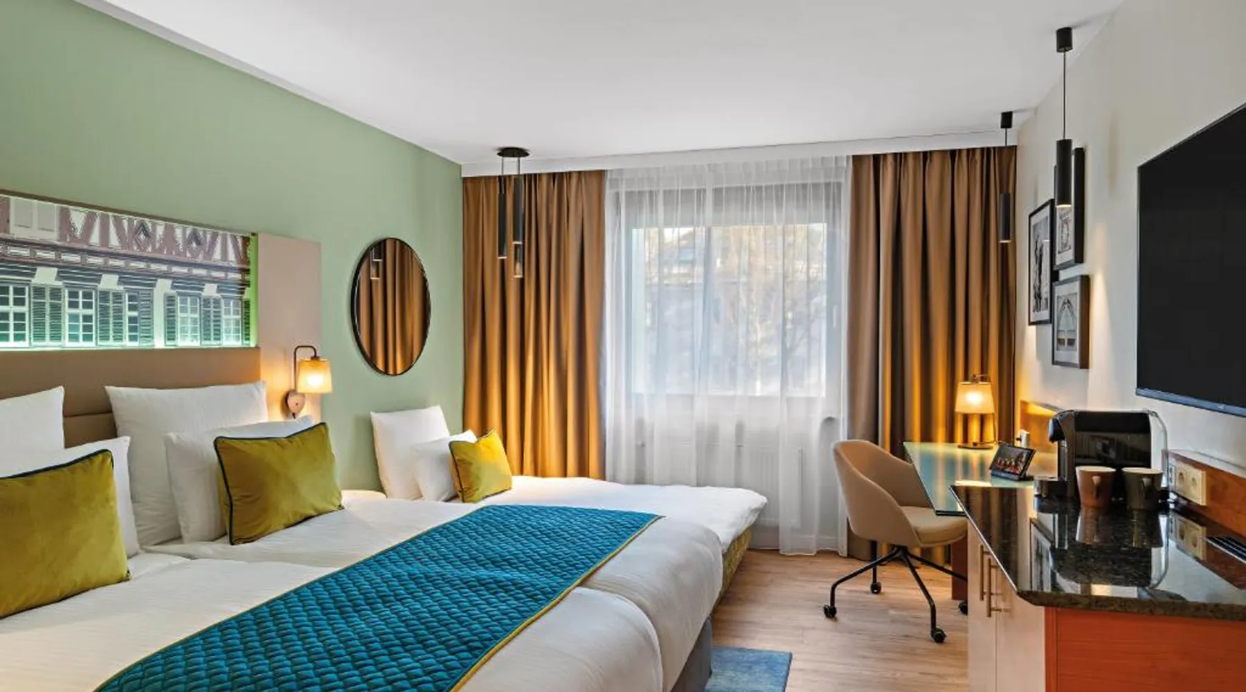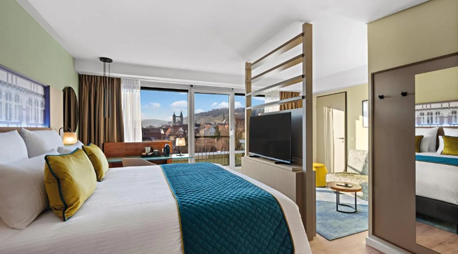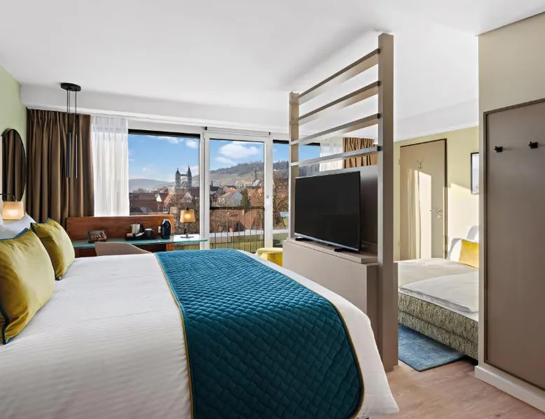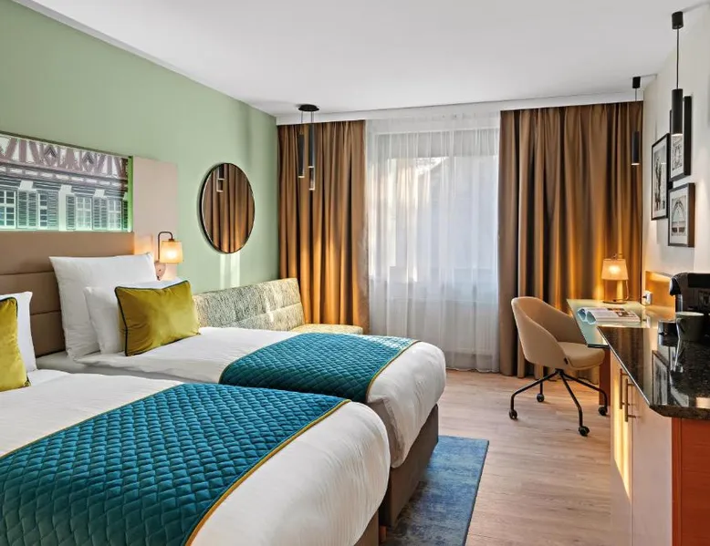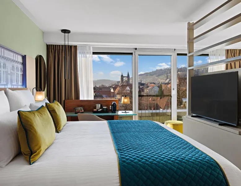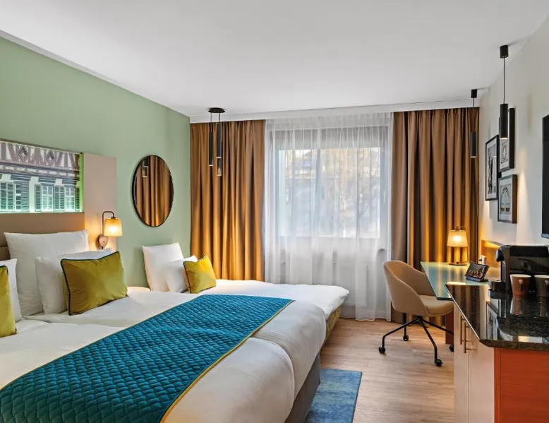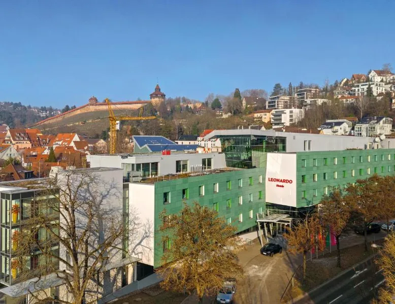 This hotel is located on the edge of Esslingen’s beautiful Old Town, only 9.3 mi from Stuttgart city center. It is surrounded by vineyards and offers views of Esslingen Castle. The 4-star estimated by Booking.com Leonardo Hotel Esslingen offers spacious, comfortable rooms. All rooms provide free wired internet, and Wi-Fi is free in public areas. The Leonardo Hotel Esslingen is a wonderful choice thanks to its generous selection of food and drinks. For breakfast, the restaurant offers a buffet with fresh produce and hot dishes. During the day and in the evening, you can choose from the extensive menu to satisfy your appetite, or order a drink at the bar and enjoy the cozy atmosphere by the fireplace. You can also use the rooftop bar on the 5th floor to relax and have fun with your travel companions. By car, guests can reach Stuttgart city center, Stuttgart Main Station and Stuttgart Airport in about 20 minutes. Revitalizing our spaces! The rooftop bar, sauna and fitness area are currently closed. We appreciate your understanding and are looking forward to unveil the exciting new amenities. The twin room offers a tea and coffee maker, a safe deposit box, as well as a private bathroom featuring a shower and a hairdryer. This twin room provides a TV. The unit offers 2 beds.
