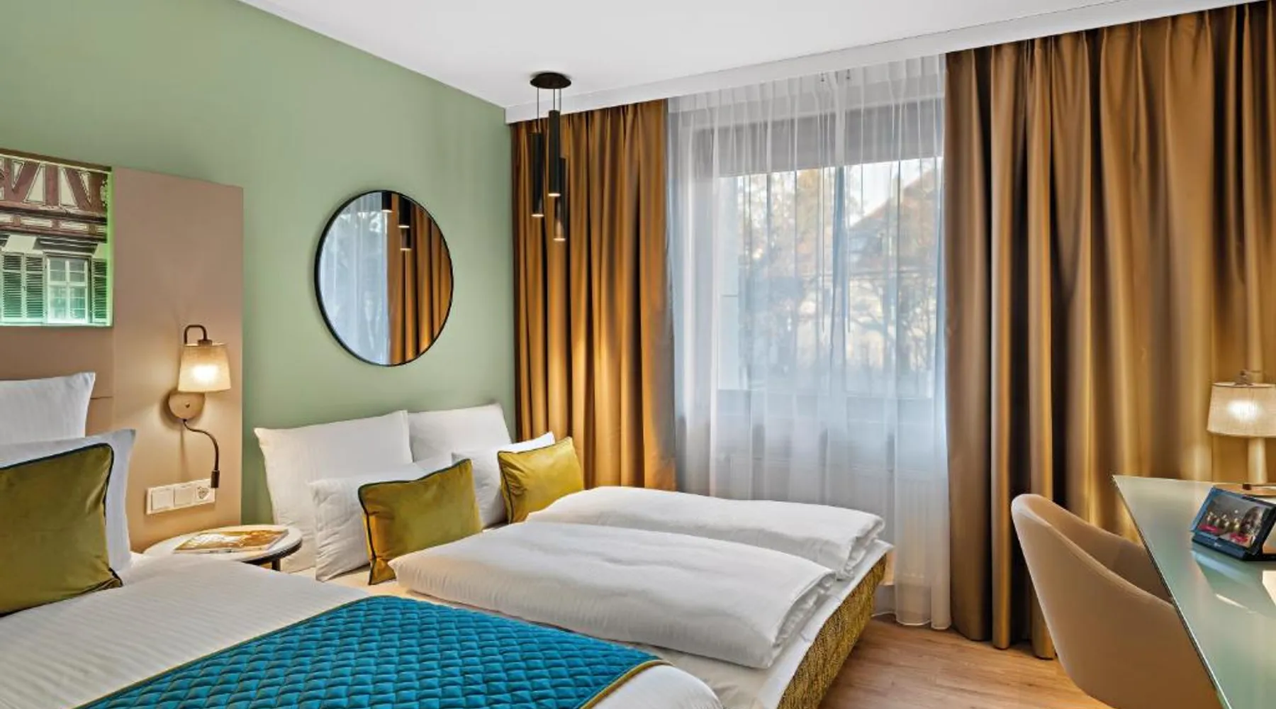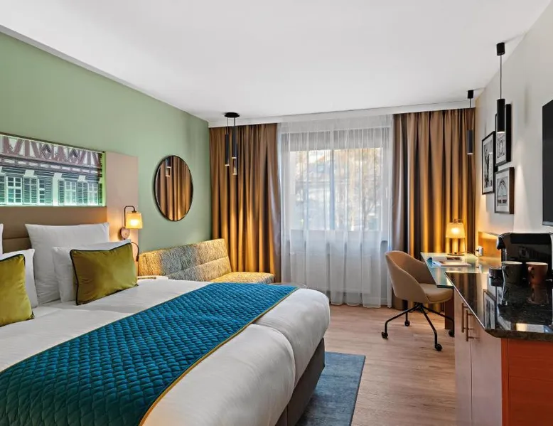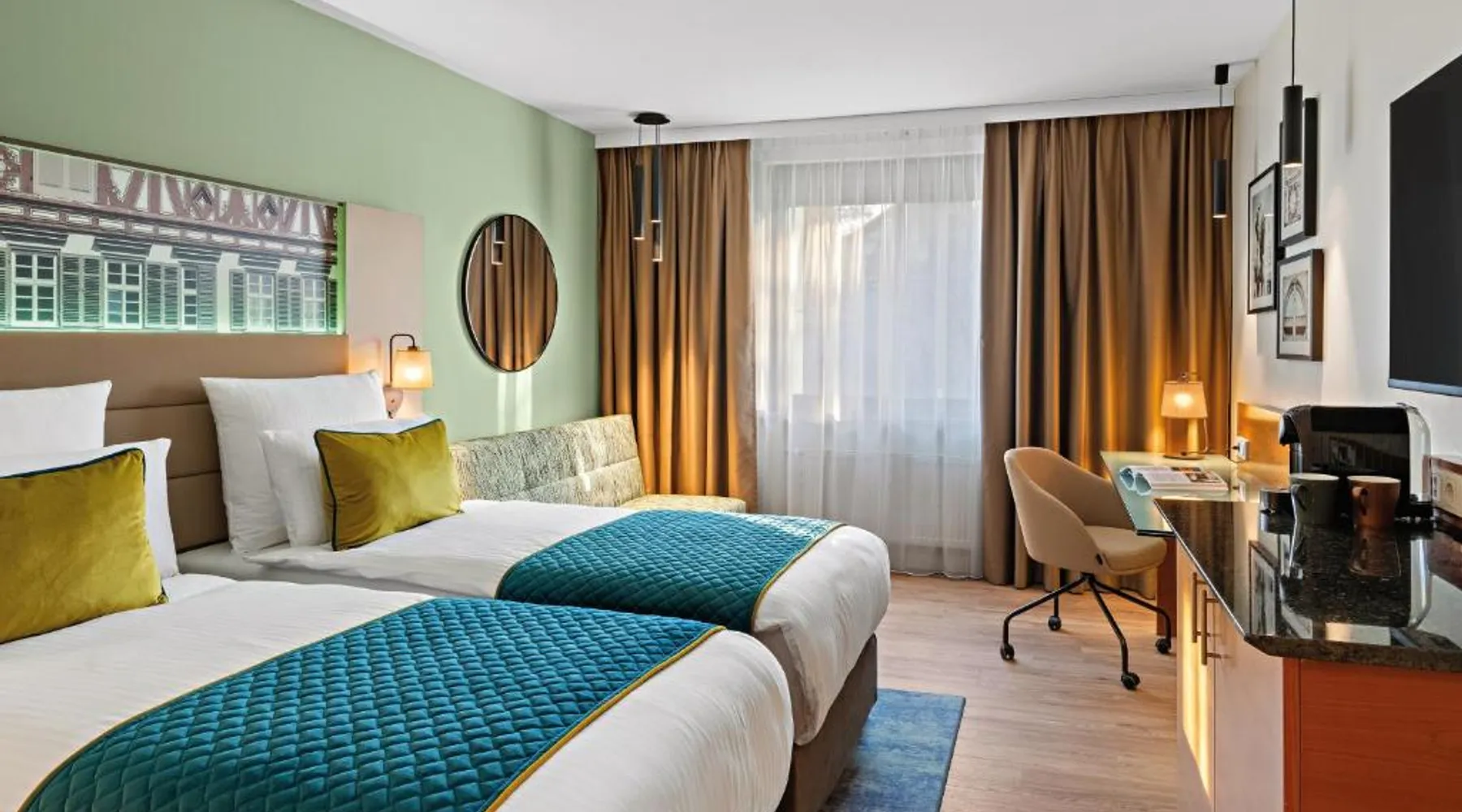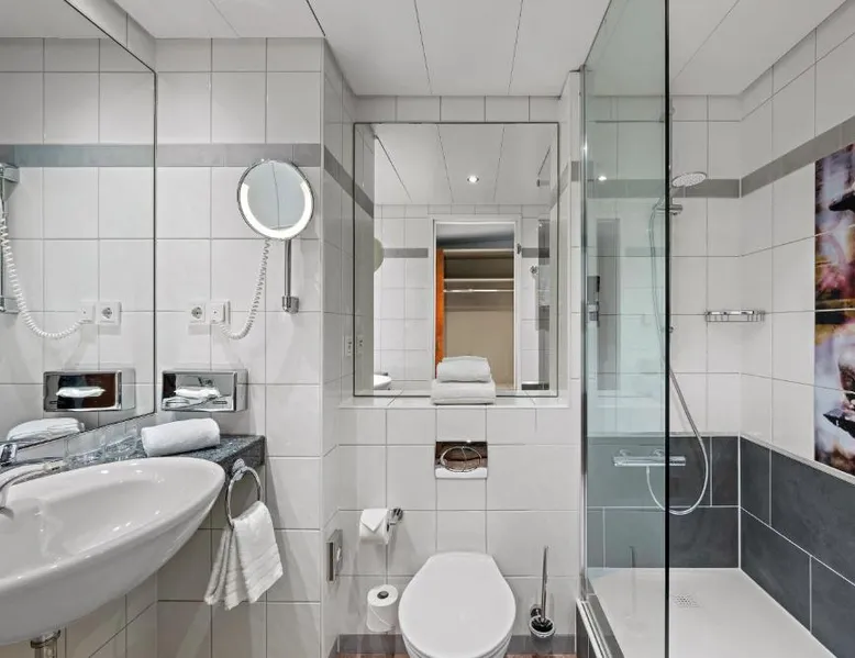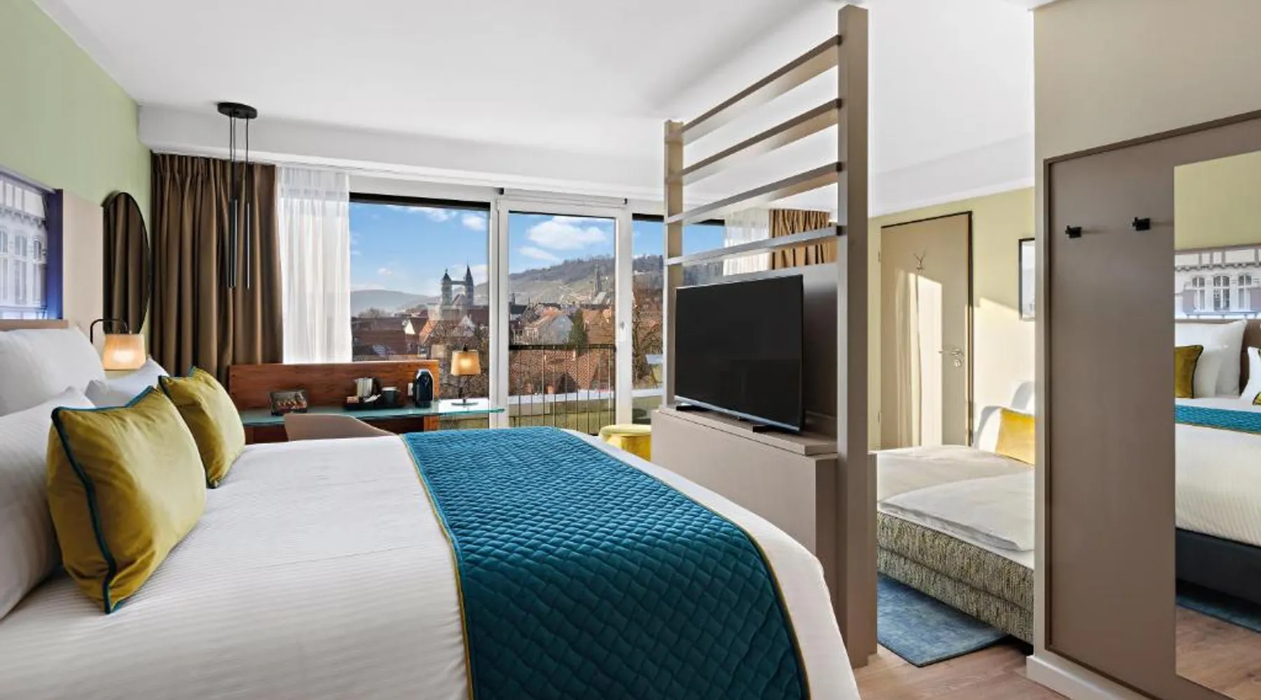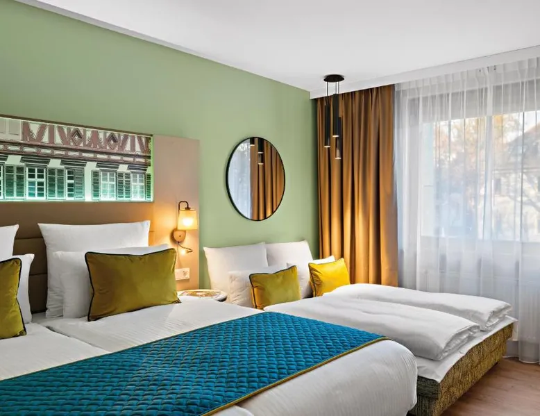 This hotel is located on the edge of Esslingen’s beautiful Old Town, only 9.3 mi from Stuttgart city center. It is surrounded by vineyards and offers views of Esslingen Castle. The 4-star estimated by Booking.com Leonardo Hotel Esslingen offers spacious, comfortable rooms. All rooms provide free wired internet, and Wi-Fi is free in public areas. The Leonardo Hotel Esslingen is a wonderful choice thanks to its generous selection of food and drinks. For breakfast, the restaurant offers a buffet with fresh produce and hot dishes. During the day and in the evening, you can choose from the extensive menu to satisfy your appetite, or order a drink at the bar and enjoy the cozy atmosphere by the fireplace. You can also use the rooftop bar on the 5th floor to relax and have fun with your travel companions. By car, guests can reach Stuttgart city center, Stuttgart Main Station and Stuttgart Airport in about 20 minutes. Revitalizing our spaces! The rooftop bar, sauna and fitness area are currently closed. We appreciate your understanding and are looking forward to unveil the exciting new amenities. The twin room offers a tea and coffee maker, a safe deposit box, as well as a private bathroom featuring a shower and a hairdryer. This twin room provides a TV. The unit offers 2 beds.