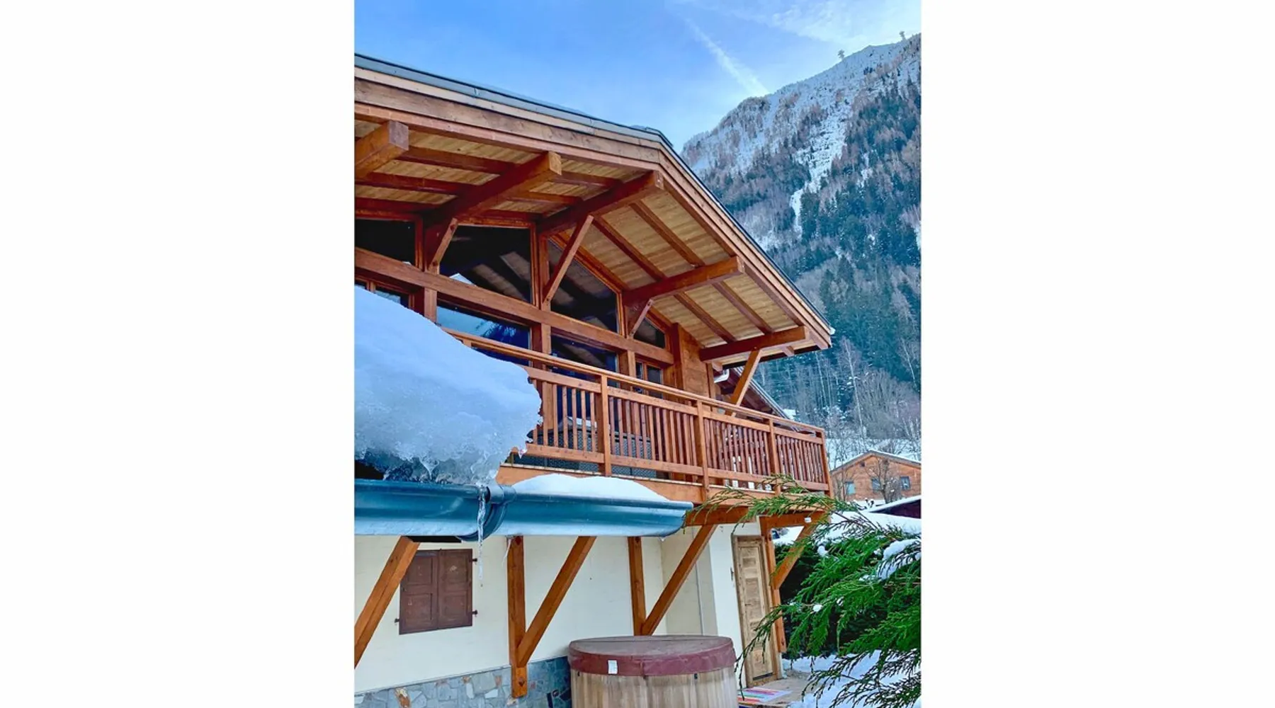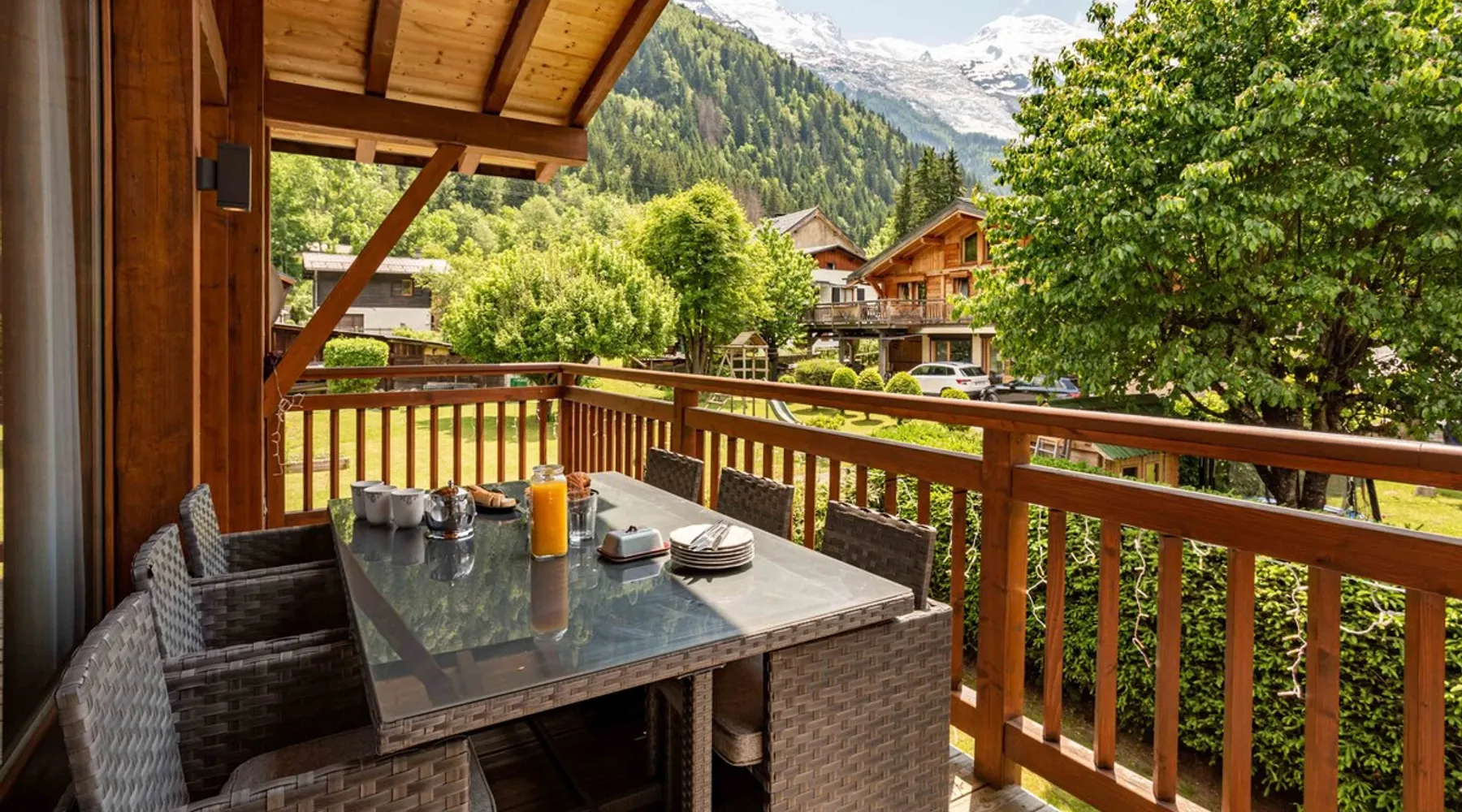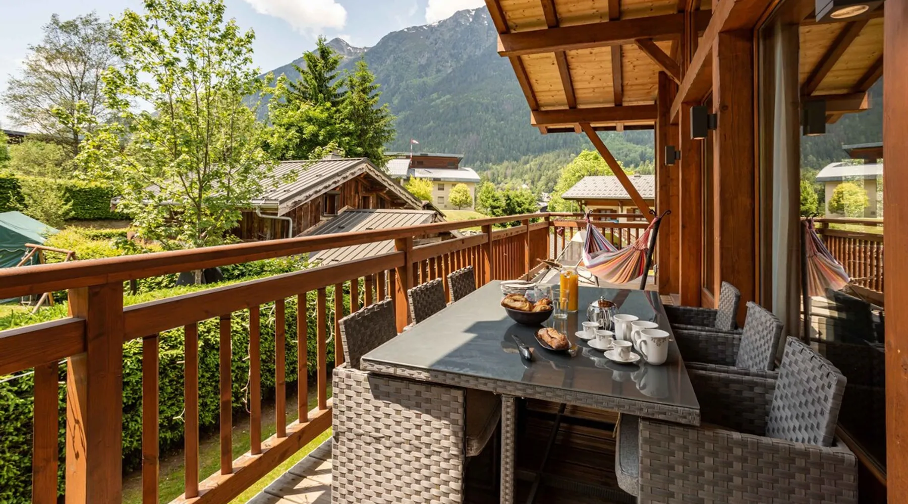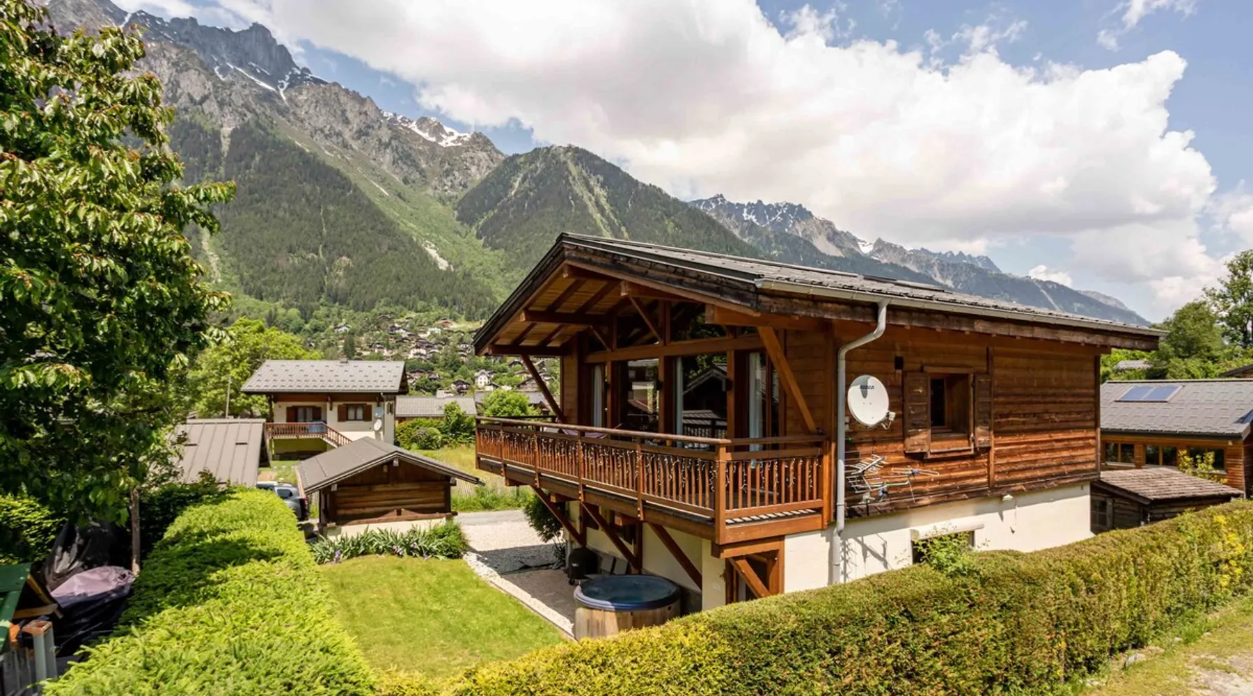 Chalet du Dard is a beautiful Chamonix chalet, that sleeps 8 in 4 bedrooms, 3 bathrooms, garden, hot tub, Mont Blanc views, parking and wifi. Chalet du Dard is a beautiful chalet in Chamonix, sleeping 8 people in 4 bedrooms, 3 bathrooms, garden, jacuzzi, view of Mont Blanc, parking and wifi. See more info or click 'Book online' to réserver. The space Chalet du Dard is a beautiful traditional alpine chalet, named after the Cascade du Dard which is a beautiful 20 minute woodland walk from the chalet. Set in a lovely quiet area, only 5-6 minute's walk to the centre of Chamonix and the Aiguille du Midi this Chamonix chalet is ideally located for the perfect holiday destination for families or groups of friends alike. Chalet du Dard boasts a beautiful garden with BBQ, hot tub, and plenty of space for kids to run around and play on the trampoline while you sit on the balcony taking in the stunning views of Mont Blanc with an aperitif. Inside the chalet you will find 4 bedrooms offering flexible sleeping arrangements. Downstairs there is a master double en-suite bedroom and a further double bedroom plus a TV snug. Upstairs off the open plan living dining kitchen are two further bedrooms, a twin/king bedroom and a bedroom with bunk beds. There is a family bathroom here too. There is a mezzanine above the lounge that offers another TV snug and an extra double bed, this is accessed from steep ladders and is very reduced in height. The large open-plan living area hosts a well-equipped kitchen with a large fridge freezer, oven, dishwasher, Nespresso coffee machine, and fondue kit, perfect for enjoying a cosy night in. The dining table seats 8 comfortably and there are two comfortable couches for relaxing in after a hard day up the mountain. Floor-to-ceiling windows link the living space onto the large balcony where there is a table & chairs for dining alfresco and a hammock for the ultimate relaxation. There is a boot room with boot warmer, washing machine & tumble dryer, wifi and parking outside the chalet for 2 cars. Key Features 130 sqm Sleeps 8 Master double bedroom with ensuite bathroom Second double bedroom with private bathroom King/Twin bedroom Bunk bedroom Mezzanine with TV snug & double bed if needed Family bathroom with bath & shower Hot tub SMART TV with Netflix and Sky TV Fibre Wifi internet access Well-equipped kitchen with oven, microwave, dishwasher, Nespresso coffee machine & fondue kit Dining table and chairs/benches for 8 Private garden with trampoline Large balcony with table & chairs Washing machine Tumble Dryer Parking for 2 cars Other things to note myCAY loyalty programme All Chamonix All Year guests are invited to join myCAY, our loyalty programme which gets more rewarding the longer you’re with us. Once you have booked to stay with us, as a valued guest you can join to unlock a host of benefits and rewards, including money can’t buy services, discount exclusives and the best of Chamonix All Year for all the family and friends to enjoy too. The more you stay, the more rewards you get, and as you move up the tiers, some of the benefits include free upgrades such as free early or late check-ins and check-outs. Check-in times Normal check-in time is from 5pm, if you are arriving after 10pm please let us know in advance. Check-out times Normal check-out time is by 10am. Flexible check-in / check-out times If these times don’t suit your holiday arrangements, you can book our flexible early check-in / late check-out service (subject to availability). This must be booked with us in advance, and may be subject to a fee of 40€ for apartments and 80€ for chalets so that we can prepare the property in time. Children Travel cots & high chairs / booster seats can be hired through us for 35€ to include cot mattress, bed linen and a towel. You can add this to your booking at the time of booking. What's included One set of bed linen and towels is provided at your accommodation for your stay. If you are staying for 2 weeks or more you will have a mid-stay linen change. Tourist guest cards will be left in the property for you on arrival to give you free travel on the local train and buses and more. End of stay cleaning is included at your accommodation, but we do expect you to follow our check out instructions on departure. Cards accepted Chamonix All Year Resort Shop Order everything you need for your Chamonix holiday now via our Chamonix Resort Shop: Geneva Airport transfers Chamonix lift passes Discounted ski hire Additional Accommodation Details Pets Pets are welcome at this property but permission must be obtained in advance and a charge will be applied at time of booking. The additional fee is 40€. Mezzanine Note that the mezzanine to TV area and 5th sleeping area is up steep ladders and the bed is under a very low ceiling. Registration Details 74056002157M5
