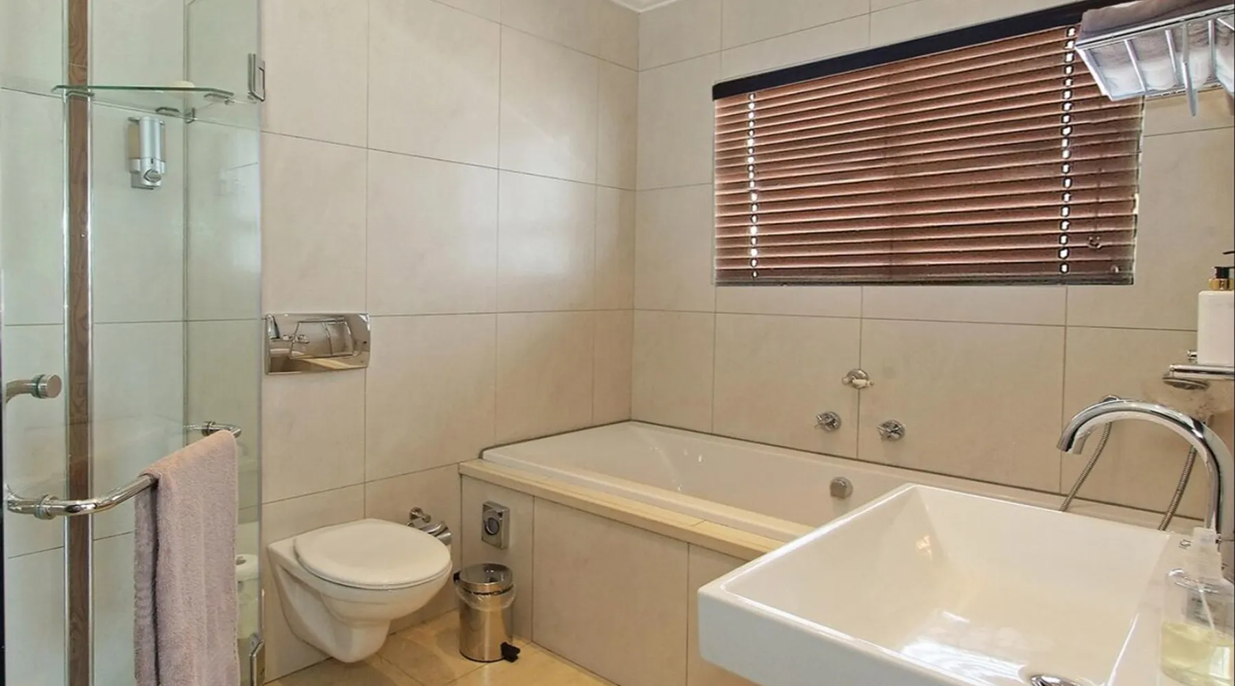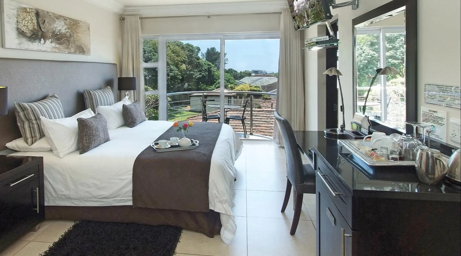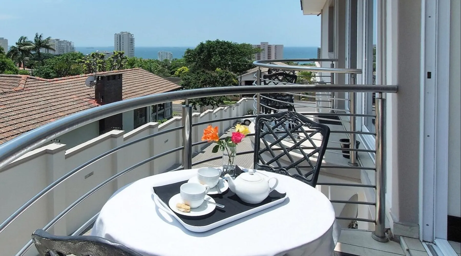 Opening onto the balcony, the spacious en-suite bedroom is furnished with 2 extra-length single beds or extra-length king-size bed, and an en-suite with a Jacuzzi bath and shower. Quality percale linen, DStv, DVD, air-conditioner, hospitality tray, safe.