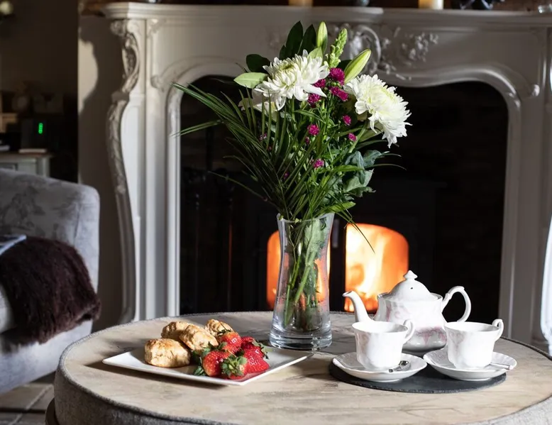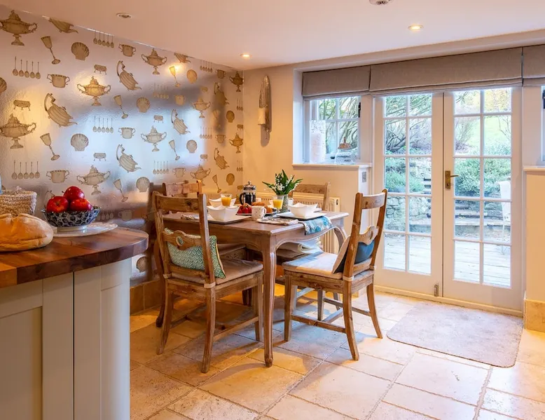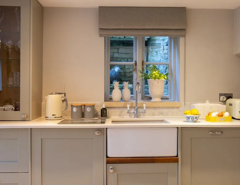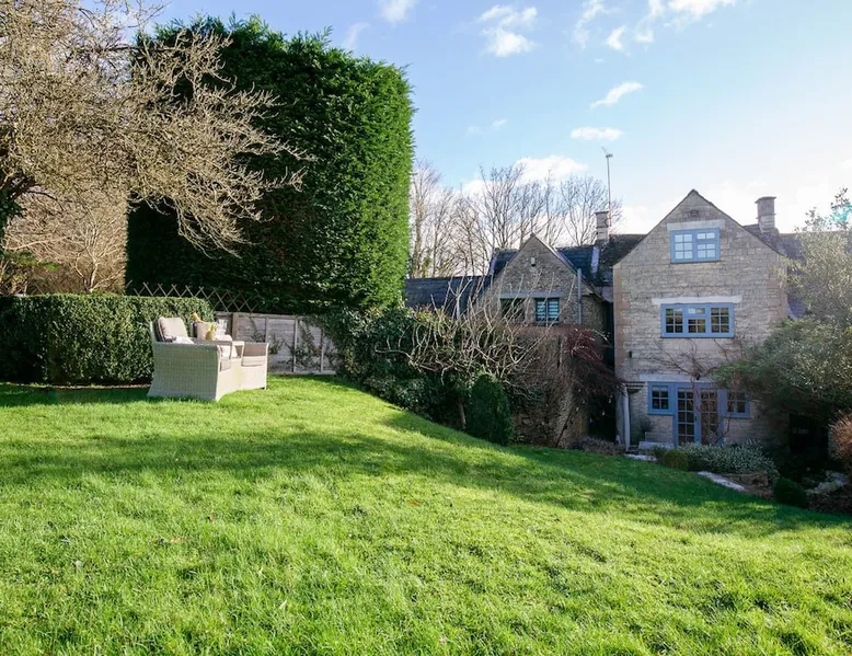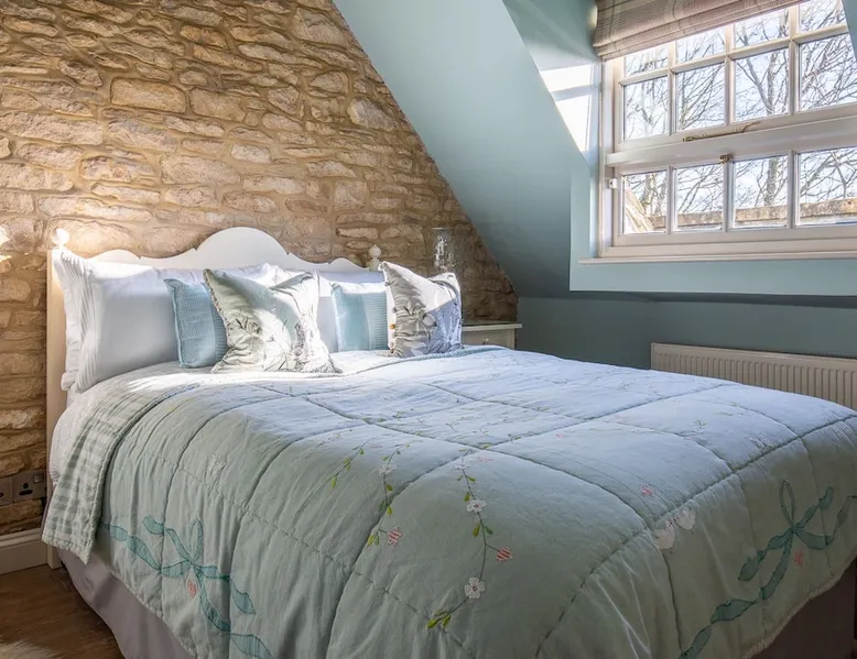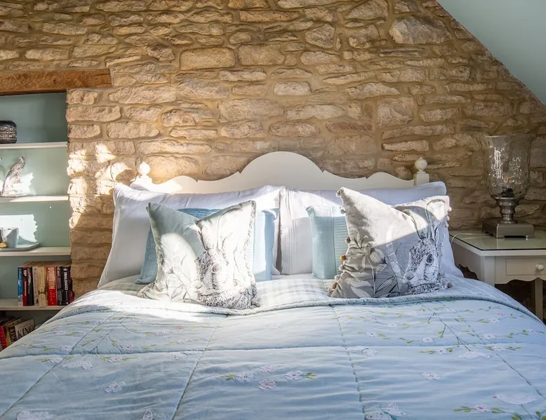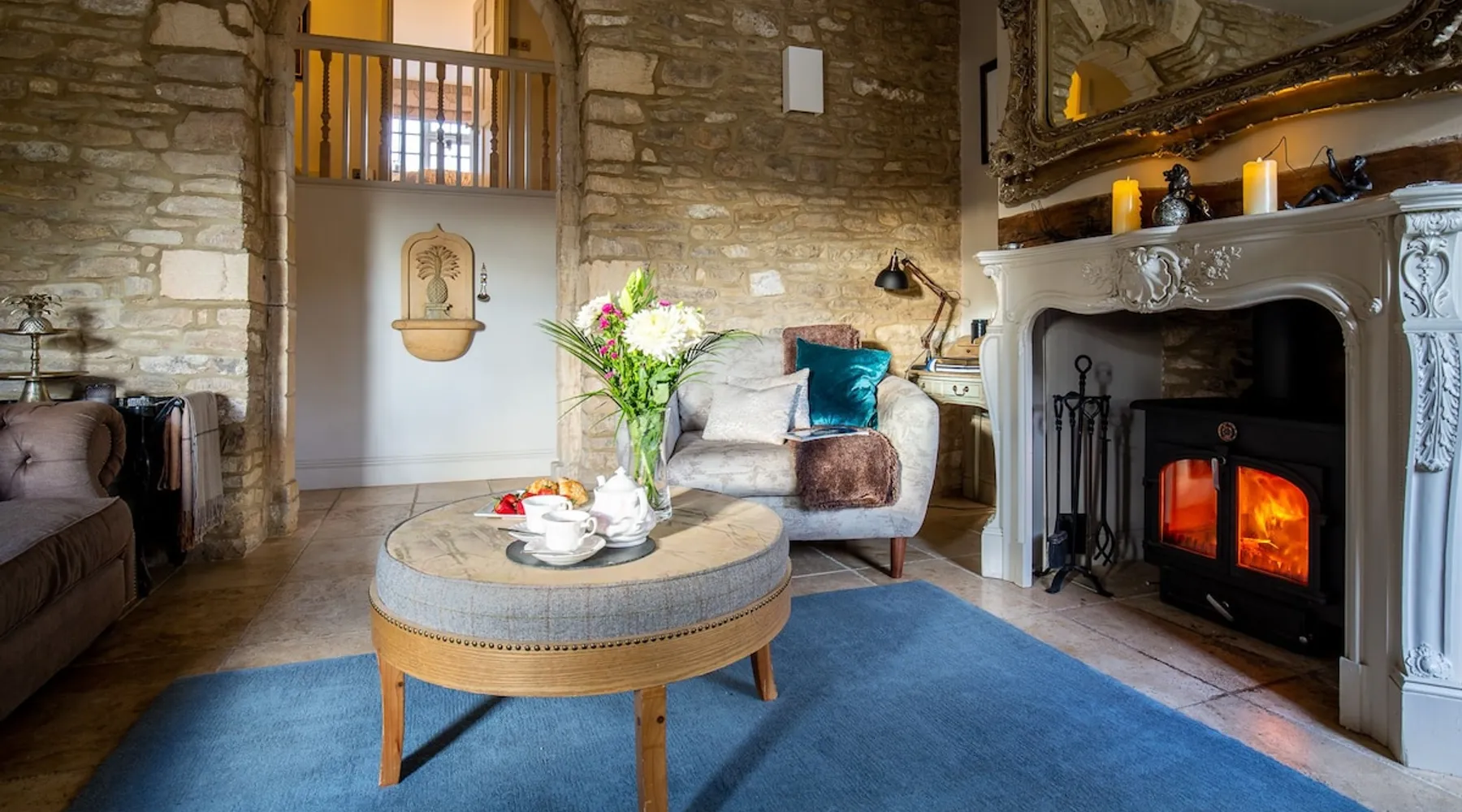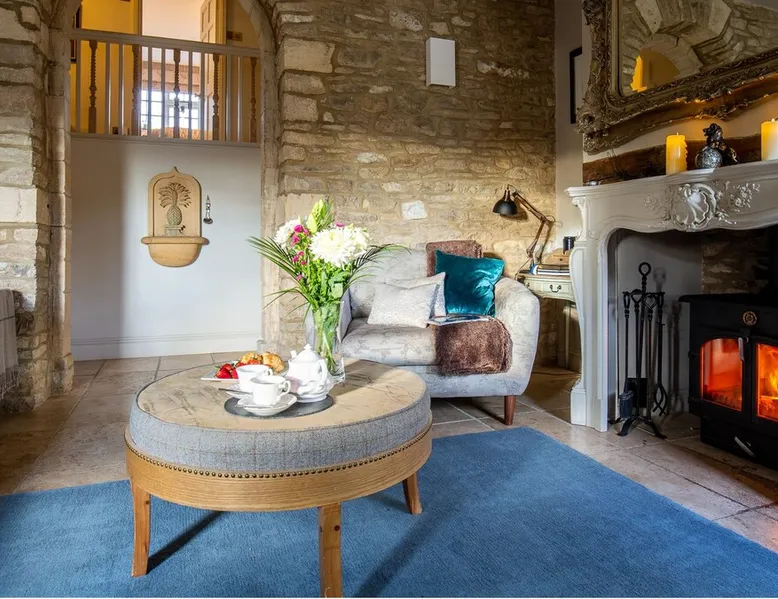 This chic Grade II* listed spa is a boutique escape ideally situated within walking distance of Stow-on-the-Wold and Lower Swell. In the living room is a wood burner in an exquisite wood surround and you will find a section of glass floor looking down to the source of the spa waters below. On the ground floor there is also a kitchen with a dining area where patio doors lead out to a garden. Across the first and second floor are two double bedrooms and a bathroom with a freestanding copper bath. The space Driving through the Cotswolds to your holiday destination you will pass by popular destinations like Stow-on-the-Wold, Upper and Lower Swell and Bourton-on-the-Water. When you arrive at Pineapple Spa Cottage the breathtaking carved stone facade is a reflection of the beauty you will find within. It is debated that the property was designed by Samuel Pepys Cockerell, the architect behind Sezincote House. The front door opens into the living room with a large ornate mirror, wood burner in a detailed surround and a luxurious sparkling chandelier in the high ceiling above. A comfortable sofa and armchair gather around the fire providing a comfortable place to enjoy an evening drink. An open stone wall showcases the pineapple font through an archway as you pass through to the rest of the cottage. The well-equipped kitchen has an electric AGA, a Belfast sink and plenty of space to prepare delicious meals to be enjoyed around the four-seater dining table. Doors open from here to the lawned garden which you can climb to enjoy beautiful Cotswold country views. From the living room a number of steps lead you to the lavish bedrooms which have been furnished with a high attention to detail. The bathroom at Pineapple Spa Cottage is a fantastic addition where you will find yourself spending many hours. The freestanding reclaimed copper bath makes you feel like royalty as you soak away your worries. With off-road parking for two cars and unmissable sights such as Sezincote House and Gardens, Chastleton House and the towns and villages of Chipping Norton, Broadway and Cheltenham a bit further afield this is the perfect Cotswold getaway. Ground Floor Sitting Room: Full of unique features and eye-catching décor the first thing that takes your eye is the pineapple water fountain at the end of the room. No longer connected to the spa supply, many women over the years have visited this tiny spa for the health benefits of the waters here. A glass panel in the corner of the room shows the spa below and if you listen carefully you can hear the water trickling. There is comfortable seating for four, a wood burner, artwork showing the spa exterior and an upcycled dresser which used to house chickens. Full of character this sitting room is a beautiful space to spend your evenings. Kitchen/Diner: Two steps from the living room take you down to the kitchen/diner passing a handy WC on the left. The kitchen has enough space to prepare meals with an electric AGA and all the modern conveniences you could need. The dining table seats four in front of patio doors which open to the garden and patio. First Floor In front of the pineapple spa font, stairs curve around to the first bedroom. Bedroom One: The only room on this floor, this first bedroom is a king-size double with an elegant gold bedframe and luxuriously plump bedding. Built-in wardrobes hiding a pull-out TV and a dressing table with carved pineapple details around the mirror is perfect for getting ready for a meal out. There are mirrored bedside tables and wall lights to each side of the bed. Overlooking the garden this quiet room is a peaceful retreat. Second Floor More stairs take you up to the second-floor landing with a small bench, before there are three steps down to the second bedroom and the bathroom. Bedroom Two: In the eaves at the front of the cottage, this king-size double room has an open stone wall, exposed beams and a wooden floor. Decorated in a tranquil blue with a selection of books you can relax on the armchair with a cup of coffee. A bedside table and built-in dress offer storage and there is a lamp and TV. The ornate framed mirror adds a touch of luxury to this room. Bathroom: Completing this cottage is a stunning bathroom with a freestanding copper bath, separate shower, bowl sink unit and WC. The reclaimed bath holds its heat so you can spend hours here away from the real world. An old fireplace surround and open stone wall add a grandeur to this room. Outside A patio outside the kitchen has a dining table for four and leads up to a sloped lawn which looks out across surrounding countryside and a lake, above which the sunsets are spectacular. Opposite the cottage there is private parking for two cars. Guest access Guests have full access to the house and garden. Other things to note • Book with us to get exclusive discounts to top attractions and experiences. • Pineapple Spa Cottage is an adult-only property and does not accept children or infants. • This property does not accept dogs or other pets. • There are a number of internal steps on each floor.