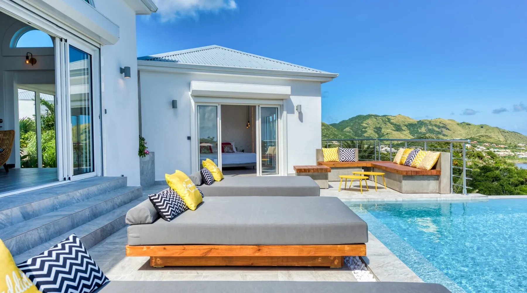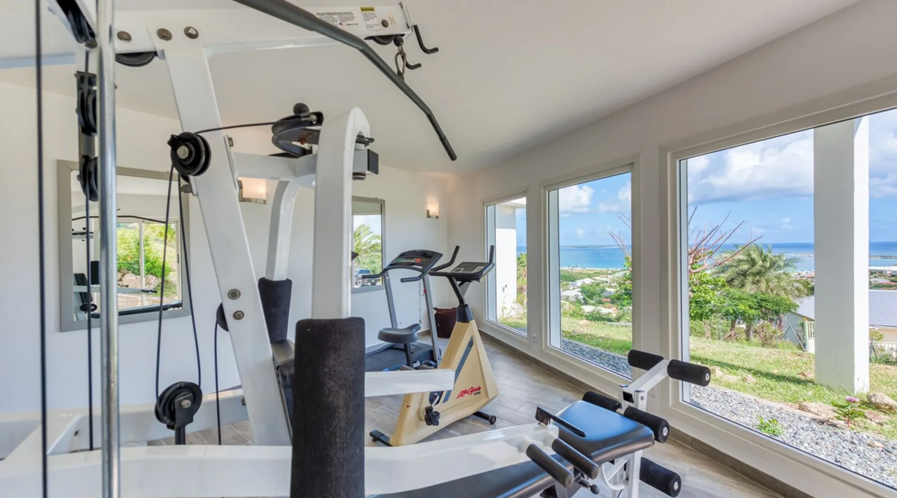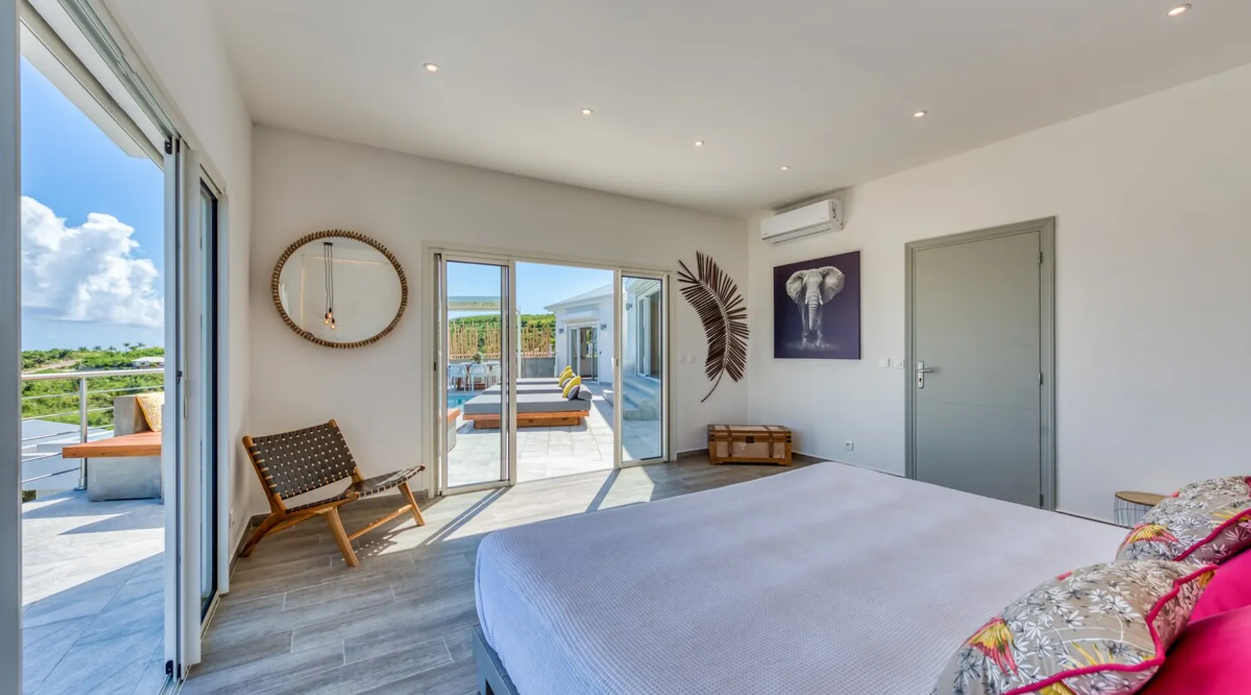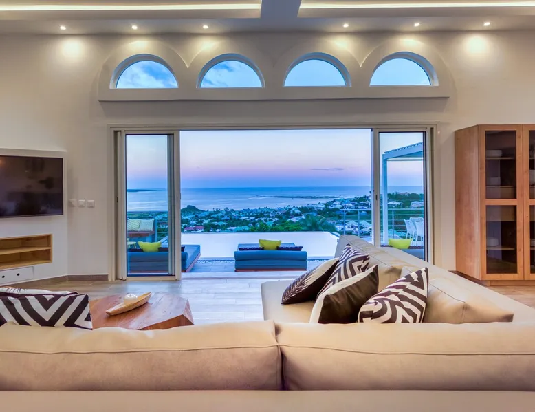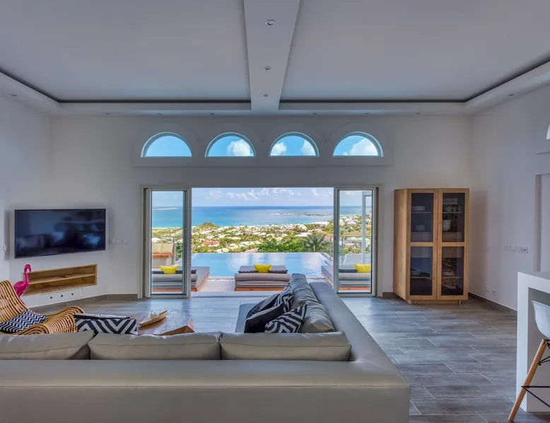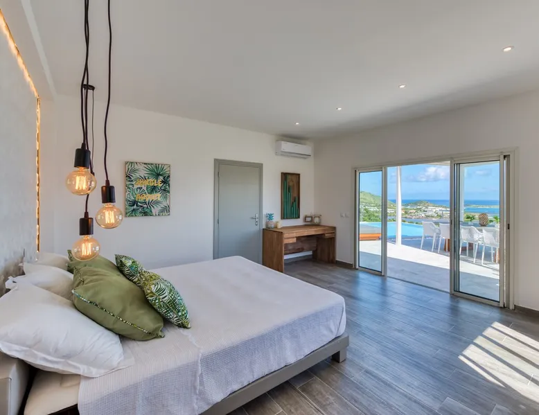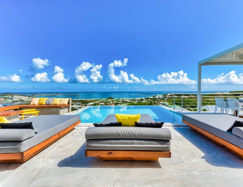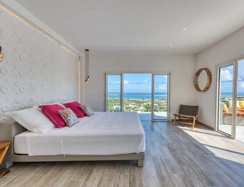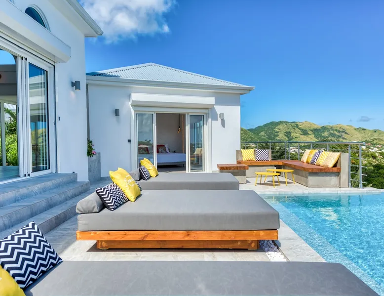 Overlooking the turquoise waters of Orient Bay and the islands of Pinel and Tintamarre, Villa Topaze is a modern and contemporary 3 bedroom property. Villa Topaze has indoor accessed bedrooms, a/c throughout, and a well equipped gym with a view. Villa Topaze is a fantastic family vacation home. Villa Topaze can be rented with Villa Turquoze to make 7 bedrooms. Villa Topaze the best way to spent your vacation in St Martin and can be rented as a 2 or a 3 bedroom villa!