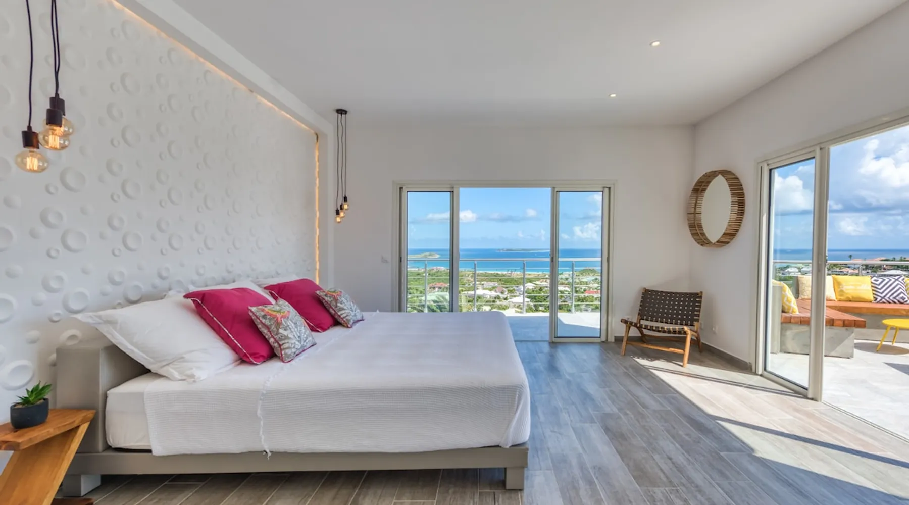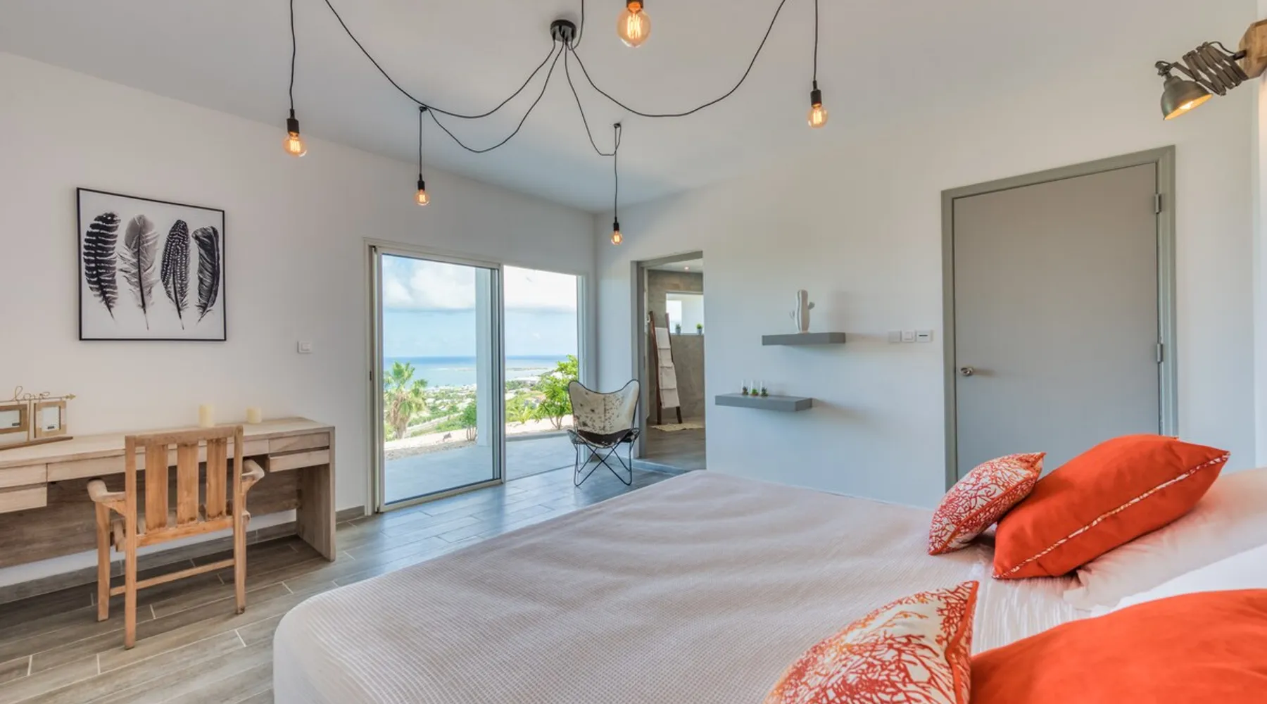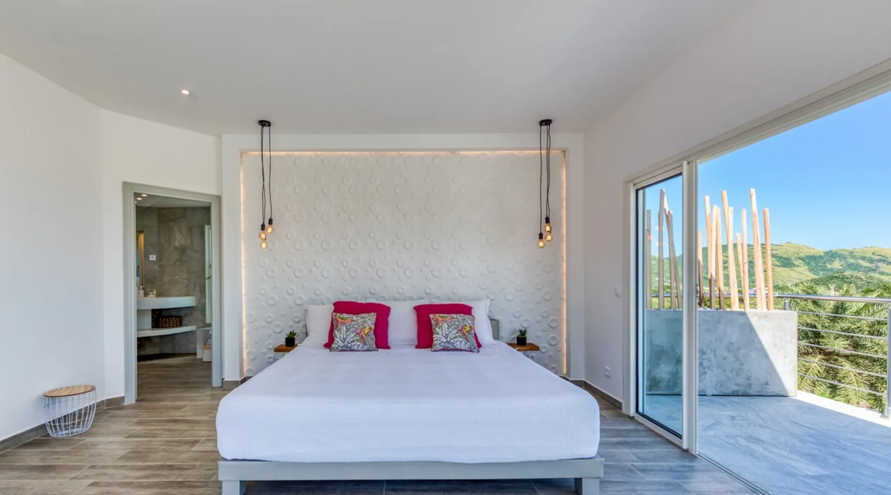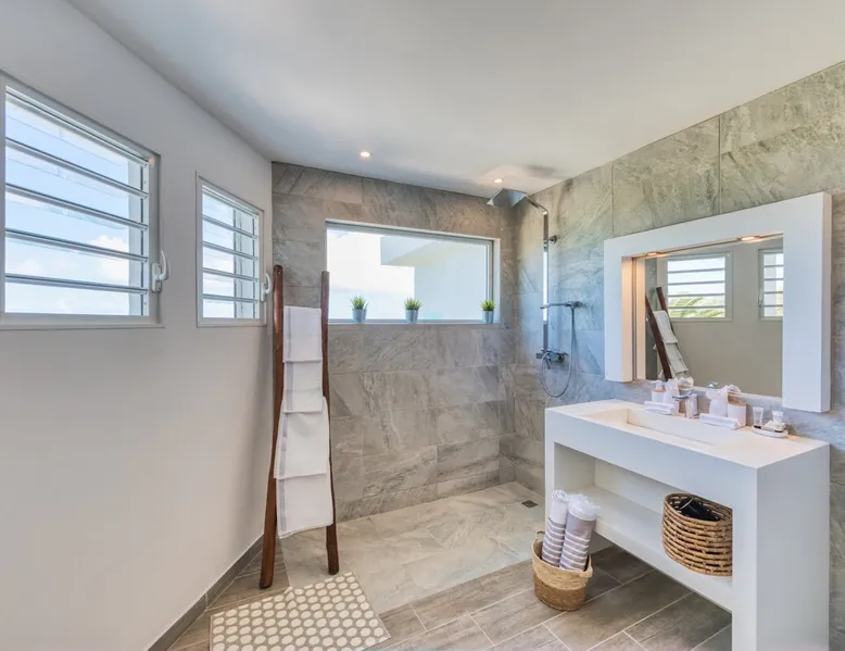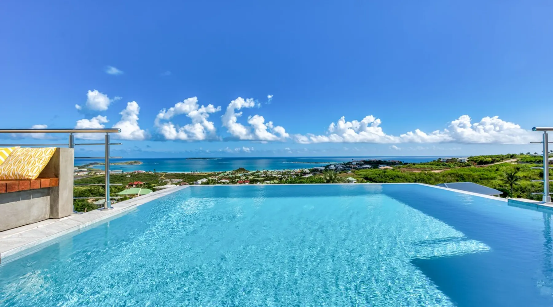 Overlooking the turquoise waters of Orient Bay and the islands of Pinel and Tintamarre, Villa Topaze is a modern and contemporary 3 bedroom property. Villa Topaze has indoor accessed bedrooms, a/c throughout, and a well equipped gym with a view. Villa Topaze is a fantastic family vacation home. Villa Topaze can be rented with Villa Turquoze to make 7 bedrooms. Villa Topaze the best way to spent your vacation in St Martin and can be rented as a 2 or a 3 bedroom villa!