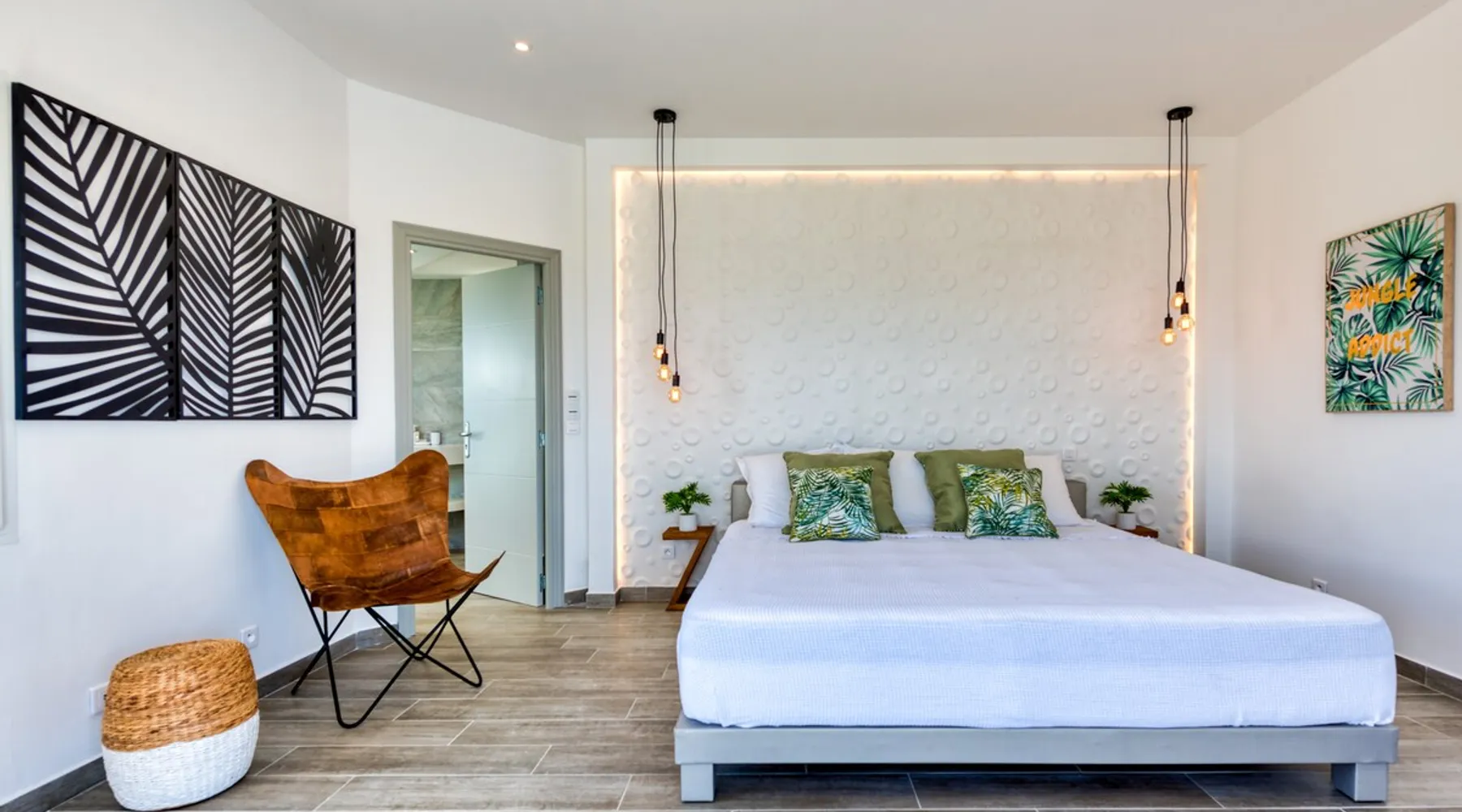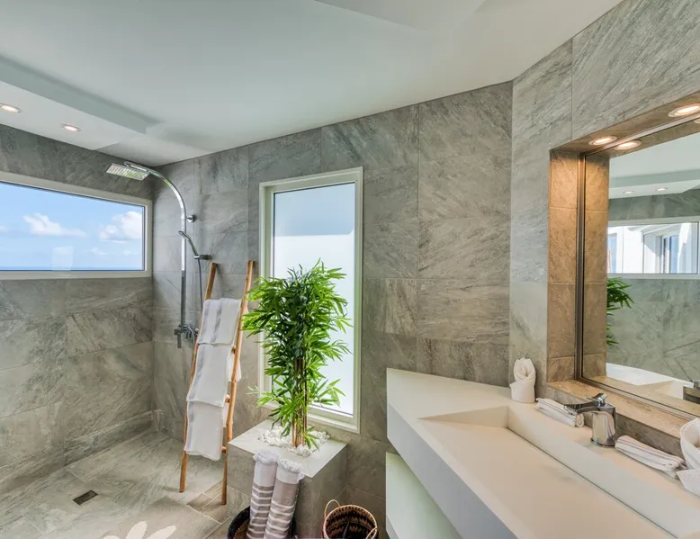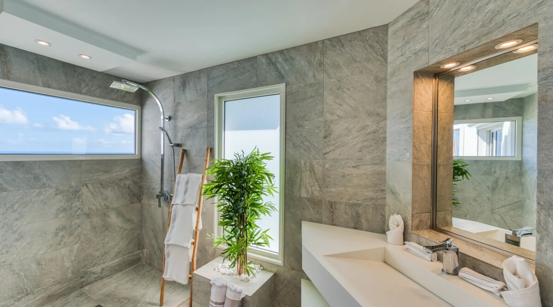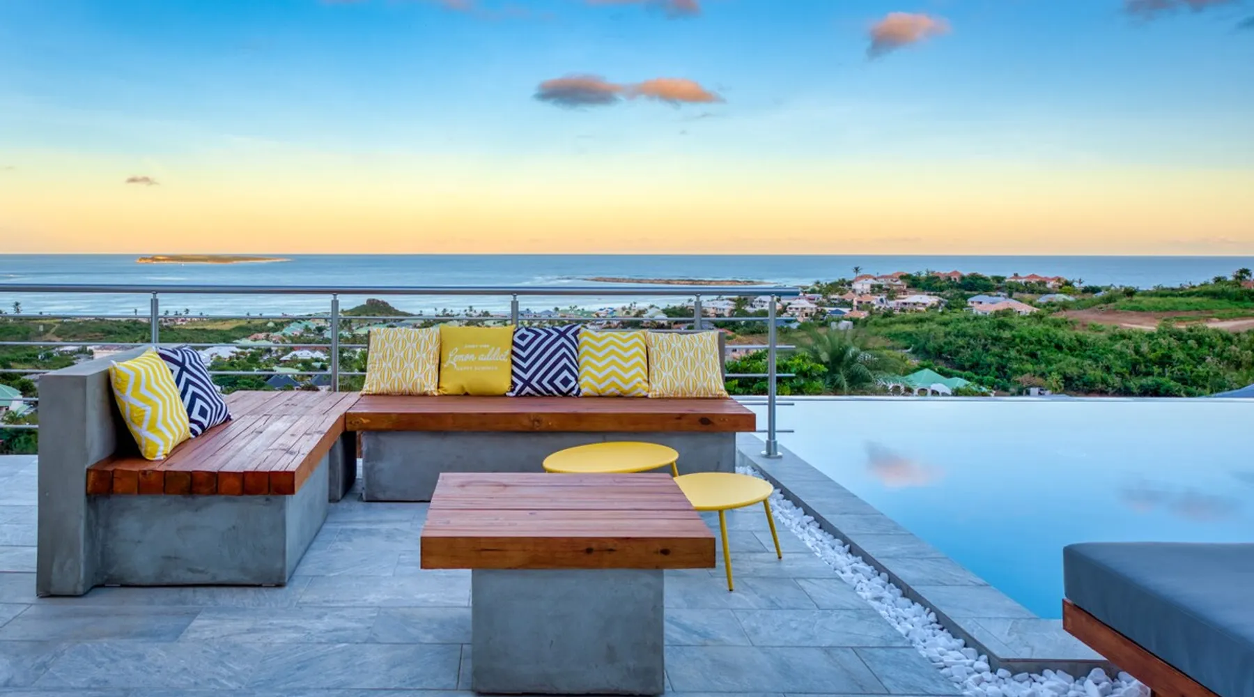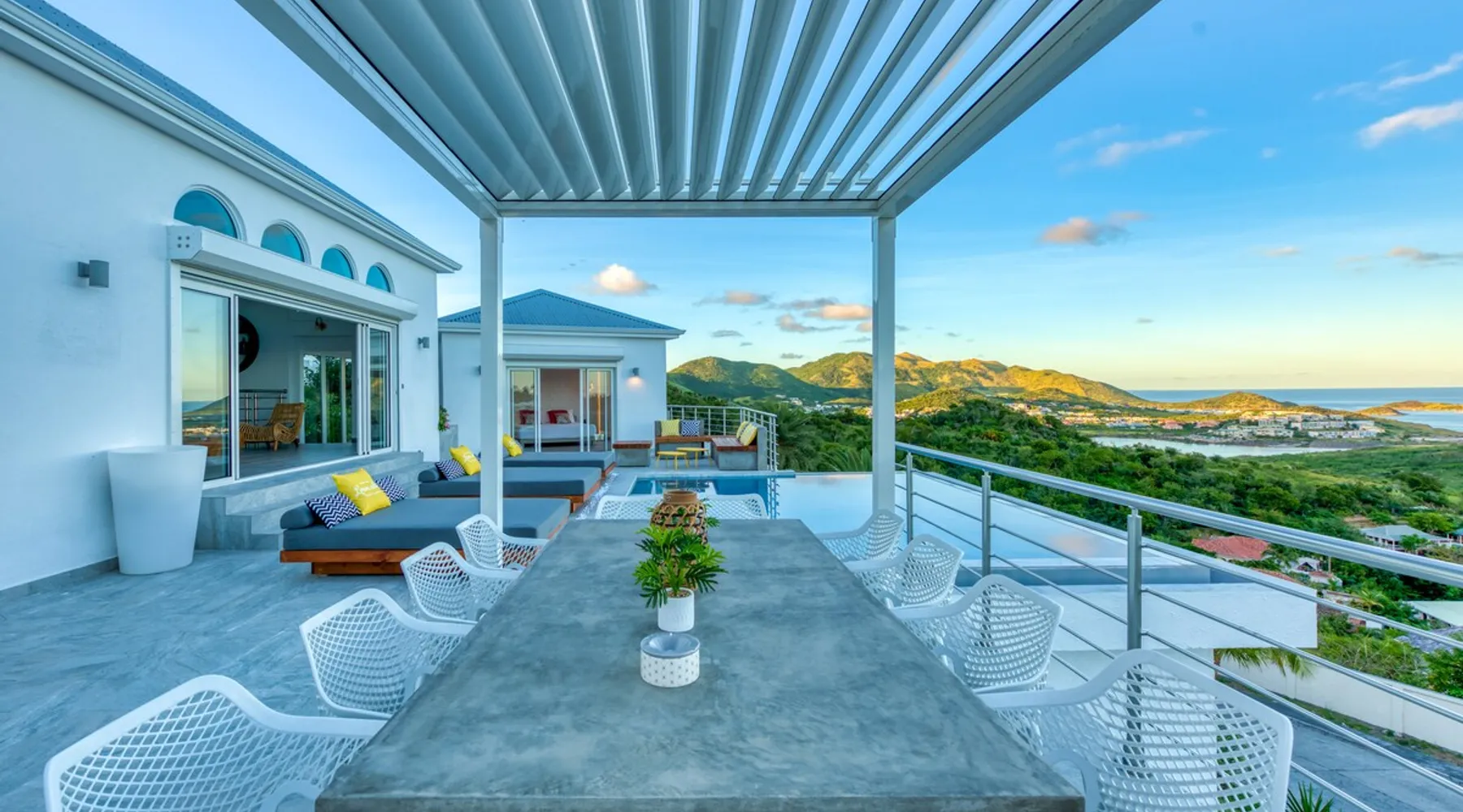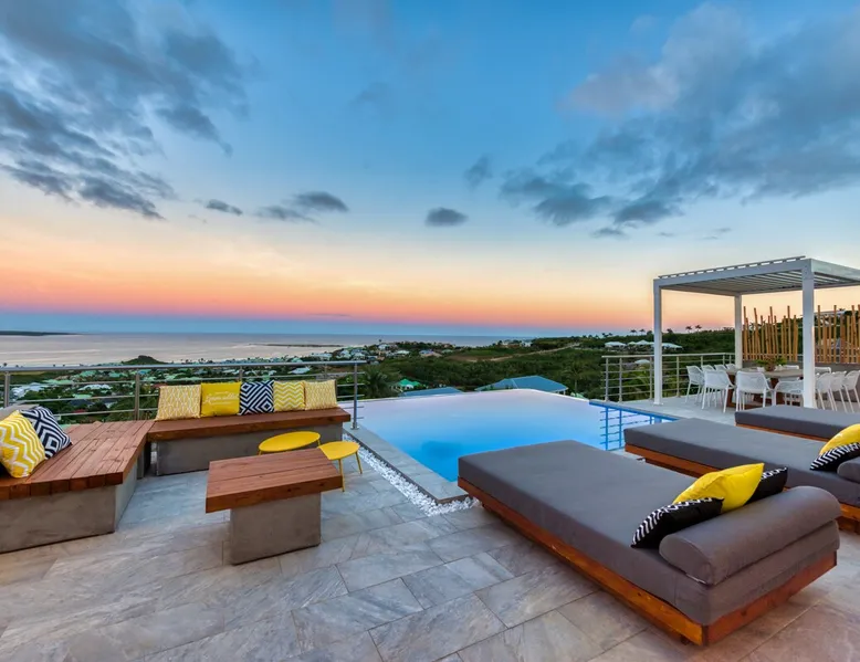 Overlooking the turquoise waters of Orient Bay and the islands of Pinel and Tintamarre, Villa Topaze is a modern and contemporary 3 bedroom property. Villa Topaze has indoor accessed bedrooms, a/c throughout, and a well equipped gym with a view. Villa Topaze is a fantastic family vacation home. Villa Topaze can be rented with Villa Turquoze to make 7 bedrooms. Villa Topaze the best way to spent your vacation in St Martin and can be rented as a 2 or a 3 bedroom villa!
