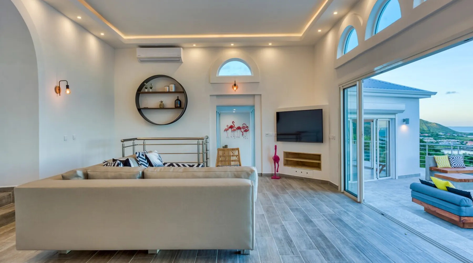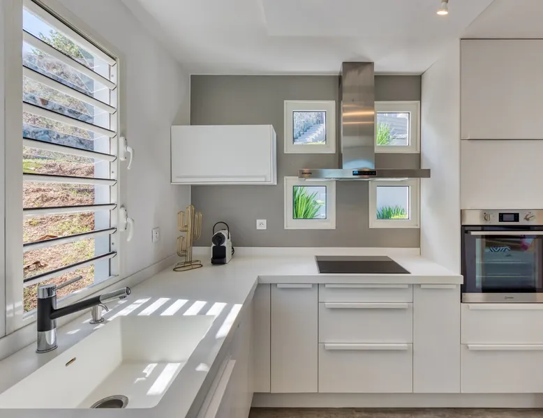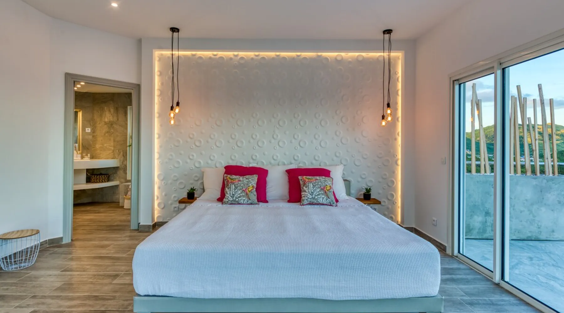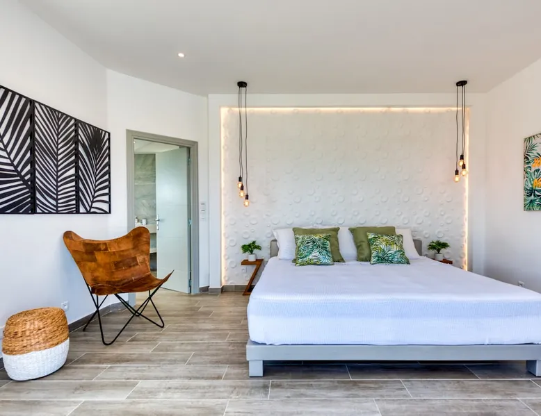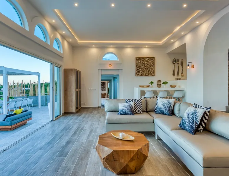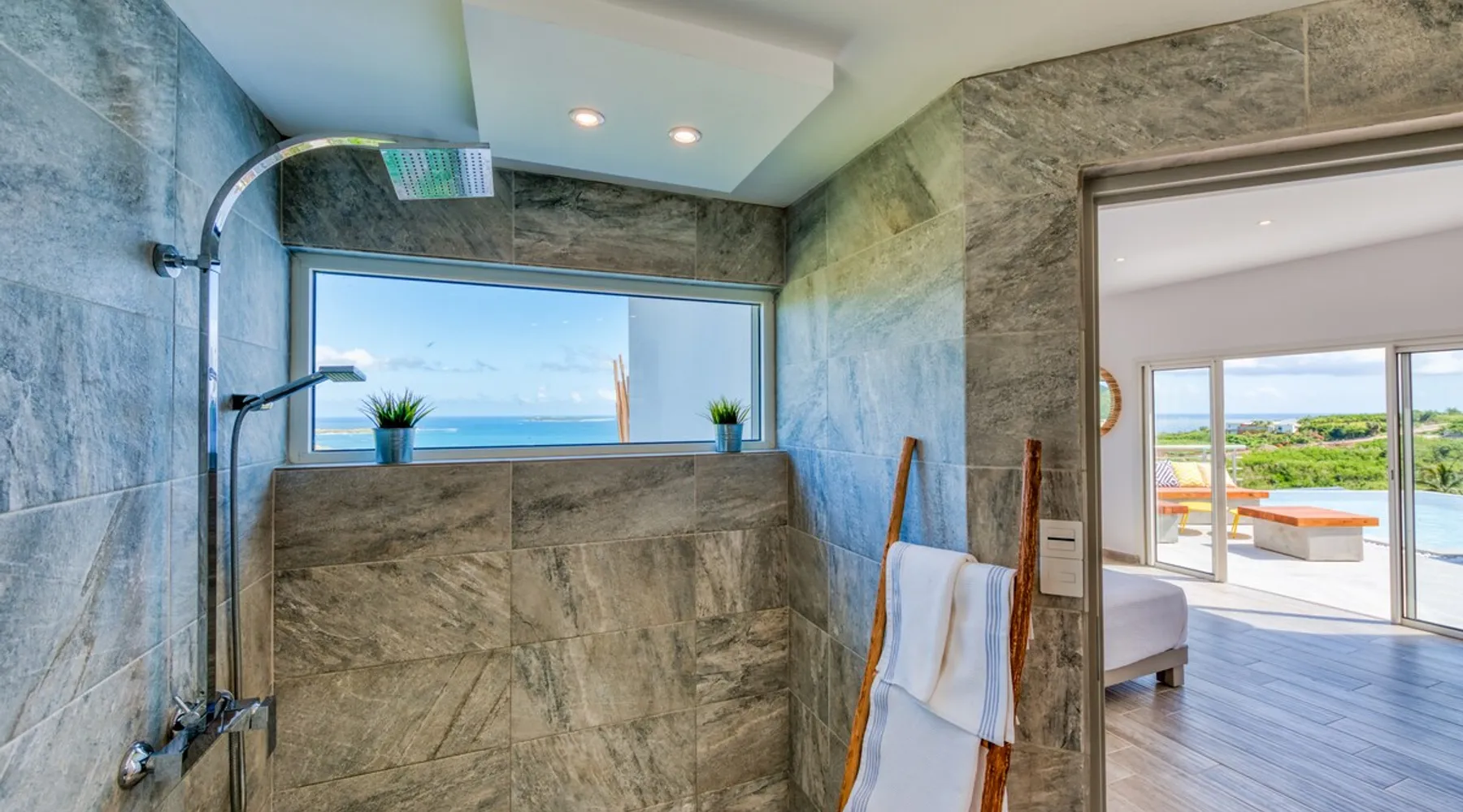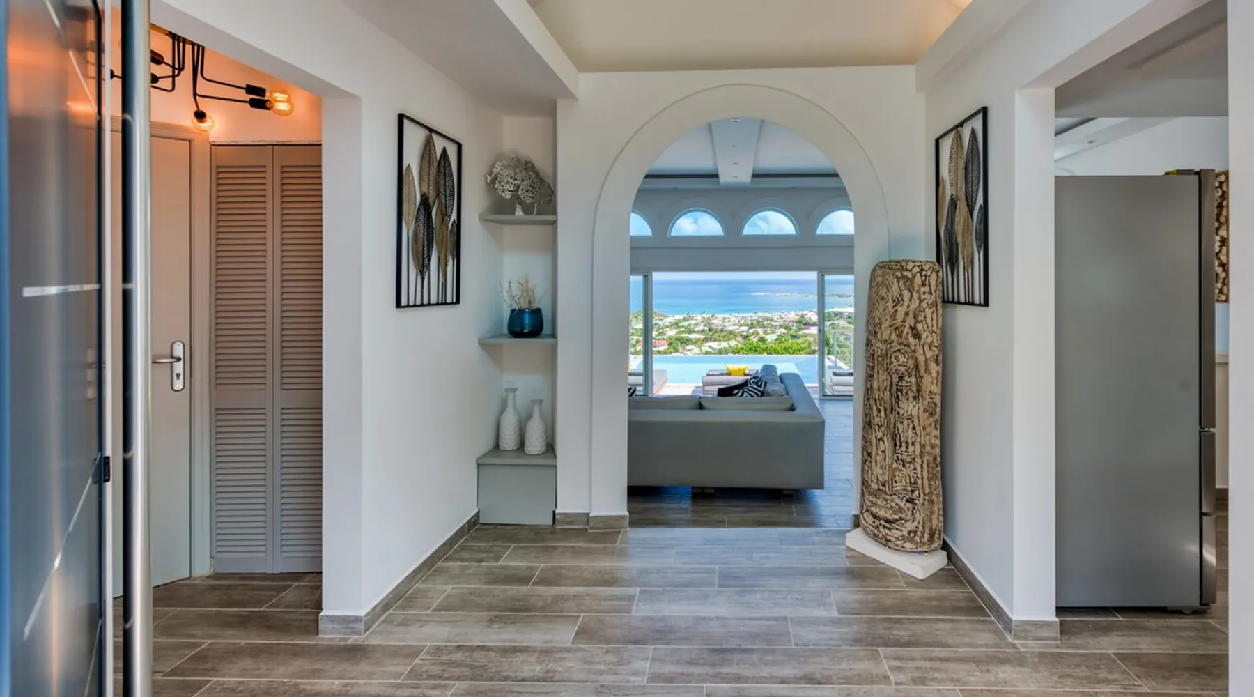 Overlooking the turquoise waters of Orient Bay and the islands of Pinel and Tintamarre, Villa Topaze is a modern and contemporary 3 bedroom property. Villa Topaze has indoor accessed bedrooms, a/c throughout, and a well equipped gym with a view. Villa Topaze is a fantastic family vacation home. Villa Topaze can be rented with Villa Turquoze to make 7 bedrooms. Villa Topaze the best way to spent your vacation in St Martin and can be rented as a 2 or a 3 bedroom villa!