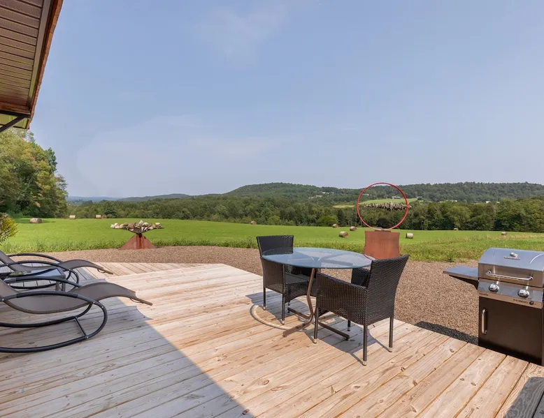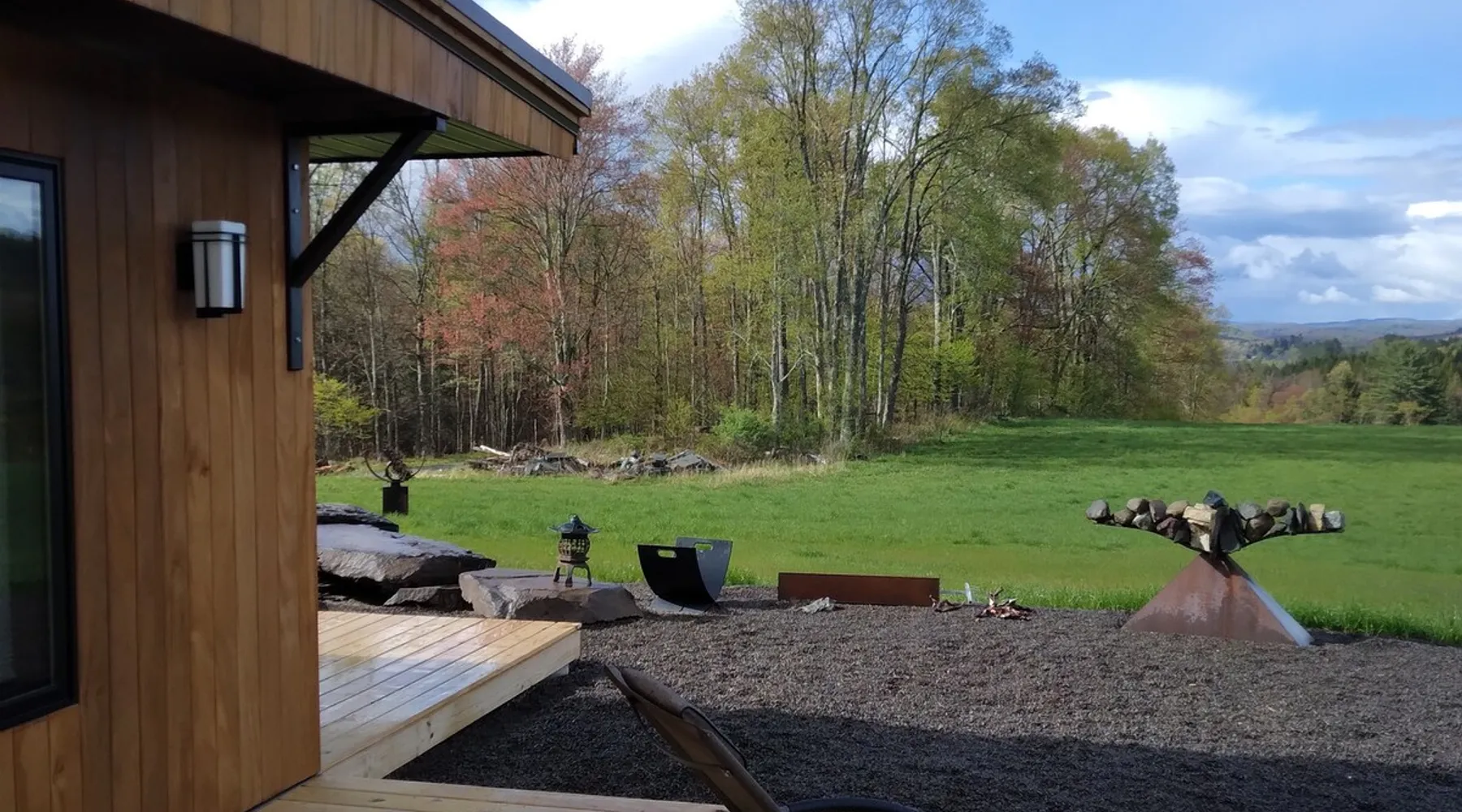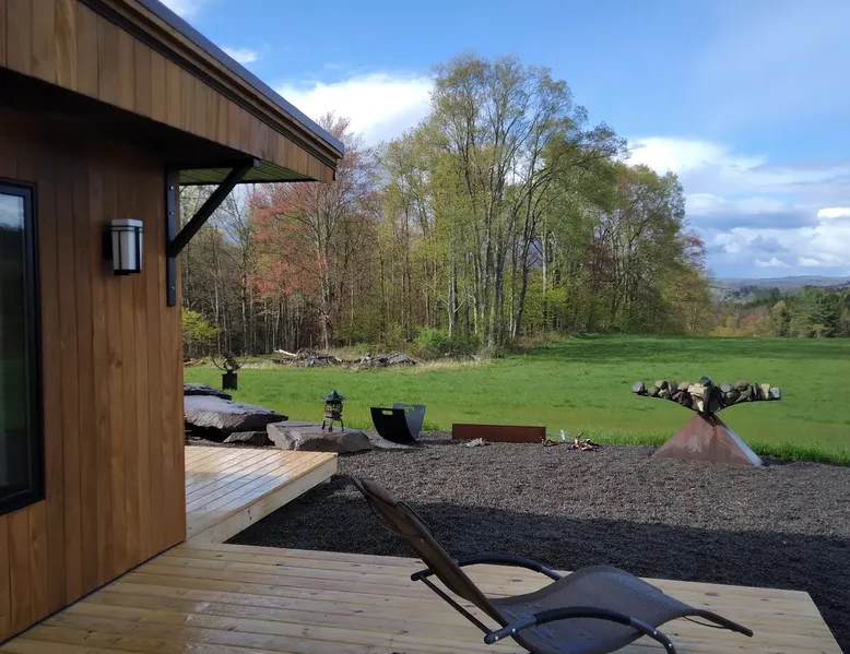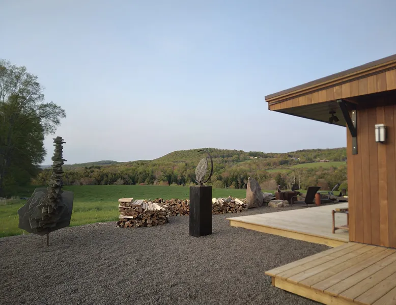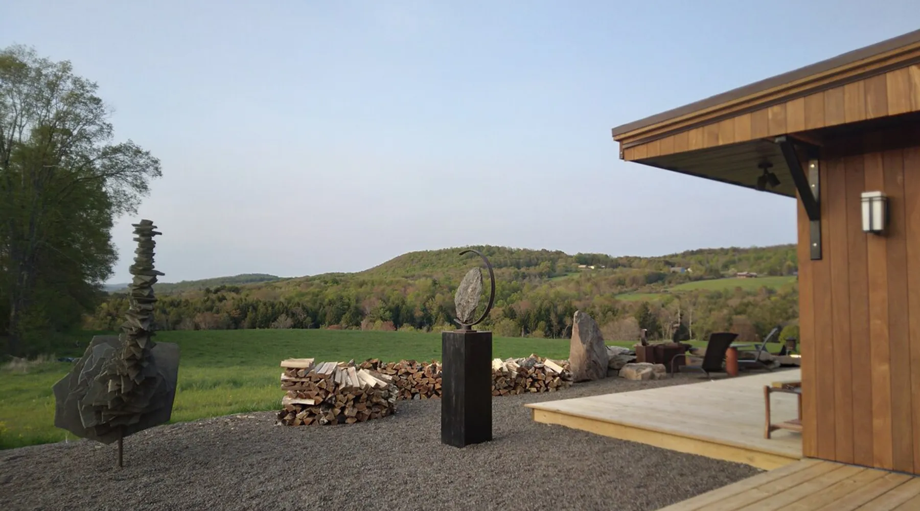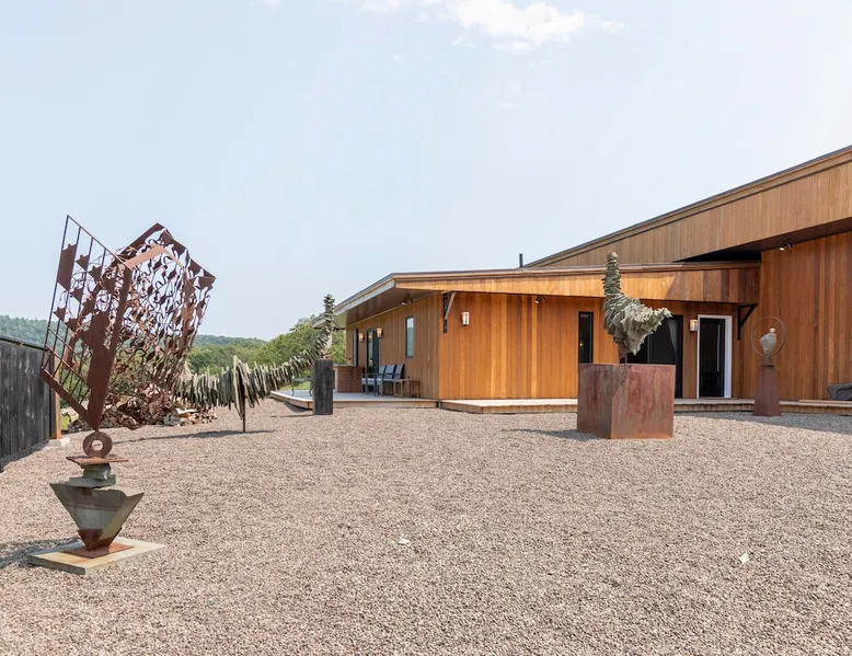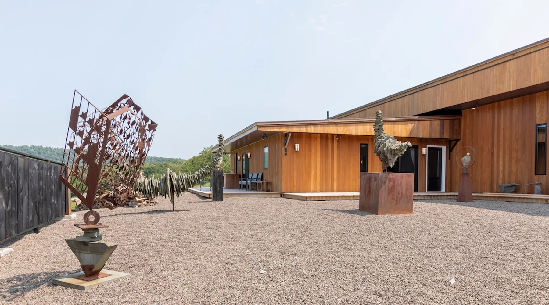 The Art House is set in a Sculpture Park developed by the artists Tom and Carol Holmes.The Parks 38 acres of rolling hills, grass land with valley views are bordered by two streams and woodlands.The views are magnificent.The house is set on the second tier of three rolling hills.Tom creates magical and life changing experiences in the landscape; at EBC Bird Sanctuary Sculpture Park. The Art House offers exceptional privacy, incredible quiet and extensive wildlife. A pristine experience awaits. The space The blue room is where you enter. It is your living room with super comfy furniture and a huge screen. Sculpture and ice prints surround the perimeter. The next room is the kitchen. Very big with lots of cooking amenities, a huge island for prep, an intimate dinner table for two. Ice prints, color, sculpture accent the space. The next room is the bedroom. A sitting area to hang or have a drink. A queen bed. Lots of dresser storage to make the visit neat. An electric fireplace for ambiance. Lights are all on dimmers. High end sheets for comfort and coolness. The bed overlooks the fire pit and the wood fired sauna just beyond the deck. The landscape unfolds to an expansive valley view. The bath is pure luxury. A soaking tub, round glass shower; beautiful tile, natural light. A real enjoyable amenity for the property. Sliding doors open to decks that wrap the Art House on all sides. Plenty of tables, lounges and spaces set to enjoy the views, sun, breezes, landscape, deer and sculpture. The fire pit has two lounge chairs low to the ground so you can cozy up to the steel custom made structure. Big stones and lots of wood supplied make this amenity a real treat. The new lifestyle X3 Hot Tub by Aqua Living is in and up to temperature. Guest access The Apartment is completely for the guests only. Totally private. The estate house is shaped like a plane. The north wing is for guests, the south wing is our living space. The center space is a museum gallery that separates the two. We have no access to the apartment while guests are here and respect their peace, tranquility, quiet and privacy. The space is over 1000 sq ft, roomy and comfortable for couples. The decks spill out onto the landscape and amenities. We enjoy greeting our guests when possible. No contact visits are available upon request. Privacy and tranquility are always assured. Other things to note Single nights available occasionally and upon request. Single nights are available usually mid week.
