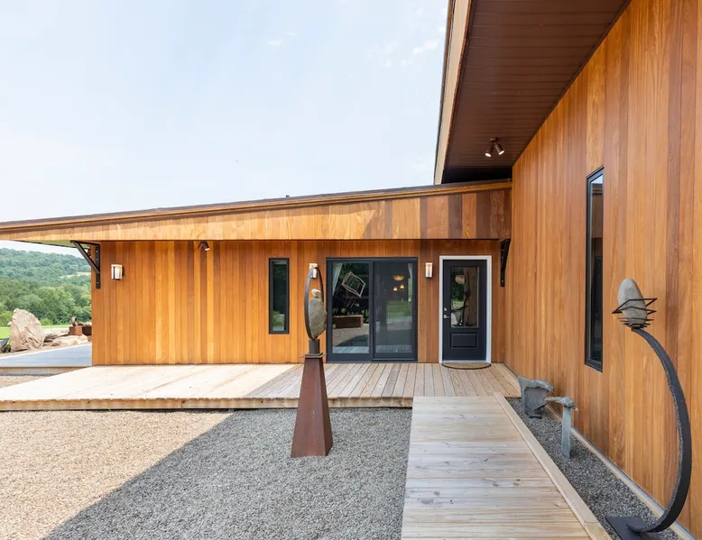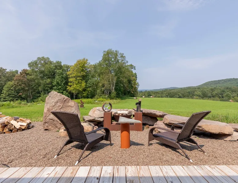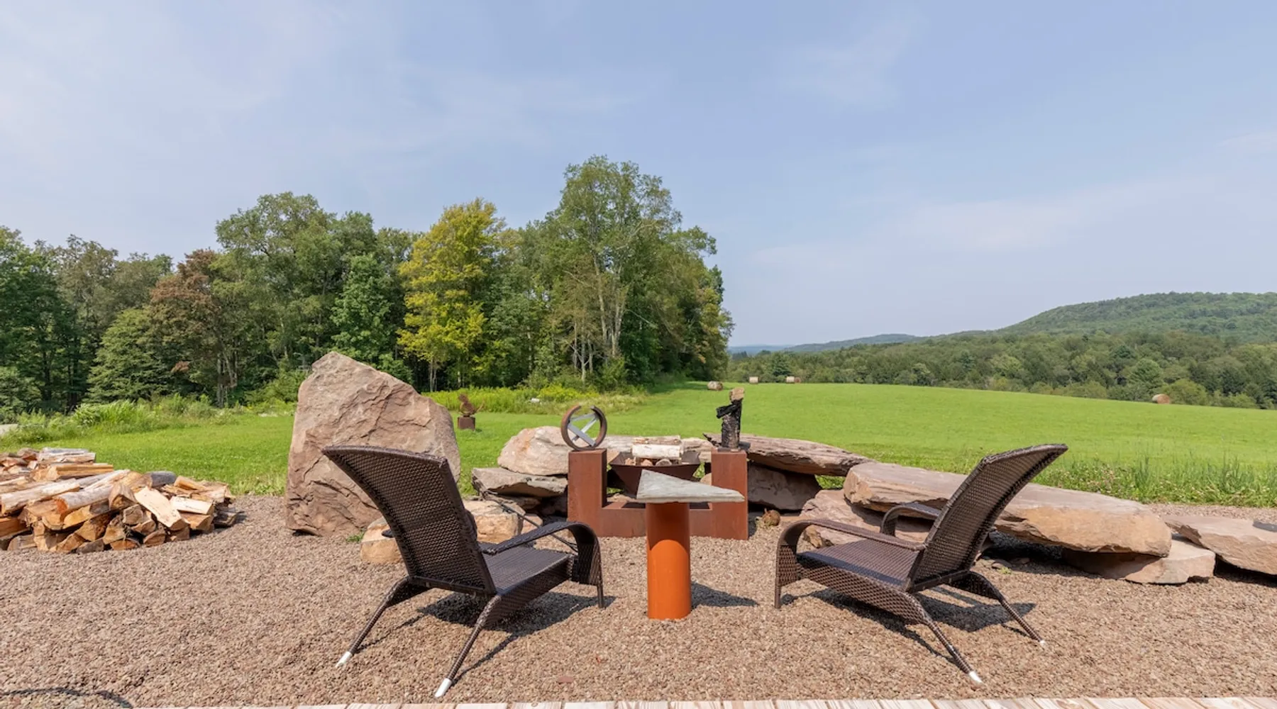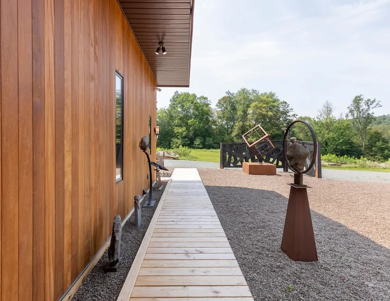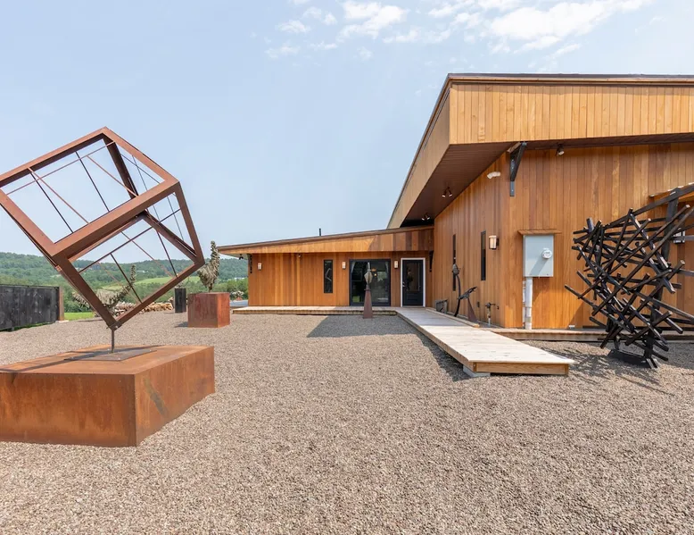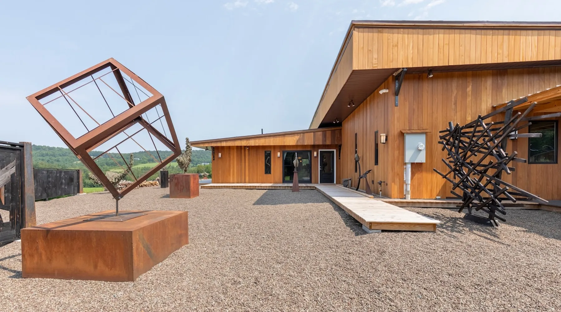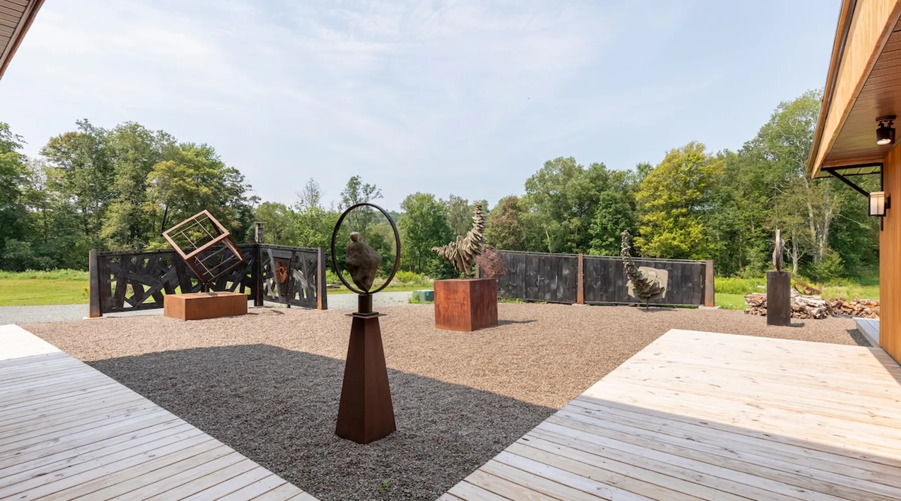 The Art House is set in a Sculpture Park developed by the artists Tom and Carol Holmes.The Parks 38 acres of rolling hills, grass land with valley views are bordered by two streams and woodlands.The views are magnificent.The house is set on the second tier of three rolling hills.Tom creates magical and life changing experiences in the landscape; at EBC Bird Sanctuary Sculpture Park. The Art House offers exceptional privacy, incredible quiet and extensive wildlife. A pristine experience awaits. The space The blue room is where you enter. It is your living room with super comfy furniture and a huge screen. Sculpture and ice prints surround the perimeter. The next room is the kitchen. Very big with lots of cooking amenities, a huge island for prep, an intimate dinner table for two. Ice prints, color, sculpture accent the space. The next room is the bedroom. A sitting area to hang or have a drink. A queen bed. Lots of dresser storage to make the visit neat. An electric fireplace for ambiance. Lights are all on dimmers. High end sheets for comfort and coolness. The bed overlooks the fire pit and the wood fired sauna just beyond the deck. The landscape unfolds to an expansive valley view. The bath is pure luxury. A soaking tub, round glass shower; beautiful tile, natural light. A real enjoyable amenity for the property. Sliding doors open to decks that wrap the Art House on all sides. Plenty of tables, lounges and spaces set to enjoy the views, sun, breezes, landscape, deer and sculpture. The fire pit has two lounge chairs low to the ground so you can cozy up to the steel custom made structure. Big stones and lots of wood supplied make this amenity a real treat. The new lifestyle X3 Hot Tub by Aqua Living is in and up to temperature. Guest access The Apartment is completely for the guests only. Totally private. The estate house is shaped like a plane. The north wing is for guests, the south wing is our living space. The center space is a museum gallery that separates the two. We have no access to the apartment while guests are here and respect their peace, tranquility, quiet and privacy. The space is over 1000 sq ft, roomy and comfortable for couples. The decks spill out onto the landscape and amenities. We enjoy greeting our guests when possible. No contact visits are available upon request. Privacy and tranquility are always assured. Other things to note Single nights available occasionally and upon request. Single nights are available usually mid week.