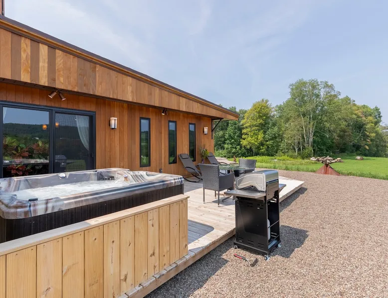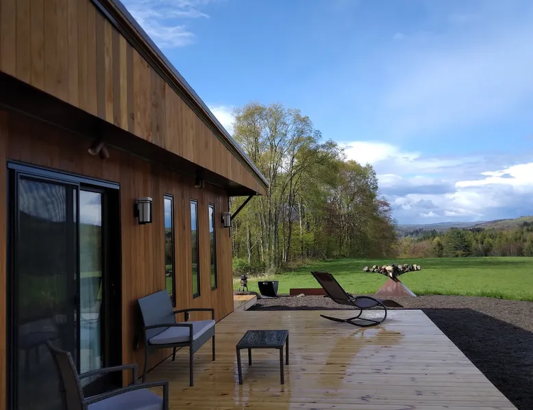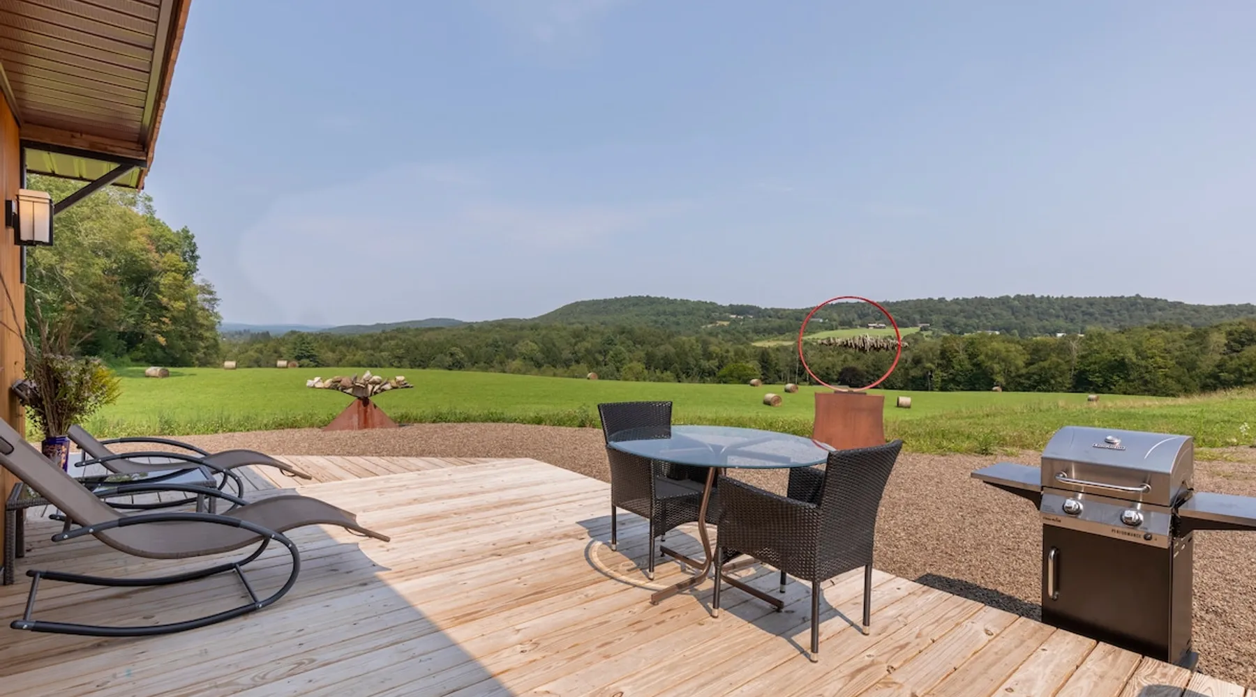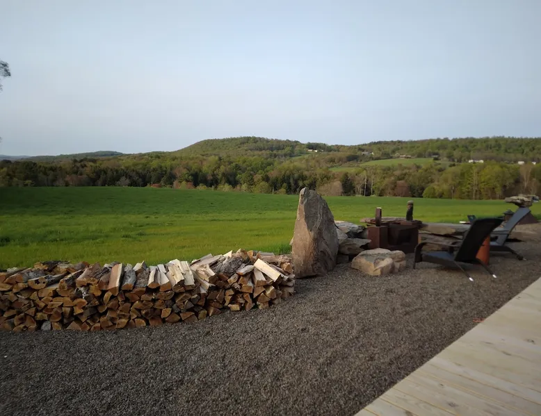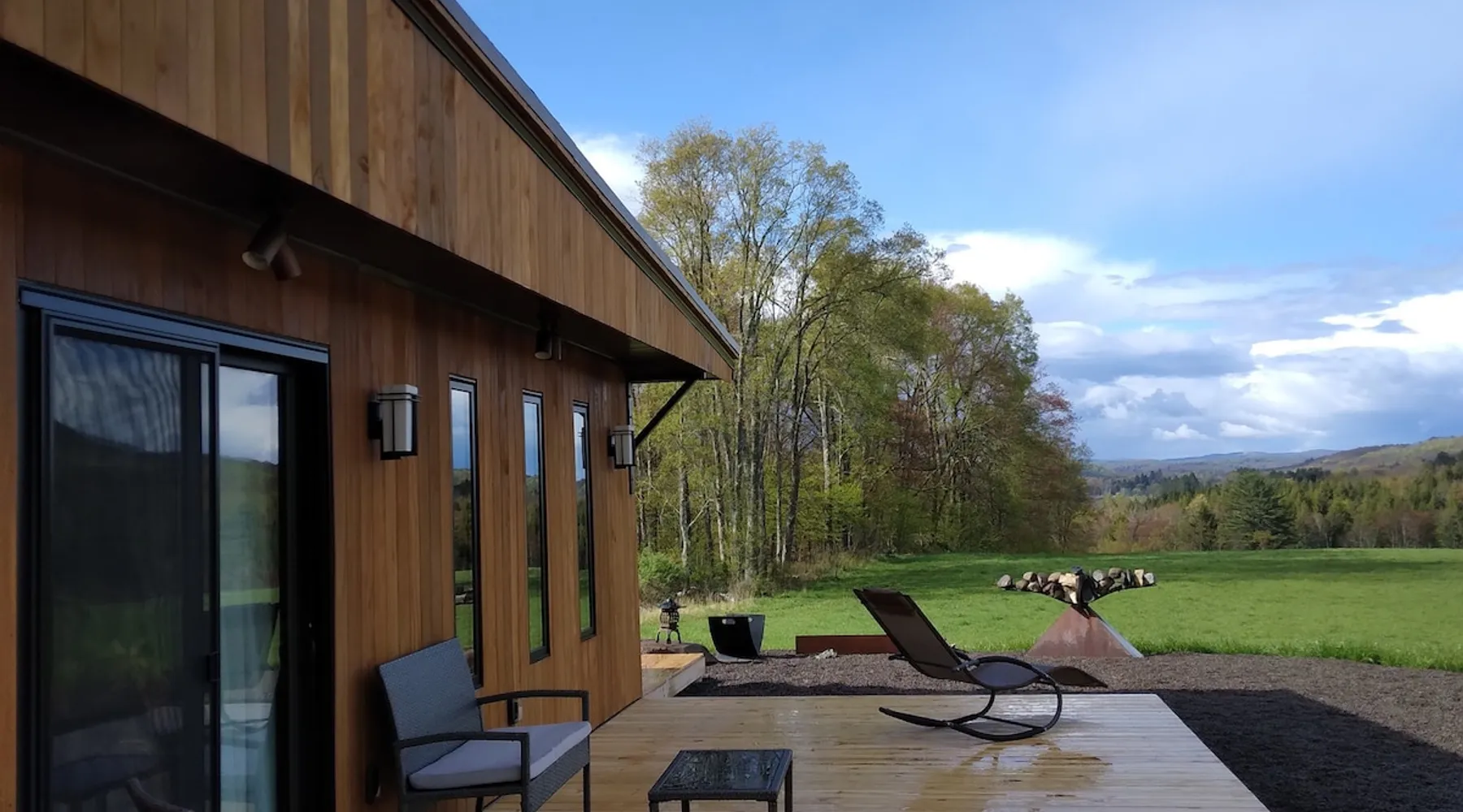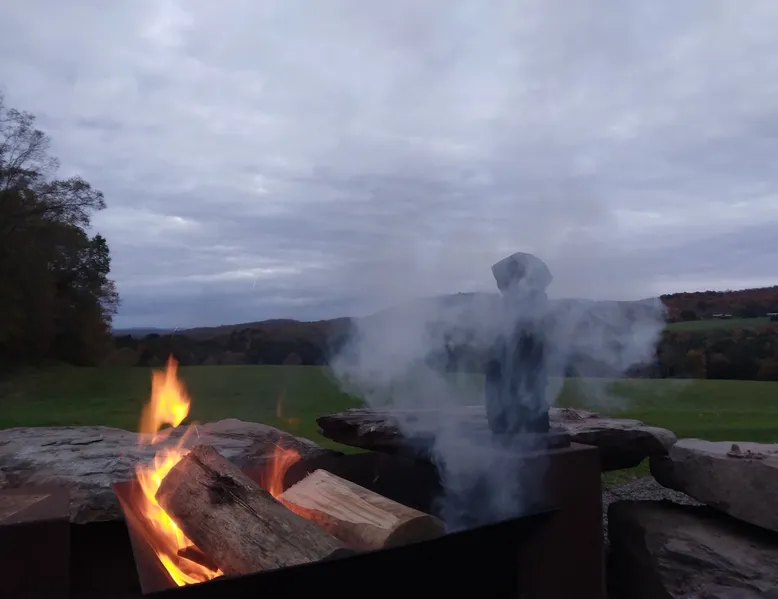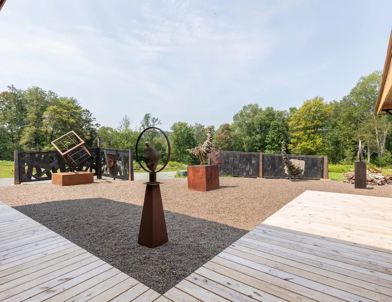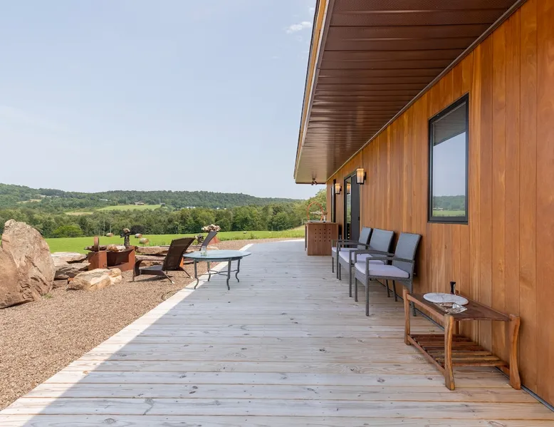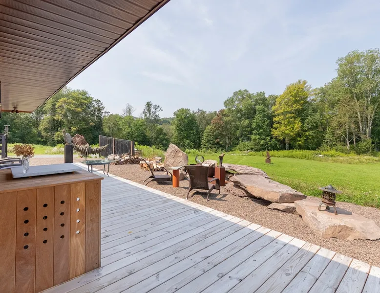 The Art House is set in a Sculpture Park developed by the artists Tom and Carol Holmes.The Parks 38 acres of rolling hills, grass land with valley views are bordered by two streams and woodlands.The views are magnificent.The house is set on the second tier of three rolling hills.Tom creates magical and life changing experiences in the landscape; at EBC Bird Sanctuary Sculpture Park. The Art House offers exceptional privacy, incredible quiet and extensive wildlife. A pristine experience awaits. The space The blue room is where you enter. It is your living room with super comfy furniture and a huge screen. Sculpture and ice prints surround the perimeter. The next room is the kitchen. Very big with lots of cooking amenities, a huge island for prep, an intimate dinner table for two. Ice prints, color, sculpture accent the space. The next room is the bedroom. A sitting area to hang or have a drink. A queen bed. Lots of dresser storage to make the visit neat. An electric fireplace for ambiance. Lights are all on dimmers. High end sheets for comfort and coolness. The bed overlooks the fire pit and the wood fired sauna just beyond the deck. The landscape unfolds to an expansive valley view. The bath is pure luxury. A soaking tub, round glass shower; beautiful tile, natural light. A real enjoyable amenity for the property. Sliding doors open to decks that wrap the Art House on all sides. Plenty of tables, lounges and spaces set to enjoy the views, sun, breezes, landscape, deer and sculpture. The fire pit has two lounge chairs low to the ground so you can cozy up to the steel custom made structure. Big stones and lots of wood supplied make this amenity a real treat. The new lifestyle X3 Hot Tub by Aqua Living is in and up to temperature. Guest access The Apartment is completely for the guests only. Totally private. The estate house is shaped like a plane. The north wing is for guests, the south wing is our living space. The center space is a museum gallery that separates the two. We have no access to the apartment while guests are here and respect their peace, tranquility, quiet and privacy. The space is over 1000 sq ft, roomy and comfortable for couples. The decks spill out onto the landscape and amenities. We enjoy greeting our guests when possible. No contact visits are available upon request. Privacy and tranquility are always assured. Other things to note Single nights available occasionally and upon request. Single nights are available usually mid week.