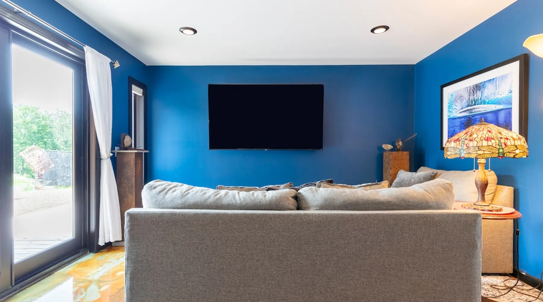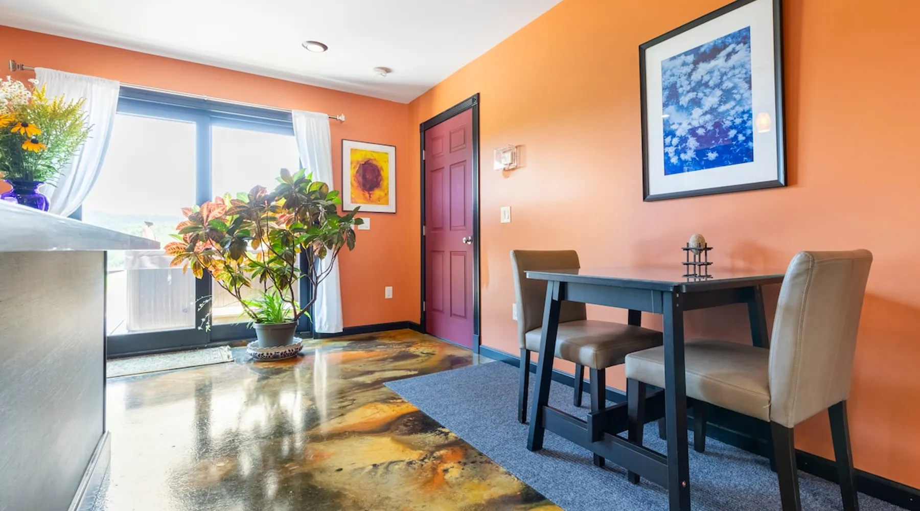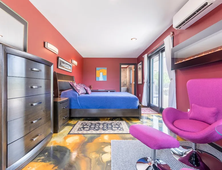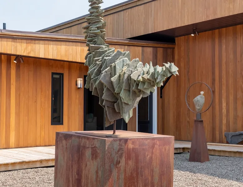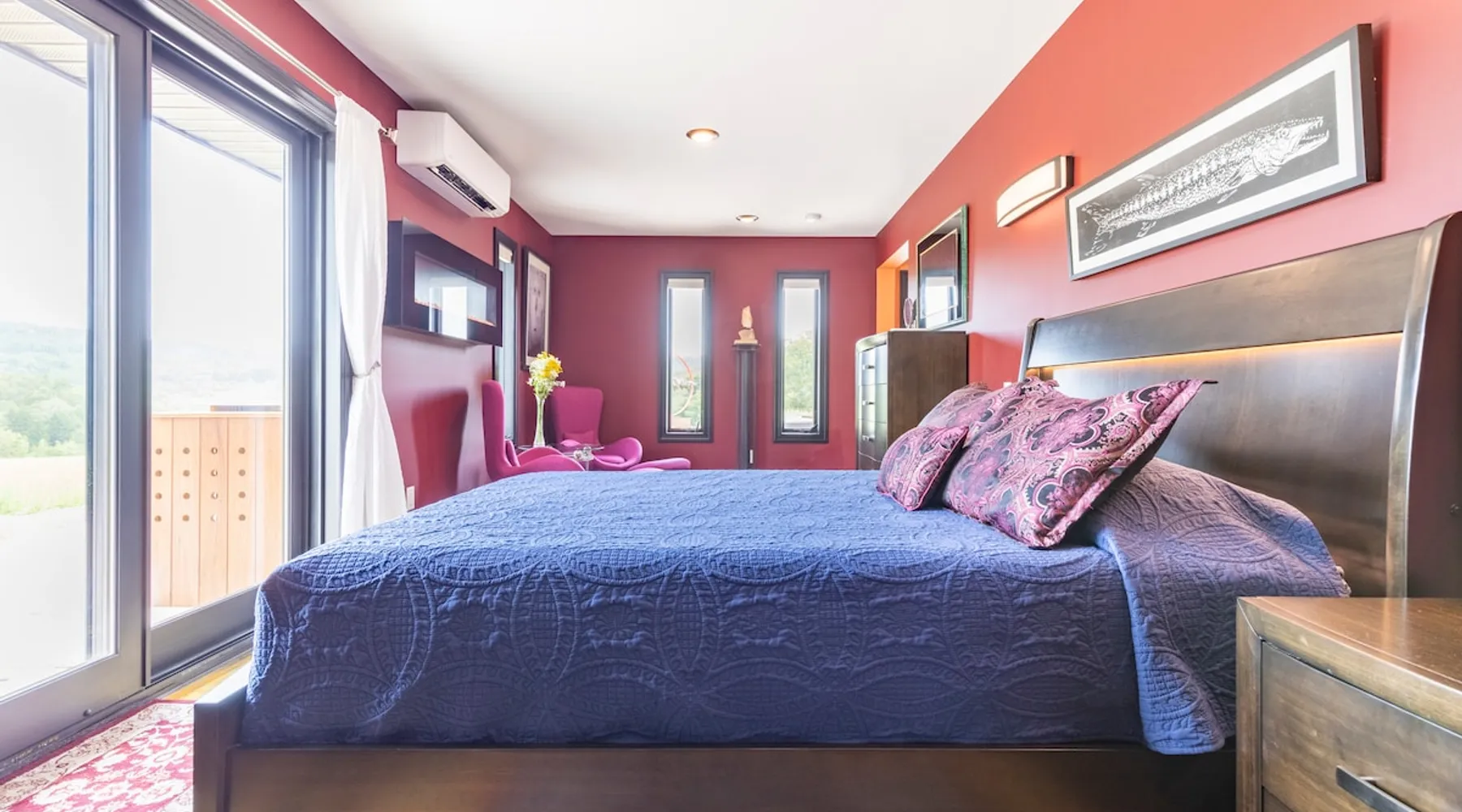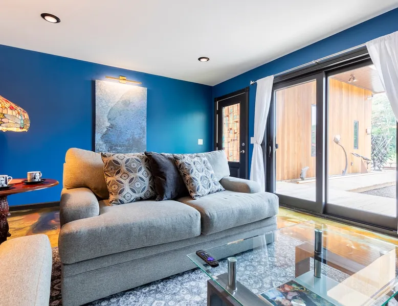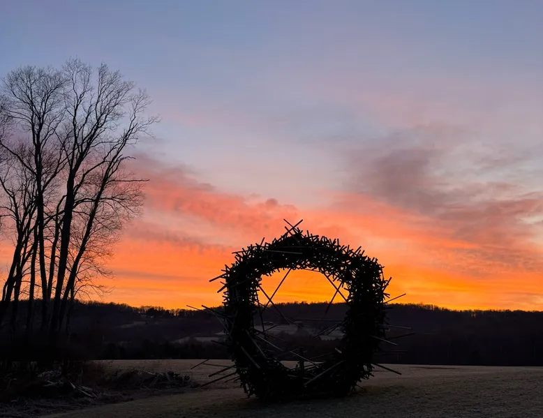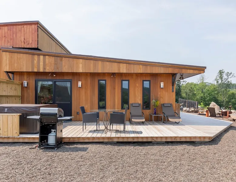 The Art House is set in a Sculpture Park developed by the artists Tom and Carol Holmes.The Parks 38 acres of rolling hills, grass land with valley views are bordered by two streams and woodlands.The views are magnificent.The house is set on the second tier of three rolling hills.Tom creates magical and life changing experiences in the landscape; at EBC Bird Sanctuary Sculpture Park. The Art House offers exceptional privacy, incredible quiet and extensive wildlife. A pristine experience awaits. The space The blue room is where you enter. It is your living room with super comfy furniture and a huge screen. Sculpture and ice prints surround the perimeter. The next room is the kitchen. Very big with lots of cooking amenities, a huge island for prep, an intimate dinner table for two. Ice prints, color, sculpture accent the space. The next room is the bedroom. A sitting area to hang or have a drink. A queen bed. Lots of dresser storage to make the visit neat. An electric fireplace for ambiance. Lights are all on dimmers. High end sheets for comfort and coolness. The bed overlooks the fire pit and the wood fired sauna just beyond the deck. The landscape unfolds to an expansive valley view. The bath is pure luxury. A soaking tub, round glass shower; beautiful tile, natural light. A real enjoyable amenity for the property. Sliding doors open to decks that wrap the Art House on all sides. Plenty of tables, lounges and spaces set to enjoy the views, sun, breezes, landscape, deer and sculpture. The fire pit has two lounge chairs low to the ground so you can cozy up to the steel custom made structure. Big stones and lots of wood supplied make this amenity a real treat. The new lifestyle X3 Hot Tub by Aqua Living is in and up to temperature. Guest access The Apartment is completely for the guests only. Totally private. The estate house is shaped like a plane. The north wing is for guests, the south wing is our living space. The center space is a museum gallery that separates the two. We have no access to the apartment while guests are here and respect their peace, tranquility, quiet and privacy. The space is over 1000 sq ft, roomy and comfortable for couples. The decks spill out onto the landscape and amenities. We enjoy greeting our guests when possible. No contact visits are available upon request. Privacy and tranquility are always assured. Other things to note Single nights available occasionally and upon request. Single nights are available usually mid week.