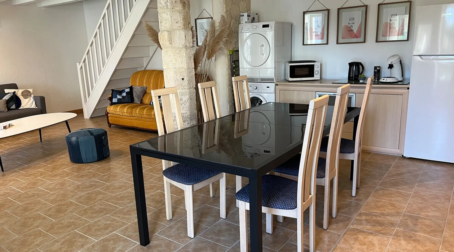 Together and independent This former building has been converted into three adjoining gites. The first, a studio with bed on the mezzanine The 2nd is a T3 :2 bedrooms, 1 sofa bed and 1 foldaway bed. and the 3rd of T2 :1 bedroom, a sofa bed and an upgradable child bed. The T3 has been equipped to bring all of you together with a 1.60 m lounge table ideal for aperitifs and 2 tables (indoor and outdoor)for 12 guests. And in the evening, you can find your privacy. The space The 3 in 1 A Studio classified 3 stars On the ground floor you will find the living room with its two light-filled armchairs and its TV, a desk, a fully equipped kitchenette, the bathroom and toilet then upstairs is a bed 160 X200 on the mezzanine. A 4-star T2 On the ground floor you will find the living room with its sofa bed (140*190 ) and its TV. The kitchen is fully equipped with dishwasher, a dining area and for the bravest a desk by the window. Upstairs, a bathroom, toilet , its bedroom with a bed 160 X200 whose all hosts compliment me on the bedding, they sleep well and a small, upgradable child bed. It also has a large dressing room equipped with a washing machine and a dryer. This one is most suitable for young children (possibility to put safety barriers) UnT3 Its large living room on the ground floor includes: - a dining area that can accommodate 12 guests, a fully equipped kitchen with microwave, traditional oven, dishwasher. - a living room with 2 sofas, one of which convertible, a large living room table, ideal for aperitifs. - a laundry area ( washing machine ,dryer ...) - an office Upstairs are 2 very large bedrooms with dressing room, double vanity shower room and an independent WC. Outside you can enjoy the view of the park while sipping a cocktail. You can relax in a hammock, or a sunbed at your disposal in the 9000m2 park or by the pool that you will need to share with the owners . Guest access You're at home. You are free to move around and enjoy the different amenities at your disposal.(hammocks, different tables, sunbeds, bocce court). You can also store your bike or kayak safely in the garage; there is an additional charge of €10/night for using the charging station. Other things to note Our home in Port d 'Envaux offers a variety of options that meet all of your needs. Nature lovers will enjoy our green 9000 m² park suitable for outdoor activities and relaxation Hikers will be able to explore the marshes and hiking trails that crisscross the surrounding countryside, while bike lovers will be able to explore nearby mountain biking trails (the bike flow). Water skiing, canoeing or paddleboarding enthusiasts will find their happiness close (2 km) to the Charente, while history buffs will visit the Roman monuments and castles (and there are many;(Germanicus Arc, St Eutrope Cathedral Arena, St Eutrope Basilica, Panloy, Crazannes and Courbon rock castles)). Not forgetting the must-sees Lapidiale and the mountains of the raised stones. Located in the heart of the Charente Maritime you are: Less than 10 km from Saintes and its markets 40 km from the Royan beaches. 50Km from Rochefort The country of Fort Boyar , its islands (d 'Aix, Madame) its museums , its Royal rope factory... 80Km from La Rochelle City steeped in history with its harbour giving the possibility of boat trip, its private aquarium which is one of the largest European...