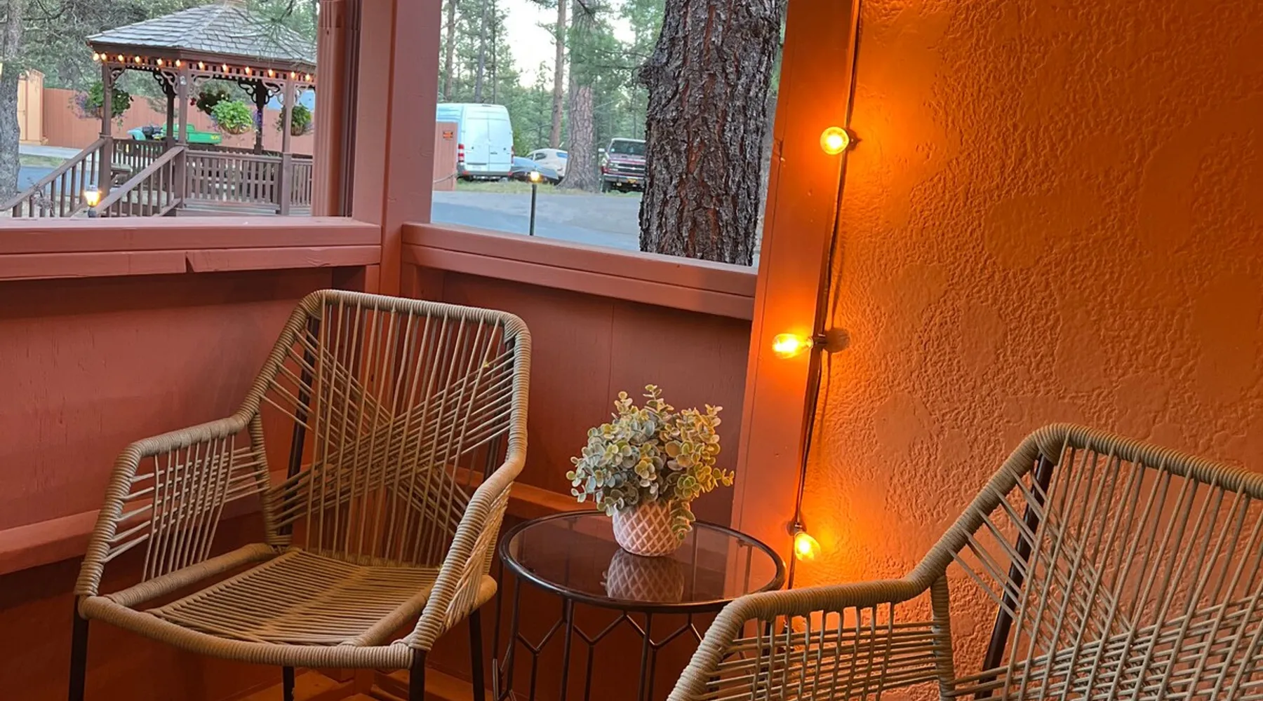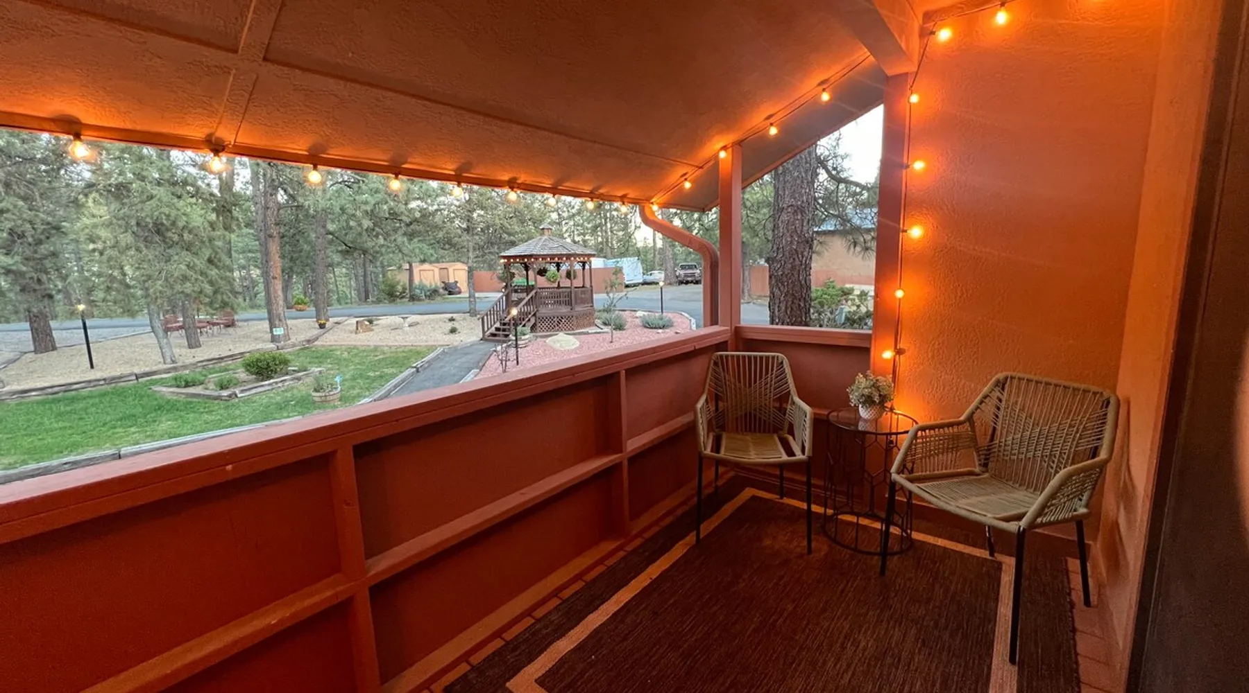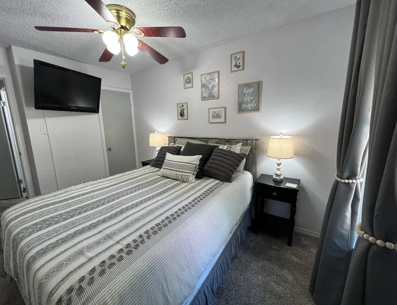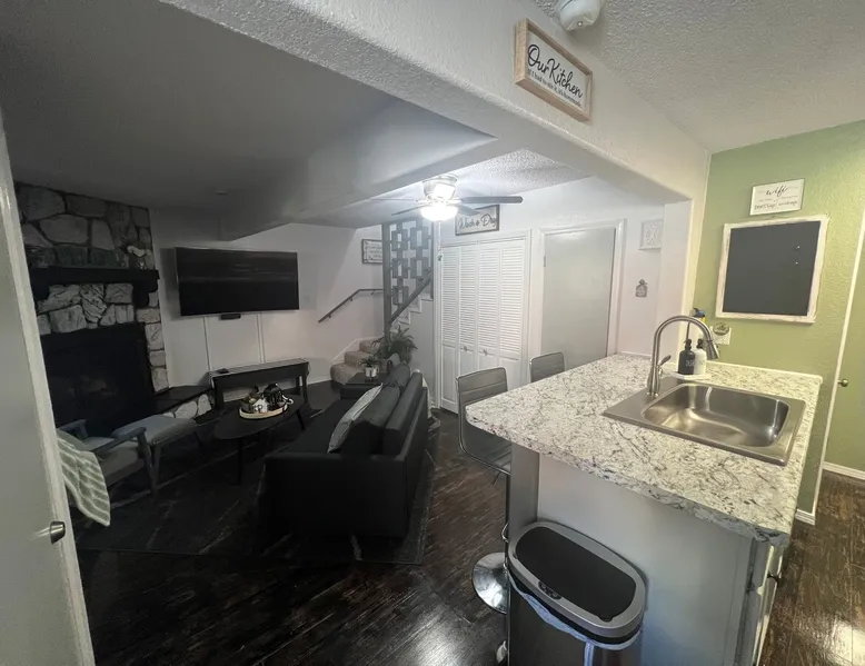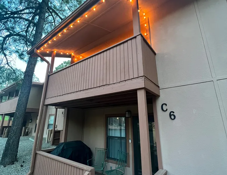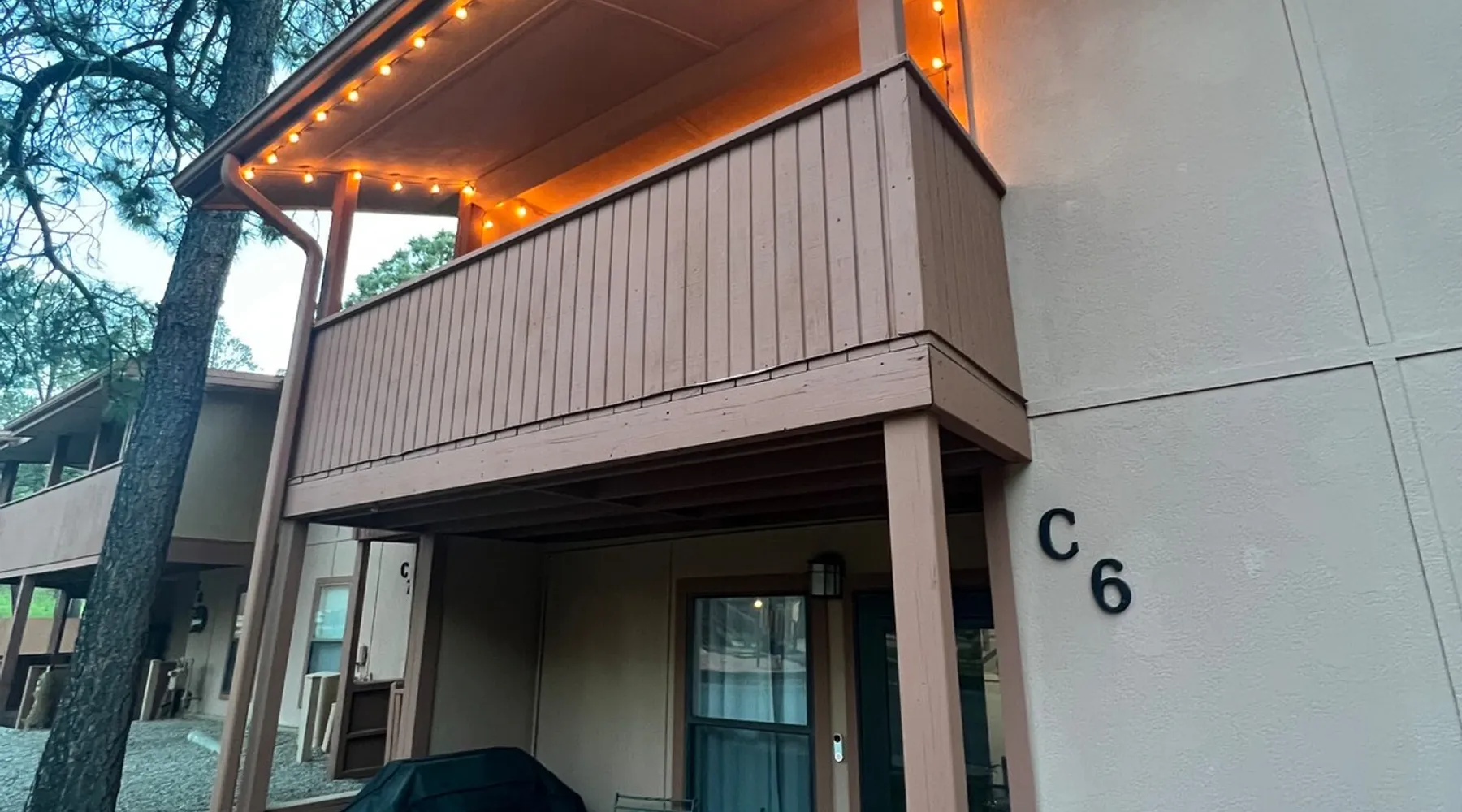 Desert Sage Getaway is a charming and cozy, newly updated 2 bedroom, 1 ½ bath condo. A short distance from main street Ruidoso where you can enjoy mountain living along with plenty of modern conveniences and comforts. Only a 5 minute drive from Mid-town, nearby golf course and Ski Apache. We want to provide you with a high quality, clean getaway with amenities that ensure a great experience for you! This home away from home includes all the amenities you need to enjoy your time in Ruidoso!! The space For a 1 night stay only please send inquiry! Cozy 2 story condo newly renovated! *) New state of the art stainless-steel appliances: full refrigerator w/ ice maker, dishwasher, flat-top electric stove, microwave, garbage disposal *) Fully equipped kitchen: dishware/flatware, bakeware, pots/pans, toaster, Keurig, Spices, water kettle, blender *) Coffee and hot teas provided to guests *) Dining table for 4-6 along with counter top & stools for the quick bite to eat *) Full washer/dryer with laundry pods/dryer sheets *) Controlled heating system and gas fire place with Faux logs *) Free wi-fi throughout the condo *) Large 65 in HDTV in the living room with additional TVs in the upstairs bedrooms with access to smart apps *) Propane gas grill in the front porch with seating *) Living room stow away table full of games to enjoy *) Outside deck off of the master bedroom with seating *) Bedroom lamps with built in USB connections for easy device charging *) Shampoo/conditioner/body soap dispenser in shower, hairdryer, ironing board with iron, hangers in all closets *)The master bedroom has a King size bed, the second bedroom has a Queen size bed, and there is a sofa sleeper in the living room that can easily be converted into a Full size bed with an included inflatable mattress for extra comfort. *)There are ceiling fans in both bedrooms as well as in the living room ➔ Two parking spaces are located right in front of the condo for convenience Other things to Note: *) A beautiful gazebo and seating area is located right in front of the condo *)trash dumpster in close proximity to condo for convenience Other things to note There is a baby gate available in upstairs closet that is easy to place at top of stairs for extra safety feature