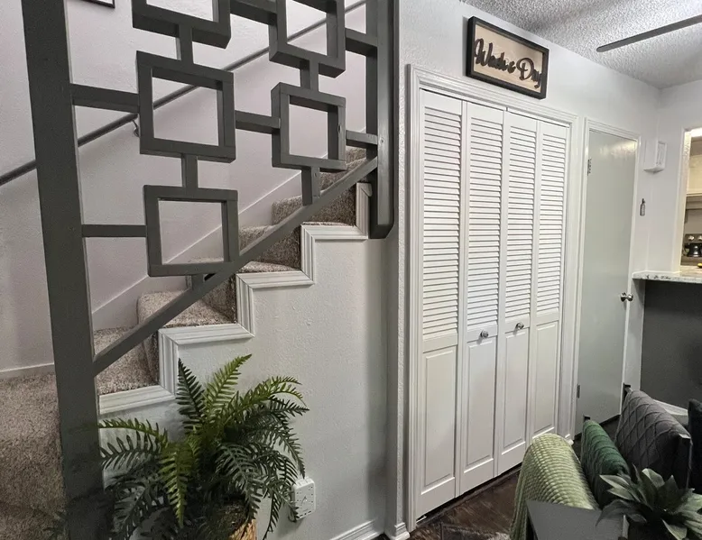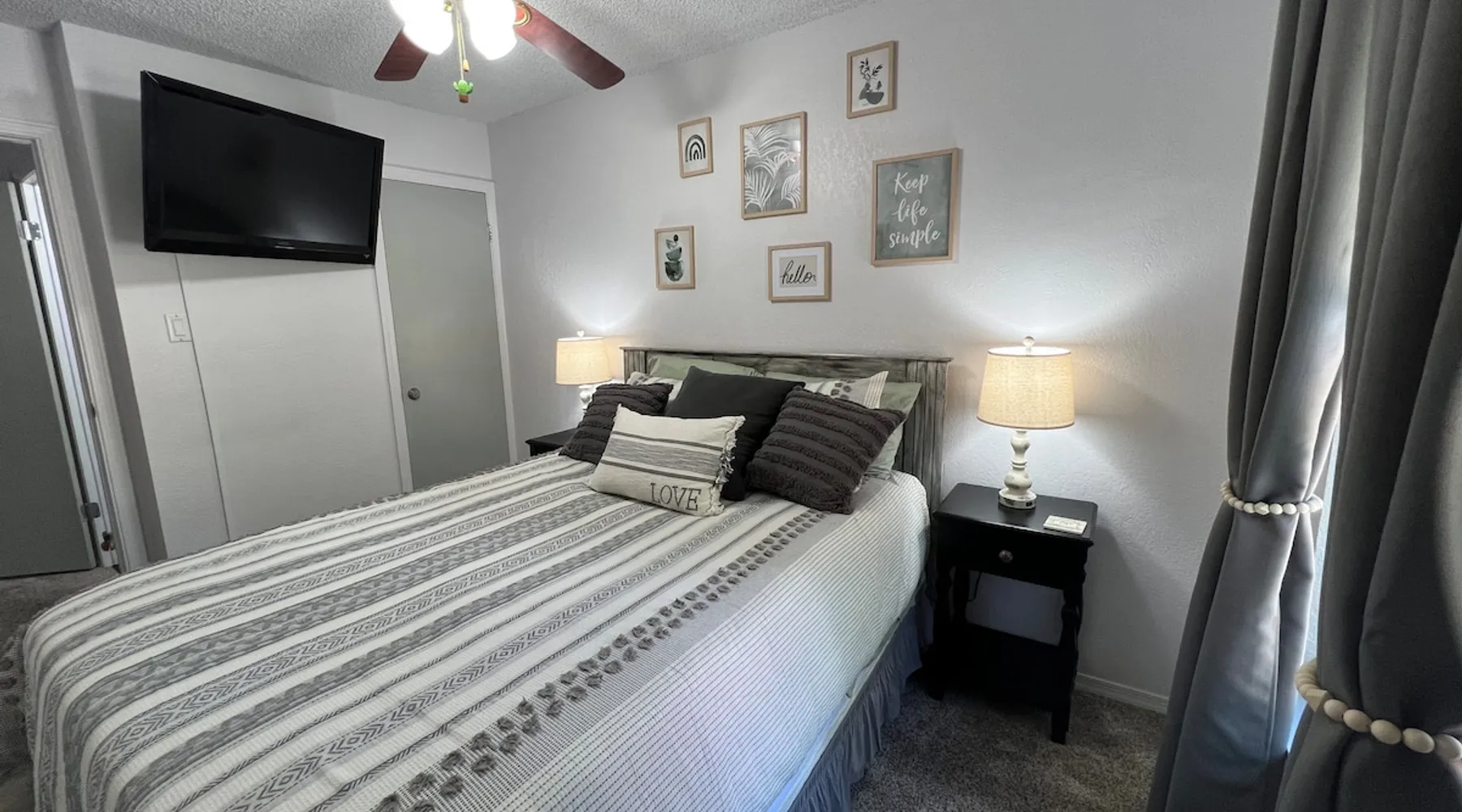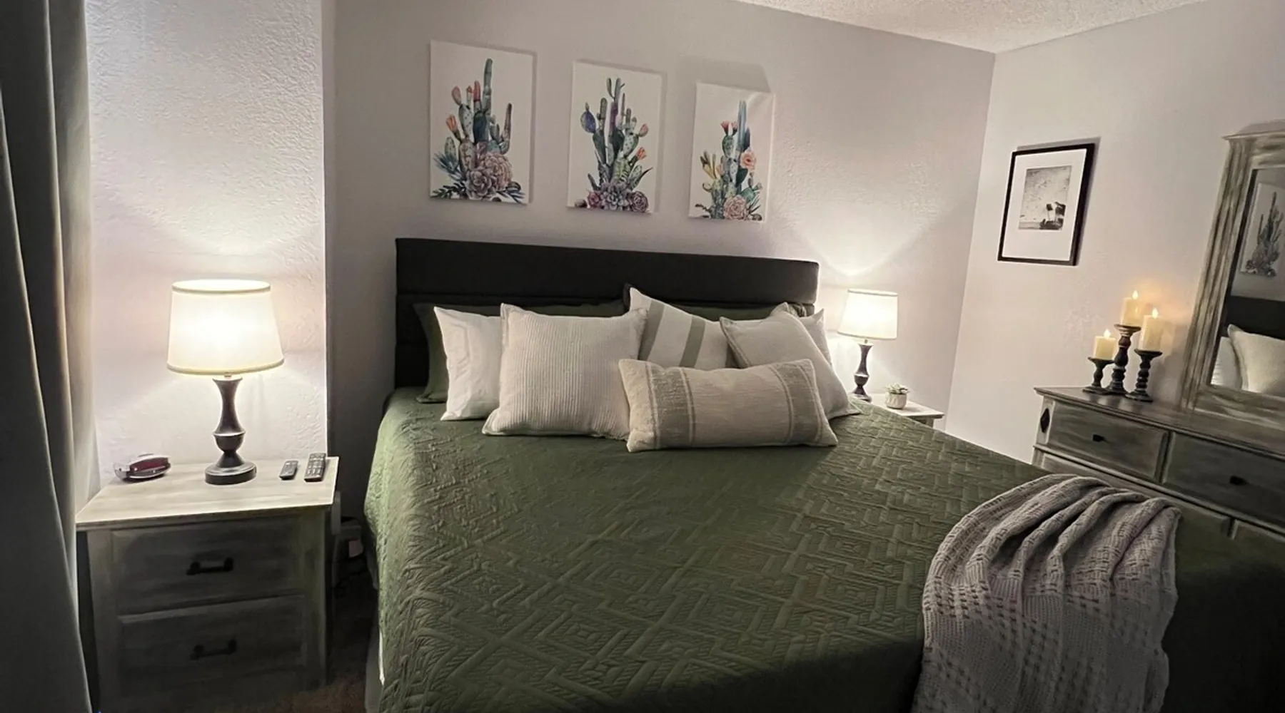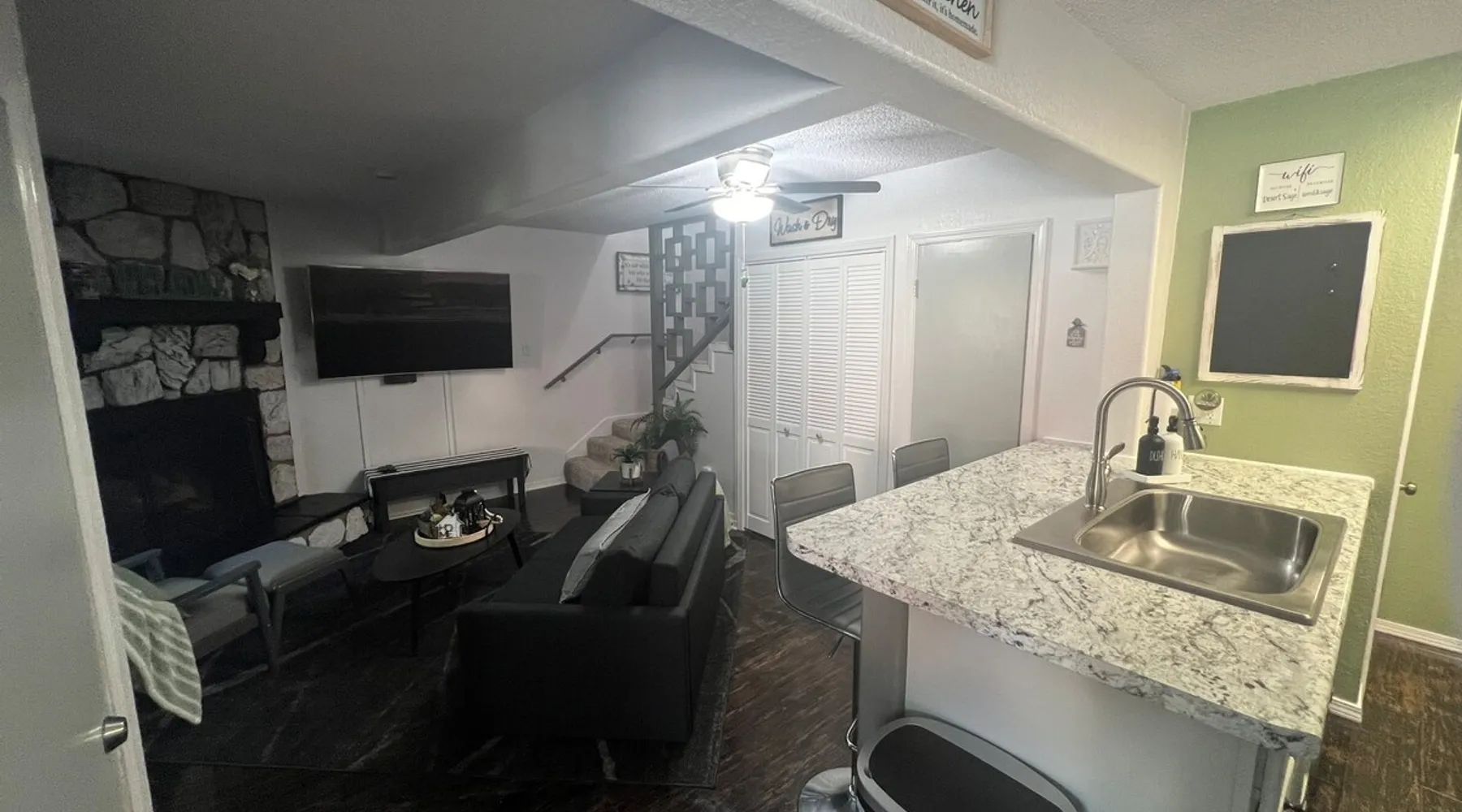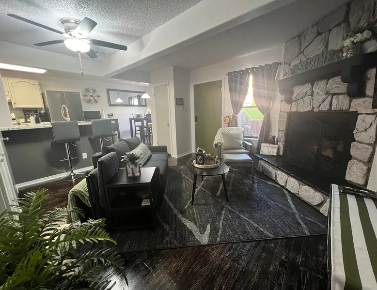 Desert Sage Getaway is a charming and cozy, newly updated 2 bedroom, 1 ½ bath condo. A short distance from main street Ruidoso where you can enjoy mountain living along with plenty of modern conveniences and comforts. Only a 5 minute drive from Mid-town, nearby golf course and Ski Apache. We want to provide you with a high quality, clean getaway with amenities that ensure a great experience for you! This home away from home includes all the amenities you need to enjoy your time in Ruidoso!! The space For a 1 night stay only please send inquiry! Cozy 2 story condo newly renovated! *) New state of the art stainless-steel appliances: full refrigerator w/ ice maker, dishwasher, flat-top electric stove, microwave, garbage disposal *) Fully equipped kitchen: dishware/flatware, bakeware, pots/pans, toaster, Keurig, Spices, water kettle, blender *) Coffee and hot teas provided to guests *) Dining table for 4-6 along with counter top & stools for the quick bite to eat *) Full washer/dryer with laundry pods/dryer sheets *) Controlled heating system and gas fire place with Faux logs *) Free wi-fi throughout the condo *) Large 65 in HDTV in the living room with additional TVs in the upstairs bedrooms with access to smart apps *) Propane gas grill in the front porch with seating *) Living room stow away table full of games to enjoy *) Outside deck off of the master bedroom with seating *) Bedroom lamps with built in USB connections for easy device charging *) Shampoo/conditioner/body soap dispenser in shower, hairdryer, ironing board with iron, hangers in all closets *)The master bedroom has a King size bed, the second bedroom has a Queen size bed, and there is a sofa sleeper in the living room that can easily be converted into a Full size bed with an included inflatable mattress for extra comfort. *)There are ceiling fans in both bedrooms as well as in the living room ➔ Two parking spaces are located right in front of the condo for convenience Other things to Note: *) A beautiful gazebo and seating area is located right in front of the condo *)trash dumpster in close proximity to condo for convenience Other things to note There is a baby gate available in upstairs closet that is easy to place at top of stairs for extra safety feature