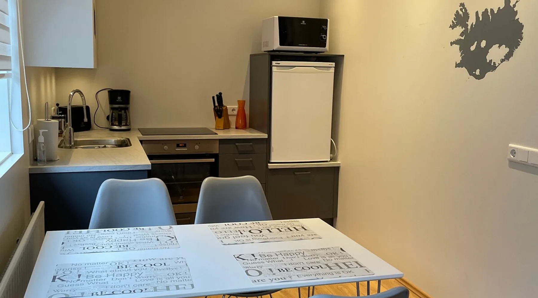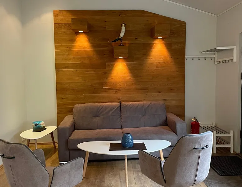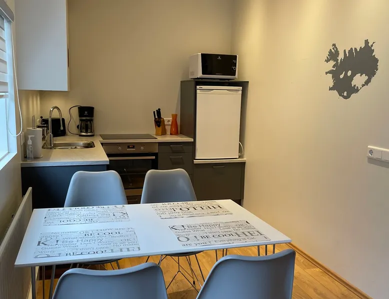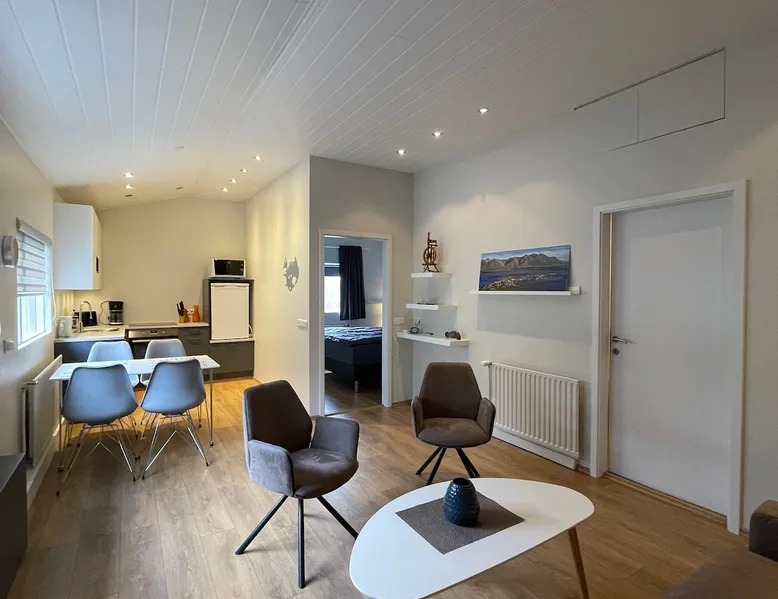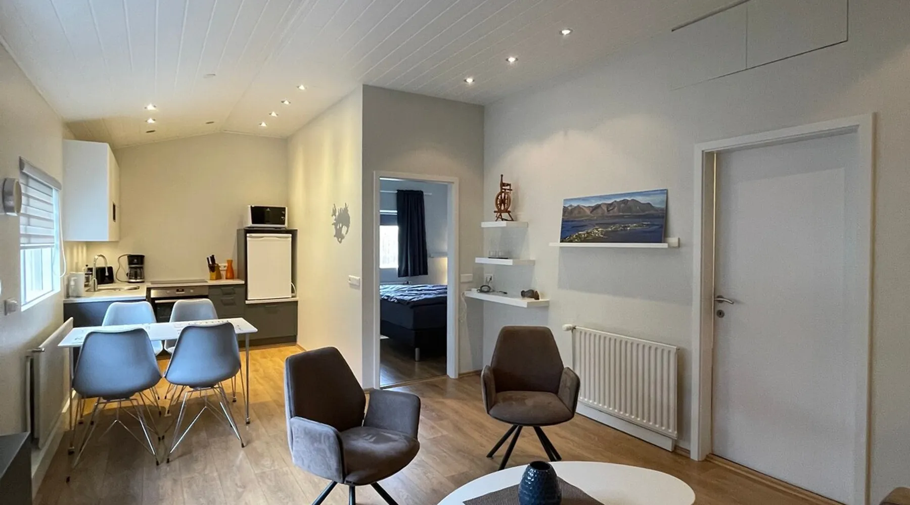 Beautiful small guesthouse-apartment with one bedroom, bathroom, and a fully equipped kitchen. The space A small and a cozy guesthouse, in a converted detached garage (next to our house), that accommodates up to four people. The location is in a quiet residential neighborhood. There is one bedroom with a queen size bed and in the living is a sofa bed. With a fully equipped kitchen and a bathroom with a walk in shower. Sleeps up to four people. Two persons in bedroom and two persons in a sofabed in the living room. The bedroom has blackout curtains for our midnight sun. License number: HR-00000343 Guest access You have the entire apartment for yourself.