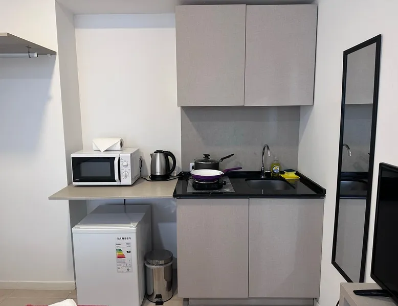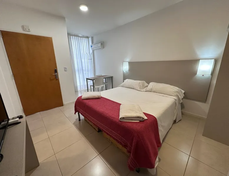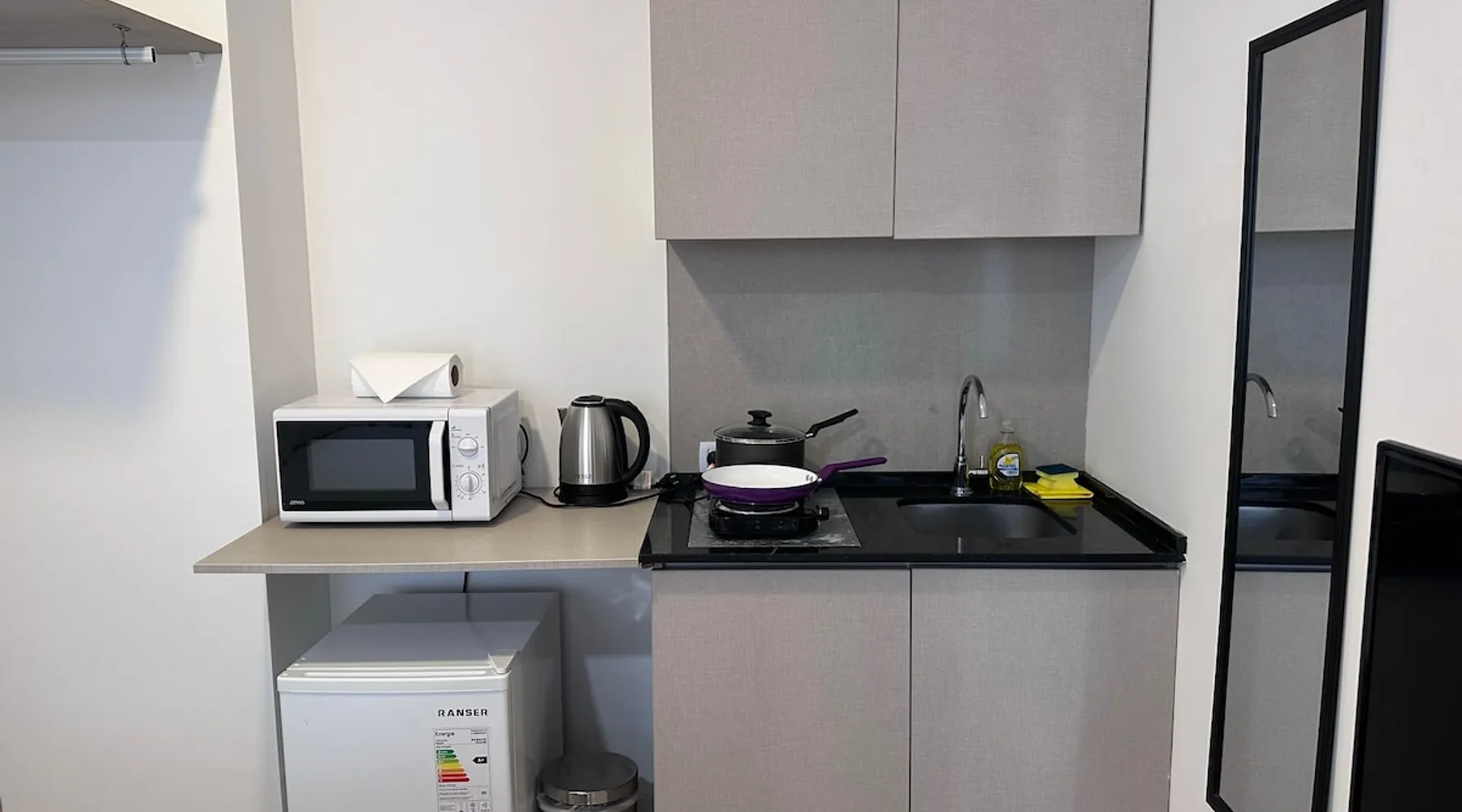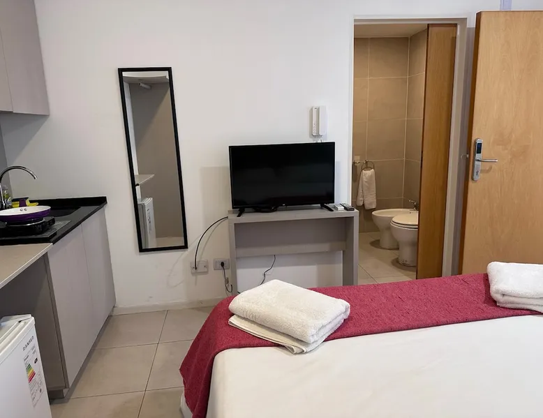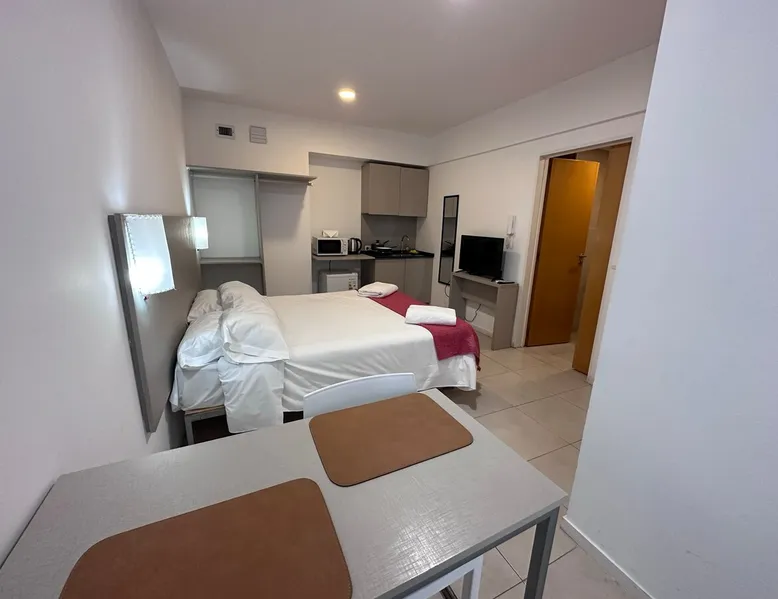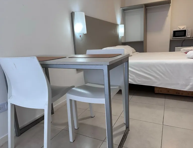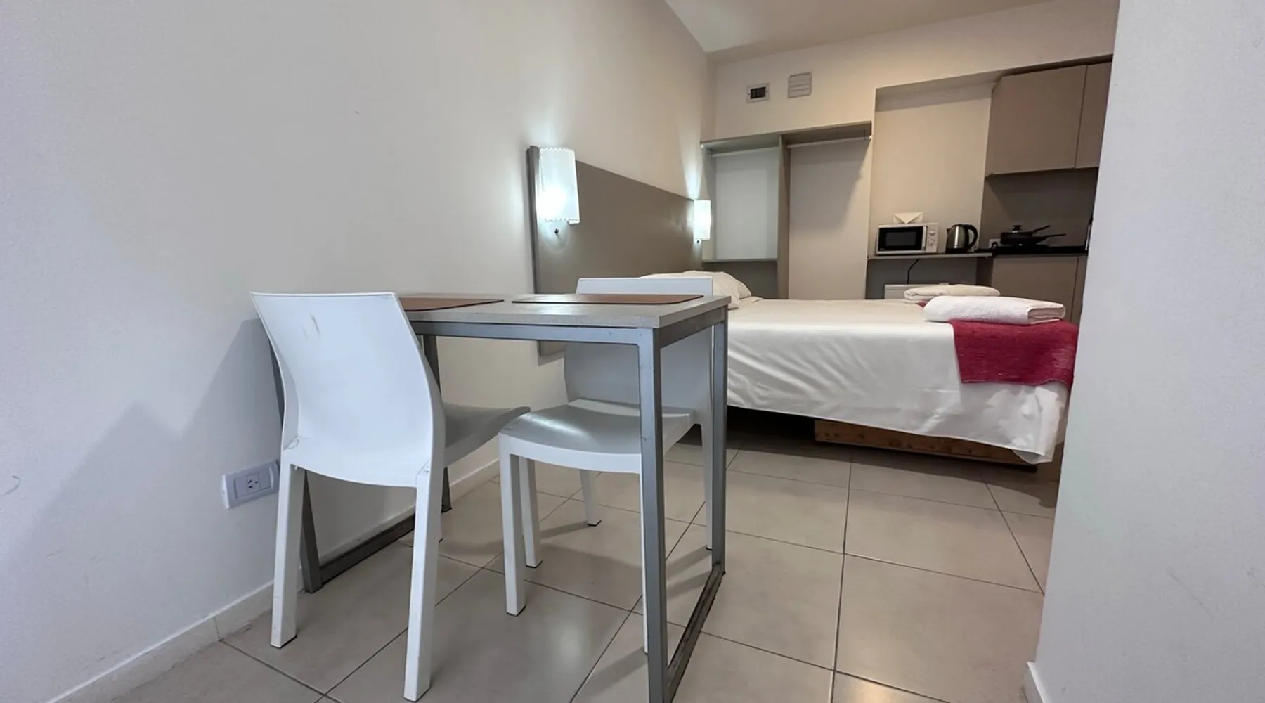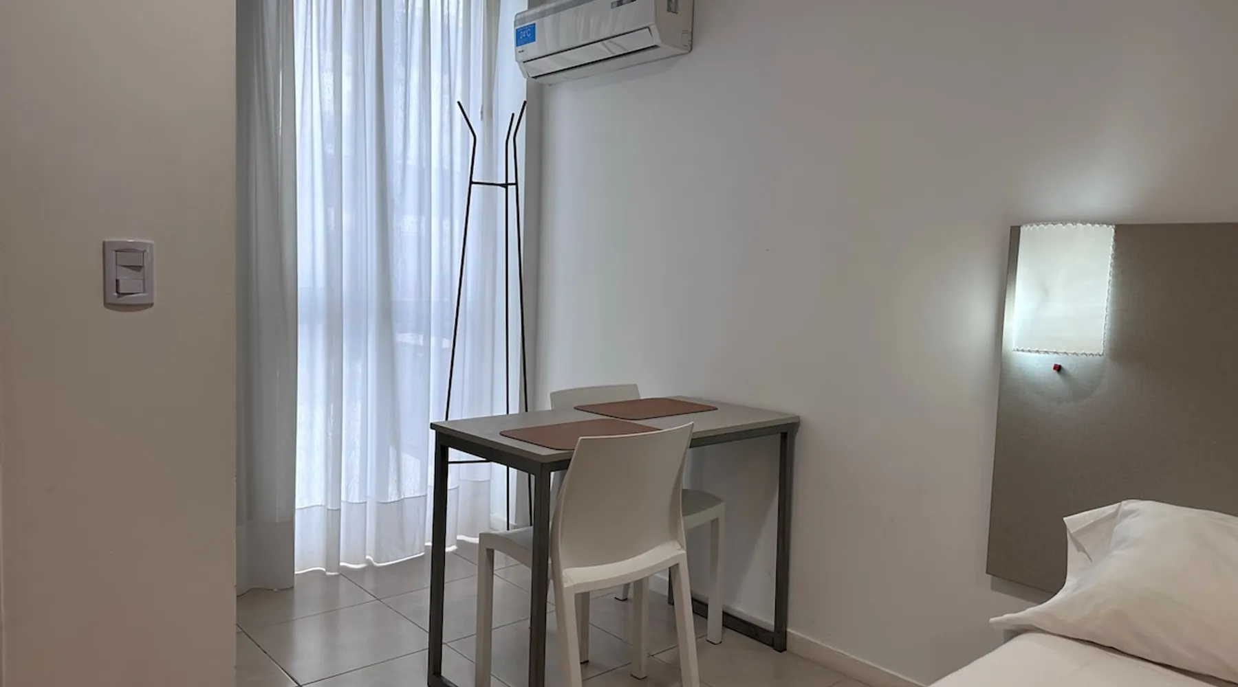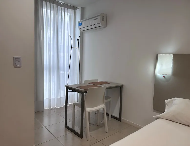 Enjoy the simplicity of this quiet, central home. It's a small studio in a building that opened in March 2018. Up to two people can be accommodated. It has a double bed, table/desk, chairs, cooking utensils, dishes, under the table and private bathroom.