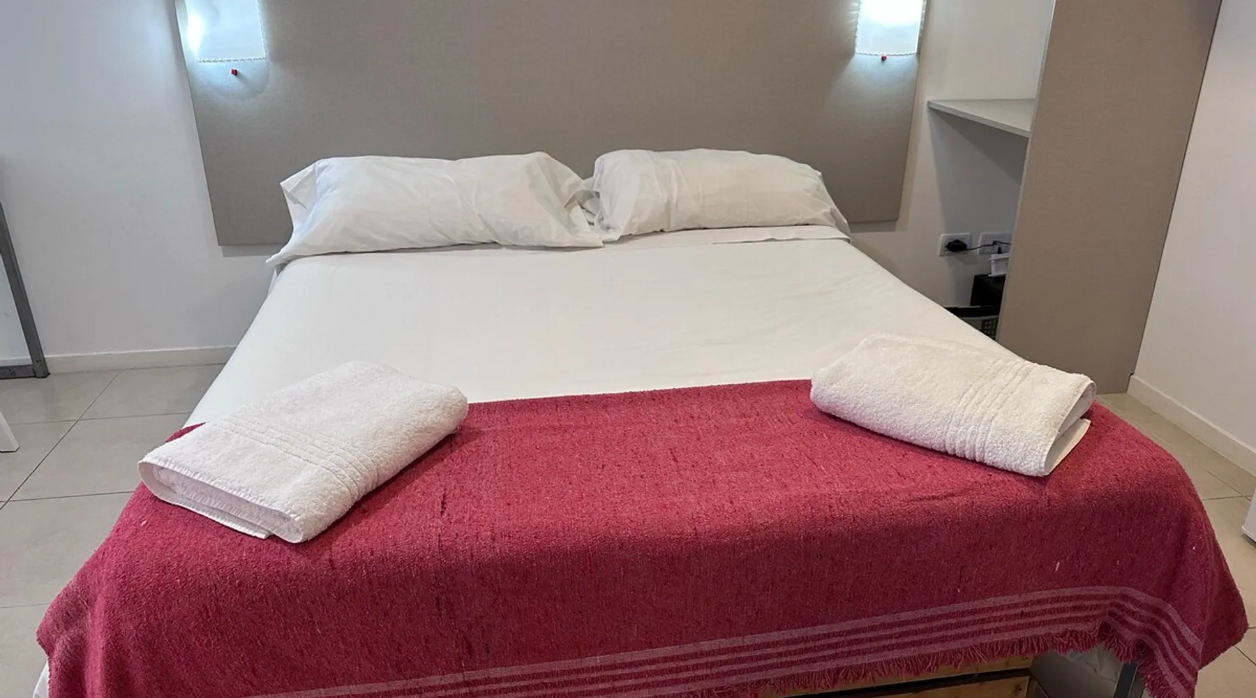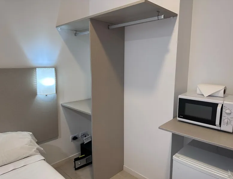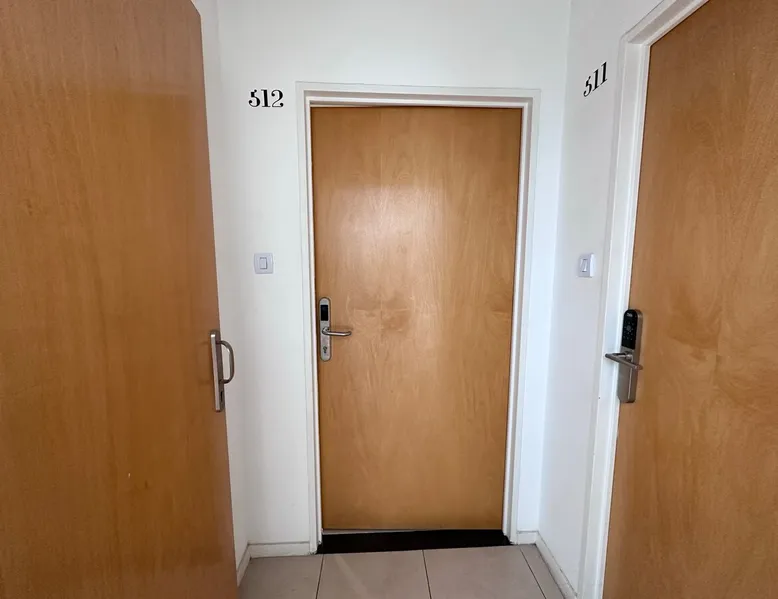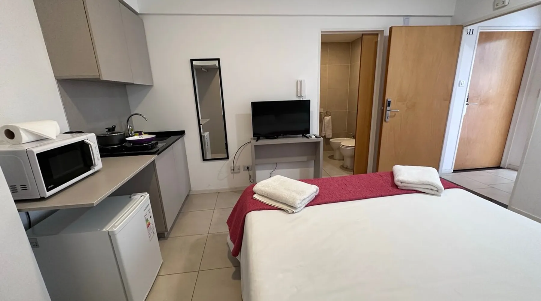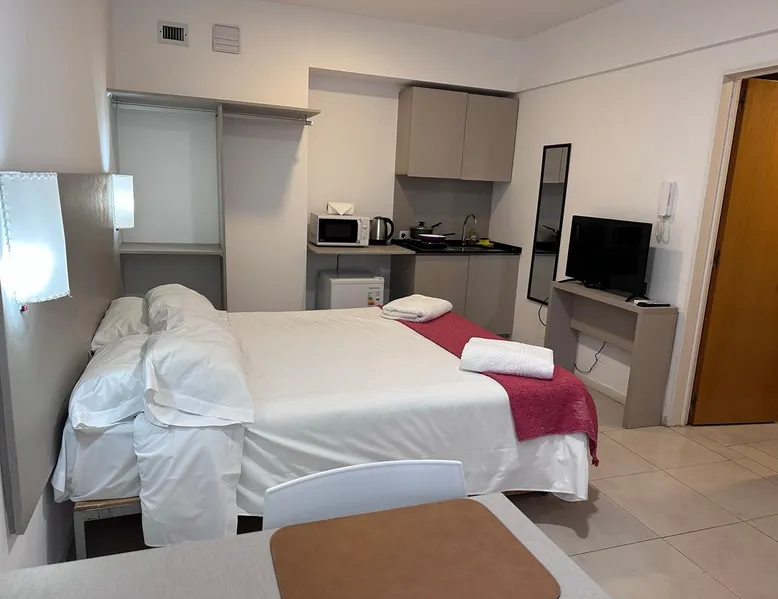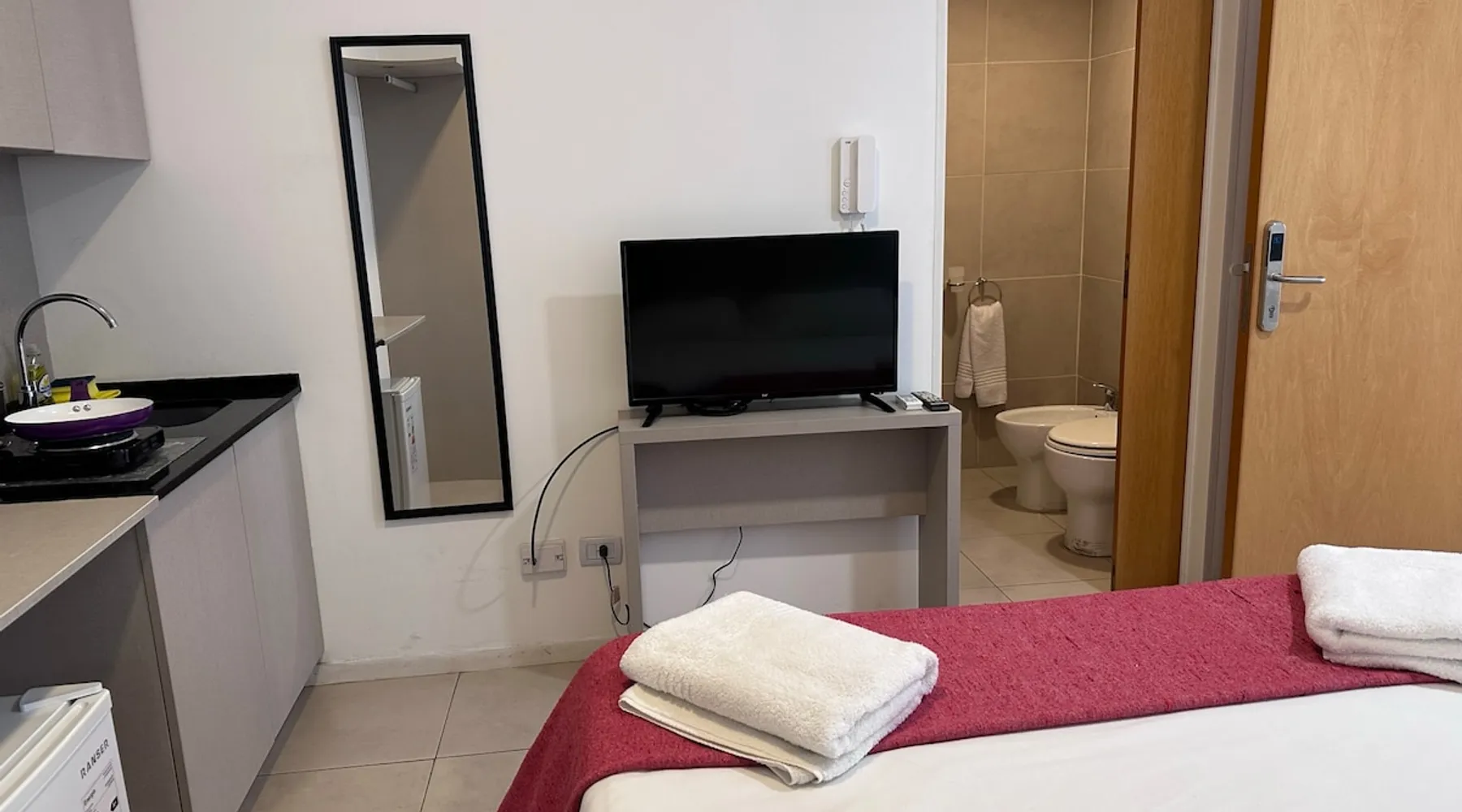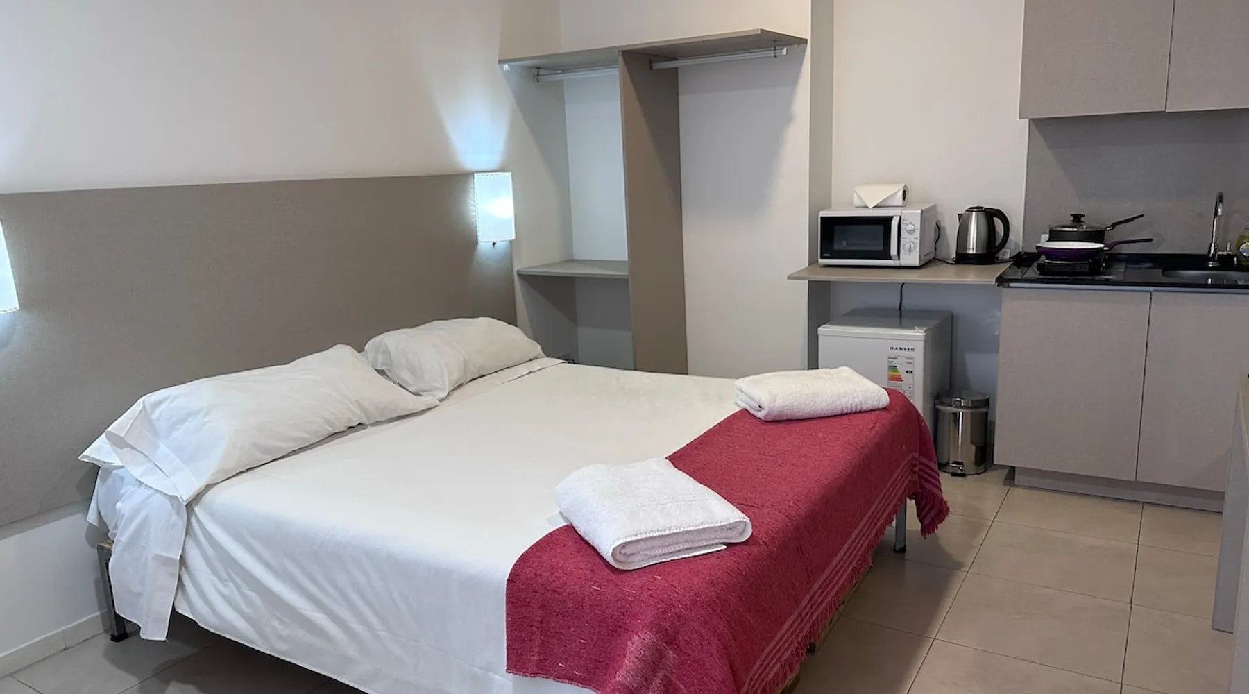 Enjoy the simplicity of this quiet, central home. It's a small studio in a building that opened in March 2018. Up to two people can be accommodated. It has a double bed, table/desk, chairs, cooking utensils, dishes, under the table and private bathroom.