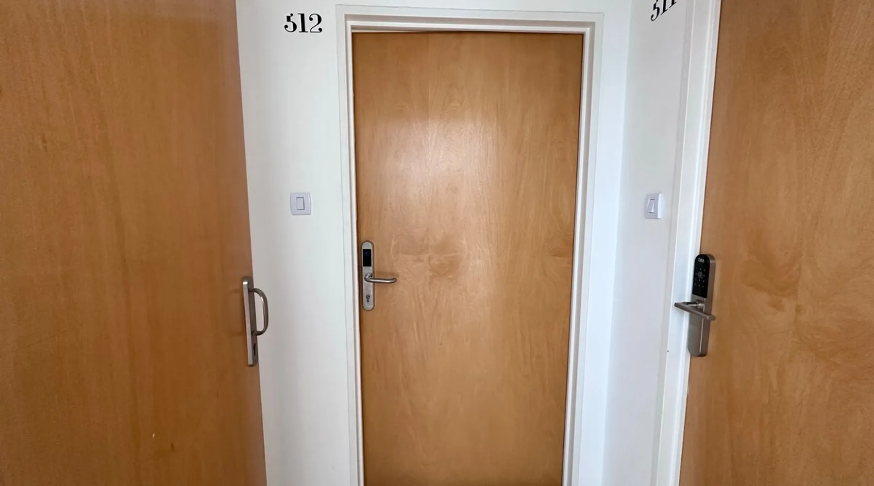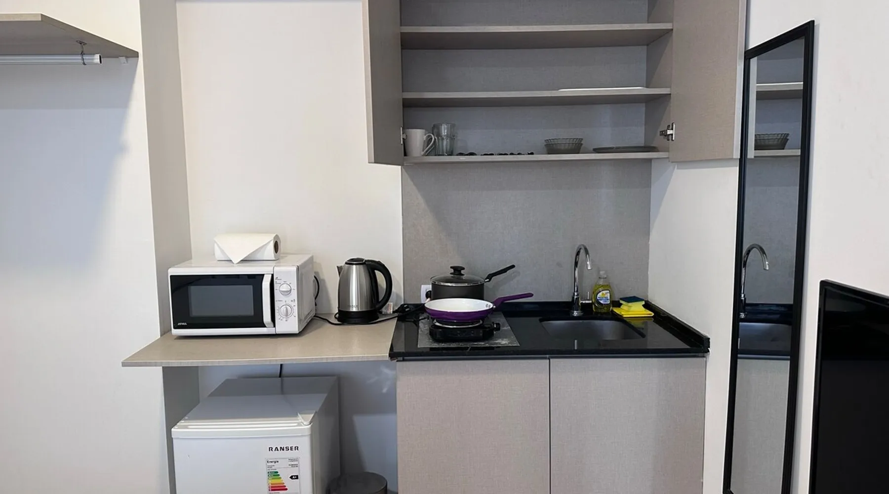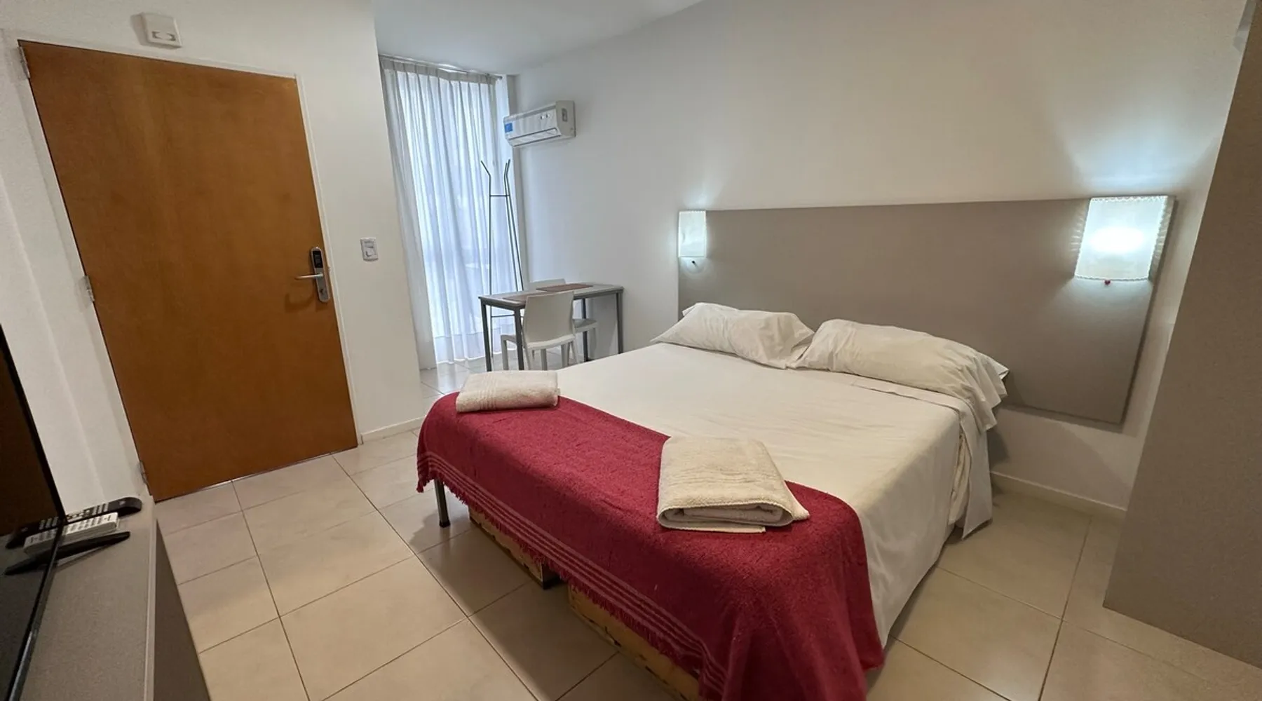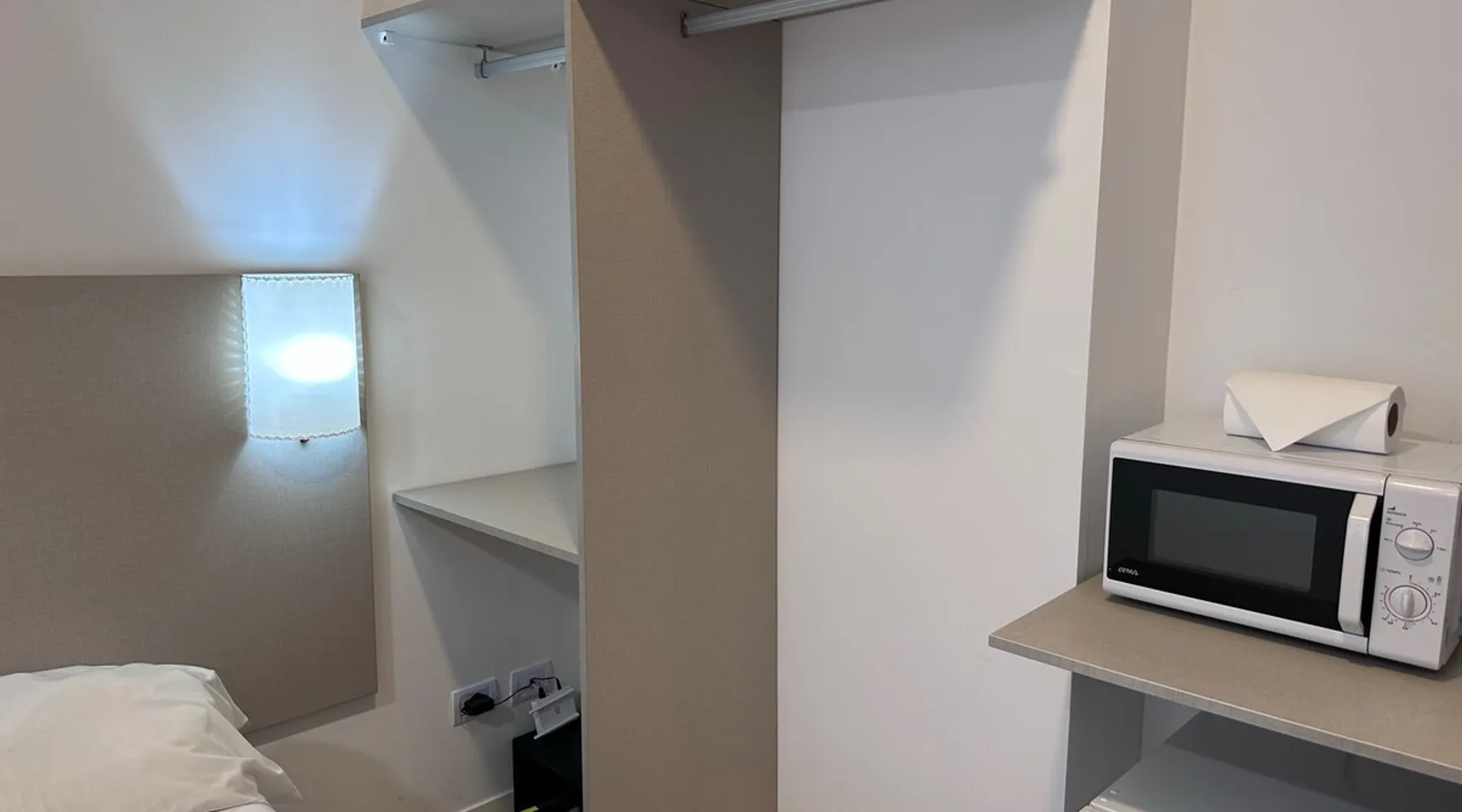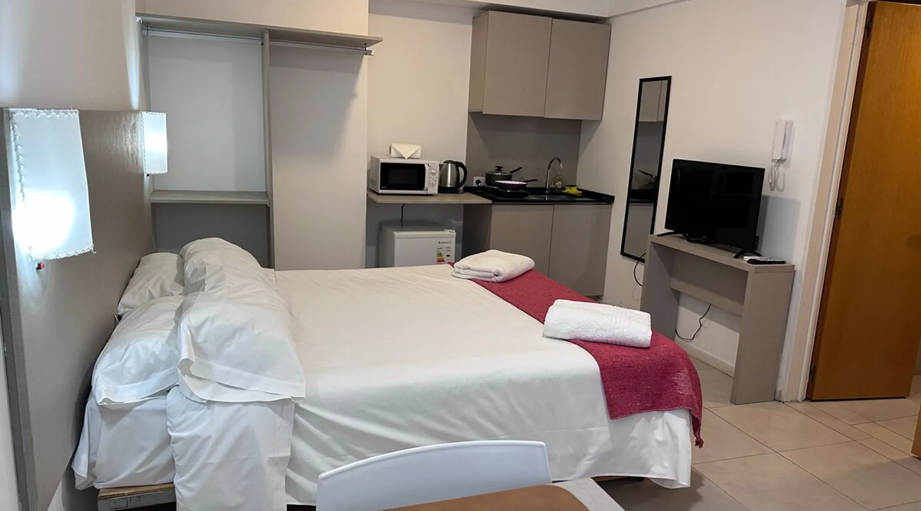 Enjoy the simplicity of this quiet, central home. It's a small studio in a building that opened in March 2018. Up to two people can be accommodated. It has a double bed, table/desk, chairs, cooking utensils, dishes, under the table and private bathroom.