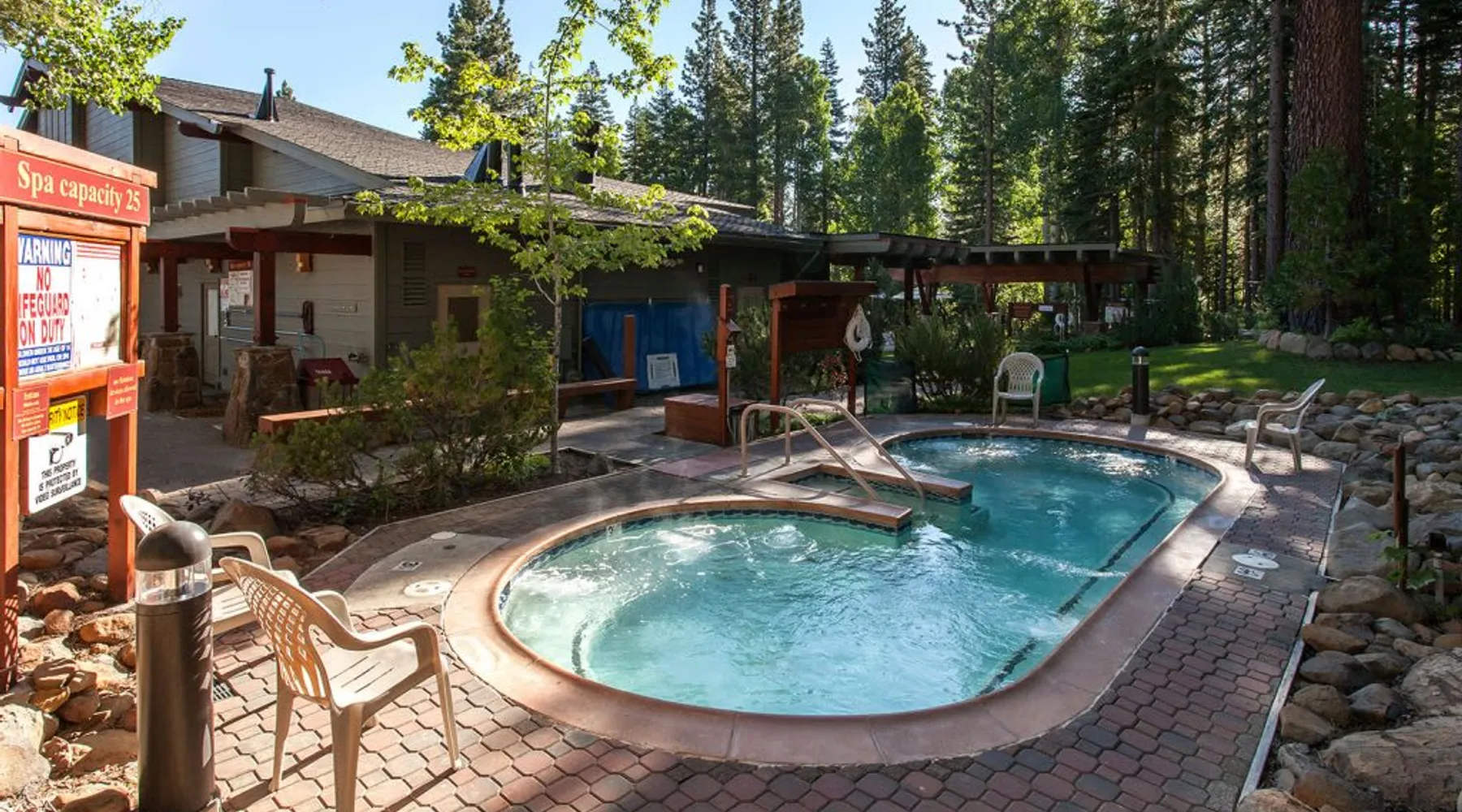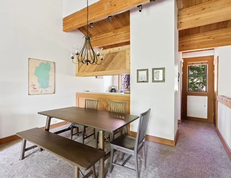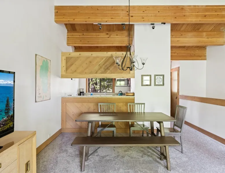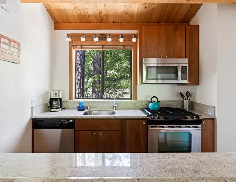 Nestled among the pines, this charming 2-bedroom condo offers an incredible location for outdoor enthusiasts. Only .25 miles from Northstar Ski Resort, hop on the free shuttle line and be on the slopes in minutes, or make a quick drive to the white sand beaches of Kings Beach. After a day of adventure, relax & recharge in this bright & open mountain retreat. Cozy up by the fire or relax on the balcony, soaking in the serene surroundings, this home is perfect for year-round fun. The space For those looking for a comfortable place to stay near a wide variety of outdoor activities, this townhome is for you! Tucked among the trees, this townhome is the end unit of the complex providing additional privacy and placing you .25 miles of Northstar Ski Resort, an ideal location for year-round fun! Hiking trails and the beach are close as well, ensuring your group won’t be bored during your stay. After a day of outdoor fun, return to this bright and inviting home where you will find an open and social main living space, three comfortable bedrooms, and a balcony overlooking the trees. As you enter the home on the lower level, you will find an open hallway with a bench, shoe rack, and coat hooks, providing a convenient space to store your outdoor gear before settling into the home. Down the hallway are two bedrooms and two bathrooms. The first bedroom is the master suite and is filled with natural light from the sliding glass doors that open up to a balcony, the perfect spot to enjoy your morning cup of coffee. The bedroom boasts a comfortable queen-size bed, a desk with a chair for any remote work needs, and a large closet to store your personal belongings. Rounding out the bedroom is an attached bathroom with a single-sink vanity and a step-in shower with a sliding glass door. On the other side of the hallway is the second bedroom where you will find two twin-size beds, a dresser, and a closet, providing plenty of space for those sharing the room to unpack and store their items. Next to this bedroom is the second bathroom, where you will find a single-sink vanity and a bathtub/shower combo, so you can easily freshen up before tucking in for the night. Head up the stairs and come to the kitchen/dining/living room, an open and spacious room filled with classic mountain home charm. The space features high ceilings with exposed wood beams, a beautiful stone hearth fireplace, and large windows overlooking the trees, creating a warm and inviting space for your group to gather. Relax in the carpeted living room on the large sectional sofa that has space for up to 8 to sit together. From here you can enjoy a movie night or take in the views over the trees. Off to the side of the living room is a dining table with seating for 7 that sits next to a pass-thru window into the kitchen. In the fully equipped kitchen, you will find all the cookware needed to prepare a delicious meal for your group and a large window looking towards the trees, so you can cook with a view. From the main living space, step out the sliding glass doors to the balcony. This peaceful outdoor space will be your own piece of outdoor paradise, with the trees surrounding you making you feel as if you are tucked away in the woods. This inviting mountain retreat has everything you need to enjoy the best of nature and outdoor activities while in Tahoe. STR License Number: STR22-4326 Max Occupancy: 4 Parking Info: There are two parking spots in the parking lot. Guest access Guests will have access to the entire home, a private ski storage closet, as well as shared village amenities such as a pool, hot tubs, and a fitness center. Guests will also have access to two parking spots in a shared parking lot. Other things to note Please note that, like most homes in this area, this home does not have A/C. Please keep in mind that if you plan to ski, you are responsible for verifying the ski resorts' opening and closing dates. Recreation Center: 7:00am – 9:00pm NPOA Office: 8:00am – 4:00pm Main Pool: 9:00am – 7:30pm Kiddie Pool: 9:00am – 7:30pm Splash Pad: 9:00am – 7:30pm Lap Pool: 7:00am – 8:00pm Gym: 7:00am – 8:45pm Spas: 7:00am – 8:45pm Northstar Poolside (F/B): 11:00am – 5:00pm *Game Room: 7:00am – 8:45pm Tennis/Pickleball Courts: 7:00am – 9:00pm (light & weather permitting)