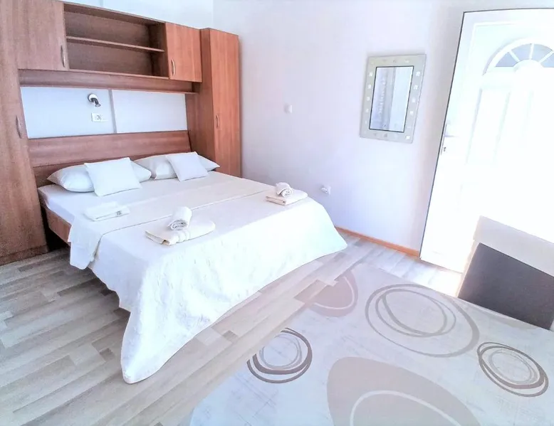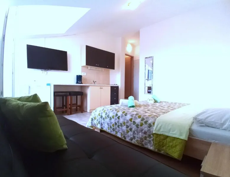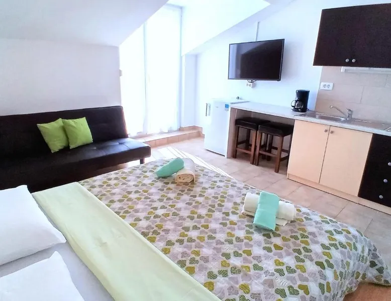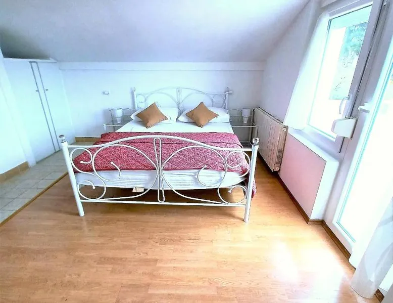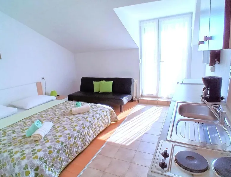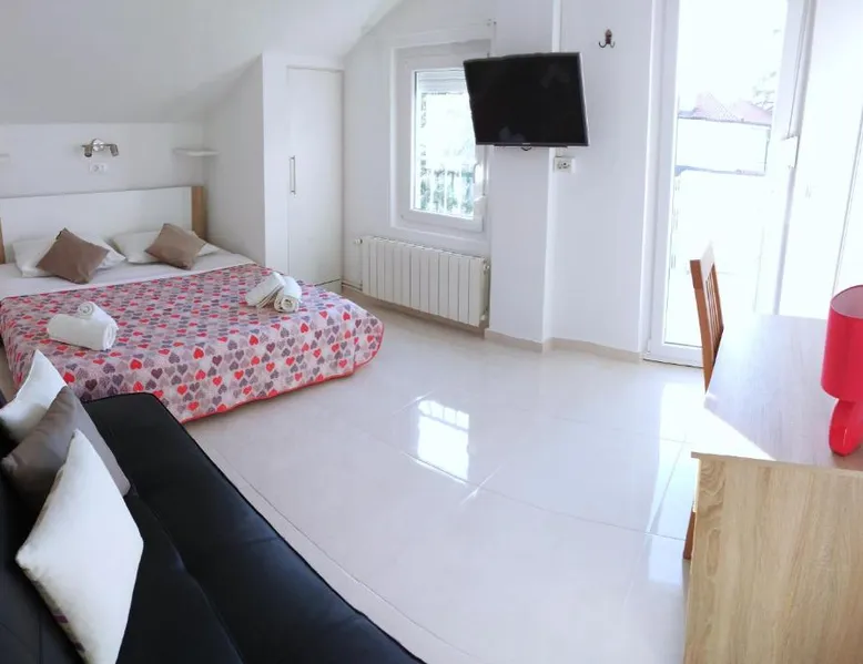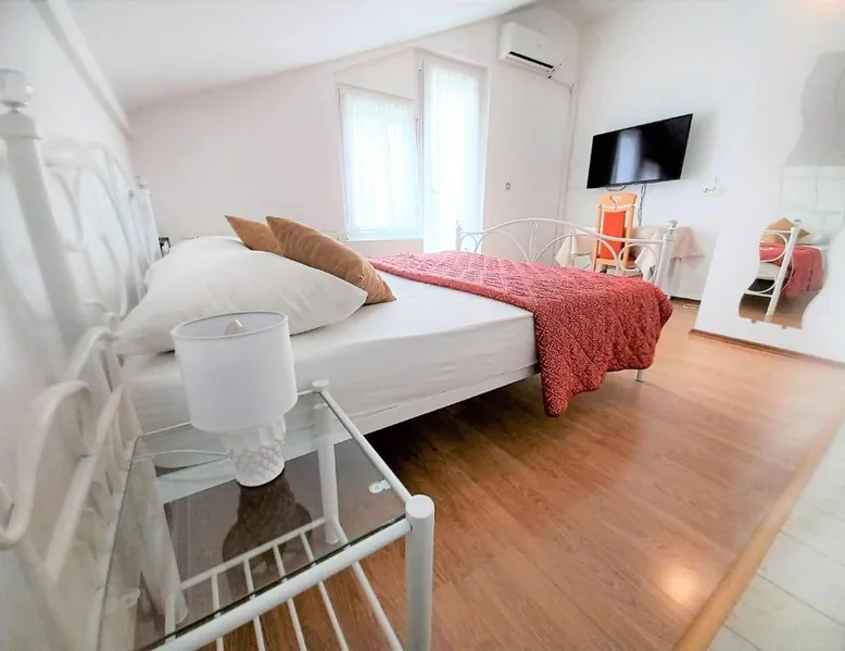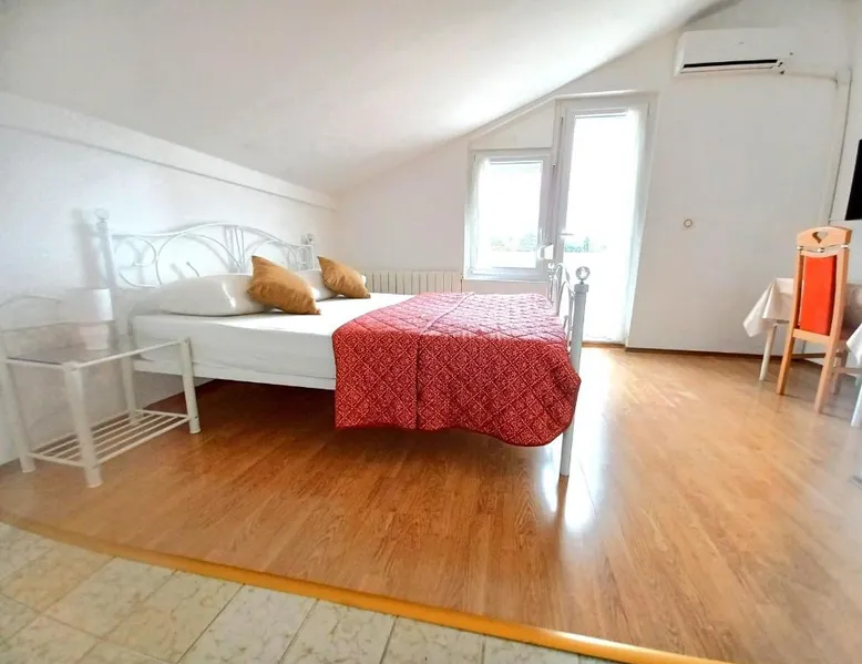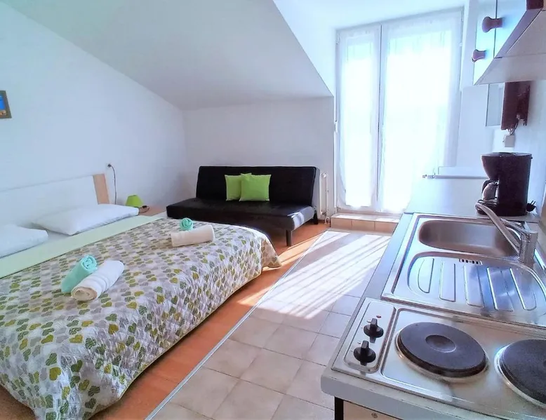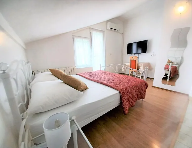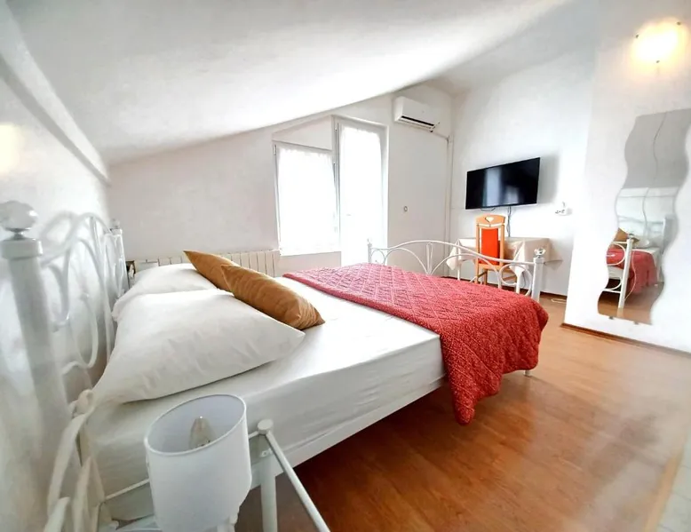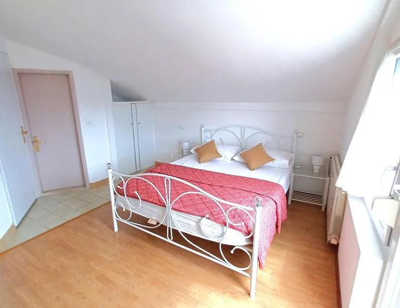 Comfortable Accommodations: Guest house Cecilia 2 in Malinska offers family rooms with air-conditioning, private bathrooms, and parquet floors. Each room includes a refrigerator, TV, and wardrobe, ensuring a pleasant stay. Essential Facilities: Guests can enjoy a terrace with sea views, free WiFi, and an outdoor seating area. The property features a lounge, shared kitchen, and balcony, providing ample space for relaxation and socializing. Convenient Location: Located 8.7 mi from Rijeka Airport, the guest house is a short walk from Maestral Beach and Malinska Bus Station. Nearby attractions include Kosljun Franciscan Monastery (11 mi) and Valica Cove (2.6 mi). This air-conditioned apartment comes with 1 living room, 1 separate bedroom and 1 bathroom with a shower. The apartment features a washing machine, a wardrobe, an electric kettle, parquet floors and a flat-screen TV with cable channels. The unit has 1 bed.