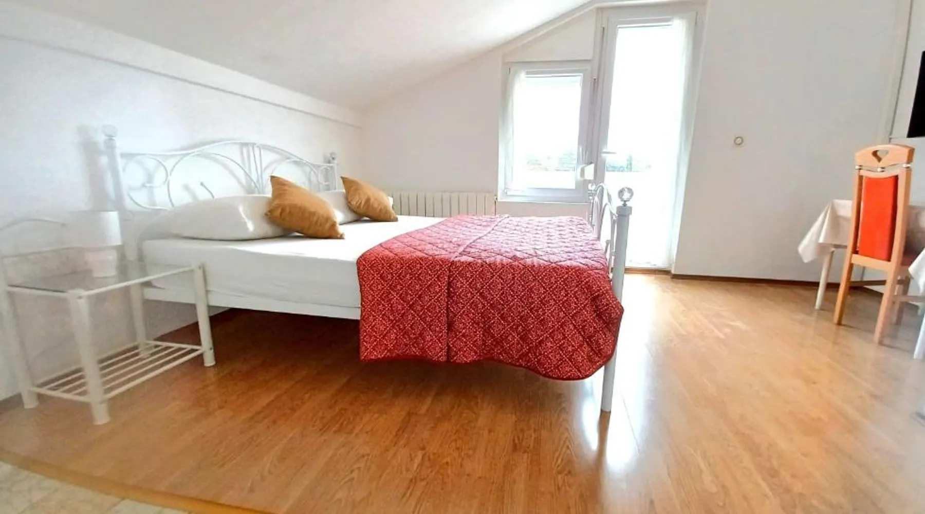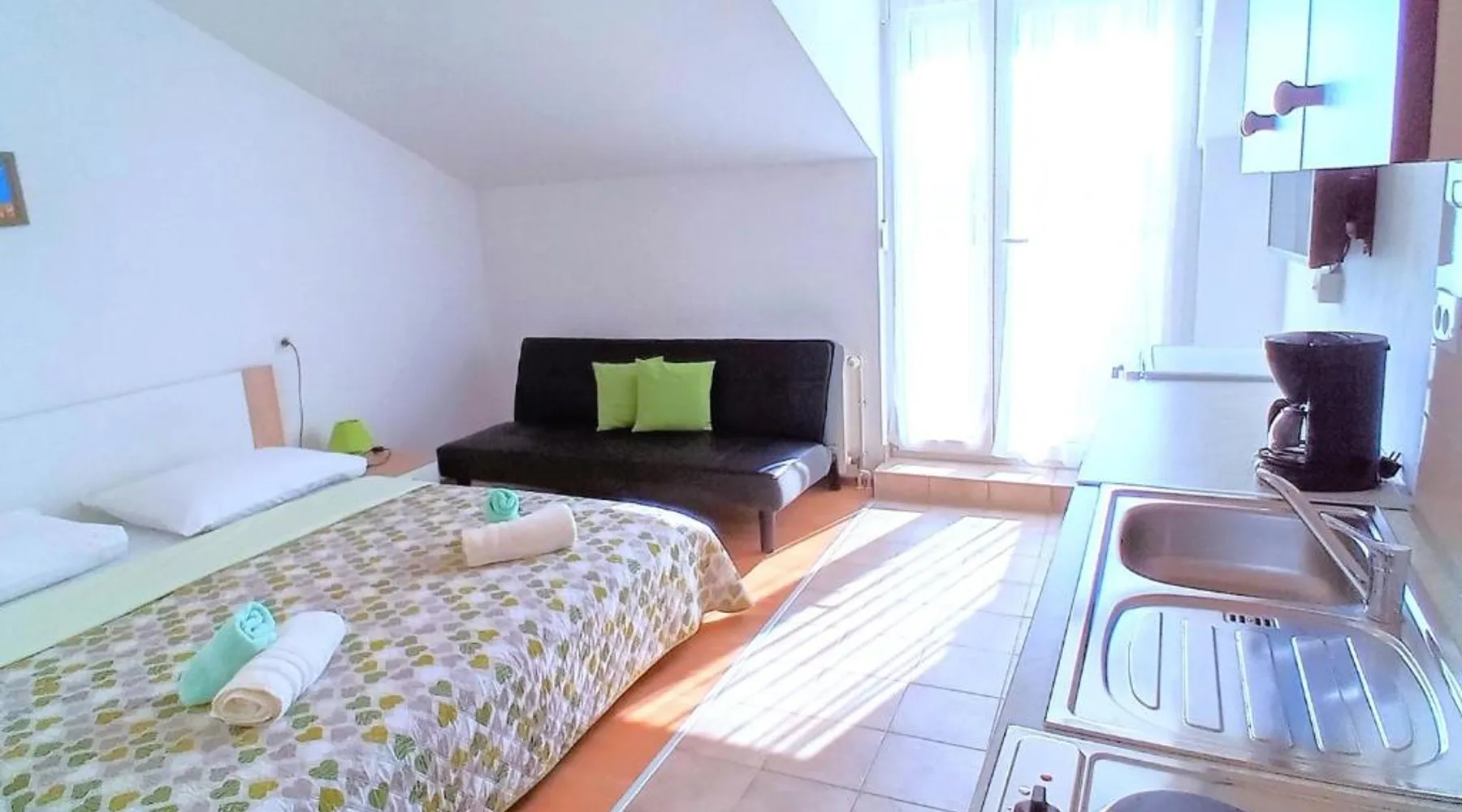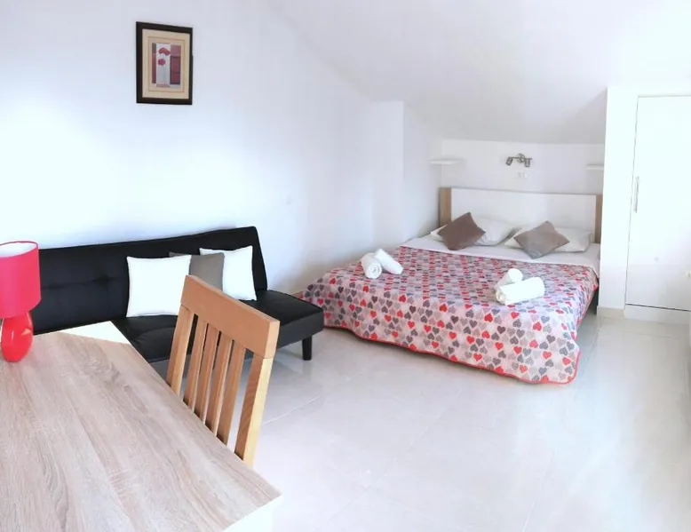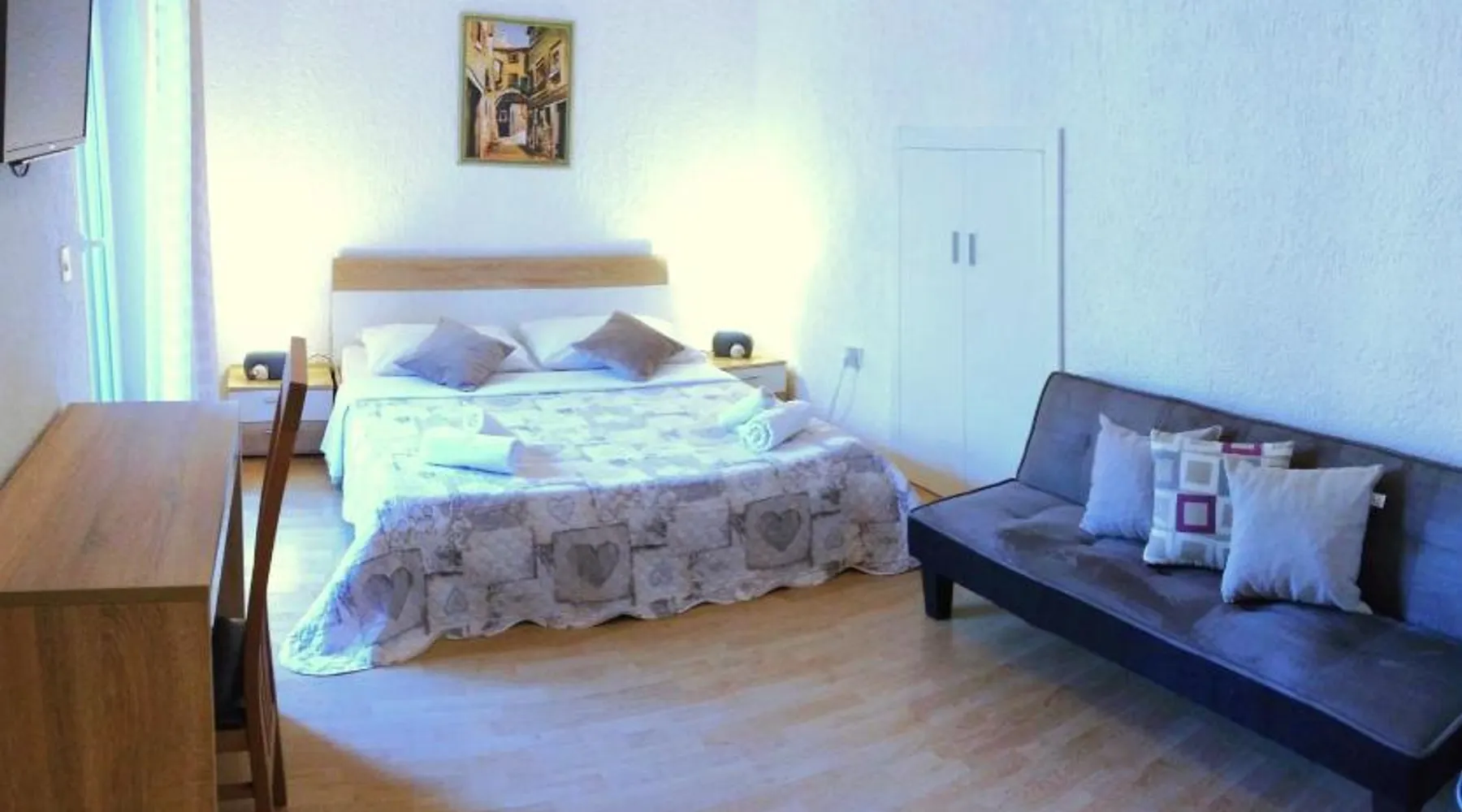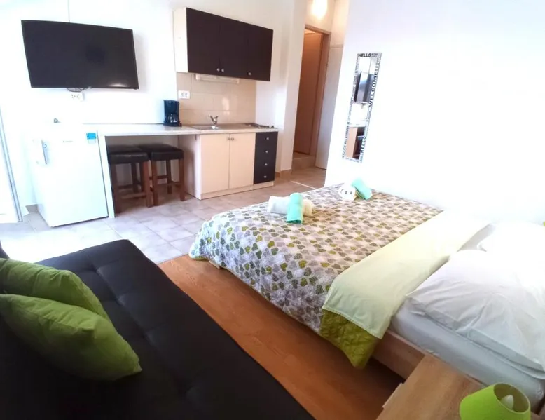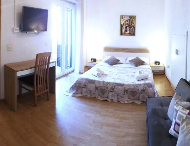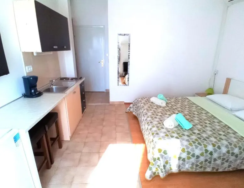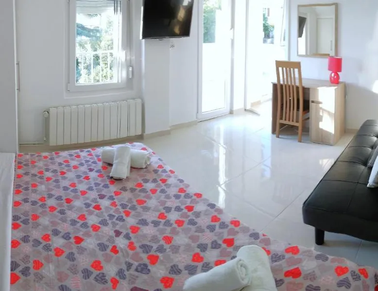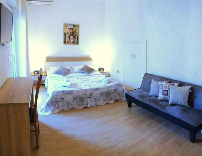 Comfortable Accommodations: Guest house Cecilia 2 in Malinska offers family rooms with air-conditioning, private bathrooms, and parquet floors. Each room includes a refrigerator, TV, and wardrobe, ensuring a pleasant stay. Essential Facilities: Guests can enjoy a terrace with sea views, free WiFi, and an outdoor seating area. The property features a lounge, shared kitchen, and balcony, providing ample space for relaxation and socializing. Convenient Location: Located 8.7 mi from Rijeka Airport, the guest house is a short walk from Maestral Beach and Malinska Bus Station. Nearby attractions include Kosljun Franciscan Monastery (11 mi) and Valica Cove (2.6 mi). This air-conditioned apartment comes with 1 living room, 1 separate bedroom and 1 bathroom with a shower. The apartment features a washing machine, a wardrobe, an electric kettle, parquet floors and a flat-screen TV with cable channels. The unit has 1 bed.