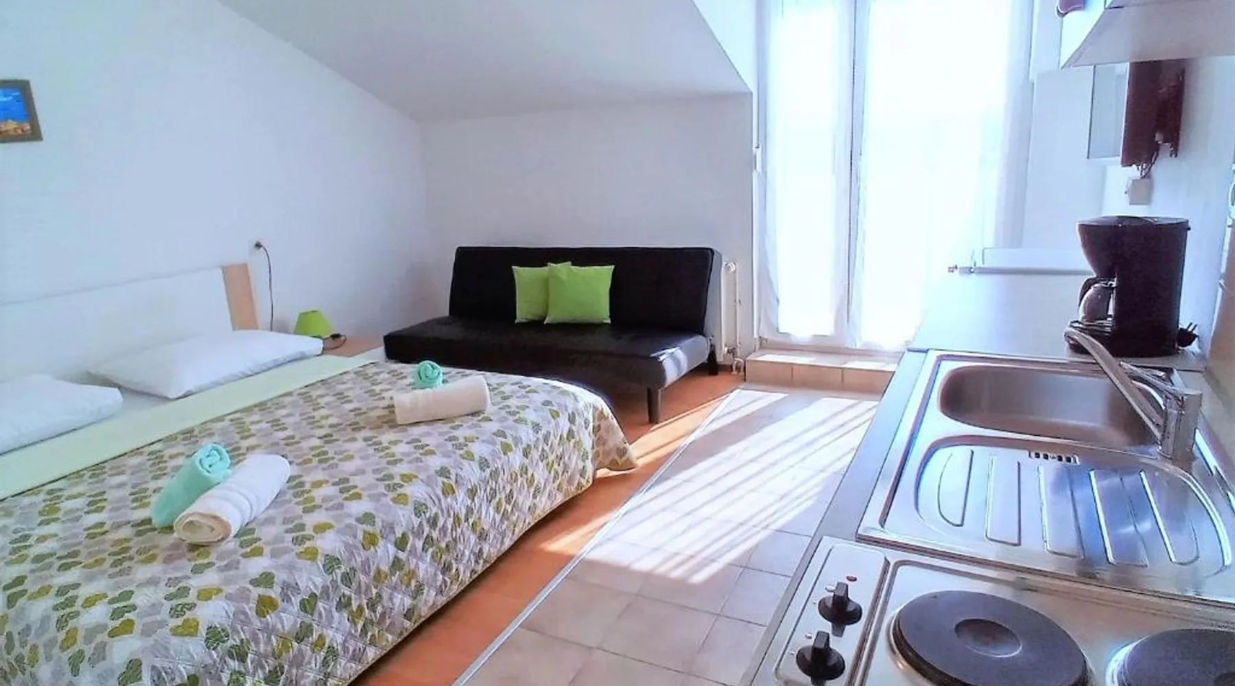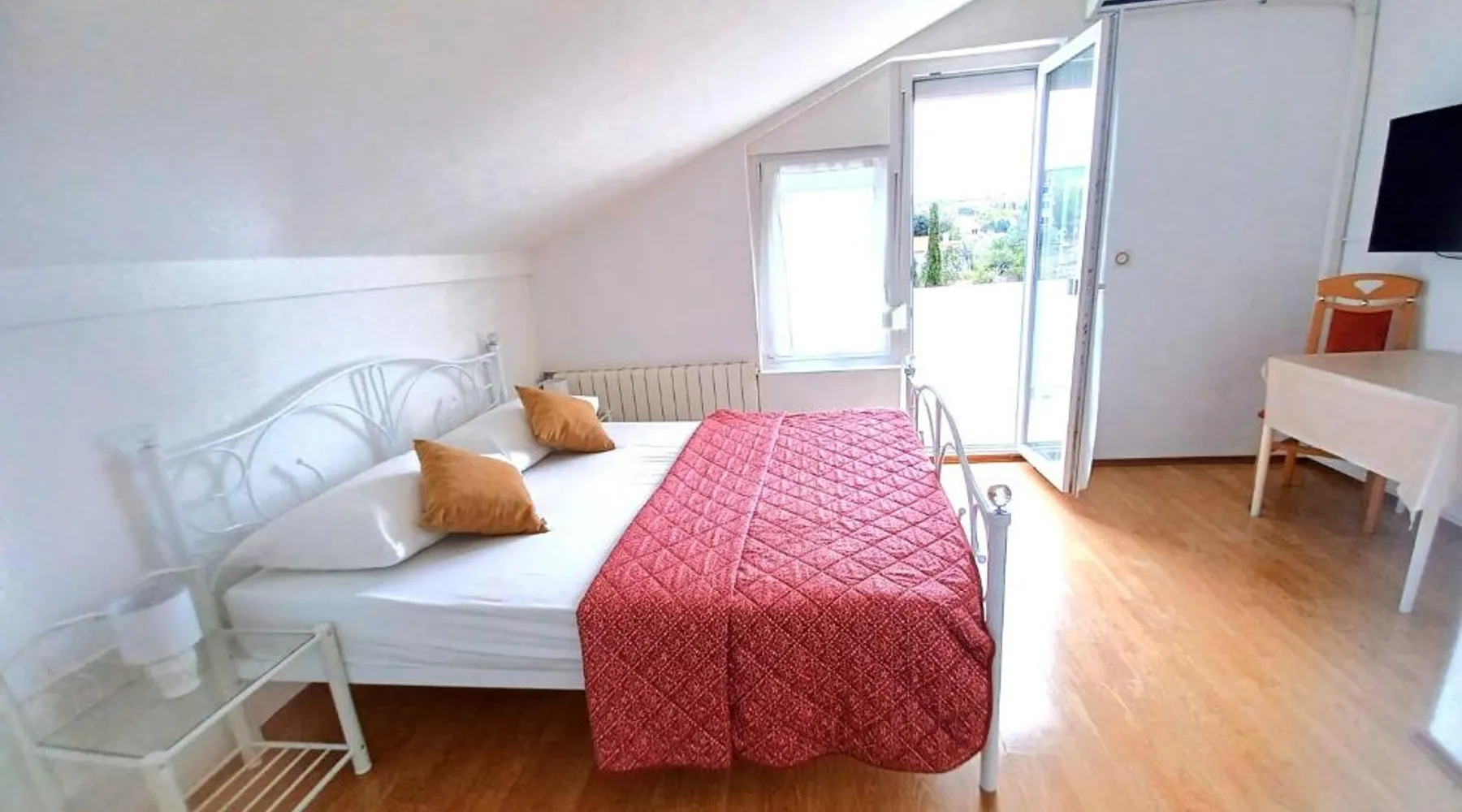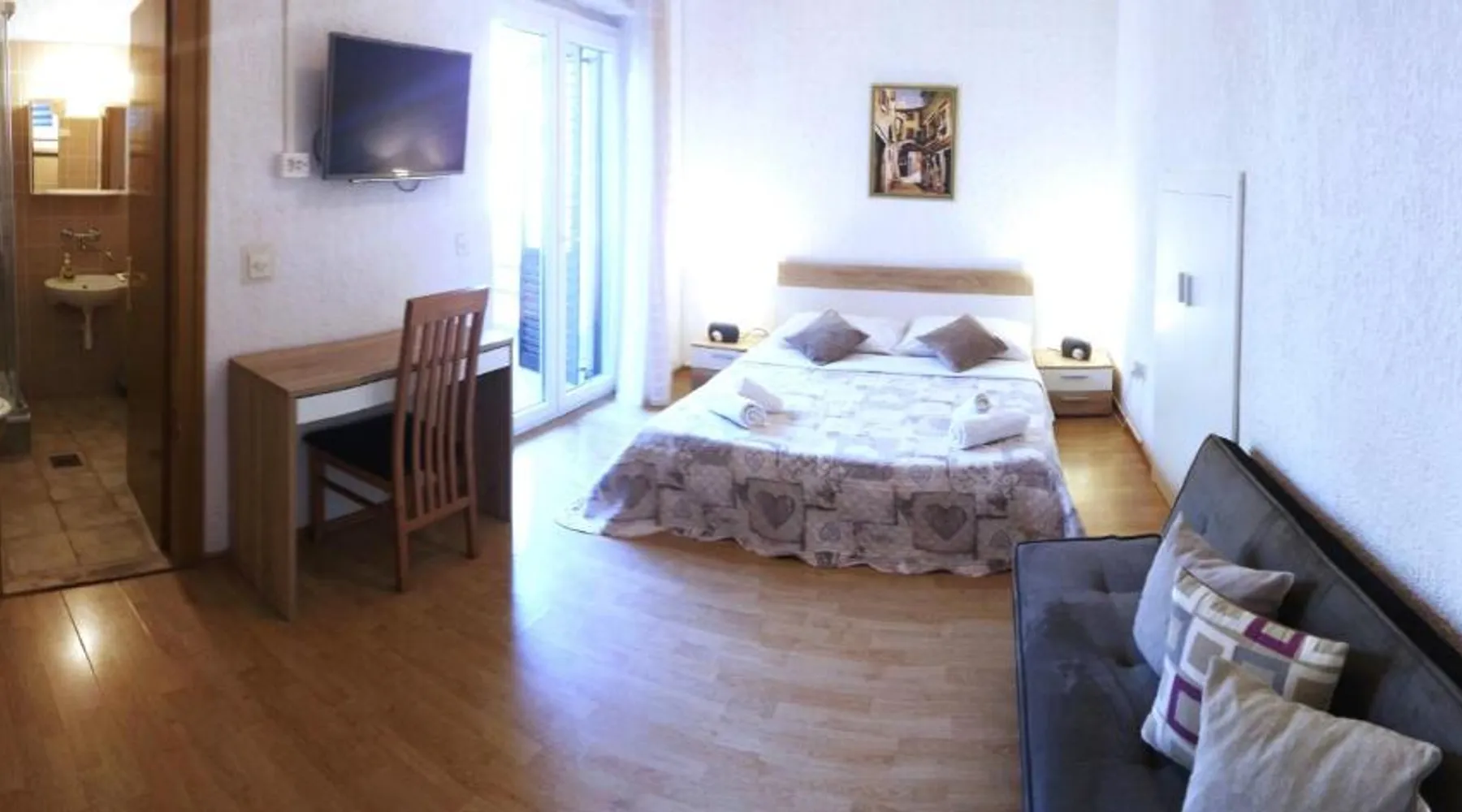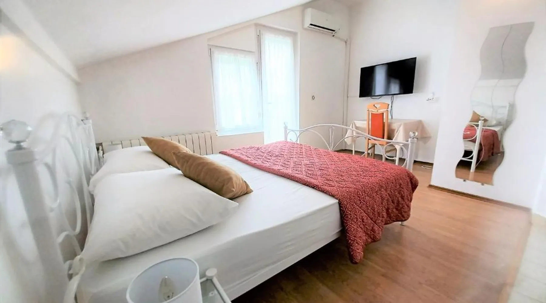 Comfortable Accommodations: Guest house Cecilia 2 in Malinska offers family rooms with air-conditioning, private bathrooms, and parquet floors. Each room includes a refrigerator, TV, and wardrobe, ensuring a pleasant stay. Essential Facilities: Guests can enjoy a terrace with sea views, free WiFi, and an outdoor seating area. The property features a lounge, shared kitchen, and balcony, providing ample space for relaxation and socializing. Convenient Location: Located 8.7 mi from Rijeka Airport, the guest house is a short walk from Maestral Beach and Malinska Bus Station. Nearby attractions include Kosljun Franciscan Monastery (11 mi) and Valica Cove (2.6 mi). This air-conditioned apartment comes with 1 living room, 1 separate bedroom and 1 bathroom with a shower. The apartment features a washing machine, a wardrobe, an electric kettle, parquet floors and a flat-screen TV with cable channels. The unit has 1 bed.