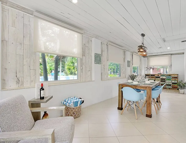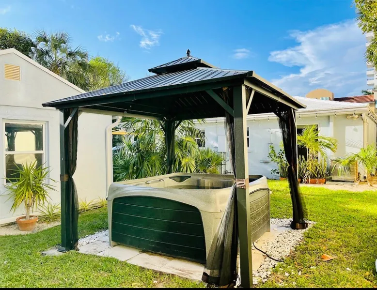 Escape to your own private tropical retreat in Pompano Beach! Our enchanting home offers the best of both worlds with a main house and a private master suite. The entire property is yours to enjoy! Perfectly situated just steps away from the beach, this hidden gem caters to larger groups seeking space and privacy. Immerse yourself in a vibrant neighborhood, surrounded by a plethora of entertainment and dining choices. Unwind in a delightful screened-in hot tub, ensuring ultimate relaxation. The space Discover your own slice of paradise in Pompano Beach, Florida, where timeless design meets coastal comfort. This 3-bedroom property includes a 2-bedroom main home and a private guest cottage, offering the perfect setup for families, couples, or groups looking for a South Florida beach getaway — all just steps from the beach and a short walk to local restaurants and shops. 🏠 Main House Step inside the main residence to find a bright, inviting living area featuring a large, comfortable sofa (that converts into a bed), a charming loveseat, and a wall-mounted Smart TV — perfect for movie nights after a day at the beach. Adjacent to the living area is the formal dining space, complete with a natural wood dining table and striking blue chairs that bring a vibrant, coastal flair. The updated kitchen shines with white cabinetry, sleek countertops, a designer tile backsplash, and stainless-steel appliances, including a full-size refrigerator, electric range, microwave, and dishwasher — ideal for home-cooked meals or quick beach snacks. The main home includes a full bathroom with a step-in shower, conveniently located off the hallway. Bedroom 1: Queen-sized bed Bedroom 2: Two queen-sized beds 🌿 Outdoor Courtyard Through a frosted glass door off the kitchen, step into a tropical courtyard patio that connects the main house and cottage. Featuring stone pavers, an alfresco dining table, a cozy lounge area, and a shade sail, this inviting outdoor retreat is perfect for morning coffee, evening cocktails, or dining under the stars while enjoying gentle sea breezes. 🏡 Private Guest Cottage Next to the patio, you’ll find a charming studio-style cottage — a private and peaceful retreat ideal for couples, in-laws, or older children seeking a bit more privacy. Inside, you’ll find: A queen-sized bed A pull-out sofa A flat-screen HDTV A kitchenette with a small electric range, refrigerator, and microwave A full bathroom with a tub/shower combo and pedestal sink 💦 Relaxation & Extras Beyond the courtyard, discover a screened-in, luxurious hot tub, the ultimate spot to unwind after exploring local attractions or the nearby Pompano Pier. For your beach days, a side storage area offers plenty of beach chairs, umbrellas, and accessories, along with a convenient outdoor shower to rinse off sandy feet. A full-size washer and dryer are also available for guest use, located in the backyard storage area and shared between the main house and cottage. The spacious driveway accommodates up to four vehicles, making arrivals and departures easy and stress-free. 🌴 Perfect For: Families and small groups Couples seeking a romantic beach retreat Travelers who want walkable access to restaurants, shops, and the beach Guests who love coastal living with resort-style amenities Guest access The entire property is yours to enjoy. Easy self check-in. Other things to note Hot tub rules: Adult supervision for children at all times Spa, like any piece of technology, can occasionally experience issues. While we do our best to ensure they are functioning properly, we cannot guarantee heating and do not offer refunds for heating issues. If a problem arises, we will make every effort to resolve it as quickly as possible. While we don’t anticipate any issues, we appreciate your understanding that, like any technology, malfunctions can happen. Propane is not provided - but can be filled our switched at local hardware store. Essential supplies are provided for the first few days, guests are responsible for extra toilet paper, paper towels, soaps, etc after what we provide is used Maximum 3 cars allowed - No street parking - all cars must be in driveway Just like all hotels, this property has exterior cameras. Tampering, covering, or removing the camera can lead to immediate removal from the property with no refund.