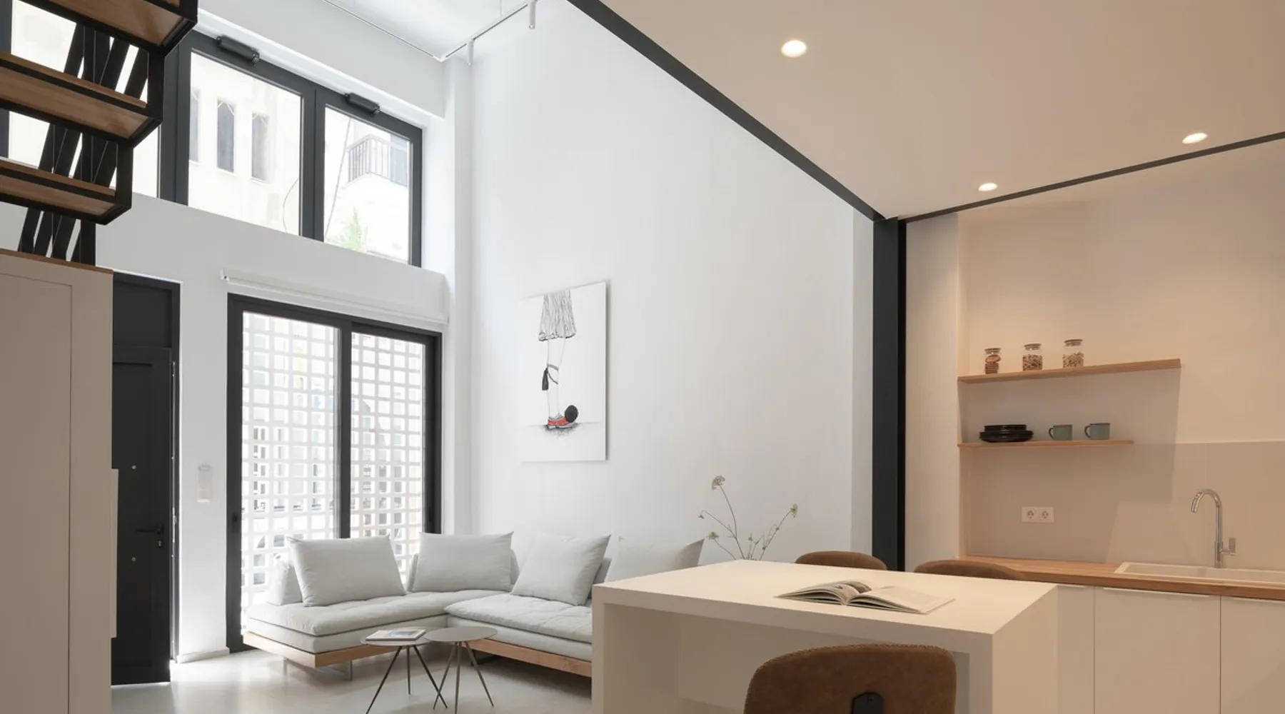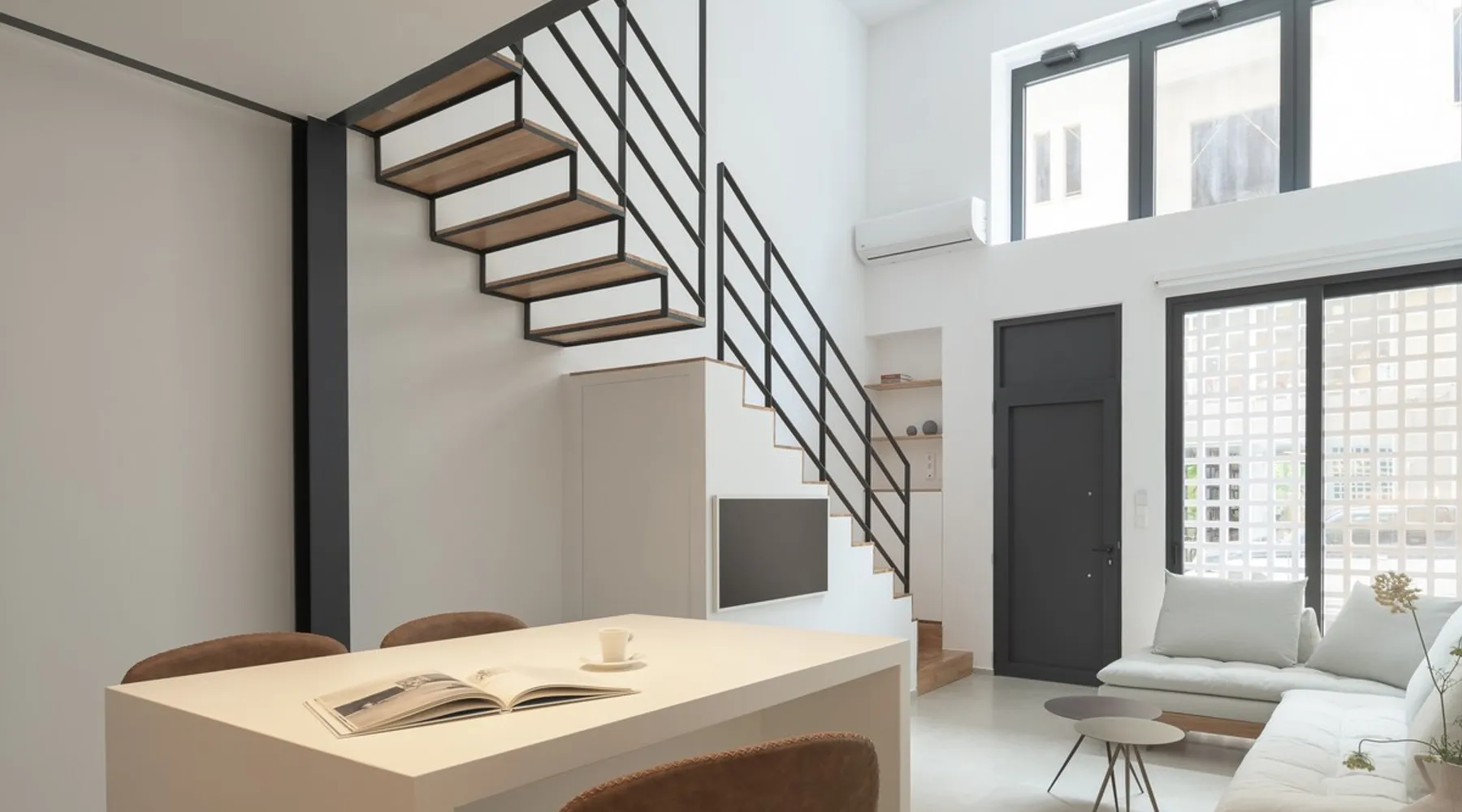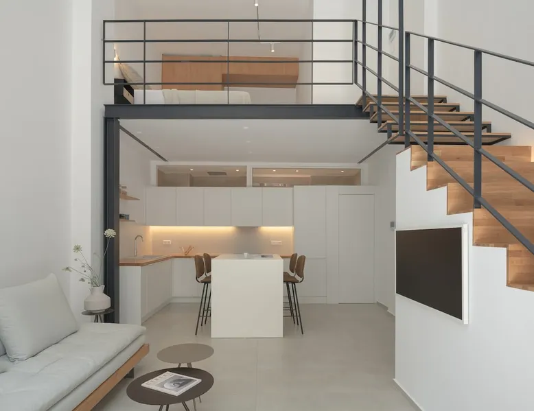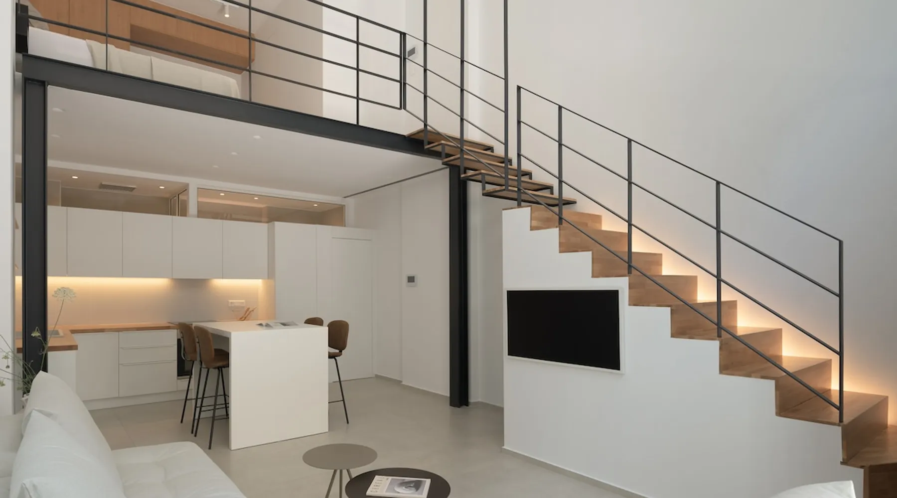 Bright and stylish, one-bedroom apartment in the heart of Ierapetra. Combines elegance, high-tech amenities & excellent location. Large windows provide natural air & light, also featuring blackout blinds. The loft bedroom with ensuite bathroom & king size bed overlooks the living room with 2 sofa-beds on the ground floor, a fully equipped kitchen (oven, stovetop, dishwasher, washing machine-dryer), rain shower bathroom, smart TV, A/C, wifi & smart home features. Suitable for up to 4 guests. Registration Details 00002162782
