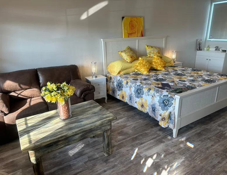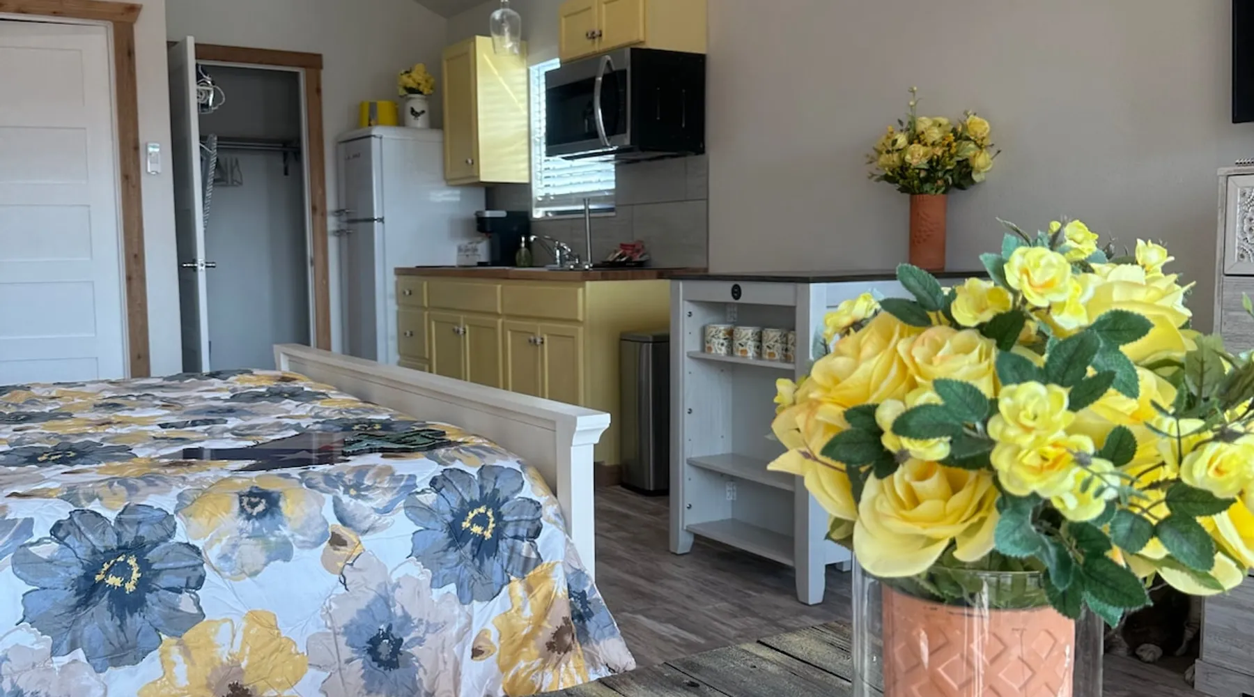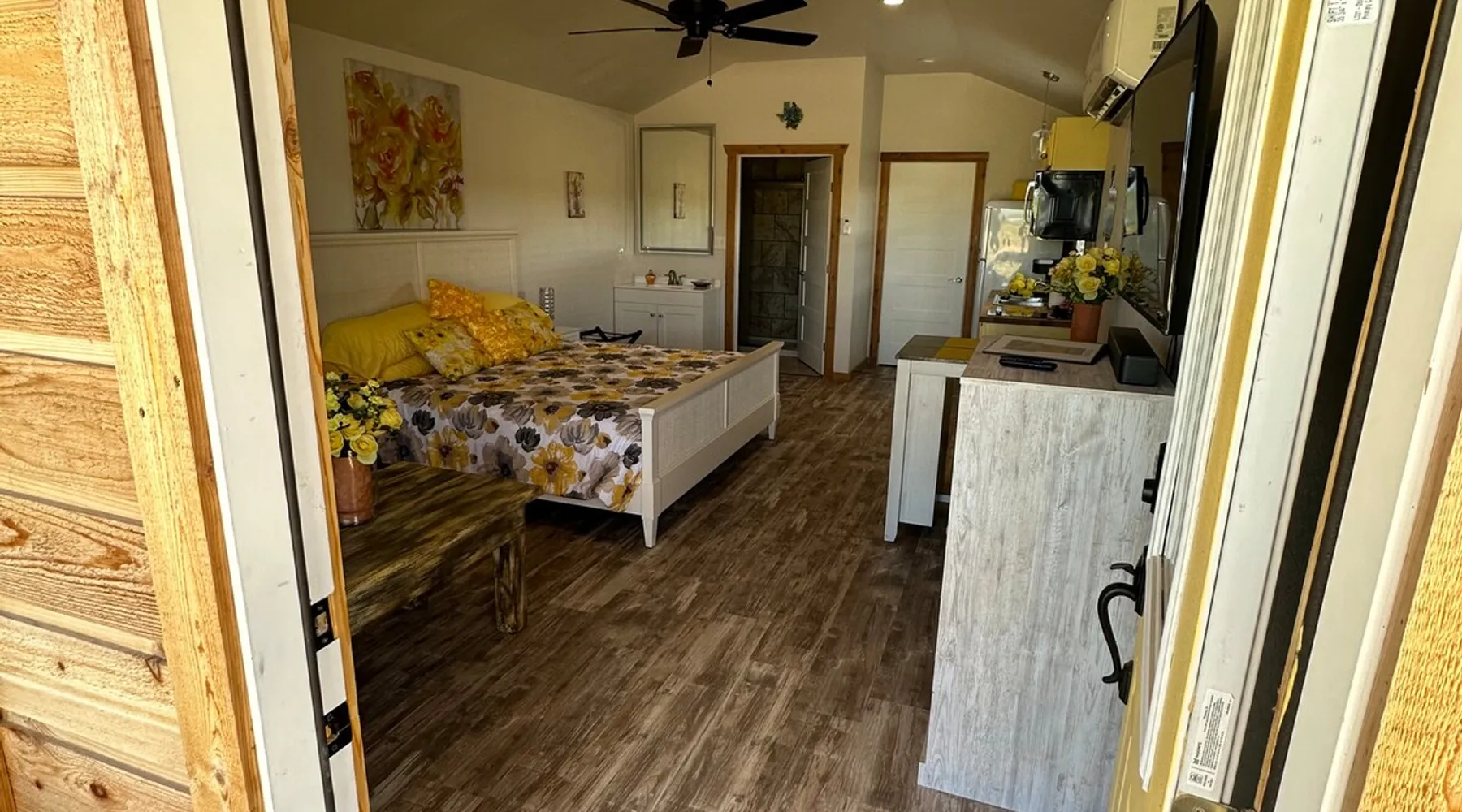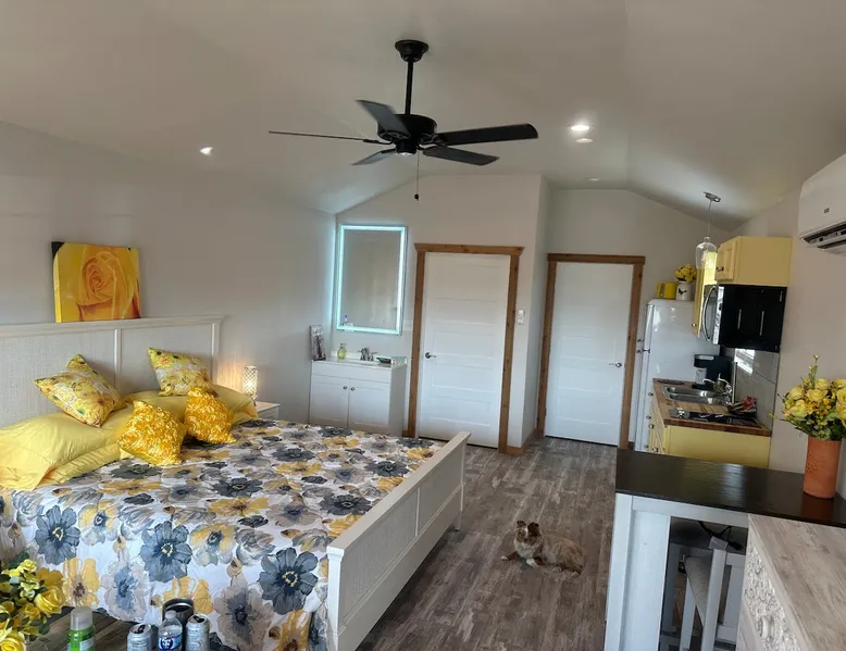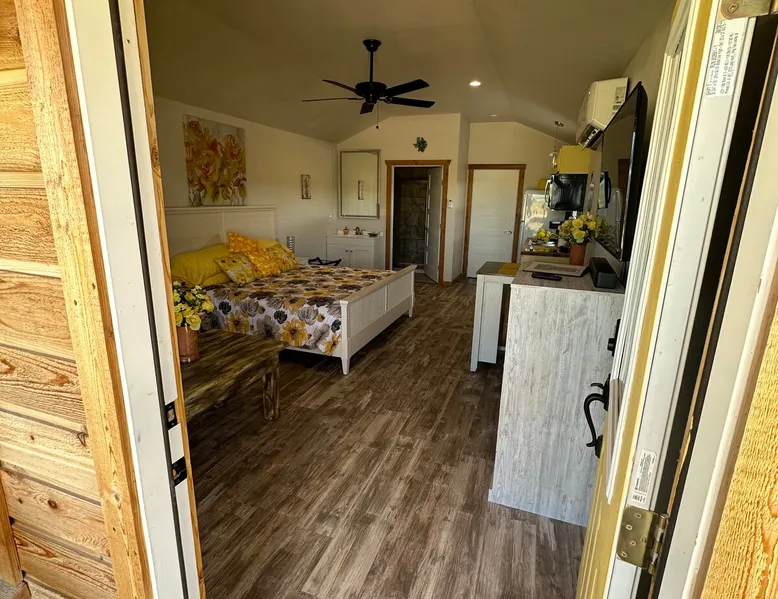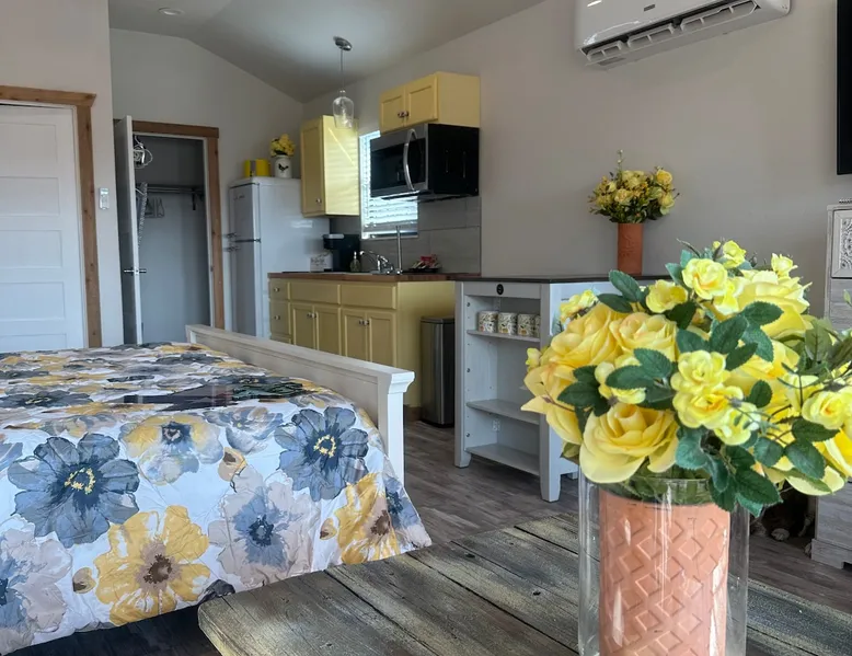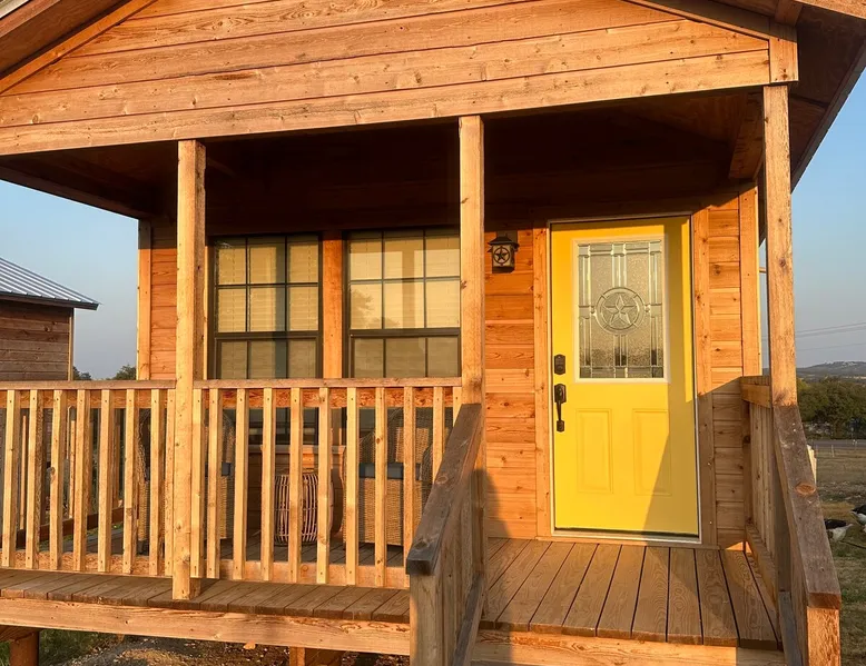The Cabin of Love Yellow Rose at Silver Dollar Winery Hill Country. Enjoy wine and our Italian Bistro with artisan pizzas and Italian food with over 20 wines sweet to dry. Located on Highway 290. Cabin new release as of August 31 2023. Gorgeous views sunset and sunrise located next to 80+ wineries and distilleries near Fredericksburg and Hye Tx. Custom cabin with king size Serta mattress with deluxe pillows soft and firm. Microwave and kitchenette. currently no breakfast is provided. Guest access Private cabin with parking next to cabin for one car