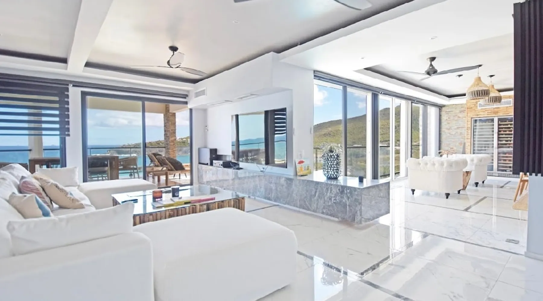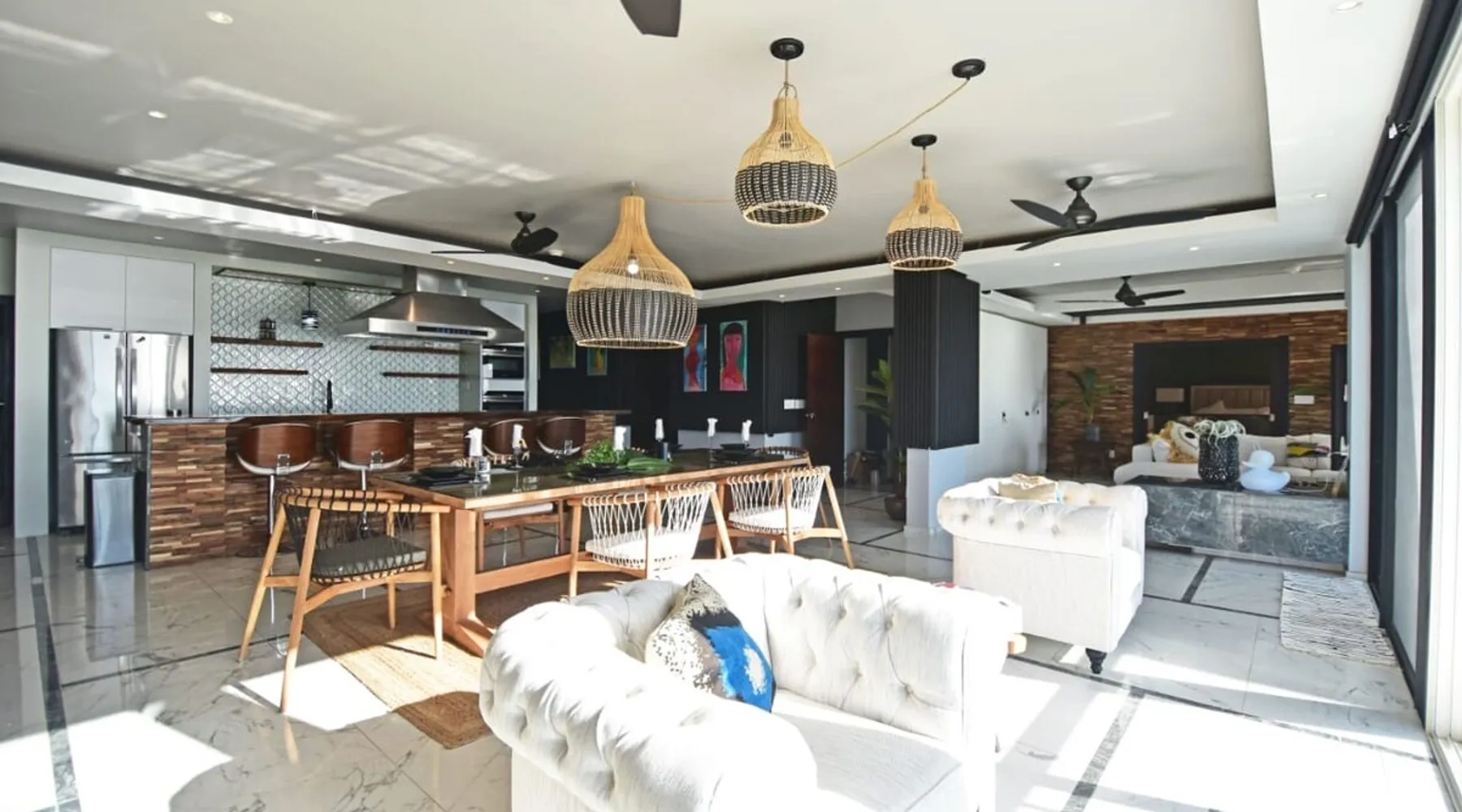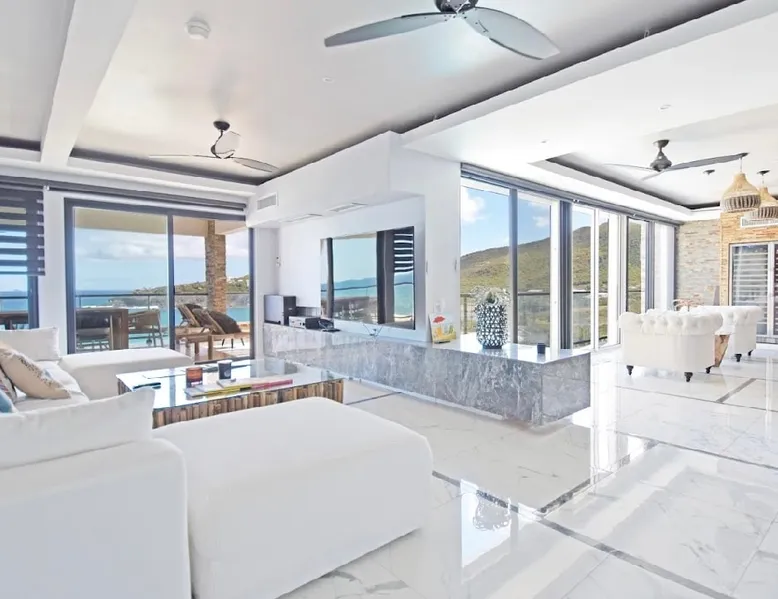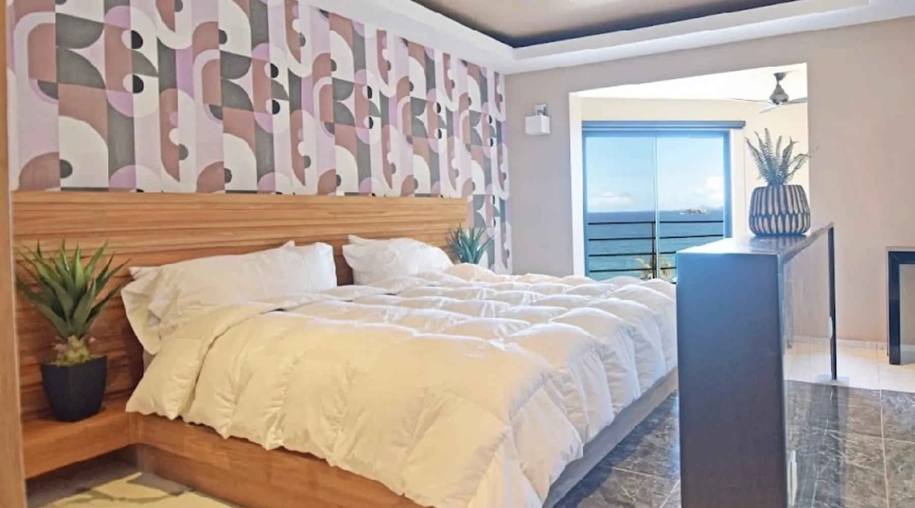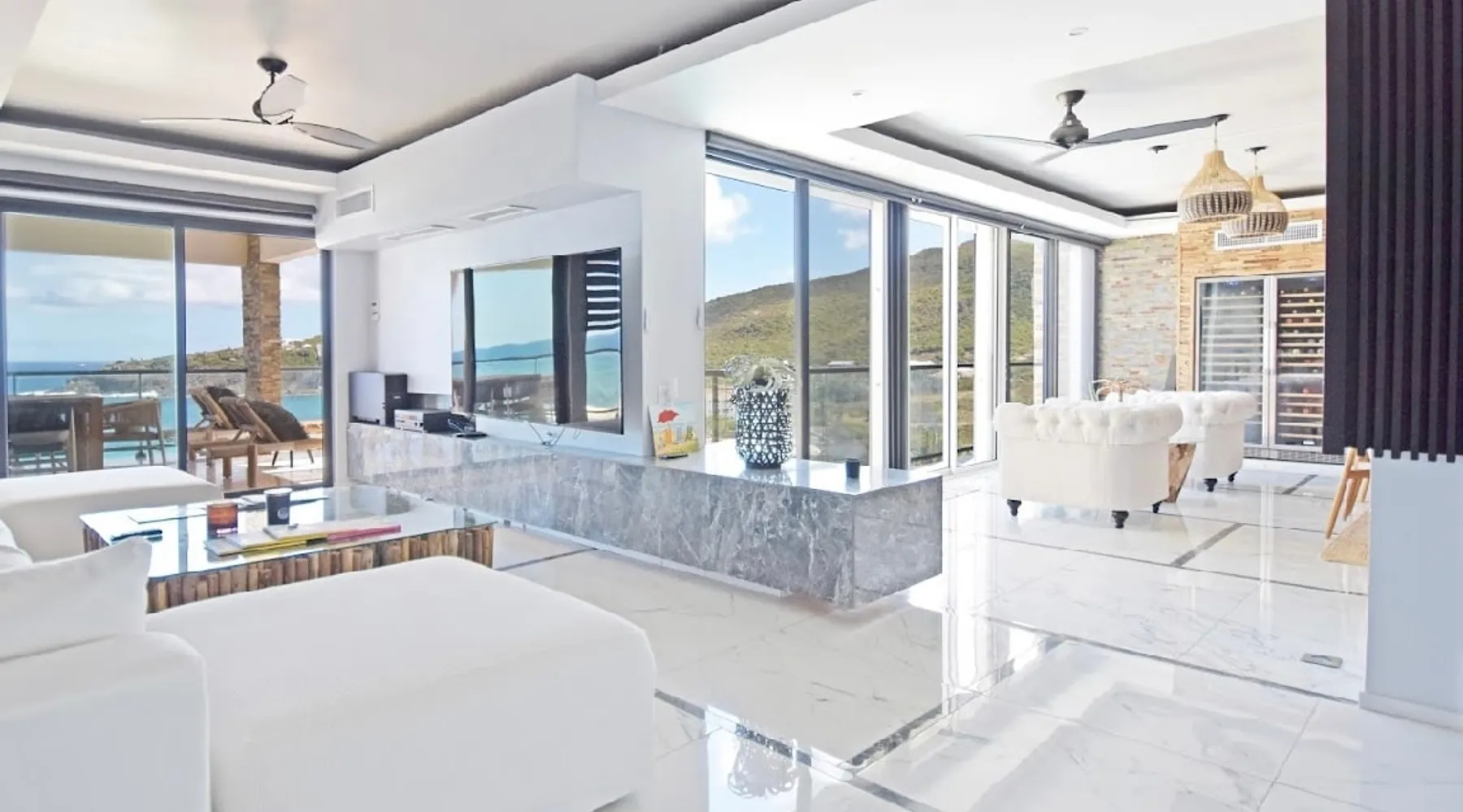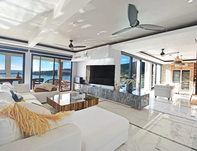 Villa La Vista, a luxurious penthouse perched on a palm-lined hillside in Sint Maarten’s Guana Bay. Just steps from the breathtaking famous Guana Bay Beach. Go relax on the beach and play in the waves as you take in breathtaking views of the Atlantic Ocean and St. Barths. This Penthouse features 4 elegant bedrooms, 4.5 spa-inspired bathrooms, a shared private pool, and an expansive sun terrace. 3 minutes away from the famous philipsburg boardwalk for luxury shopping and curated restaurants. The space Superior design, modern layout, and cutting-edge decor choices define this premier Penthouse in Sint Maarten’s Guana Bay . Set on a palm tree hillside overlooking the beautiful crystal clear Atlantic Ocean , the home offers huge living spaces, gorgeous pool deck , and a spacious sun terrace. No expense has been spared with this property, with golden beaches, bars, cruise outings and Philipsburg town nearby. An exceptional view awaits new arrivals that step into the central living space at Villa La Vista , with a shimmering sea framed by a blue pool, waving palm trees and artful pergola. Guests can expect designer furnishings, ranging from huge dining tables and specially-selected beds . The interior boasts stunning artwork from French artists , A fully equipped state of the art kitchen and loungers out on the terrace . The shining, fully-equipped kitchen ensures that catering for big groups is especially easy. From Villa La Vista , guests are a short drive from picturesque shorelines, including the sandy philipsburg beaches ,Simpson Bay Beach and the famous “close-shave” airport approach at Maho Beach. A huge range of ocean outings are available from within minutes, including speed boat trips, scuba diving in crystalline waters, and relaxing yacht and catamaran trips. Visit local rum distilleries for a taste of the island’s unique culture, or take to the countryside on an exhilarating ATV outing. After strolling the colonial Dutch streets of the local town, retire to your private terrace for a cool drink and a glorious sunset WHERE YOU CAN OVERLOOK THE BEAUTIFUL RIVERA OF ST.BARTHS!! Guest access Guests will have exclusive access to the penthouse, including the sun terrace and all indoor living spaces. The condo complex’s private pool is available for guest use, offering a tranquil setting to enjoy the island’s warmth and beauty. Additional amenities include high-speed Wi-Fi, on-site parking, and a fully equipped kitchen. Whether you’re lounging by the pool or exploring the nearby beaches, Villa La Vista offers the perfect mix of privacy and convenience. Other things to note The condo complex features a private pool shared with a small number of other residents, ensuring a peaceful and relaxing atmosphere. While we strive to provide a flawless experience, occasional maintenance may be required to keep the property in perfect condition, and we will notify guests in advance if this occurs. Conveniently located near Sint Maarten’s best beaches, dining, and attractions, Villa La Vista is the ideal home base for your Caribbean getaway. VILLA LA VISTA is FULLY POWERED by a GENERATOR in case of electric outages. Recently the island has had energy shortage problems due to loosing 3 turbines that power the island . The power goes out 1-2 hours daily in most areas . But rest assured you will not be inconvenienced by this at all . The switch to the generator is automatic and seamless.