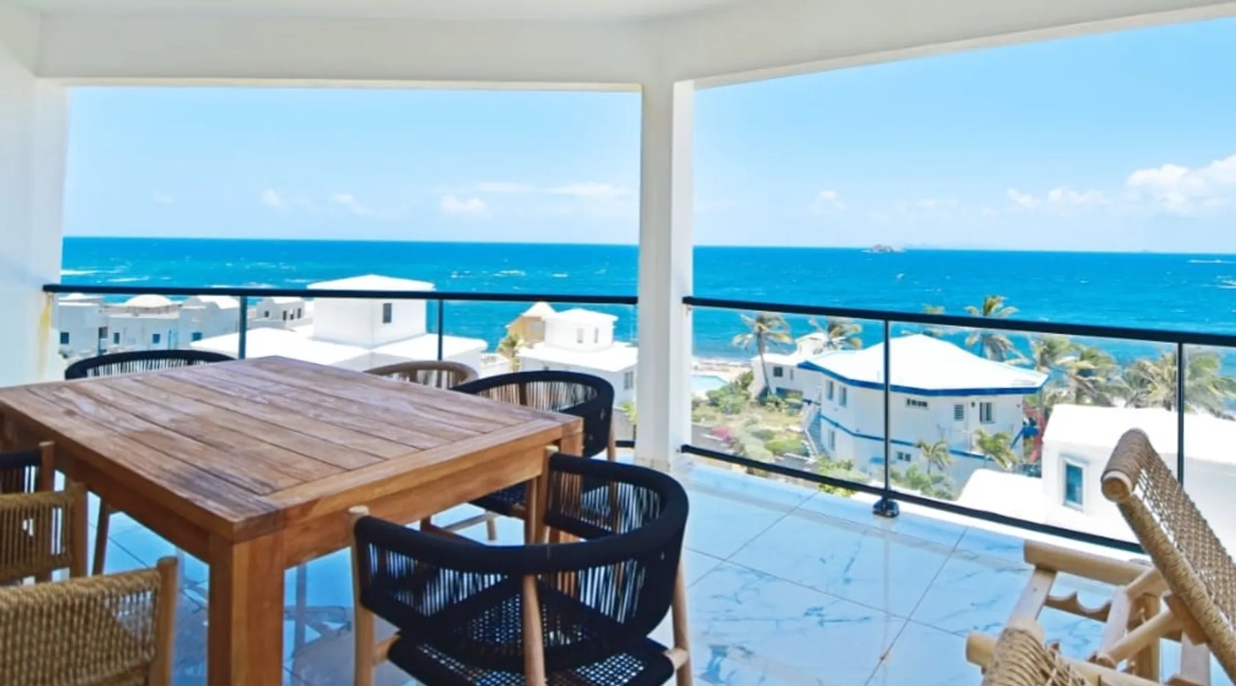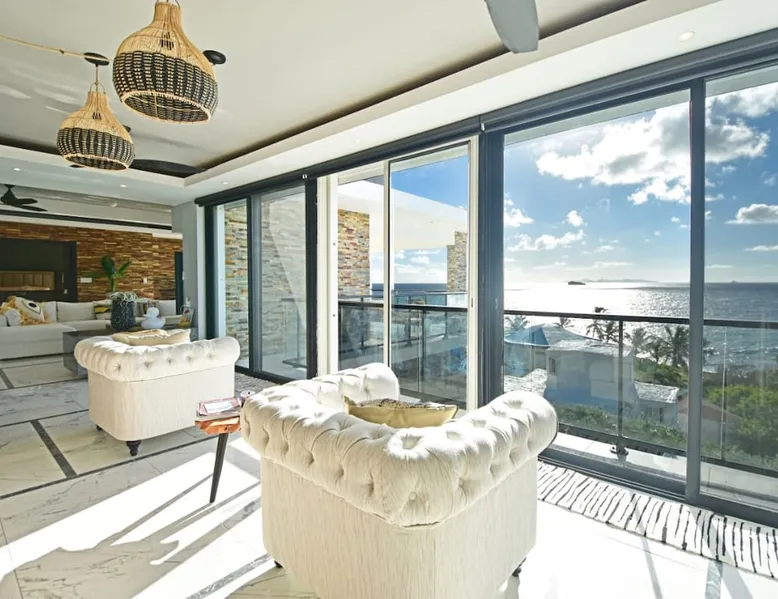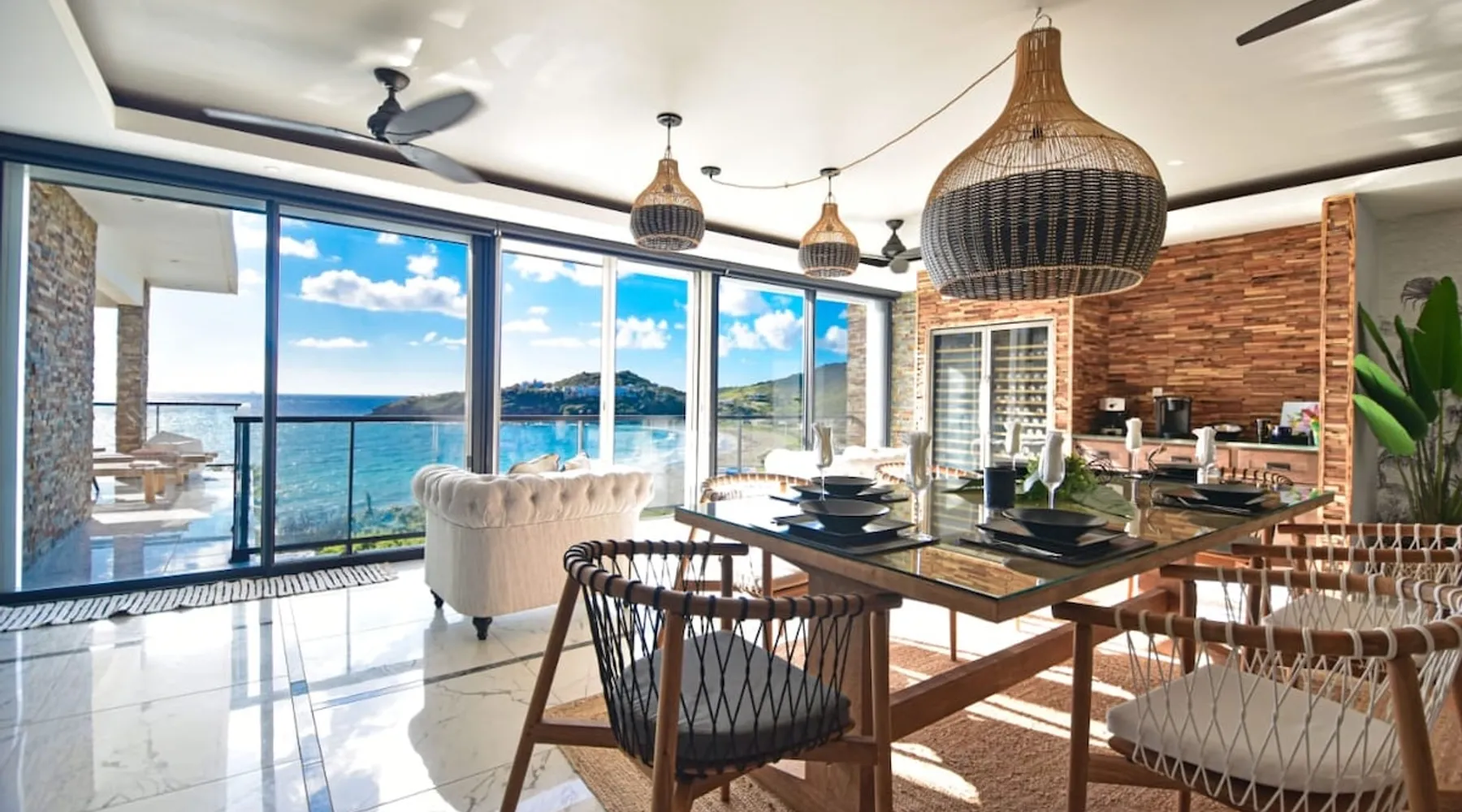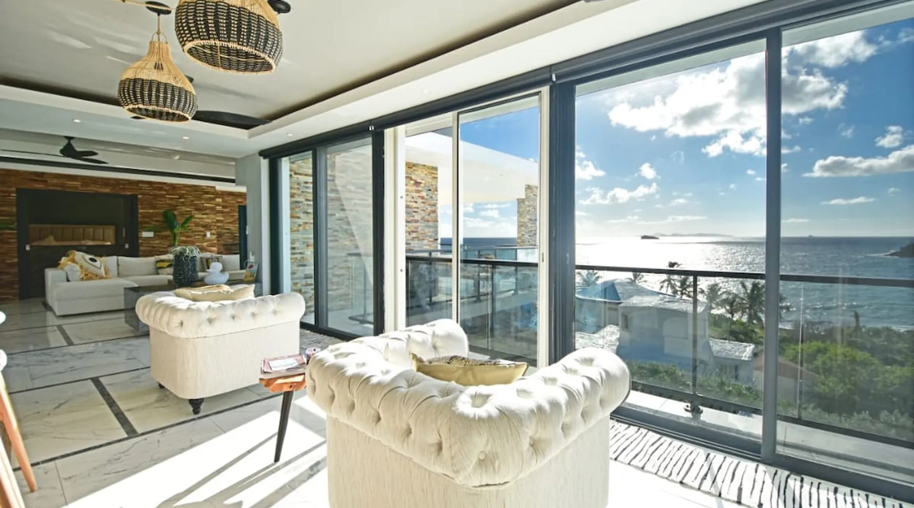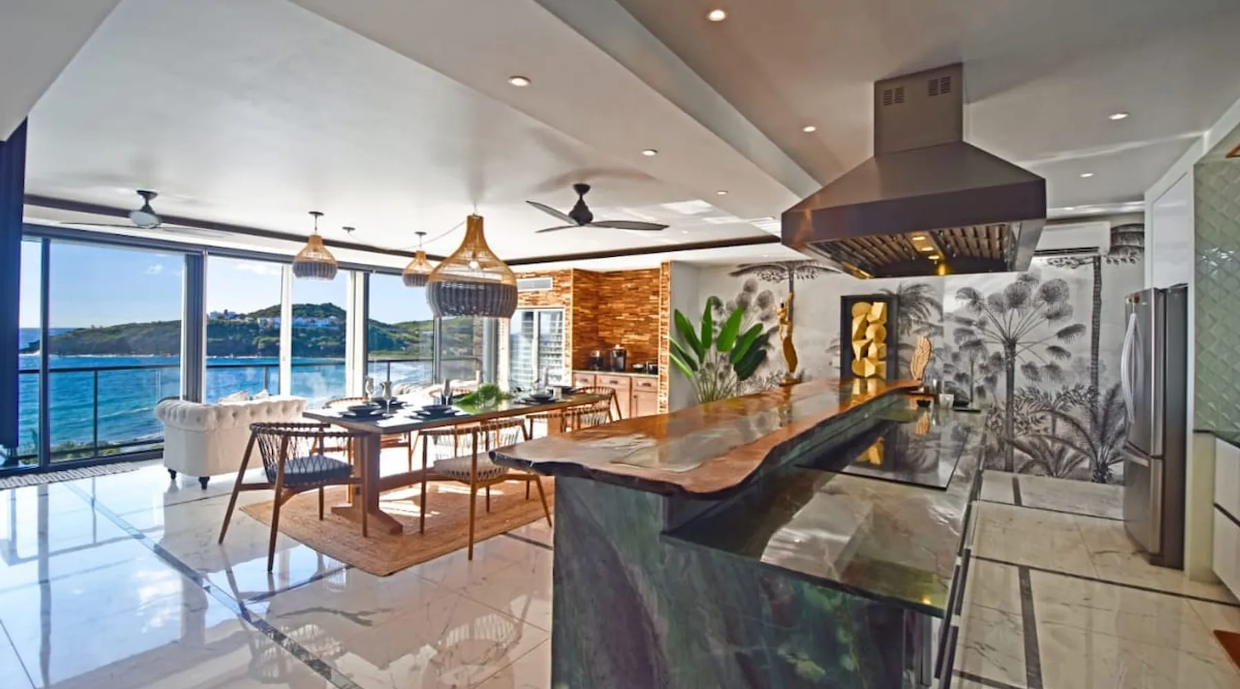 Villa La Vista, a luxurious penthouse perched on a palm-lined hillside in Sint Maarten’s Guana Bay. Just steps from the breathtaking famous Guana Bay Beach. Go relax on the beach and play in the waves as you take in breathtaking views of the Atlantic Ocean and St. Barths. This Penthouse features 4 elegant bedrooms, 4.5 spa-inspired bathrooms, a shared private pool, and an expansive sun terrace. 3 minutes away from the famous philipsburg boardwalk for luxury shopping and curated restaurants. The space Superior design, modern layout, and cutting-edge decor choices define this premier Penthouse in Sint Maarten’s Guana Bay . Set on a palm tree hillside overlooking the beautiful crystal clear Atlantic Ocean , the home offers huge living spaces, gorgeous pool deck , and a spacious sun terrace. No expense has been spared with this property, with golden beaches, bars, cruise outings and Philipsburg town nearby. An exceptional view awaits new arrivals that step into the central living space at Villa La Vista , with a shimmering sea framed by a blue pool, waving palm trees and artful pergola. Guests can expect designer furnishings, ranging from huge dining tables and specially-selected beds . The interior boasts stunning artwork from French artists , A fully equipped state of the art kitchen and loungers out on the terrace . The shining, fully-equipped kitchen ensures that catering for big groups is especially easy. From Villa La Vista , guests are a short drive from picturesque shorelines, including the sandy philipsburg beaches ,Simpson Bay Beach and the famous “close-shave” airport approach at Maho Beach. A huge range of ocean outings are available from within minutes, including speed boat trips, scuba diving in crystalline waters, and relaxing yacht and catamaran trips. Visit local rum distilleries for a taste of the island’s unique culture, or take to the countryside on an exhilarating ATV outing. After strolling the colonial Dutch streets of the local town, retire to your private terrace for a cool drink and a glorious sunset WHERE YOU CAN OVERLOOK THE BEAUTIFUL RIVERA OF ST.BARTHS!! Guest access Guests will have exclusive access to the penthouse, including the sun terrace and all indoor living spaces. The condo complex’s private pool is available for guest use, offering a tranquil setting to enjoy the island’s warmth and beauty. Additional amenities include high-speed Wi-Fi, on-site parking, and a fully equipped kitchen. Whether you’re lounging by the pool or exploring the nearby beaches, Villa La Vista offers the perfect mix of privacy and convenience. Other things to note The condo complex features a private pool shared with a small number of other residents, ensuring a peaceful and relaxing atmosphere. While we strive to provide a flawless experience, occasional maintenance may be required to keep the property in perfect condition, and we will notify guests in advance if this occurs. Conveniently located near Sint Maarten’s best beaches, dining, and attractions, Villa La Vista is the ideal home base for your Caribbean getaway. VILLA LA VISTA is FULLY POWERED by a GENERATOR in case of electric outages. Recently the island has had energy shortage problems due to loosing 3 turbines that power the island . The power goes out 1-2 hours daily in most areas . But rest assured you will not be inconvenienced by this at all . The switch to the generator is automatic and seamless.