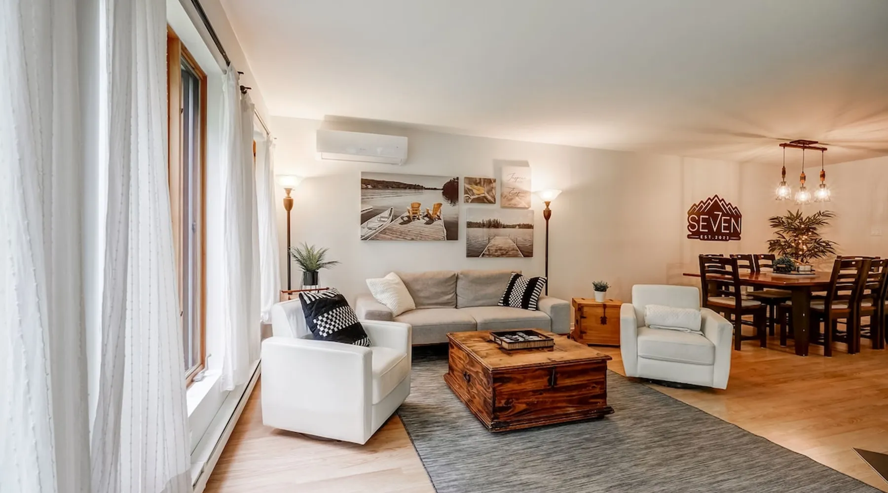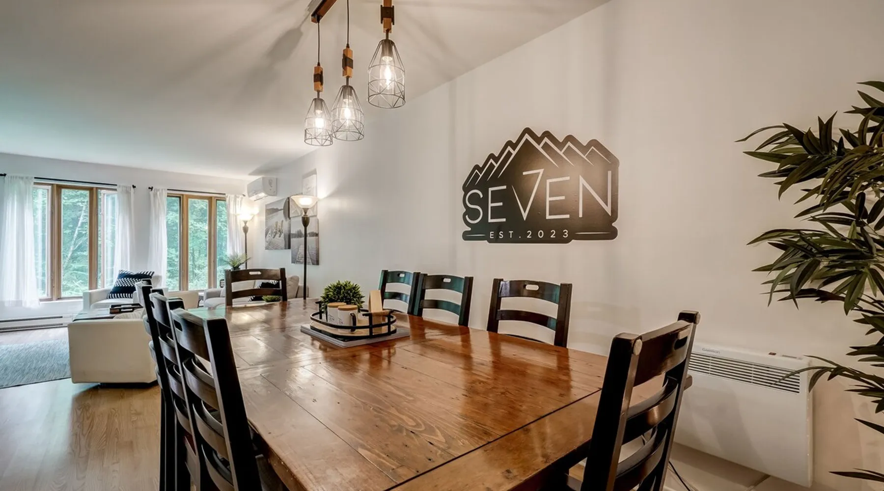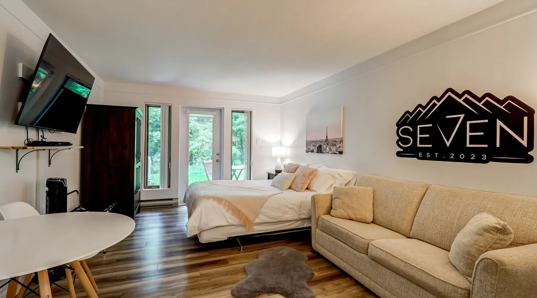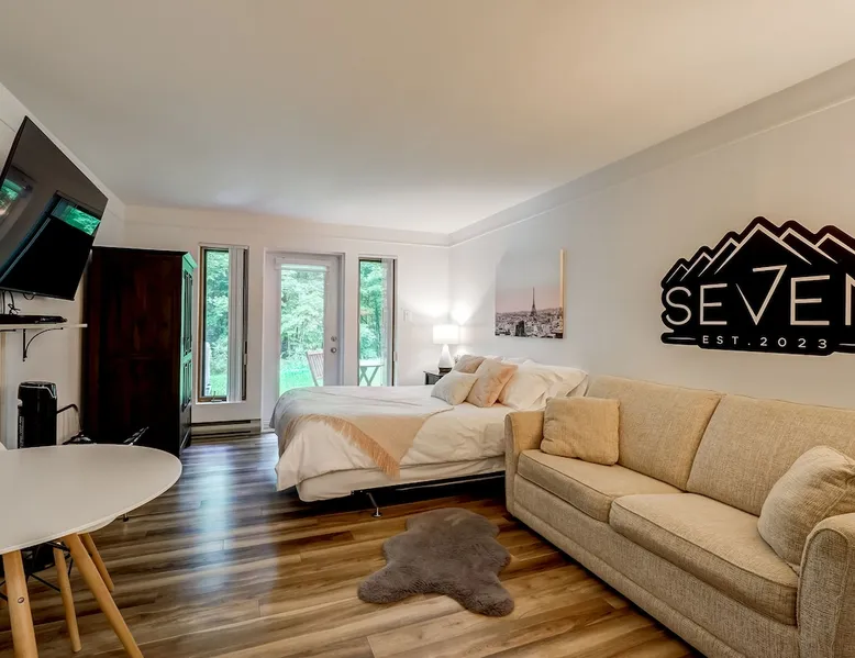Welcome to our little piece of paradise! This beautiful condo with 2 suites is perfectly situated at only 7 minutes from the mountain, 5 minutes from old Mont-Tremblant and 5 minutes from St-Jovite. This condo gives you the tranquility you need from the city and provides easy access to skiing, hiking, mountain biking and so much more. Immerse yourself in comfort and convenience while indulging in the beauty of Mont-Tremblant. The space Le SEVEN offers 2 units for the comfort and space of all First unit includes full kitchen, large dining room, living room with lors of natural lights, full bathroom, one bedroom with 2 queen beds and private patio. Second unit includes partial kitchen, full bathroom, one queen size bed, one sofa bed (double) and of course its own patio. Guest access Le SEVEN rents both units together and the guests have access to the entire area Other things to note Free parking Registration Details Quebec - Registration number 300696, expires: 2026-09-13