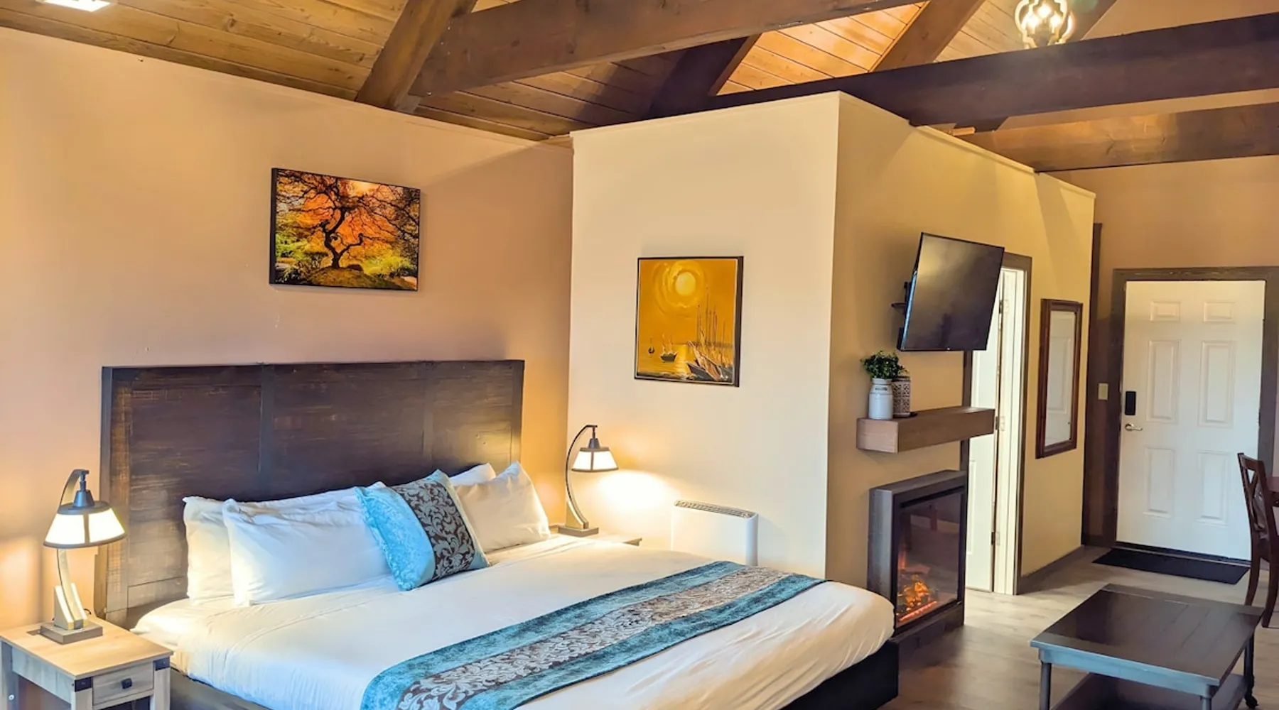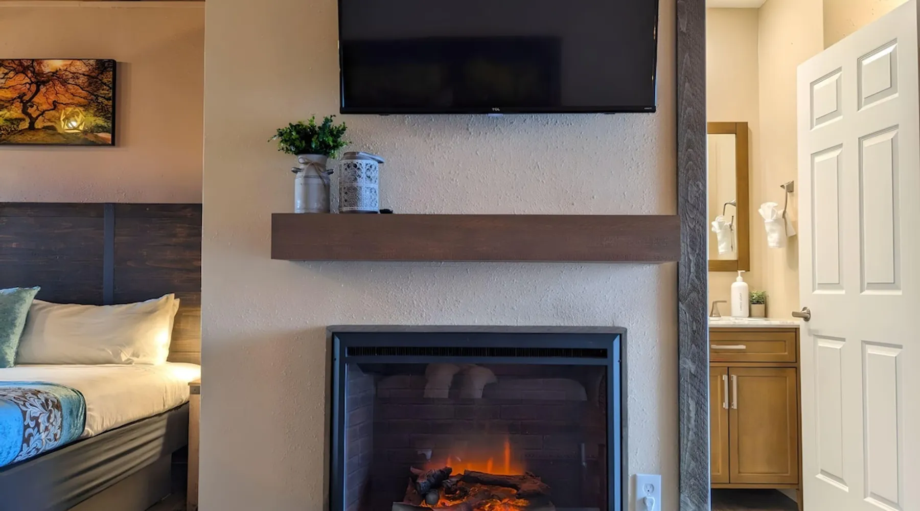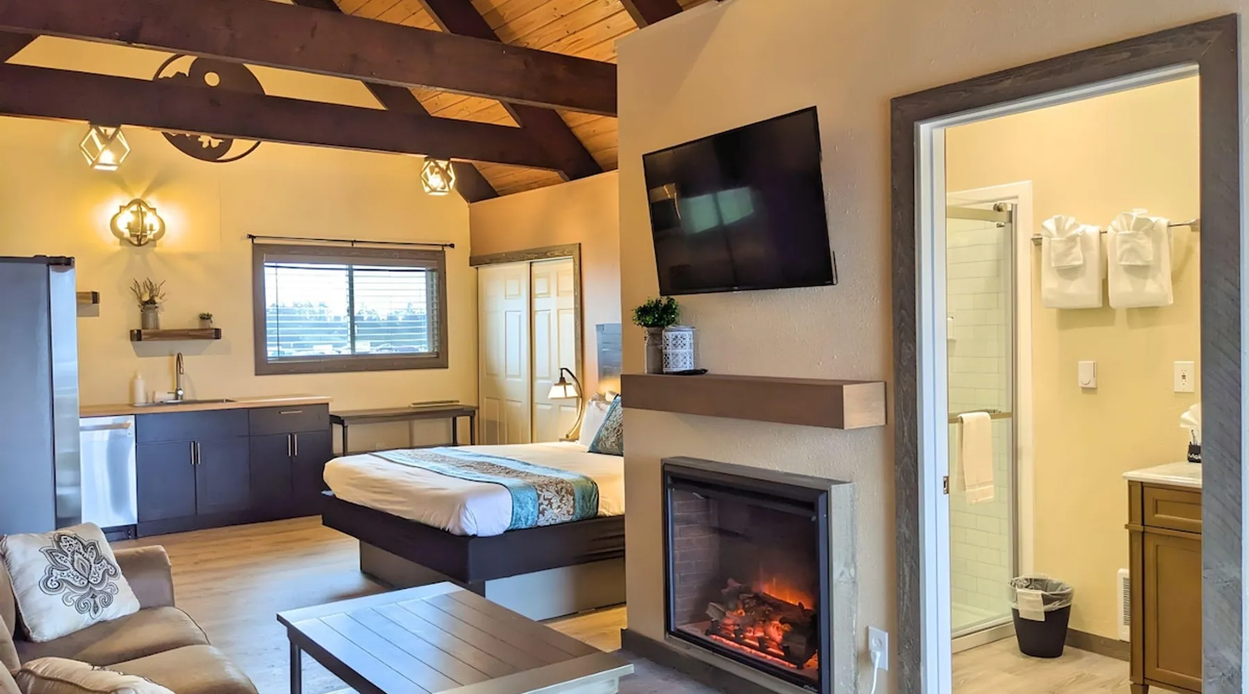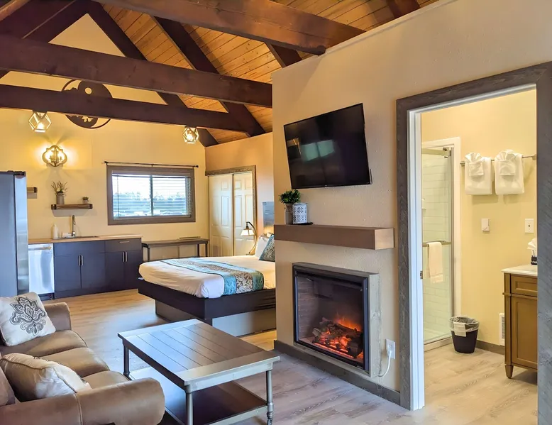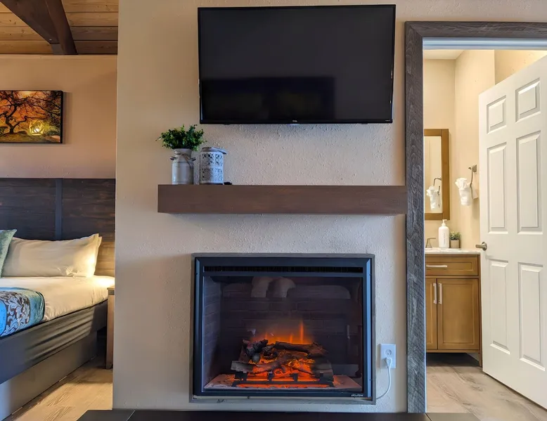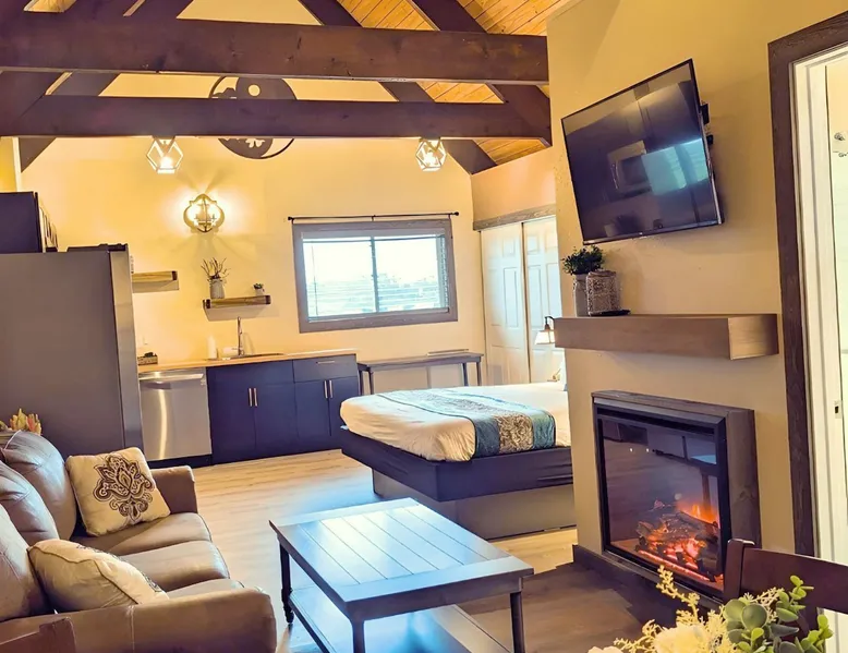 Experience the ultimate in comfort and luxury with our stunning King Studio Suite. Boasting a king-sized bed and a private bathroom, this room is perfect for couples or small families looking for an intimate and inviting retreat. The space As you step inside, you'll be greeted by the inviting ambiance of a warm electric fireplace and the rich elegance of hardwood floors. Vaulted ceilings add a touch of sophistication, while the suite's full kitchen with dishwasher provides all the amenities you need to prepare delicious meals during your stay. With room for up to 4 guests, the suite is the perfect place to relax and unwind after a day exploring the surrounding area. Free WiFi and cable ensure that you stay connected and entertained, while the K-cup coffee maker provided makes sure that you start your morning off right. Room Features: - Studio with a king bed and a private bathroom - Full Kitchen with dishwasher - Up to 4 guests - 2nd Floor - must climb stairs - Vaulted Ceilings - Pets are allowed with a pet fee of $25/pet/night + tax - Free WiFi and Cable, Smart TV - Electric Fireplace - Hardwood Floors - K-cup coffee and condiments provided Guest access Elevate your stay with complimentary access to our guest lounge area, where you'll find everything you need for a comfortable and productive stay: laundry and housekeeping are a breeze with the washer and dryer available for your use there, free of charge. Stay connected and on top of work with ease in our business center, featuring free internet access, a printer, and scanner. Fuel up for your day with a cup of coffee from our coffee station, or take some time to relax with a book from our library. These and other amenities are available to ensure that your stay is both enjoyable and convenient. Other things to note - Stay in the heart of the city at this central location, where convenience and comfort come together. - Enjoy a smoke-free and vape-free environment, ensuring a healthy and clean indoor atmosphere for all guests. - Please observe the quiet hours between 9 PM and 9 AM for a peaceful and restful stay.