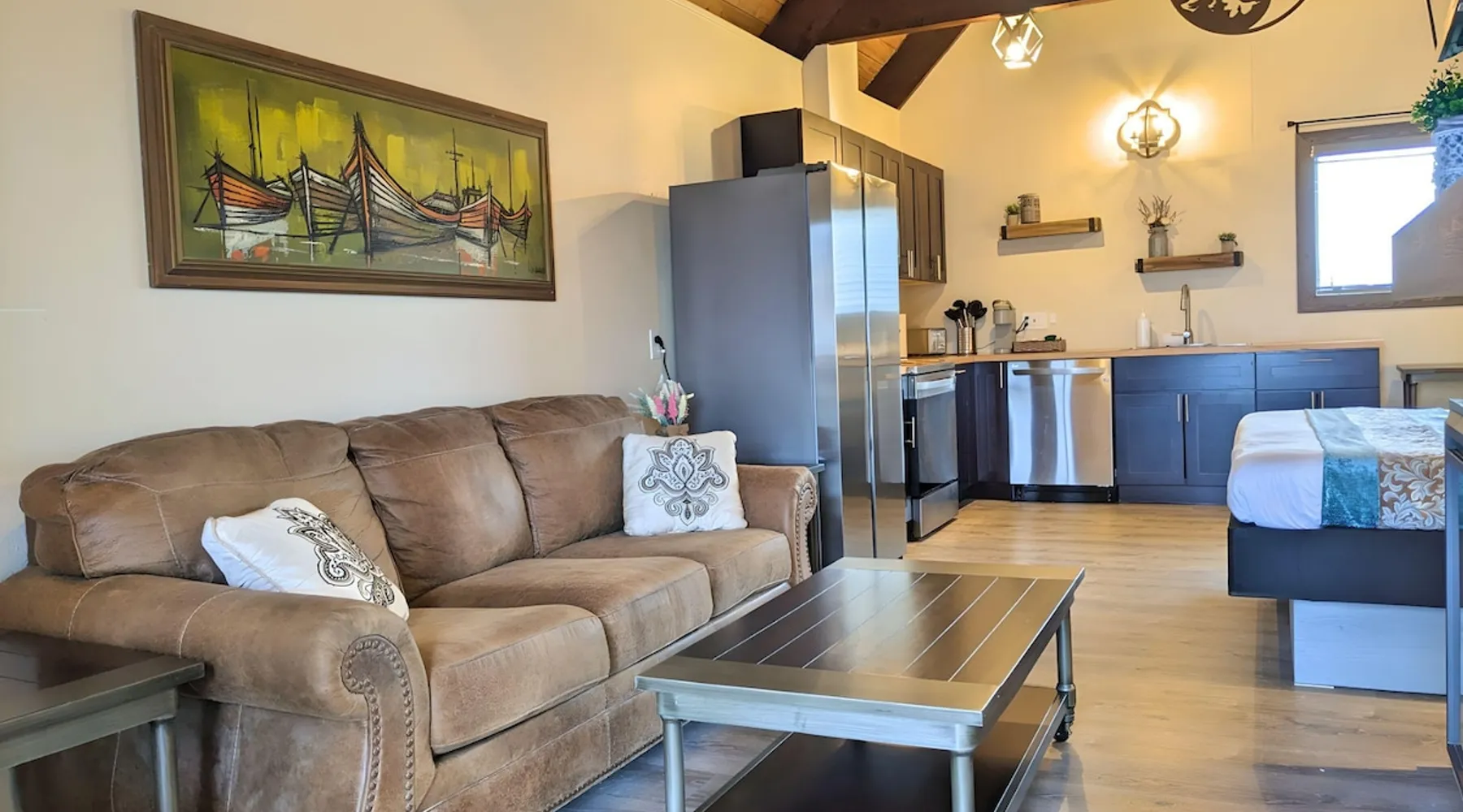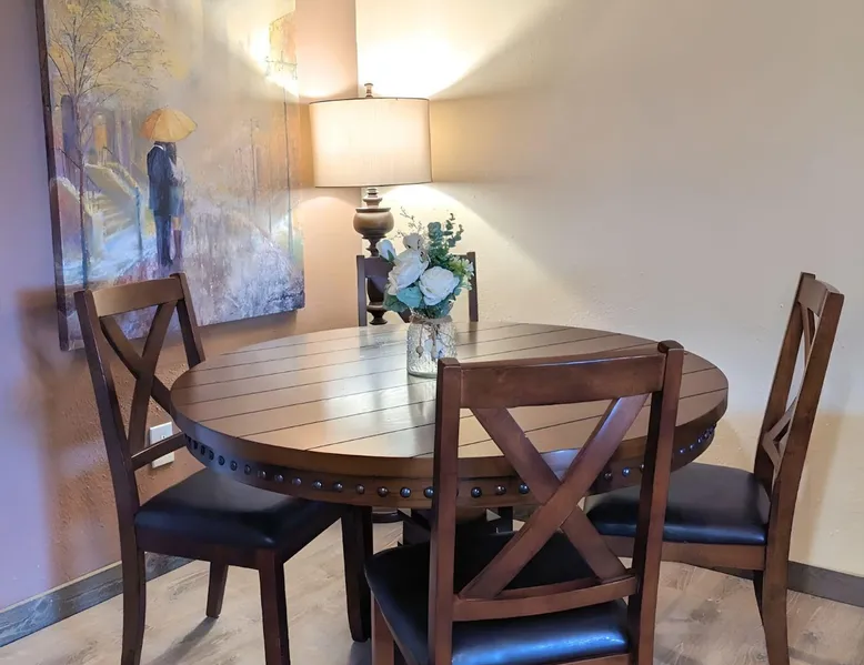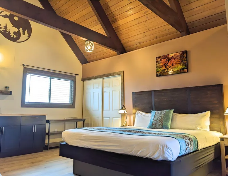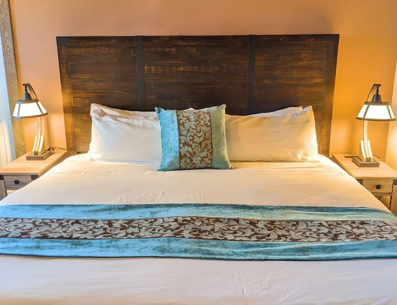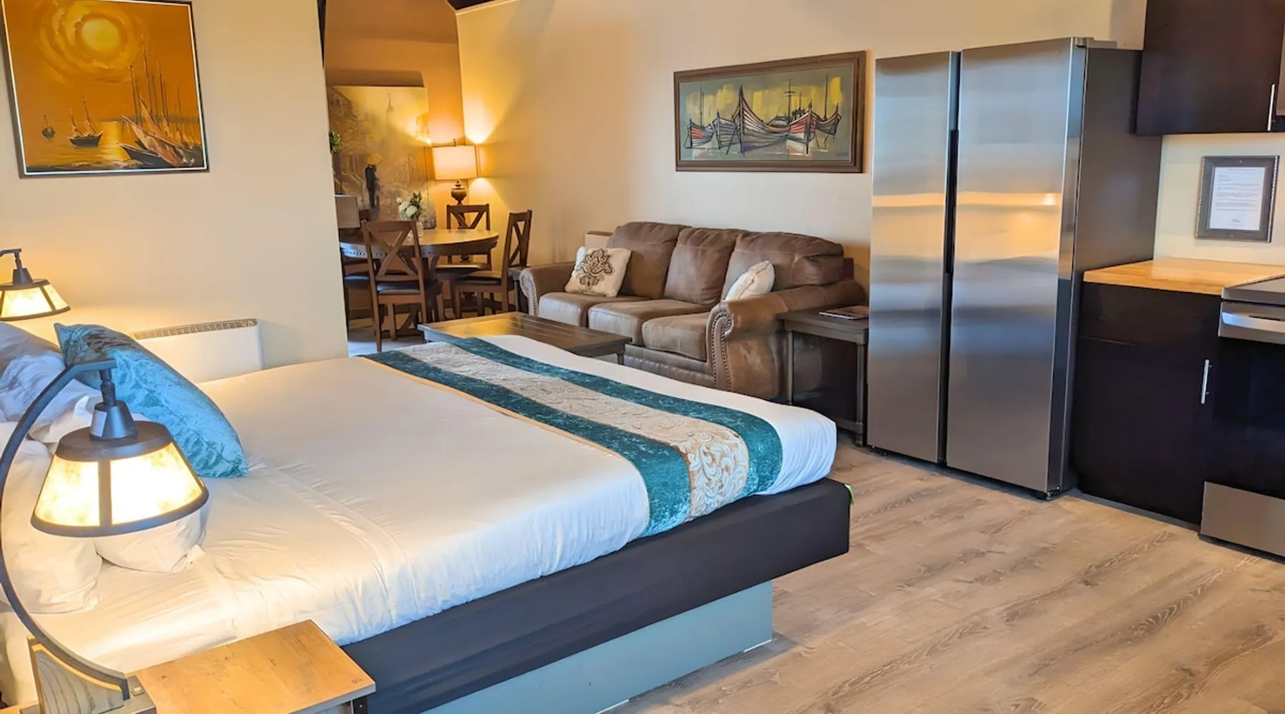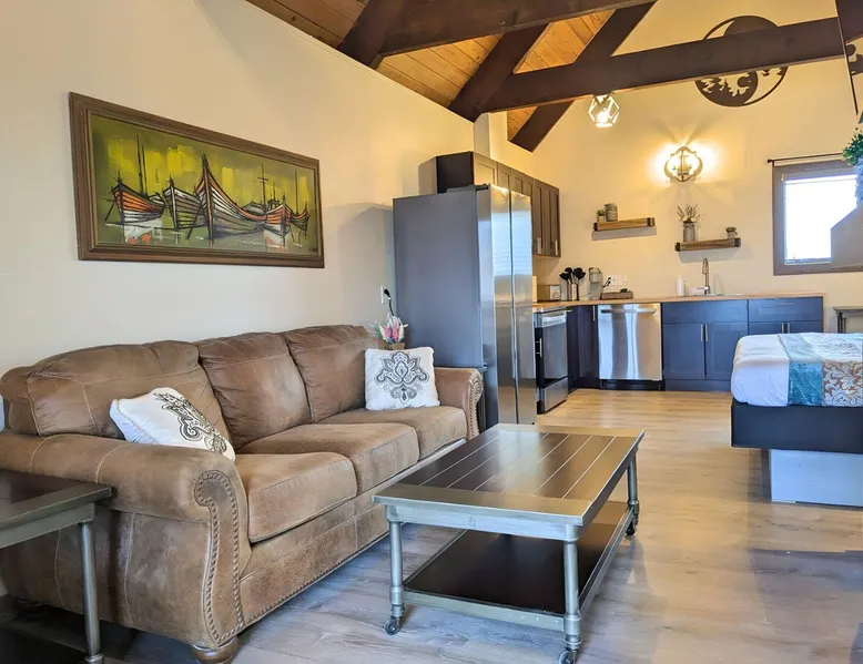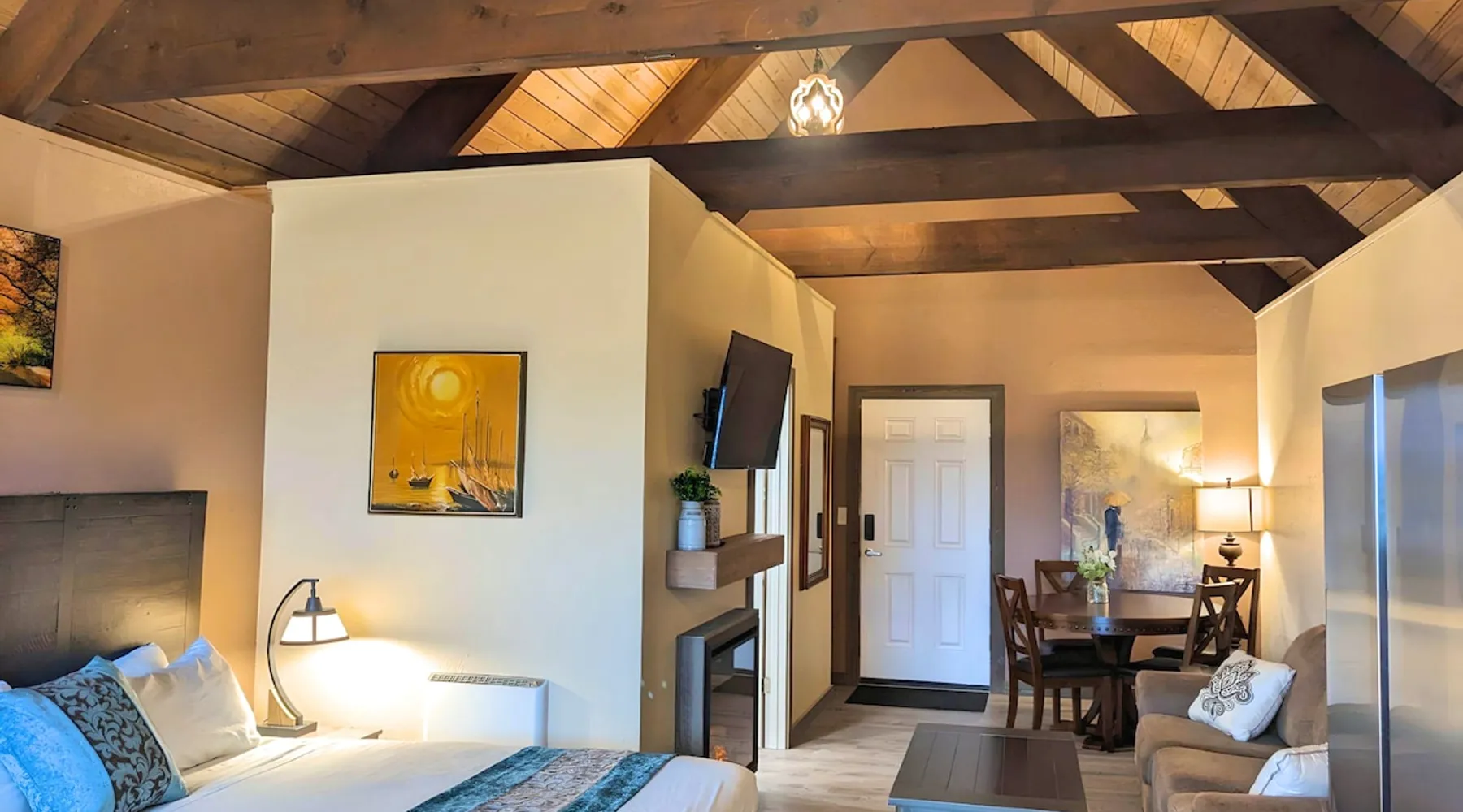 Experience the ultimate in comfort and luxury with our stunning King Studio Suite. Boasting a king-sized bed and a private bathroom, this room is perfect for couples or small families looking for an intimate and inviting retreat. The space As you step inside, you'll be greeted by the inviting ambiance of a warm electric fireplace and the rich elegance of hardwood floors. Vaulted ceilings add a touch of sophistication, while the suite's full kitchen with dishwasher provides all the amenities you need to prepare delicious meals during your stay. With room for up to 4 guests, the suite is the perfect place to relax and unwind after a day exploring the surrounding area. Free WiFi and cable ensure that you stay connected and entertained, while the K-cup coffee maker provided makes sure that you start your morning off right. Room Features: - Studio with a king bed and a private bathroom - Full Kitchen with dishwasher - Up to 4 guests - 2nd Floor - must climb stairs - Vaulted Ceilings - Pets are allowed with a pet fee of $25/pet/night + tax - Free WiFi and Cable, Smart TV - Electric Fireplace - Hardwood Floors - K-cup coffee and condiments provided Guest access Elevate your stay with complimentary access to our guest lounge area, where you'll find everything you need for a comfortable and productive stay: laundry and housekeeping are a breeze with the washer and dryer available for your use there, free of charge. Stay connected and on top of work with ease in our business center, featuring free internet access, a printer, and scanner. Fuel up for your day with a cup of coffee from our coffee station, or take some time to relax with a book from our library. These and other amenities are available to ensure that your stay is both enjoyable and convenient. Other things to note - Stay in the heart of the city at this central location, where convenience and comfort come together. - Enjoy a smoke-free and vape-free environment, ensuring a healthy and clean indoor atmosphere for all guests. - Please observe the quiet hours between 9 PM and 9 AM for a peaceful and restful stay.