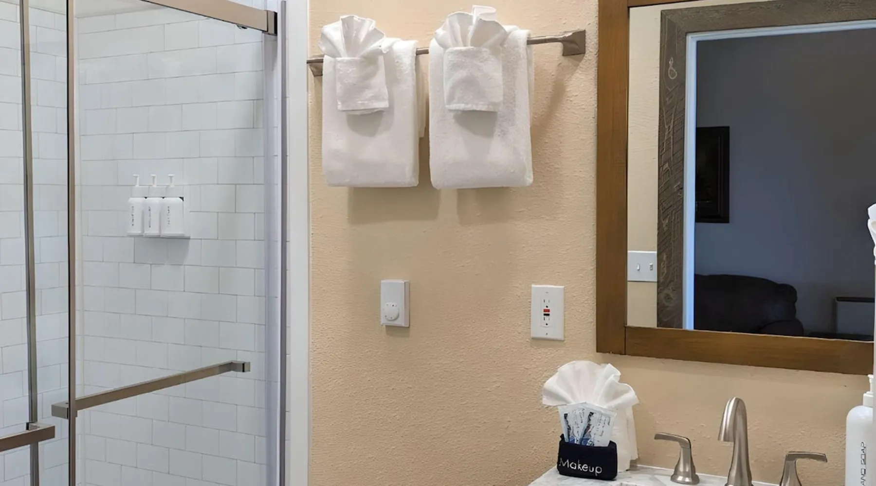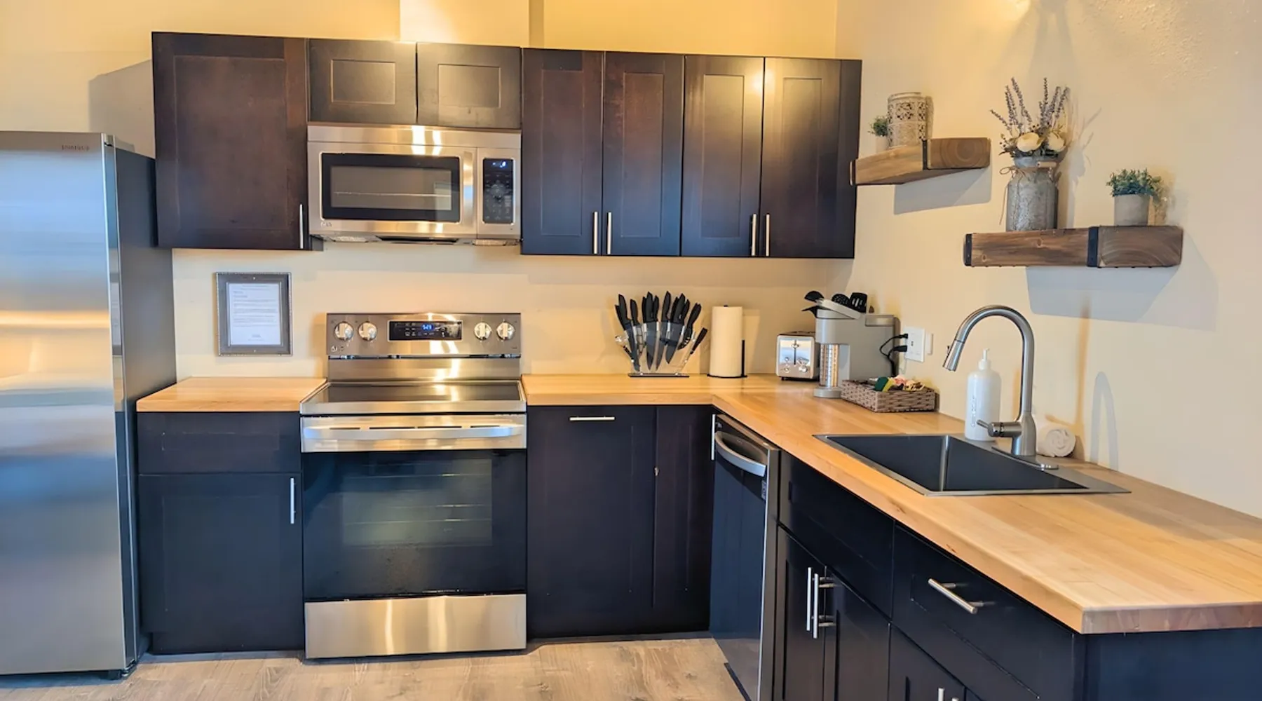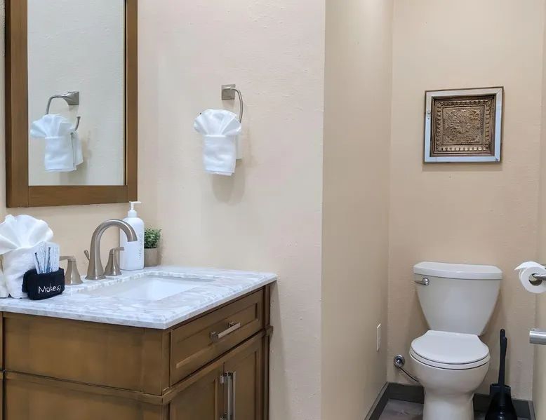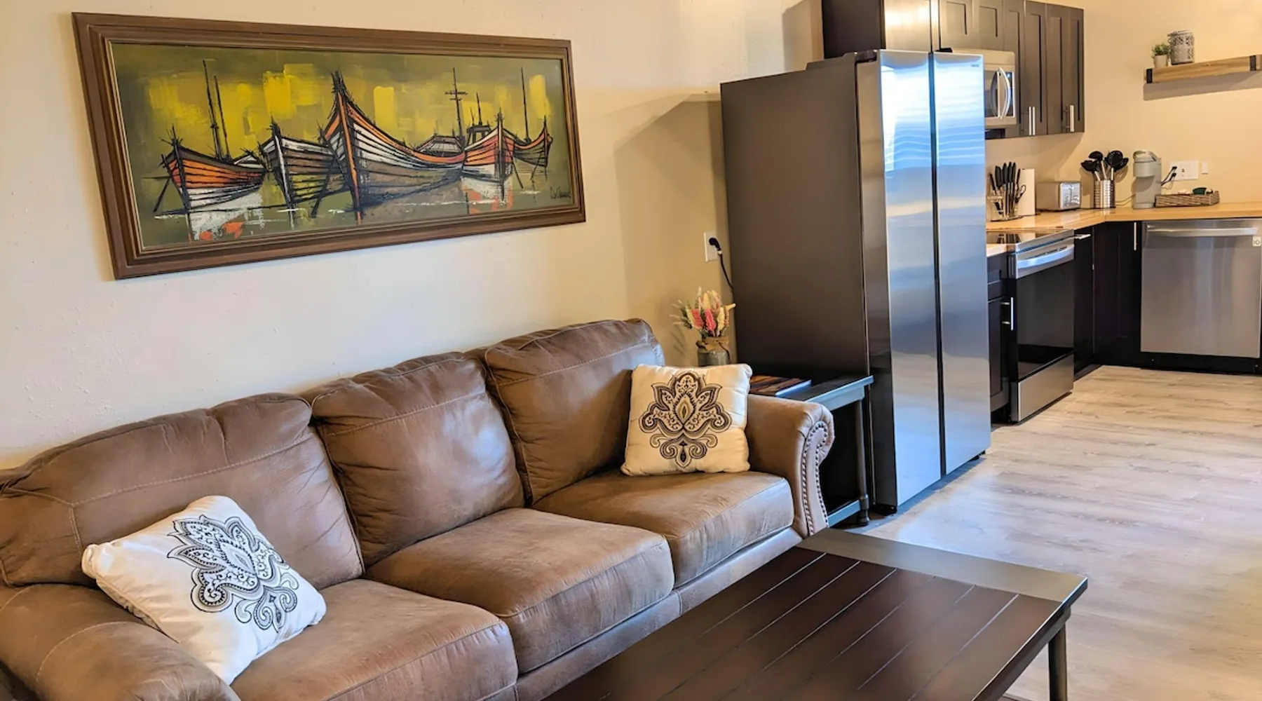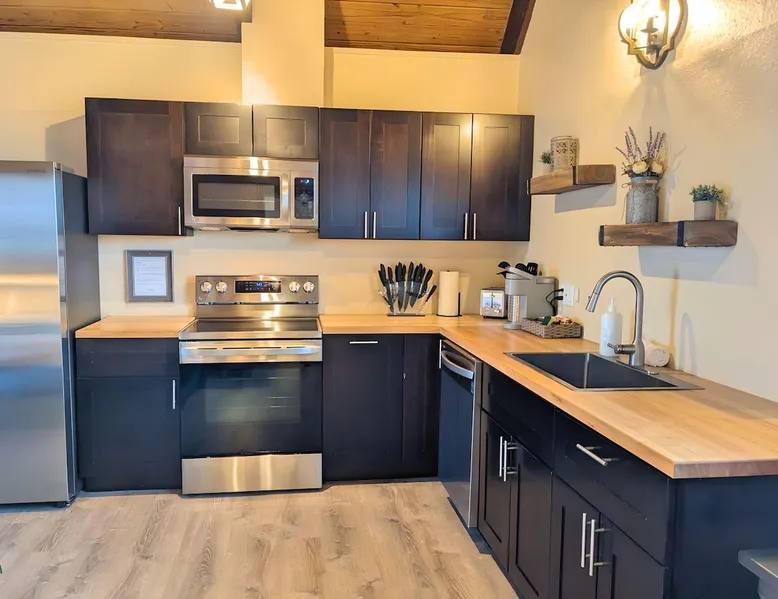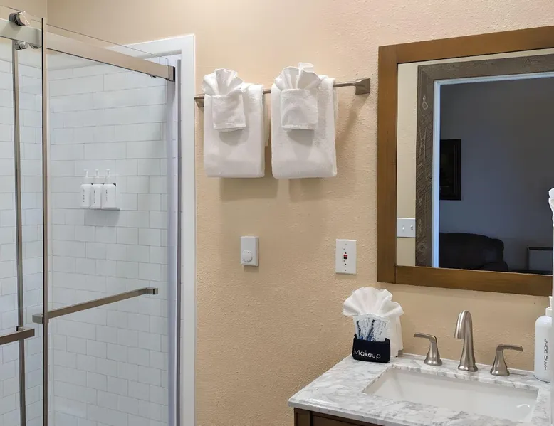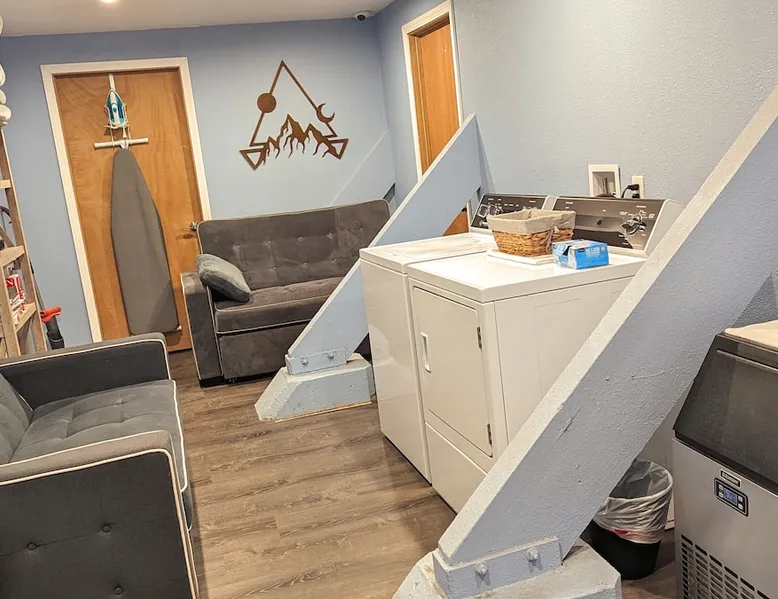 Experience the ultimate in comfort and luxury with our stunning King Studio Suite. Boasting a king-sized bed and a private bathroom, this room is perfect for couples or small families looking for an intimate and inviting retreat. The space As you step inside, you'll be greeted by the inviting ambiance of a warm electric fireplace and the rich elegance of hardwood floors. Vaulted ceilings add a touch of sophistication, while the suite's full kitchen with dishwasher provides all the amenities you need to prepare delicious meals during your stay. With room for up to 4 guests, the suite is the perfect place to relax and unwind after a day exploring the surrounding area. Free WiFi and cable ensure that you stay connected and entertained, while the K-cup coffee maker provided makes sure that you start your morning off right. Room Features: - Studio with a king bed and a private bathroom - Full Kitchen with dishwasher - Up to 4 guests - 2nd Floor - must climb stairs - Vaulted Ceilings - Pets are allowed with a pet fee of $25/pet/night + tax - Free WiFi and Cable, Smart TV - Electric Fireplace - Hardwood Floors - K-cup coffee and condiments provided Guest access Elevate your stay with complimentary access to our guest lounge area, where you'll find everything you need for a comfortable and productive stay: laundry and housekeeping are a breeze with the washer and dryer available for your use there, free of charge. Stay connected and on top of work with ease in our business center, featuring free internet access, a printer, and scanner. Fuel up for your day with a cup of coffee from our coffee station, or take some time to relax with a book from our library. These and other amenities are available to ensure that your stay is both enjoyable and convenient. Other things to note - Stay in the heart of the city at this central location, where convenience and comfort come together. - Enjoy a smoke-free and vape-free environment, ensuring a healthy and clean indoor atmosphere for all guests. - Please observe the quiet hours between 9 PM and 9 AM for a peaceful and restful stay.