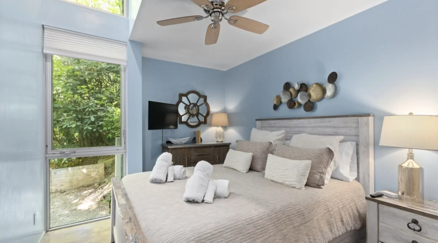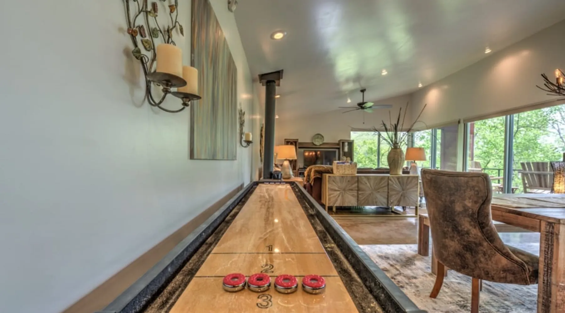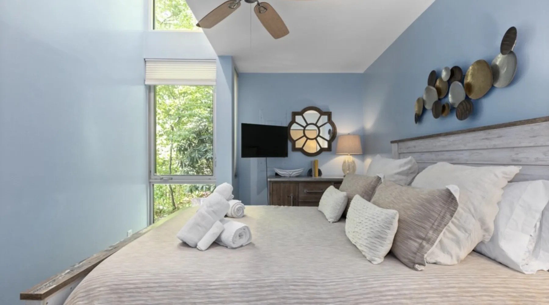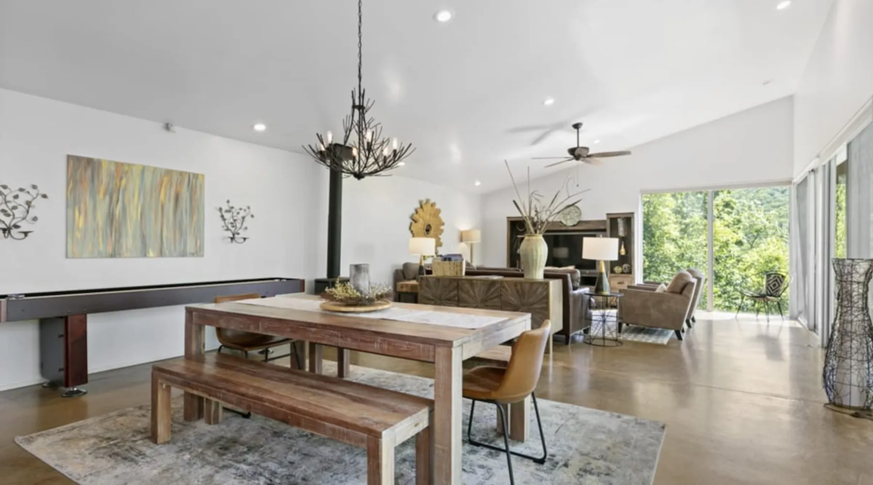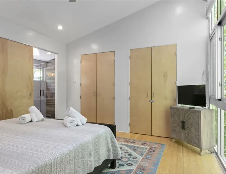 Welcome to Tara's Treehouse, a hidden gem nestled amidst the beauty of nature. This mountain modern house offers a perfect blend of contemporary design and rustic charm, creating a truly enchanting retreat. The modern details of the house are accentuated by tasteful rustic decor touches, creating a warm and inviting atmosphere. This idyllic retreat offers the perfect balance between seclusion and accessibility, as it's just a short 20-minute drive from downtown Asheville, NC. The space As you step inside, you'll be captivated by the stunning wall of windows that flood the space with natural light and offer picturesque views of the surrounding wilderness. The spacious open floor plan including living, dining and kitchen is the perfect space to gather and create memories. The highlight of the house is the wrap-around deck, where you can immerse yourself in the tranquility of the forest, enjoying all that nature has to offer. Whether you're lounging on the deck or sitting by the fire pit, Tara's Treehouse promises a peaceful escape from the hustle and bustle of everyday life. Tara's Treehouse boasts three bedrooms, ensuring ample space for you and your group to relax and unwind. There are plenty of activities onsite including a playground, disc golf and shuffle board. With its pet-friendly policy, you can bring along your furry companions to share in the joy of this magical hideaway. Whether you're seeking outdoor adventures in the nearby mountains or exploring the vibrant city life, Tara's Treehouse serves as an ideal base for your explorations. Escape to this tranquil sanctuary and create lasting memories in the heart of nature's splendor. Whether you're seeking adventure or simply craving a peaceful break from the city's pace, Tara's Treehouse promises an unforgettable experience for all who enter its welcoming embrace. Exclusive Yonder Special: When you book Tara's Treehouse you will receive a special code for discounted tickets to the Biltmore Estate! Click here for more info. Home Truths: - Sleeps in beds: 6 - Max Occupancy: 8 - Sleeper sofa in the living room - Yonder provides linens for all beds; other occupancy will require guests providing their own linens - Internet Speed: Download - 300Mbps - Parking for 2 vehicles - Cleaning fee: Yonder openly shares our Cleaning Fees in a manner of full disclosure, as we think this is the most honest and forthright approach with respect to our guests. Our Cleaning Fees are backed by our Clean Guarantee, which reflects the highest level of standards, pristine environments for our guests, and a level of clean that surpasses any other vacation homes; we literally guarantee it! Quiet Policy: Please note that the property is located in a quiet community. Parties, loud noise and unruly behavior are absolutely prohibited, and guests are expected to respect the neighbors and the peace this mountain retreat area affords. Early Check In and/or Late Check Out may be possible, depending on cleaning schedules and other reservations. If it is possible, there may be an additional fee that would be determined based on the time that you wish to check in or out and the seasonal rates. Pets: This home and property are very dog friendly, and guests are welcome to bring their "best friends" with them. There is a non-refundable Pet Fee of $130 with a limit of 2 dogs per booking party. *If additional pets are approved, additional charges will apply (This is NOT automatically added by VRBO, TripAdvisor or Airbnb, so please let us know so that we can add the fee for you) Please inquire for details regarding payment, the cancellation policy, military discounts, and trip insurance. Note: Reservations over 30 days are subject for review prior to acceptance. A separate rental agreement will be required for 90+ day stays. Last Minute Bookings: Reservations made within 7 days of check-in require additional documentation before confirmation.