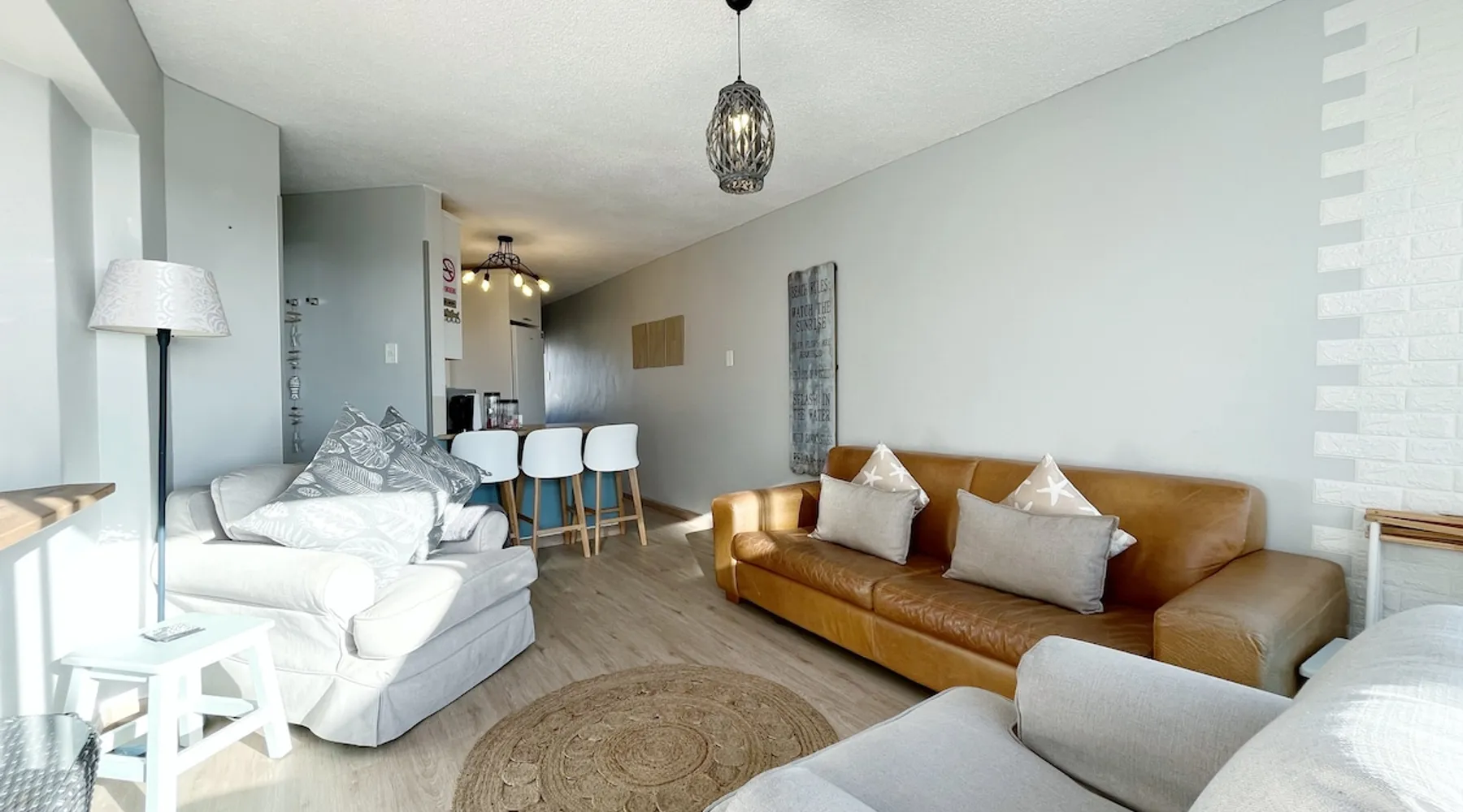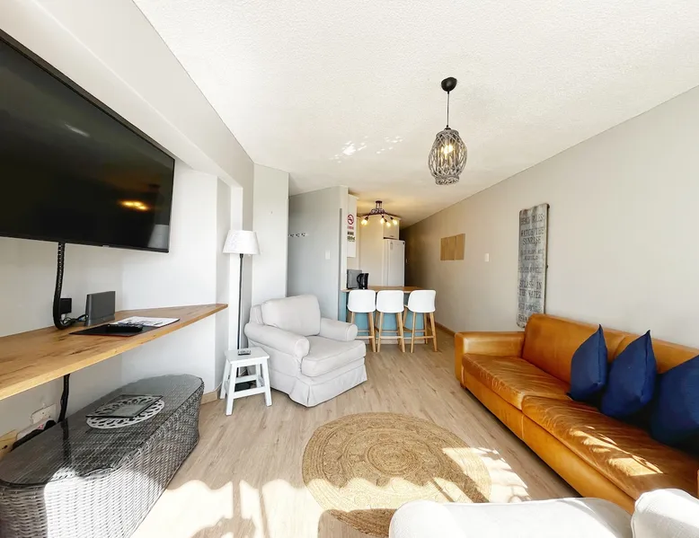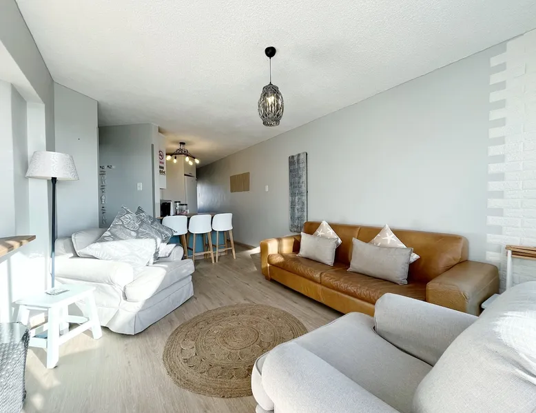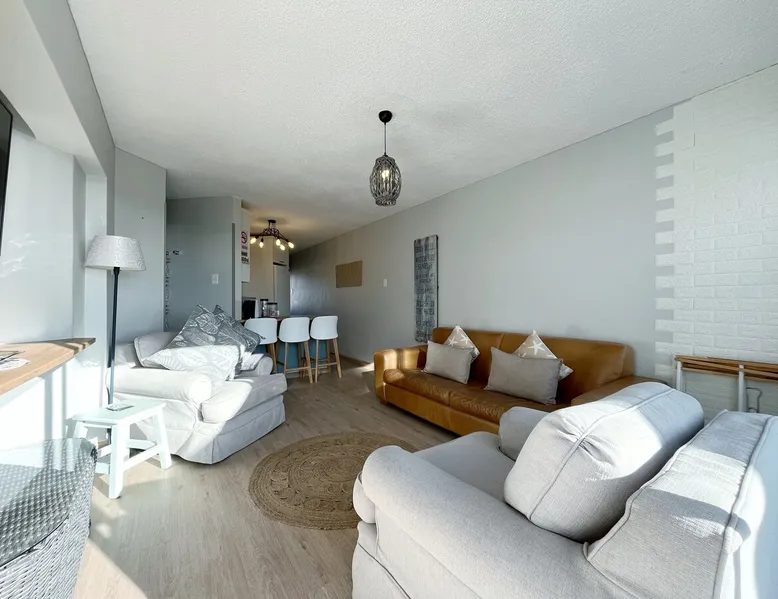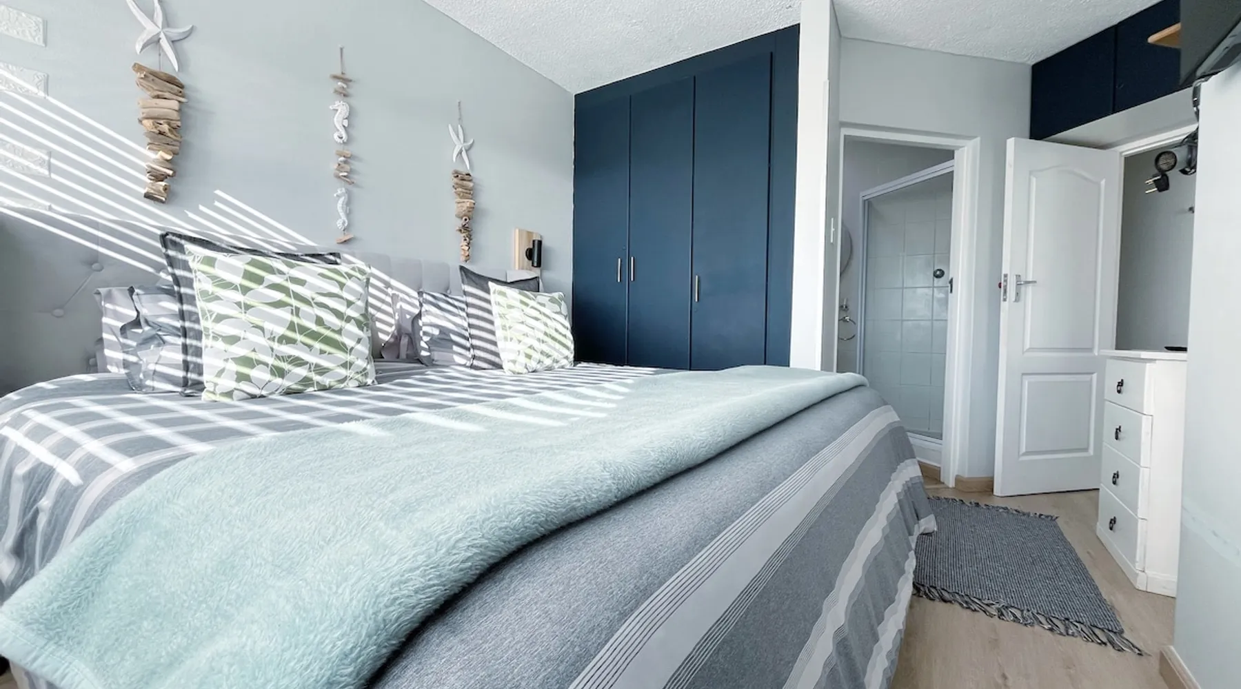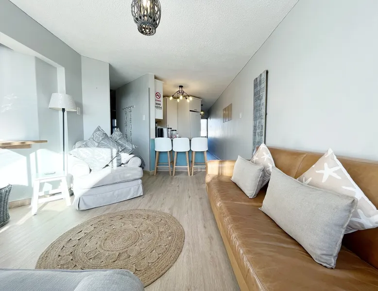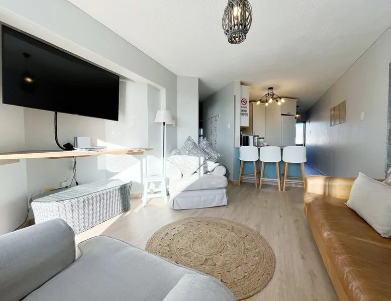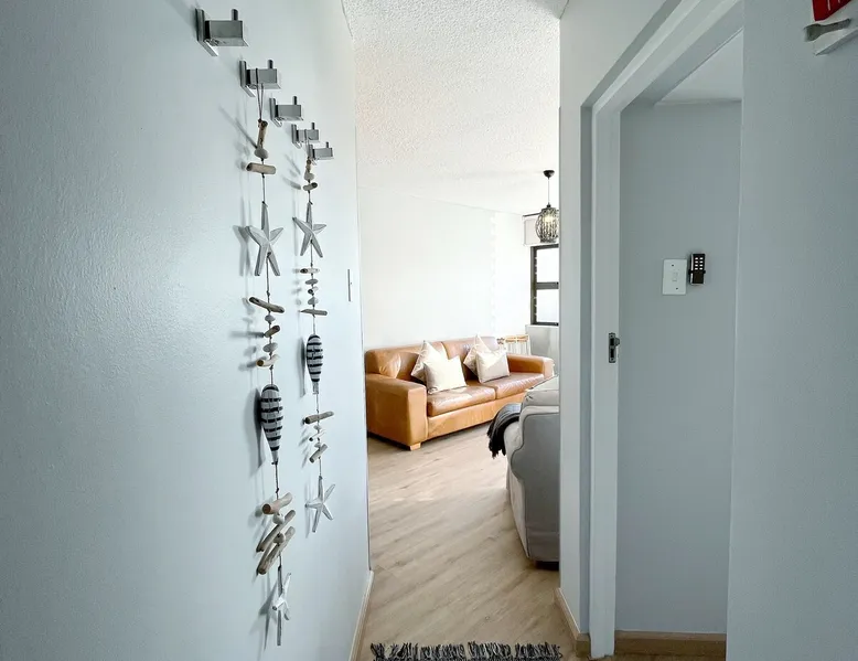 - 3 Bedrooms - 2 Bathrooms - Free Fast Wi-Fi - Partial Sea View - Modern Living - Effortless Entertaining - Large Balcony with outdoor Furniture - Wrber braai (charcoal only) - Smart TV - Secure Parking - Easy beach access - Elevator Available The space This upmarket 3 bedroom apartment is located in the De Valle beachfront complex. The modernly furnished unit, decorated with bold pastel colors and touches of coastal elegance boasts with a partial sea view and features 2 bathrooms. Other facilities include a large patio with outdoor seating and gas braai facilities, Smart TV, Free Wi-Fi and fully equipped kitchen. This unit will give you a true luxury beach getaway experience. Guest access Access to the communal pool and conmunal braai facilities. It is a residential complex, thus limited outdoor facilities Other things to note Housekeeping is not included during your stay. But available upon request after 5 days at an additional charge. Amenities are not replenished, but have been provided for the first night only. We are not serviced accommodation Loadshedding (National Power cuts) may be implemented during your stay without prior notice, as part of South Africa's ongoing electricity crisis. This is a National problem and out of our control. a Power station has been provided in the unit to keep the television and Wi-Fi running and emergency lights are provided.