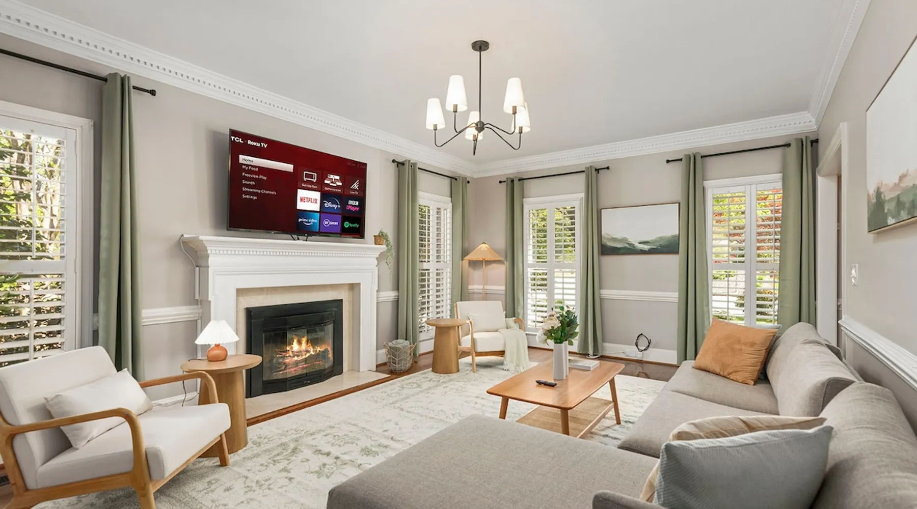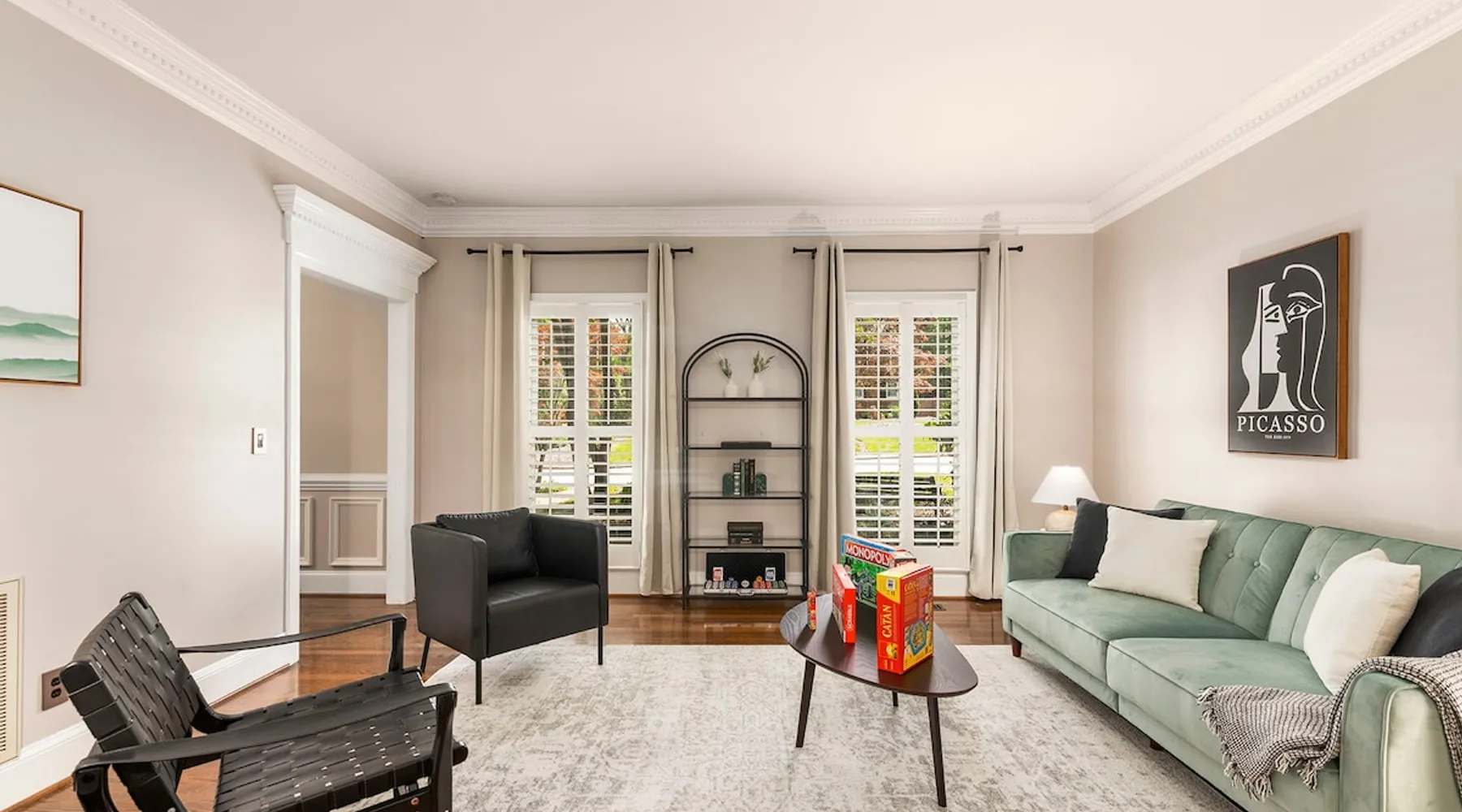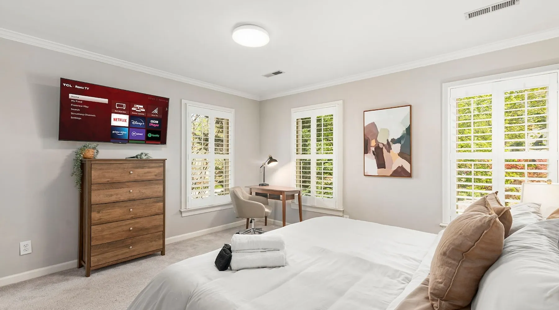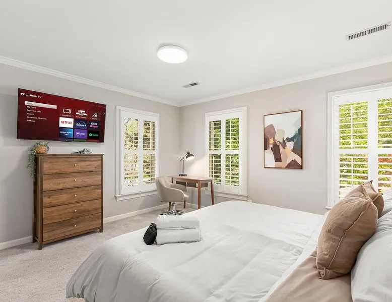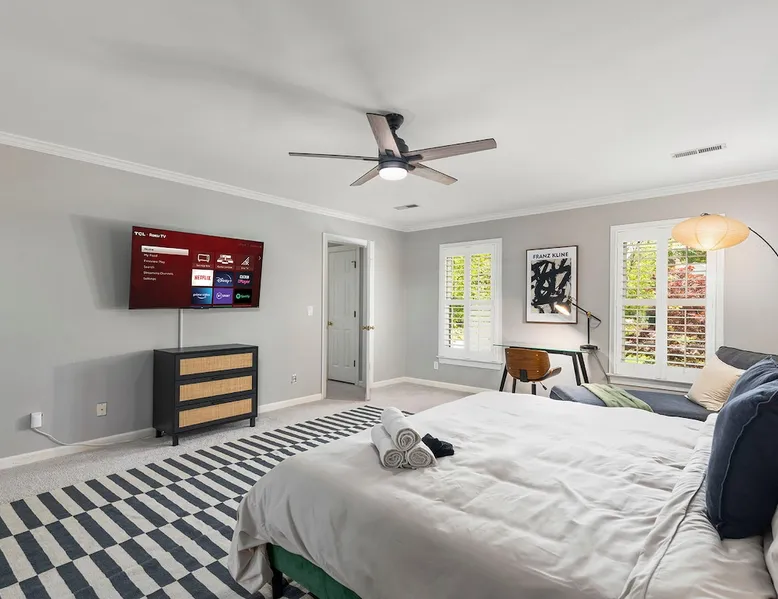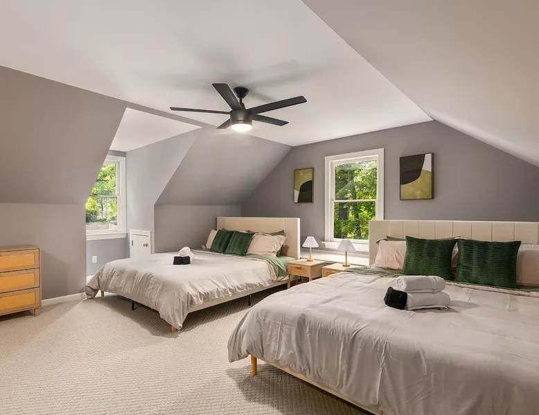 Whether you're in town for a sporting event trade show or a family getaway this spacious and amenity-packed home is your perfect base. With 6 well-appointed bedrooms 12 beds 1 crib and a sprawling outdoor area featuring a basketball court and hot tub your group is sure to create unforgettable memories. n n5 Min to Greensboro Coliseum Complex 15 Min to PGA Sedgefield Country Club Golf 15 Min to Downtown Greensboro 28 Min to High Point ◈Experience Greensboro With Us & Learn More Below!◈VcUBs The space **NO PARTIES, GATHERINGS, OR EVENTS** ☆☆ PLEASE READ HOUSE RULES BEFORE BOOKING IN THE HOUSE RULES SECTION (NOT HERE)☆☆ KEY FEATURES: ☀ Kid-friendly space (Crib & High Chair available) ☀ 6 large bedrooms; 4 kings, 2 doubles, 6 twins, and a crib ☀ 3 full bathrooms + 1 half bath ☀ Fully-equipped kitchen w/ stainless steel appliances ☀ Two open-concept living areas filled with natural light ☀ Private backyard w/ basketball court, hot tub, fire pit, and screened-in patio ☀ Game room with ping pong and pool table ☀ Yoga room for your morning or evening routines ☀ High-speed WiFi + Smart TV ☀ Located in a peaceful neighborhood, a short drive from top attractions Here Are A Few Kind Words From Our Past Guests: "What a charming home and neighborhood with a fantastic host! This stay was wonderful, we really felt right at home and we WILL book again" - Diana "My family and I greatly enjoyed our stay. It accommodated our entire party and served the purpose of what we needed. We cannot thank Blake enough for his hospitality. Thanks Blake!" - Mfoniso & Mary "This home was beautiful! The beds were comfortable, linens were clean, couches comfortable and very nice wall art. " - Heidi ☆☆ BEDROOMS + BATHROOMS ☆☆ Large groups will have plenty of space to spread out between the six spacious bedrooms, all located on the second and third floors. The primary bedroom features a king-sized bed, a large walk-in closet, and an ensuite bathroom, complete with dual sinks, a walk-in shower, and essential toiletries. The other bedrooms are outfitted with a mix of king, double, and twin beds, accommodating a variety of group configurations. These bedrooms share two full bathrooms, each equipped with a shower/tub combo and essential toiletries. There is an additional half bathroom located on the first floor. ☆☆ KITCHEN & LOUNGE ☆☆ The kitchen is a chef’s dream, with ample counter space, a large island, and sleek countertops. You’ll find all the cooking essentials here, including stainless steel appliances, a blender, a spice rack, and more. There’s even a coffee station to kickstart your morning, complete with a Keurig, coffee pods, dry creamer, and branded Greensboro coffee mugs. The kitchen opens up to two cozy living rooms, each equipped with a large flat-screen Smart TV, comfy sofas, and plenty of natural light. Living room indoor fireplace is not available for use, but outdoor fire pit is available! ☆☆ GAME ROOM & YOGA ROOM ☆☆ Our game room is a fun-filled space where you can challenge your friends to a game of pool or ping pong. For those seeking tranquility, the yoga room provides a serene space for your daily practice. ☆☆ OUTDOOR AREA ☆☆ The expansive outdoor area is the highlight of the home. This space features a private basketball court, a hot tub, and a fire pit. There’s also a screened-in patio, a grill, adirondacks, and plenty of seating areas in both shaded and sunny spots. ★☆ Book Today & Let Us Take Care Of You In Greensboro! ☆★ **NO PARTIES, GATHERINGS, OR EVENTS** ☆☆ PLEASE READ HOUSE RULES BEFORE BOOKING IN THE HOUSE RULES SECTION (NOT HERE)☆☆ Other things to note **NO PARTIES, GATHERINGS, OR EVENTS** ☆☆ PLEASE READ HOUSE RULES BEFORE BOOKING IN THE HOUSE RULES SECTION (NOT HERE)☆☆ Our home is equipped with two Ring cameras (outside only) and smart locks for your peace of mind and security during your stay. Each pet must be added your reservation request when booking and a fee of $150 must be submitted with your reservation prior to booking. We look forward to hosting you in this beautiful Greensboro home! **NO PARTIES, GATHERINGS, OR EVENTS** ☆☆ PLEASE READ HOUSE RULES BEFORE BOOKING IN THE HOUSE RULES SECTION (NOT HERE)☆☆