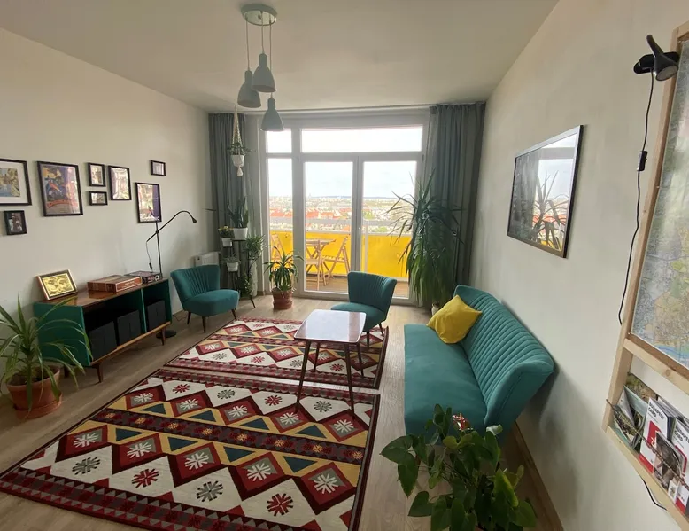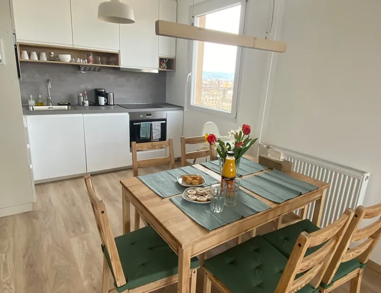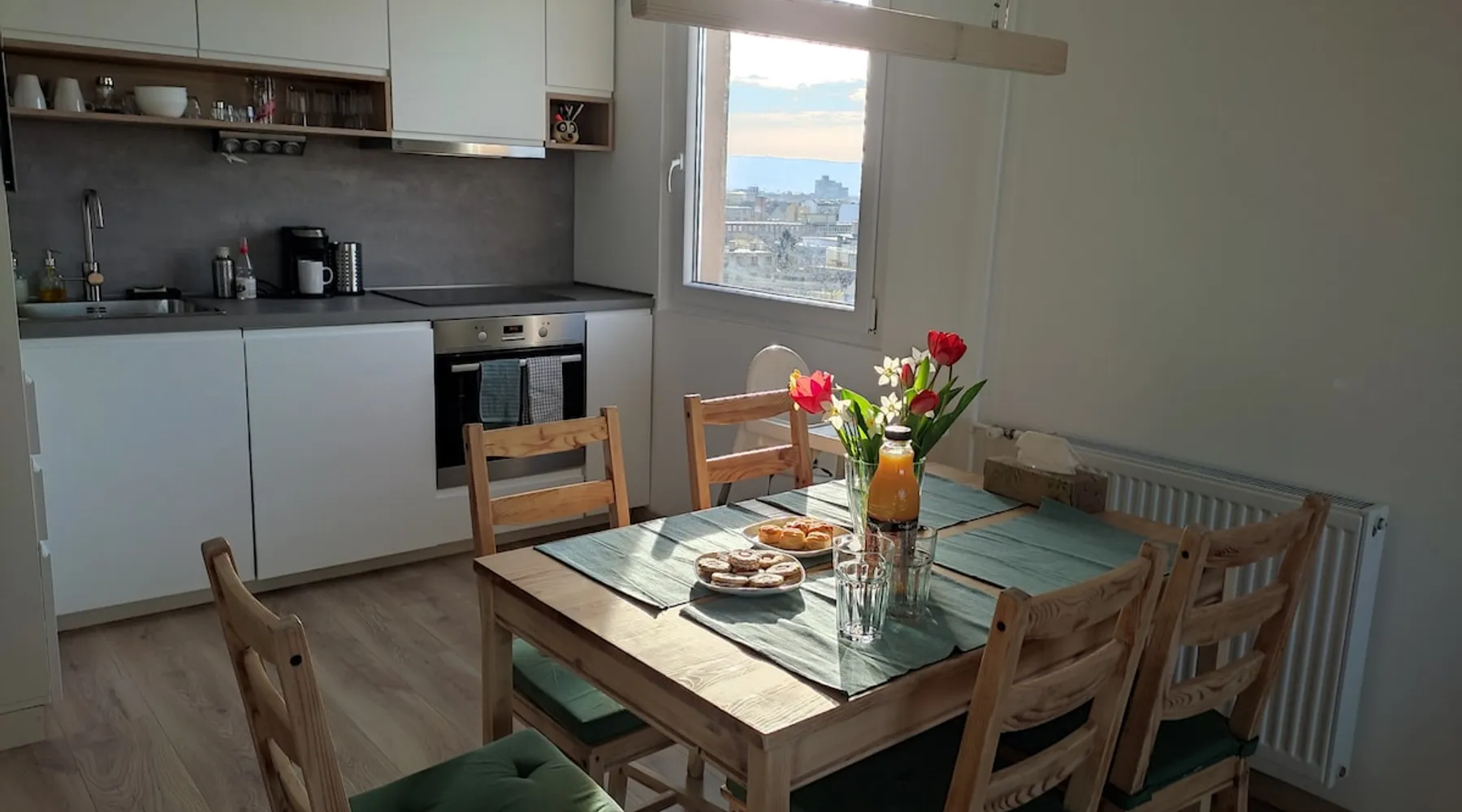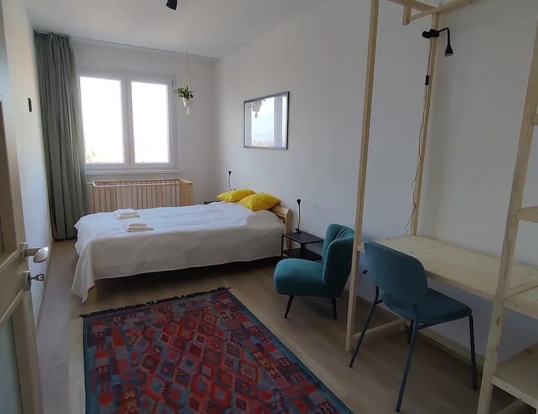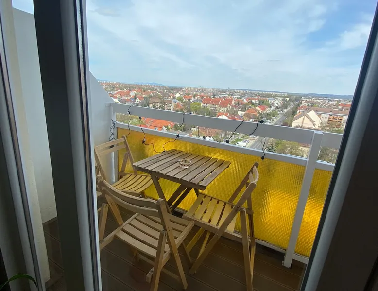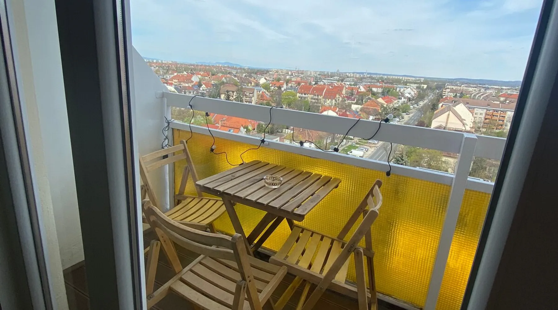 Family-friendly, fully equipped, newly renovated, sunny apartment is located in a green neighborhood. The apartment is on the 9th floor with a balcony, it offers a spectalular view over the city, and a great interior with modern and stylish decor. The location in the free parking area makes it ideal for those traveling by car. It is not far from Széchenyi Bath, Heroes' Square, City Garden, Paskál Thermal Bath and Puskás Stadion. The apartment can accommodate 4+2 people + child in a crib. The space The central space of the apartment is offered by the large living room with American kitchen and dining room. Here we have created a space for conversation, relaxation and planning destinations. The apartment has two separate bedrooms with 2-2 double beds (one double, one fold-out on request). The available baby cot can be placed in one of the rooms or in the living room. There are also 2 fold-out guest beds available, which can be set up mainly in the living room. At the end of the hallway is the bathroom with compact shower and access to the washing machine and fridge. Guest access The entire apartment is at the guests' use, except for the lockable small service room next to the front door. Extra linen and towels in the laundry room are available by prior arrangement only. Other things to note For guests with small children, cots, changing facilities, baby bath, toys are available - please let us know in advance! Registration details MA23059334