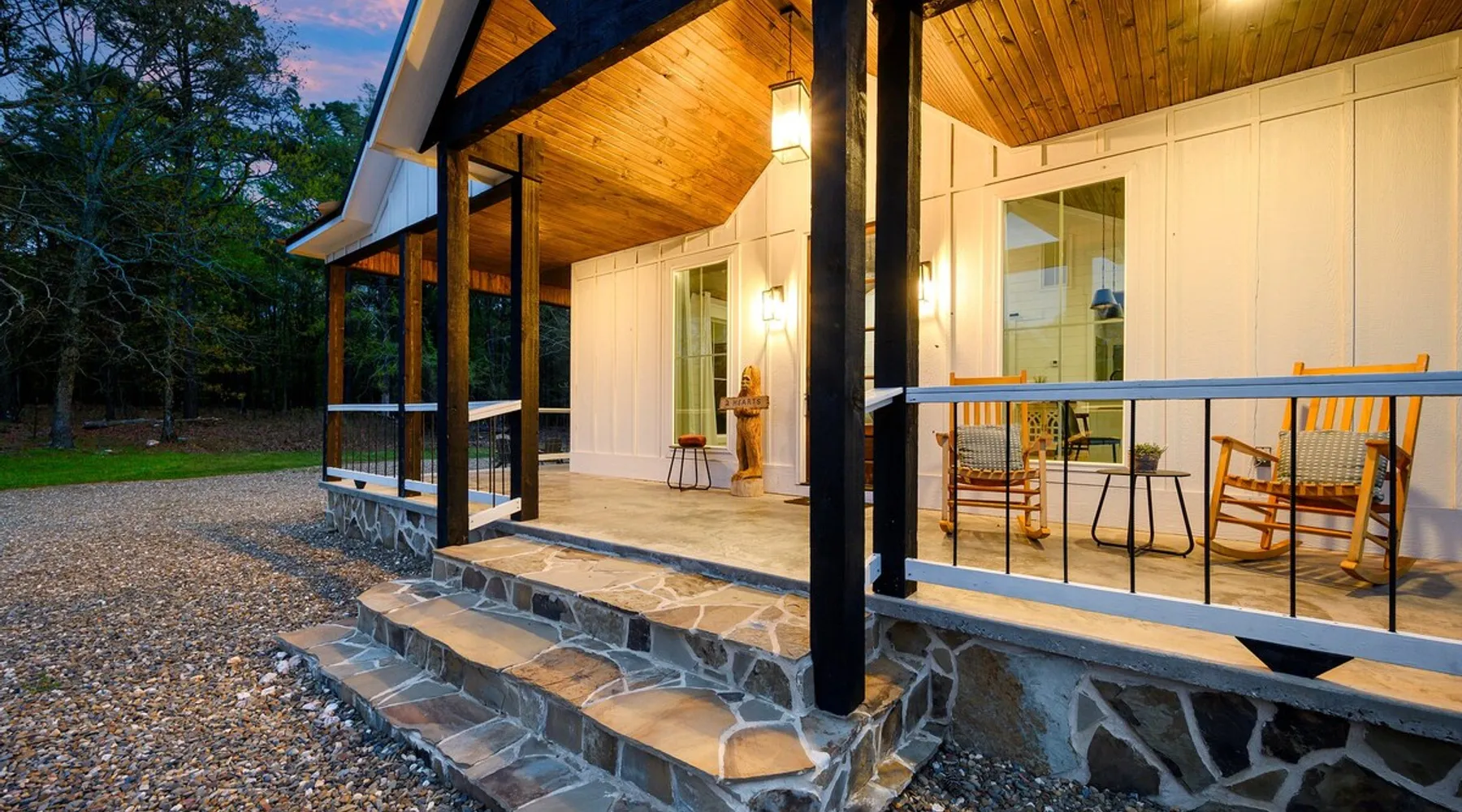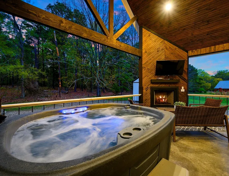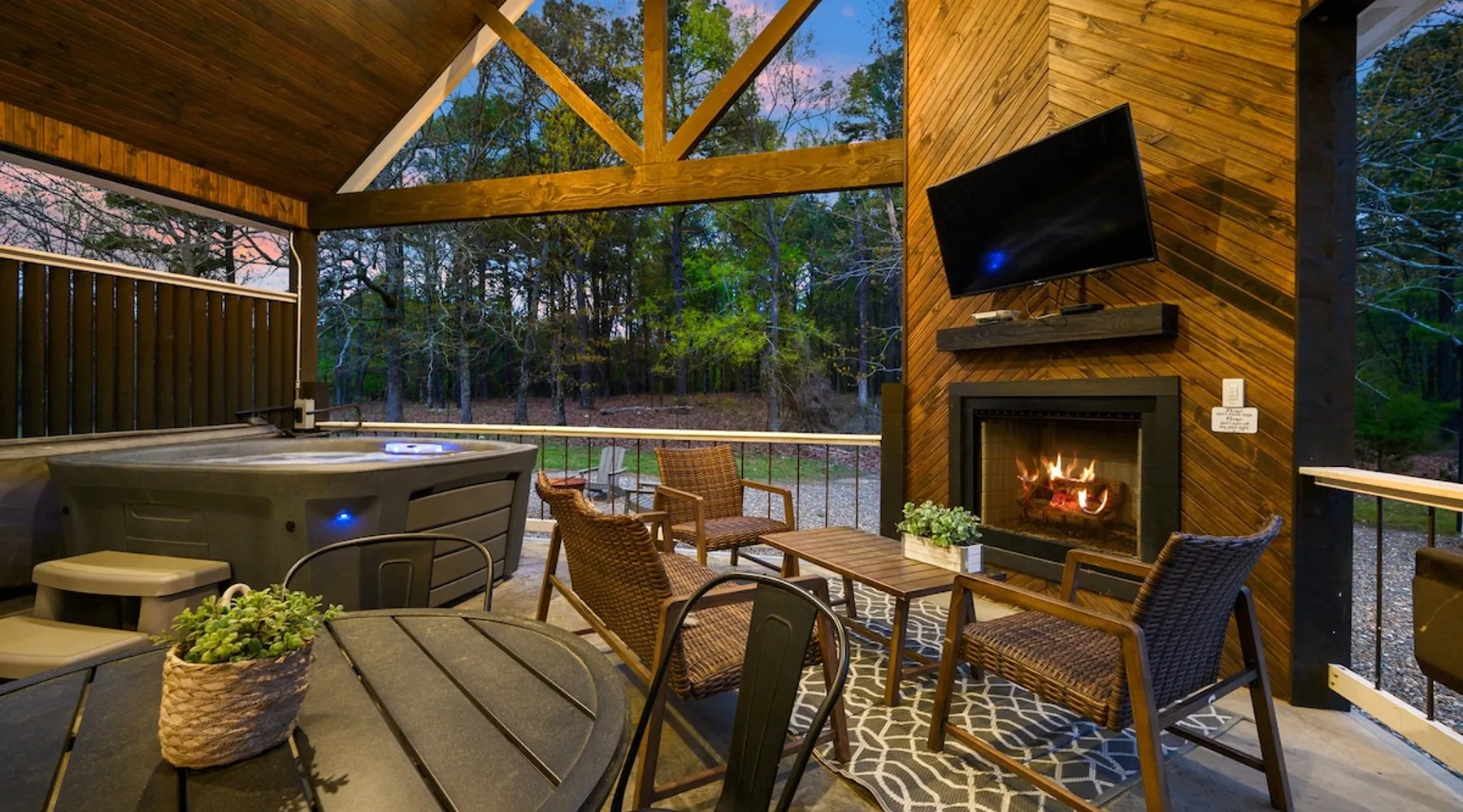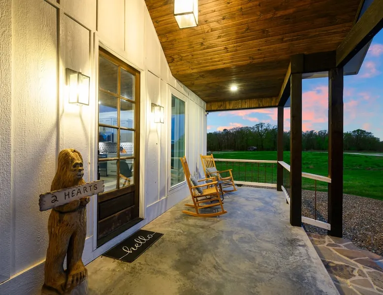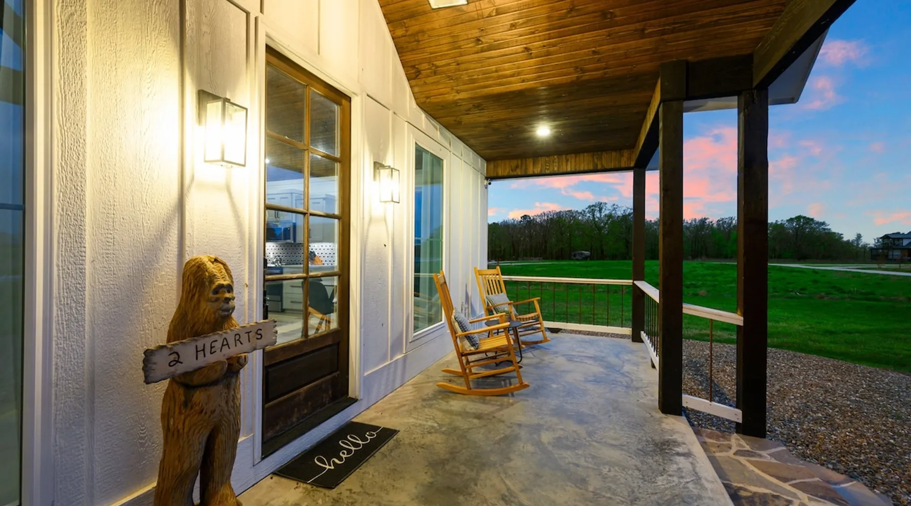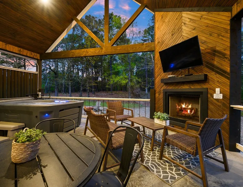 🏡 Welcome to 2 Hearts Cabin Experience a modern getaway with a charming farmhouse feel at 2 Hearts Cabin in Broken Bow. The cabin offers a range of amenities to ensure a relaxing stay, including a hot tub, a gas grill, disc golf, fireplaces both inside and out, a luxurious bathroom, and a furnished back deck where you can unwind and enjoy the peaceful surroundings. The space 🛋️ Living Room Relax in a spacious and inviting living area featuring: Large sleeper sofa Two comfortable chairs + two poufs Bench seating behind the couch Gas fireplace Big-screen HDTV for movie nights 🍽️ Kitchen & Dining Fully stocked for all your cooking needs: Dining table with seating for 4 Kitchen island with seating for 2 Coffee pot & K-Cup machine Kettle, toaster, blender Dishes, cookware, bakeware, grilling tools 🛏️ Bedrooms & Sleeping Arrangements Master Suite King-size bed Nightstands & bench Closet with hangers Direct access to patio Big-screen TV Ensuite bathroom with: Soaker tub Oversized walk-in shower with rainfall showerhead Private toilet Bunk Nook Twin-over-twin bunk bed is located just off the kitchen Ideal for kids or extra guests Adjacent to a half bath 🌳 Outdoor Features Enjoy the great outdoors without leaving home: Disc golf Furnished back deck with seating for 4 Outdoor gas fireplace & big-screen TV Hot tub Gas grill (hard-lined to the main tank of the property) Fire pit with seating for 4 Front porch rocking chairs. 🐾 Pet Friendly Up to 2 dogs under 50 lbs. each $125 per pet fee applies. 📌 General Information Full-size washer & dryer Seasonal fireplaces: Available Oct–May 15 Surveillance: Exterior cameras face entrances only, monitored at check-in for occupancy compliance Free Wi-Fi Max occupancy: 6 guests – NO EXCEPTIONS Guest access Entire Cabin Other things to note It is located near all the best restaurants, activities, and park amenities. It is just a short drive to Broken Bow Lake, Beavers Bend State Park, popular hiking trails, restaurants, breweries, wineries, and downtown Hochatown, and access to all the outdoors activities you want – boating, hiking, fly-fishing, kayaking, zip-lining, ATV trails, horseback riding, Cedar Creek Golf Course, Choctaw Landing Casino, mini-golf, helicopter rides, mining for gold, train rides, go-carts, and a great petting zoo. Don’t forget these items when you come to visit: • Rain gear and light jackets (Our average rainfall is 55″-60″ each year). • We have beautiful scenic trails; good hiking boots are a must. • Water shoes for our vast shorelines and streams. • Insect repellent, sunblock, and other first-aid supplies. • Coffee and filters – enjoy this while sitting on the deck in the early morning. • Condiments - A starter supply of coffee/filters, paper towels, toilet paper, bath soap, dish soap, dishwasher tablets, trash bags, and laundry soap is provided. Still, guests may need to bring additional supplies. For your convenience, we can help you arrange: • Special requests (i.e., flowers, wine, etc.) • In-cabin chef recommendations • In-cabin massages recommendations If we are missing something or you have a question we haven't answered, please feel free to reach out to us directly at Bravo Cabin Rentals and we will personally respond as soon as possible. We look forward to making your next vacation in Broken Bow/Hochatown one you won’t forget!