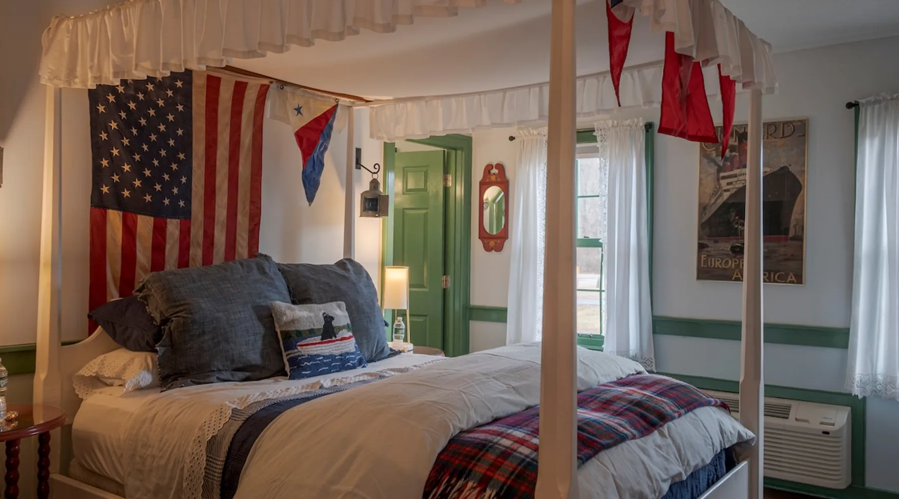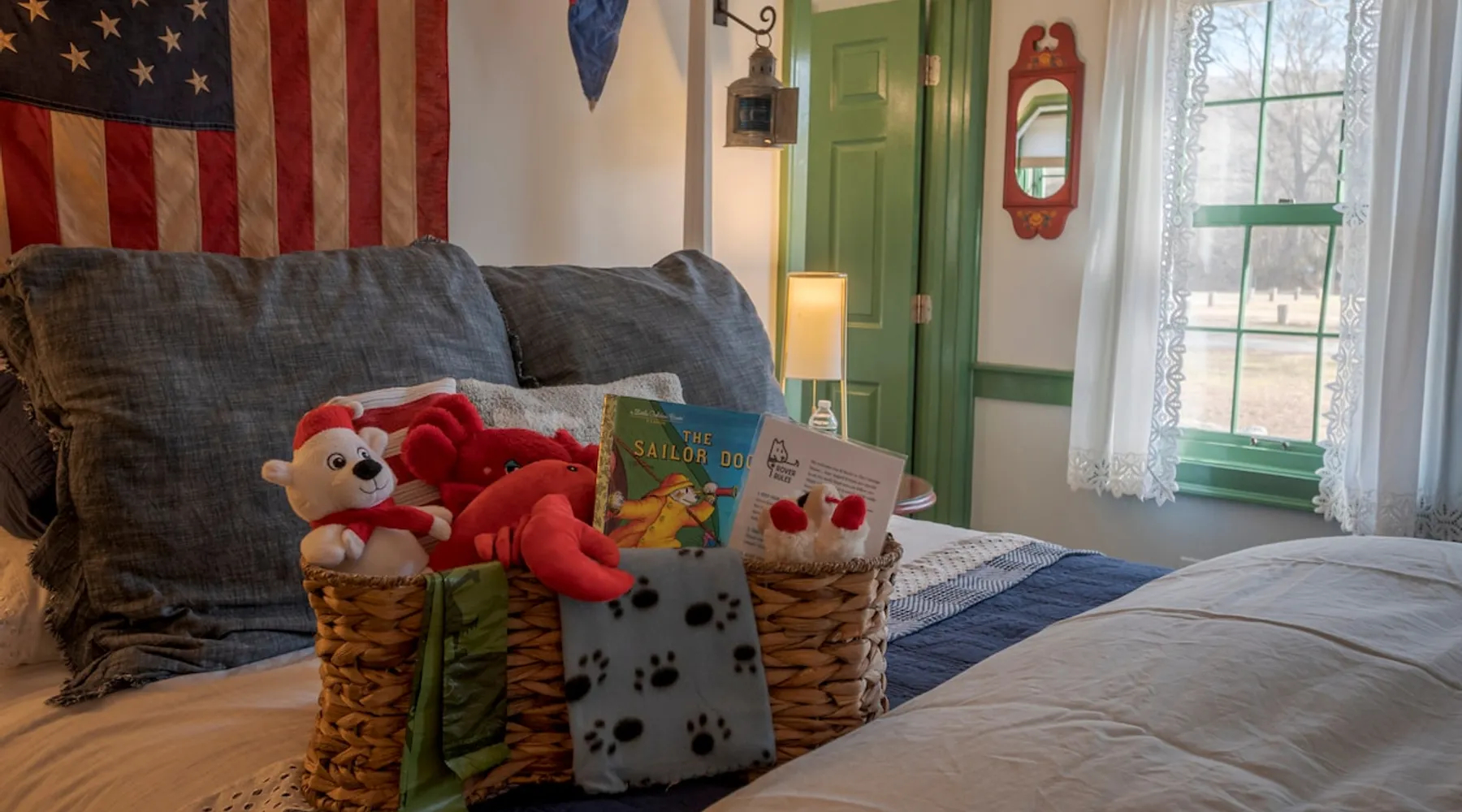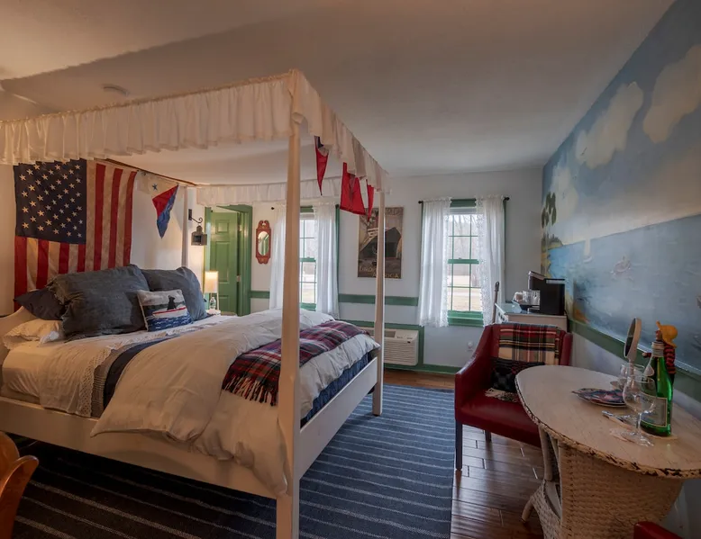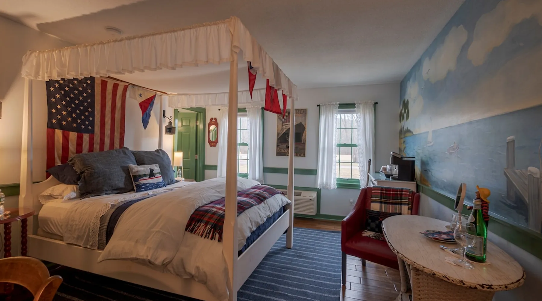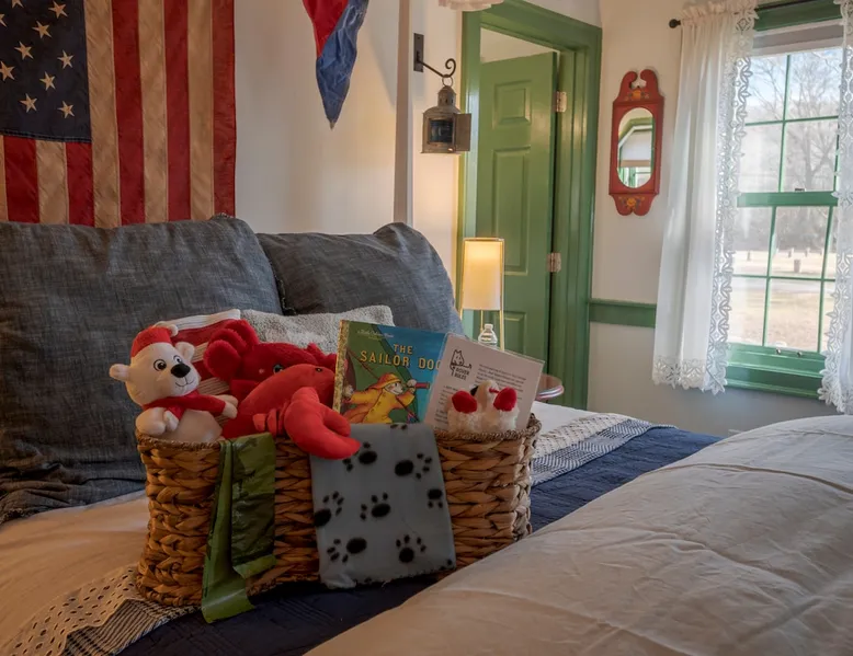 The Carriage House in the peaceful hamlet of Old Mystic near the Head O’ the Mystic River is a 2-mi drive to Mystic Seaport Museum, shops, and restaurants! This lovely property offers 4 uniquely themed private bedchambers, reserved separately, with private baths and entrances. Sleep soundly on a comfy queen pencil bed, dressed in lovely linens, and wake up rested to a beautiful mural- careful attention to every detail with you in mind! 4-legged "Salty Dogs" are welcome, too! Come, sit, stay! The space We promise you will feel cared for the moment you walk through the door- from the warm welcome to a specially prepared bed- made just for you! The front windows of this bedchamber overlook the gardens and gazebo. The field and stone walls out back are a lovely view, too. Whether traveling alone or with a 2-legged or 4-legged companion, you will enjoy this cozy room, perfect for the sailor in your heart. During your stay, you will have a mini fridge for your perishables and a Kuerig for your morning cup. Enjoy the bustle of downtown but come back to the peaceful, quiet Old Mystic Village- a charming New England Hideaway- a true "Sailor's Rest" So what are you waiting for? :-D Carriage House Bedchambers: 1. The Life Saver Room- a private bedchamber 2. The Salty Sailor Room- a private bedchamber **This Listing** 3. The Chandler- a 2 BR apartment upper lever 4. The Rigger's Retreat Room- a private bedchamber 5. The Whaler's Welcome Room- a private bedchamber The four 1st-floor bedchambers and the 2nd-floor apartment can accommodate up to 14 guests. In addition, we can offer our adjacent properties for family reunions, wedding guests, and retreats! We can accommodate 38 guests in our three uniquely themed properties in Old Mystic! Oh, the possibilities! ***The Salty Sailor's Room is for this particular listing*** BEDCHAMBER AMENITIES: ~ Nautical-inspired decor and hand-painted murals. ~ En suite bathrooms ~ Beautiful linens ~ Smart TVs with Roku Stick ~ Mini-fridge ~ Keurig Coffee make with K-cups, cream, sugar, tea, and creamer ~ High-speed internet (Two AmpliFI Instant Dual-Band Mesh WiFi Routers) ~ Alarm clocks with sleep sounds ~ USB charger ports on each side of the bed ~ Sitting area for two ~ Worksurface (if you must!) ~ Seasonal gas fireplaces in The Life Saver, The Whaler's Welcome, and The Rigger's Retreat rooms ~ Complimentary toiletries ~ Closet and hangers for hanging clothes ~ Iron and ironing board ~ Picnic blanket ~ Picnic basket ~ Two beach towels GUIDELINES FOR BRINGING 4-LEGGED GUESTS Dogs ONLY 2 small dogs or 1 medium dog MAX Our fee is $40/pet, which will be requested with your confirmed reservation. We charge a $40.00 pet fee/pet. We hope you find this fee fair and reasonable as we take on additional responsibilities by adding furry guests to your reservation. To ensure a smooth experience, we ask owners to bring along their dogs with the following understanding. 1. Dogs are 100% house-trained. Traveling dogs can get anxious and confused, causing accidents even for a house-trained dog. ***If your dog pees inside, this will cause a great deal of confusion for future dogs staying as they may pee on top of your dog's pee, causing upset for everyone. When arriving, please immediately introduce the yard to your dog to establish where the potty is located.*** 2. Pets are well-behaved and good-natured **NO aggressive dogs allowed** 3. Pets are not left alone in the Sailor Room- given the nature of the shared property, barking dogs will cause disturbance to other guests staying in adjacent guest rooms. 4. Owners clean up outside after their pets 5. Owners keep their pets on a leash when appropriate, as Mystic is a busy place. Behind our property is a great field to walk your dog! We've had wonderful experiences accommodating traveling pets! However, if your pet damages any property, we will use your security deposit to cover the cost. (though this has never happened yet:) If you're considering bringing your dog and are fine with the pet rules/guidelines, please confirm you have read and agree to the rules in your booking message to me at the time of confirmation. We look forward to having you stay! Warmly, Debbie (and Paul too:) Guest access You'll have your own charming bedchamber and a private bathroom with a private exterior entrance. The outside firepit and parking are shared with other guests. You'll receive your thorough check-in instructions three days before arrival (or straightaway if booking less than three days), and you'll receive your keypad code 24 hours before check-in time (or sooner if you reserved a last-minute getaway:). During your stay My husband and I live in Mystic, a 5-minute drive from Old Mystic. Even though you are set up for self-check-in, you may see one of us around watering plants, taking out trash bins, etc. But rest assured, we are harmless and will respect your space and privacy. If you seek answers, would like suggestions, or even meet us, we are here for you and delight in sharing this lovely little village with visitors! We are always available by phone or text, so please reach out if you need anything! Other things to note We also have guests who stay in our front red property, the 1784 Denison Home. We ask that you park in front of the Carriage House property and the other guests park behind the Denison Home. The Sailor's Room is our four-legged "Salty Dog" friendly room. Small and medium size dogs only. Please read all pet guidelines in our "House Rules" section and House Manual. Kindly send me the code word to let me know you are OK with our pet policy. You'll receive detailed check-in instructions three days before arrival- please read all check-in and keypad instructions carefully. We are pleased to welcome you and look forward to hosting you soon!