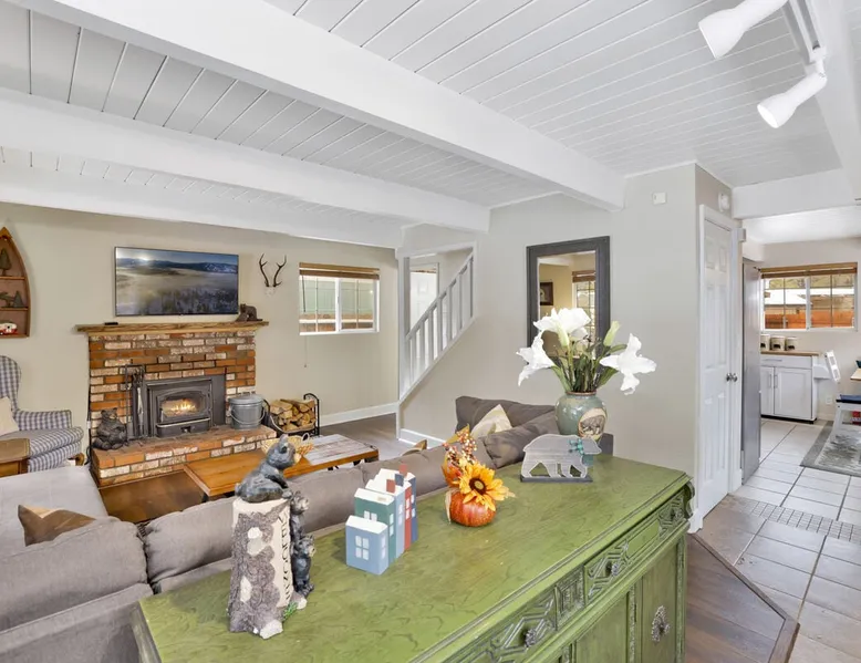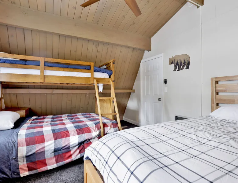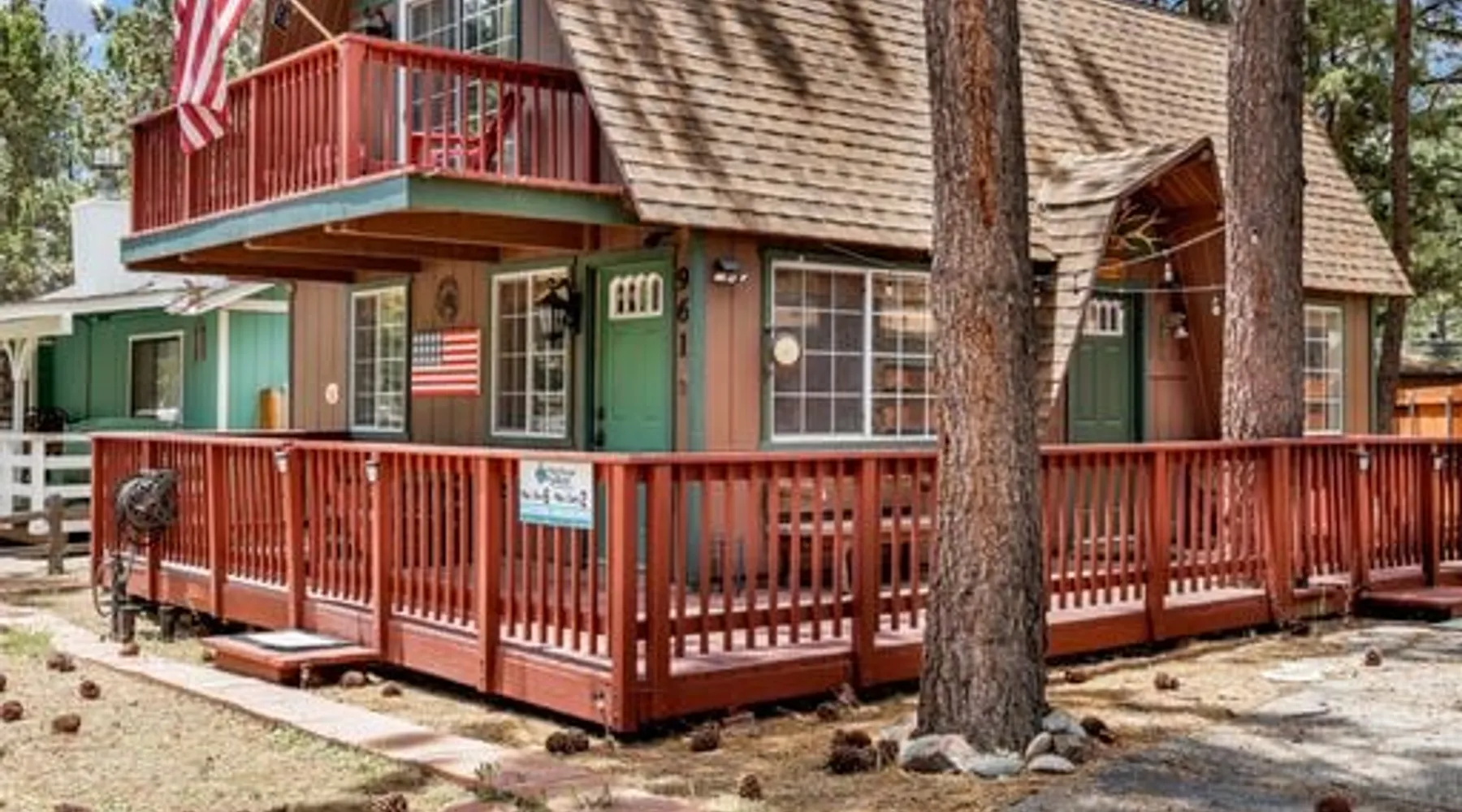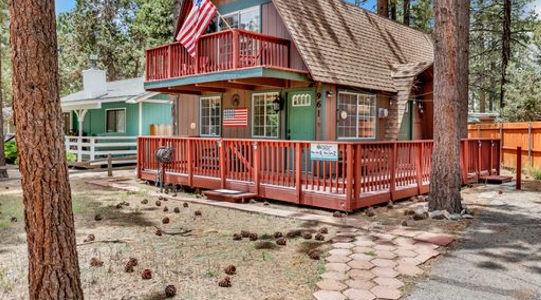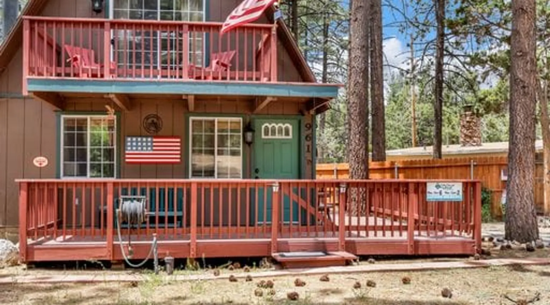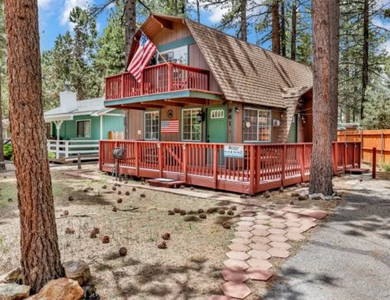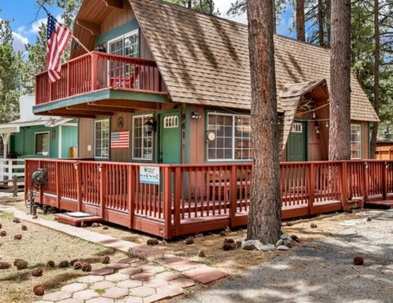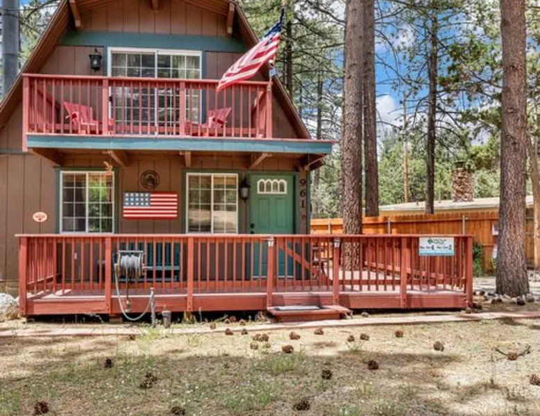 Tinker Bell Gambrel- Relaxing Bear City Modern Retreat Welcome to Tinker Bell Gambrel. Perfect for a friend's getaway or family vacation to the mountains our adorable two-story chalet offers exactly what you need to enjoy a relaxing and comfortable stay together under the pines. Located in a quiet Bear City neighborhood you are within a quick ten-minute car ride into town for local ski resorts, grocery stores, and the Village shops. The space Snuggle up together in front of the fire and warm your toes as you pop on a movie on the mounted flat screen Streaming TV and watch the snow falling outside from the big open windows. Around the corner is the equipped kitchen and dining area, complete with all that you need to prepare home cooked holiday meals and slope side snacks for your day of adventures. A convenient and spacious lower-level hallway bathroom is available while two upstairs sleeping quarters are ready for your group's restful night of rest. Venture out to the private balcony from the first bedroom upstairs, you will love sipping your first cup of coffee here in the mornings among the birds or relaxing and unwinding in the evening under the stars. The lower-level sun deck wraps the property and offers plenty of space to watch the kids play safely along with a great flat driveway for off-street convenient parking. Stroll the quiet neighborhood or hop in the car to be within minutes to local Big Bear attractions- this is the perfect year-round location for any occasion! Sleeping Arrangements: Bedroom 1: Queen Bed, Private Balcony- Upstairs 2nd Level Bedroom 2: Queen Bed + Full/Twin Bunk, Streaming TV- Upstairs 2nd Level Bathroom Arrangements: Hallway Full Bath- Downstairs Entry Level -Sleeps 6 -2 Car Driveway Parking -NO PETS ALLOWED- Fines Imposed for Pets Found on Property -952 Square Feet Registration Details CESTRP-2023-00589