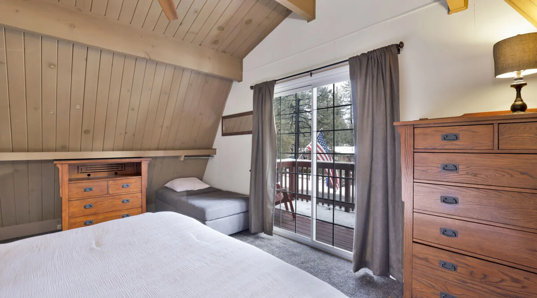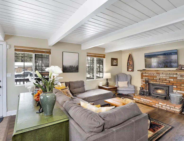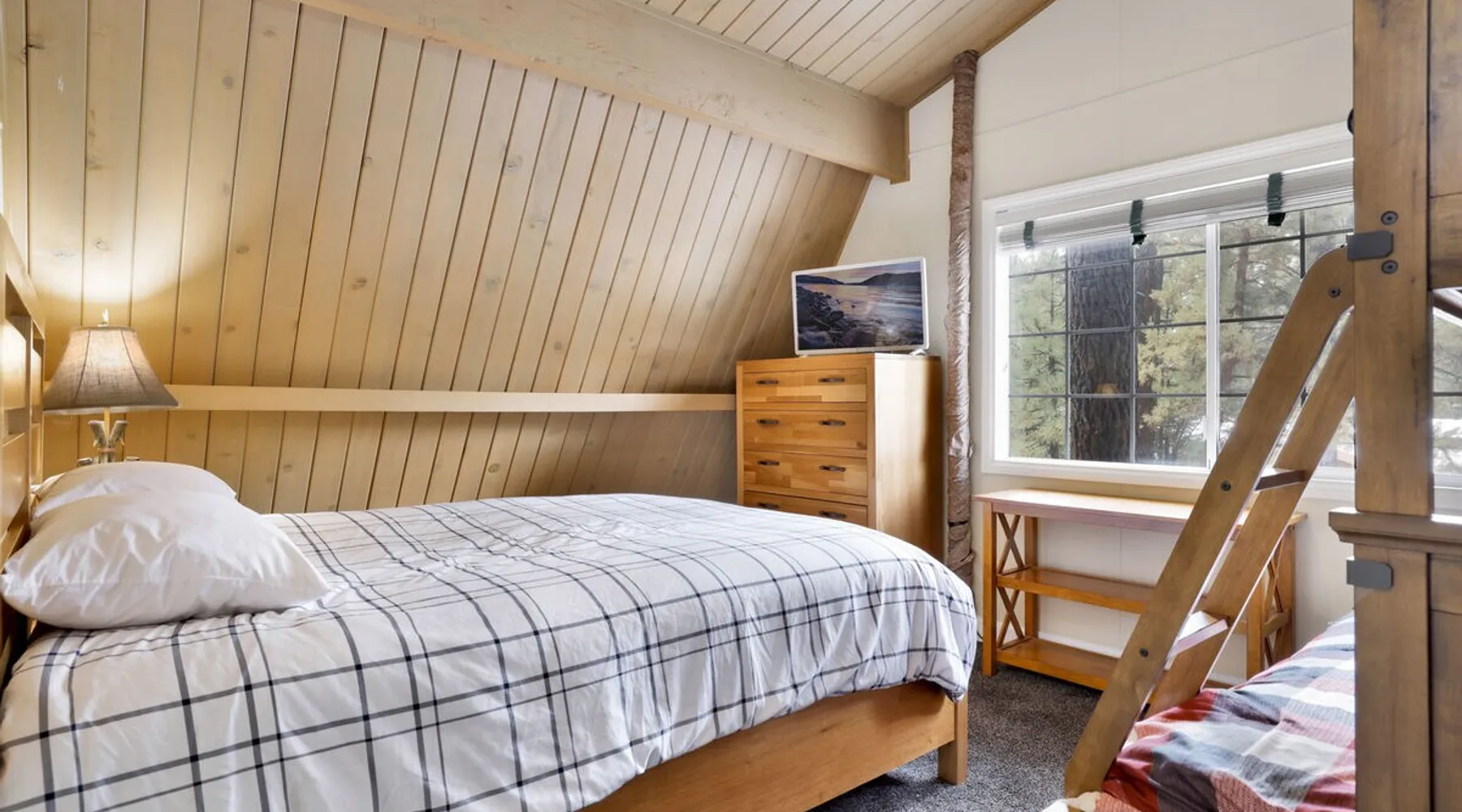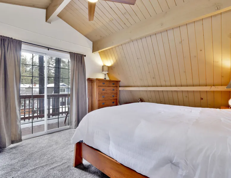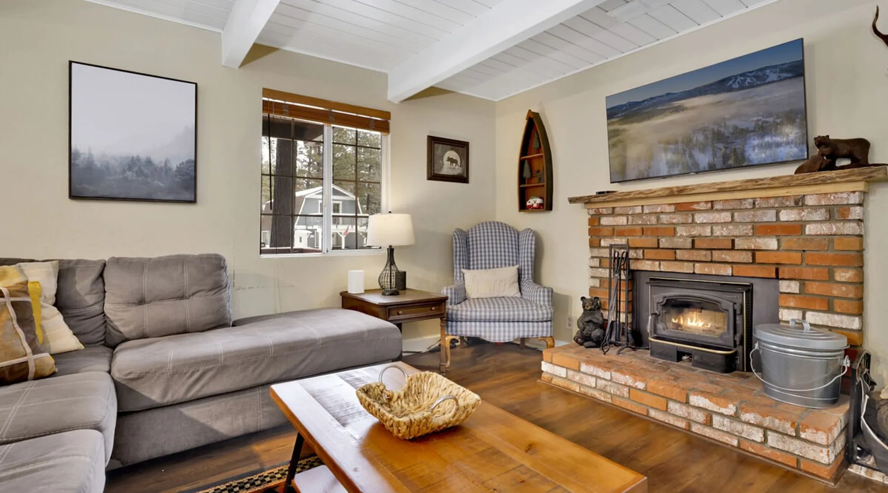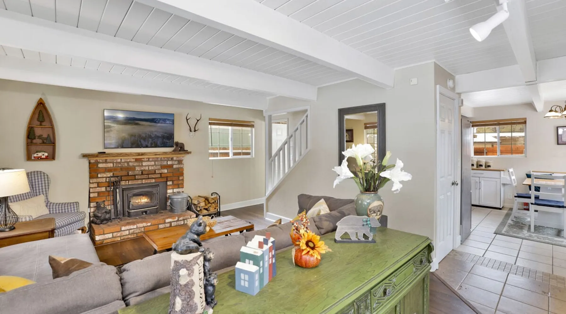 Tinker Bell Gambrel- Relaxing Bear City Modern Retreat Welcome to Tinker Bell Gambrel. Perfect for a friend's getaway or family vacation to the mountains our adorable two-story chalet offers exactly what you need to enjoy a relaxing and comfortable stay together under the pines. Located in a quiet Bear City neighborhood you are within a quick ten-minute car ride into town for local ski resorts, grocery stores, and the Village shops. The space Snuggle up together in front of the fire and warm your toes as you pop on a movie on the mounted flat screen Streaming TV and watch the snow falling outside from the big open windows. Around the corner is the equipped kitchen and dining area, complete with all that you need to prepare home cooked holiday meals and slope side snacks for your day of adventures. A convenient and spacious lower-level hallway bathroom is available while two upstairs sleeping quarters are ready for your group's restful night of rest. Venture out to the private balcony from the first bedroom upstairs, you will love sipping your first cup of coffee here in the mornings among the birds or relaxing and unwinding in the evening under the stars. The lower-level sun deck wraps the property and offers plenty of space to watch the kids play safely along with a great flat driveway for off-street convenient parking. Stroll the quiet neighborhood or hop in the car to be within minutes to local Big Bear attractions- this is the perfect year-round location for any occasion! Sleeping Arrangements: Bedroom 1: Queen Bed, Private Balcony- Upstairs 2nd Level Bedroom 2: Queen Bed + Full/Twin Bunk, Streaming TV- Upstairs 2nd Level Bathroom Arrangements: Hallway Full Bath- Downstairs Entry Level -Sleeps 6 -2 Car Driveway Parking -NO PETS ALLOWED- Fines Imposed for Pets Found on Property -952 Square Feet Registration Details CESTRP-2023-00589