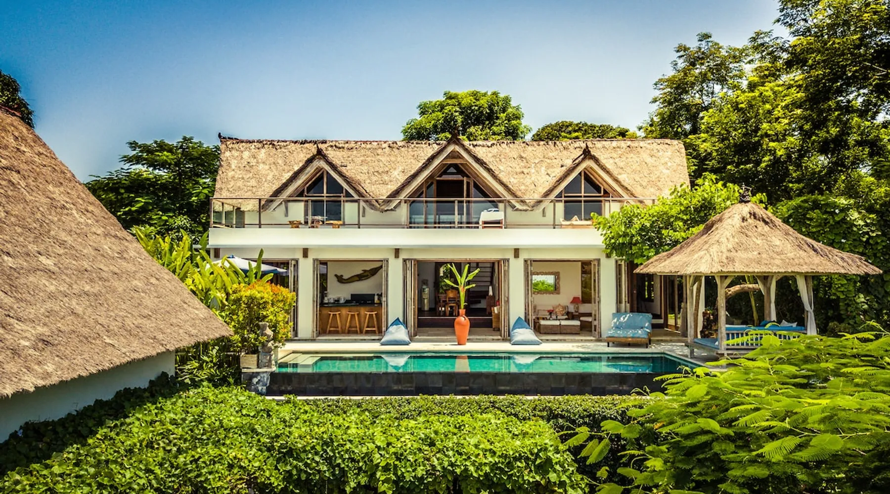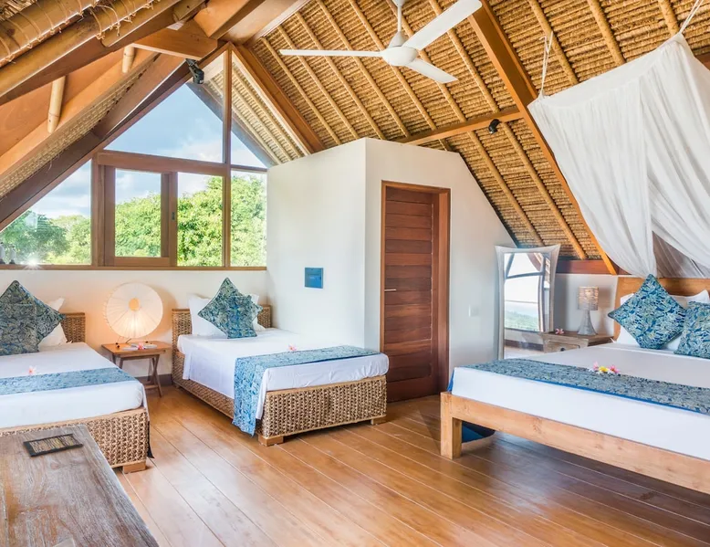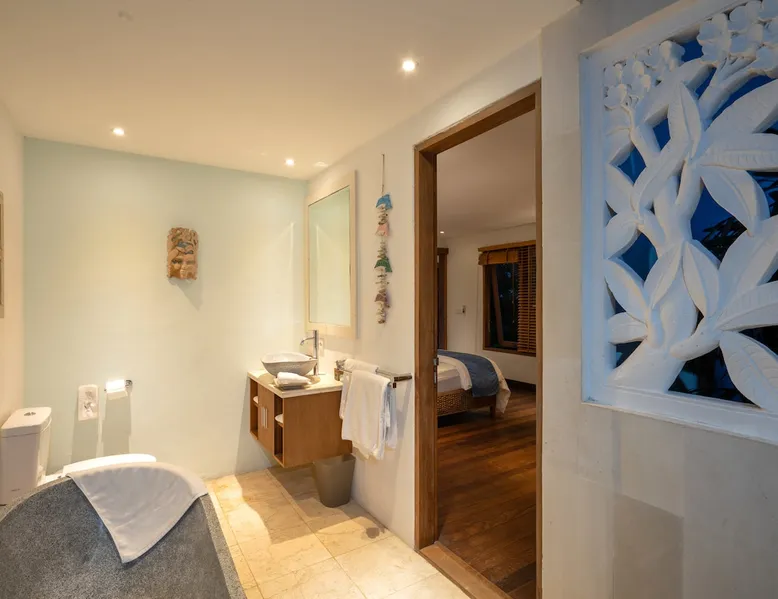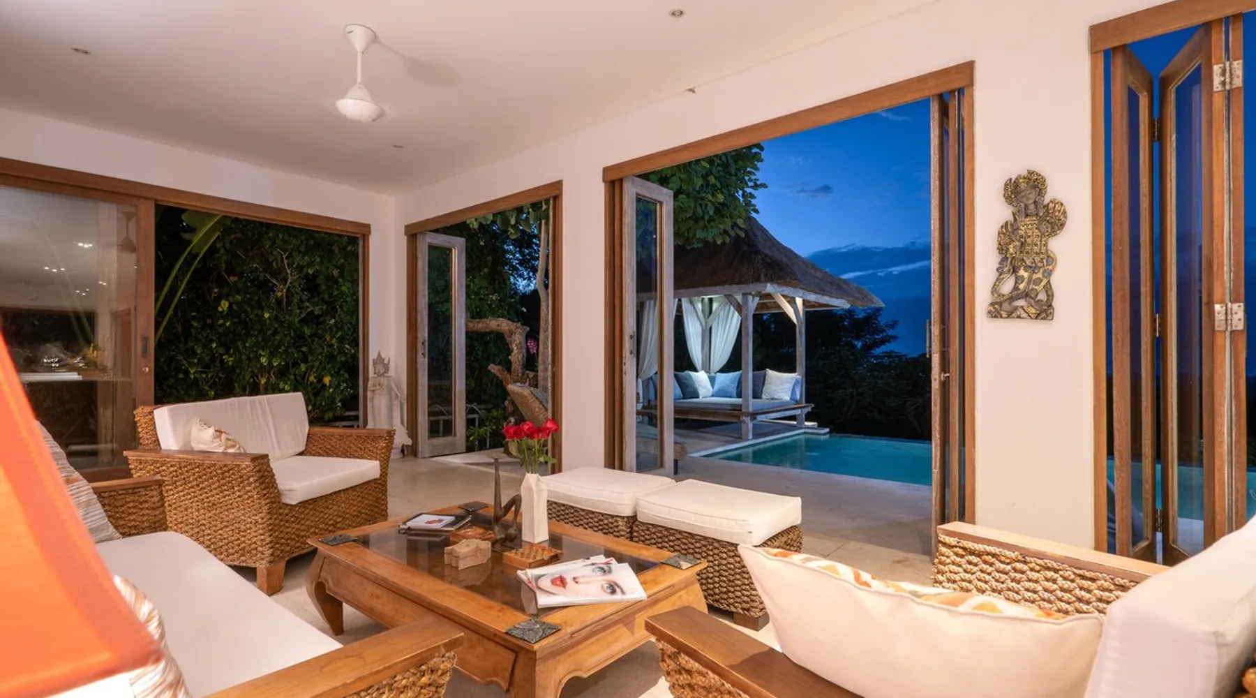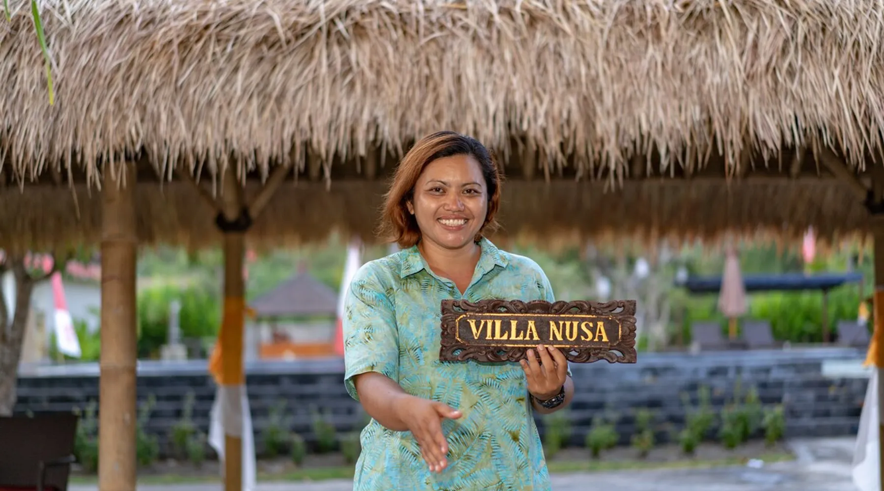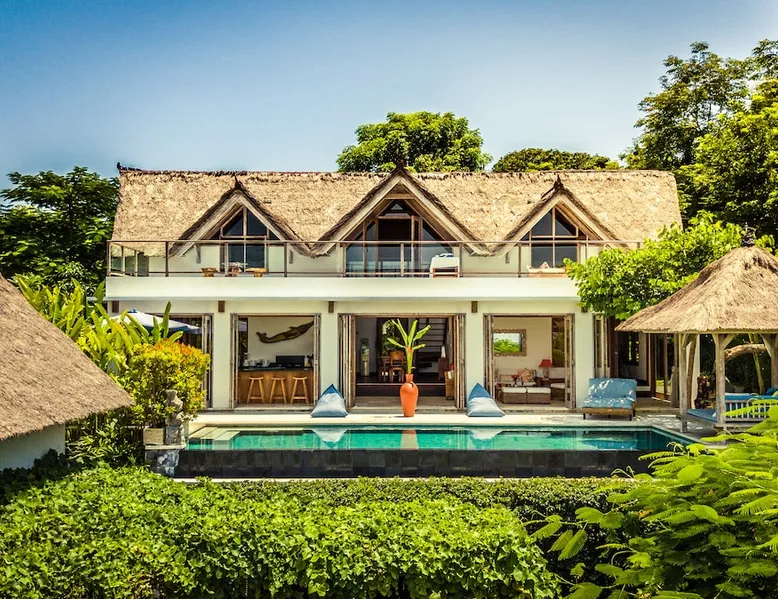 Villa Nusa is located on the most exclusive hillside on Nusa Lembongan and offers stylish, versatile, accommodation. This peaceful, paradise hideaway has a 10 meter infinity pool, tropical garden and amazing views of the island, ocean and east coast of Bali. Villa Nusa is perfect for families, groups of friends or couples who want privacy. The flexible space means the Villa can accommodate up to 8 guests. Experience Lembongan with exceptional service and a touch of luxury at Villa Nusa. The space Villa Nusa offers guests their own spacious, luxury, well designed, and equipped peaceful haven on the beautiful laid back island of Nusa Lembongan. The infinity pool, comfortable lazy gazebo, sunloungers and snuggle chairs invite guests to relax and enjoy the views in their own piece of private paradise. There are two ground floor master suites with indoor and outdoor bath and shower rooms plus a mezzanine level bedroom that has air conditioning, screened doors to ensure privacy and an ensuite shower room. Additionally on the mezzanine level is a large informal lounge area with bar, 43" flat SMART TV, fridge, and two large sofas that can be made into another two single beds or another kingsize double (fan cooled). The kitchen is fully equipped for guests to use. We can stock the fridge for you, restaurants on the island will deliver direct to the villa, we can arrange for pick ups and drop offs if you want to dine out anywhere on the island or we can have a personal chef cater for you in-house! You choose and we can make it happen. Guest access The Villa is rented as a single unit and guests have their own private access to all the facilities. Other things to note Our wonderful Housekeeper Komang gives incredible Balinese massages on the villa's 1st floor veranda with stunning island views. If you would like to book a massage during your stay, let us know!