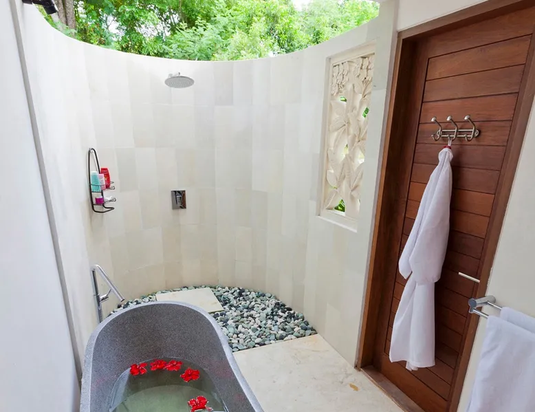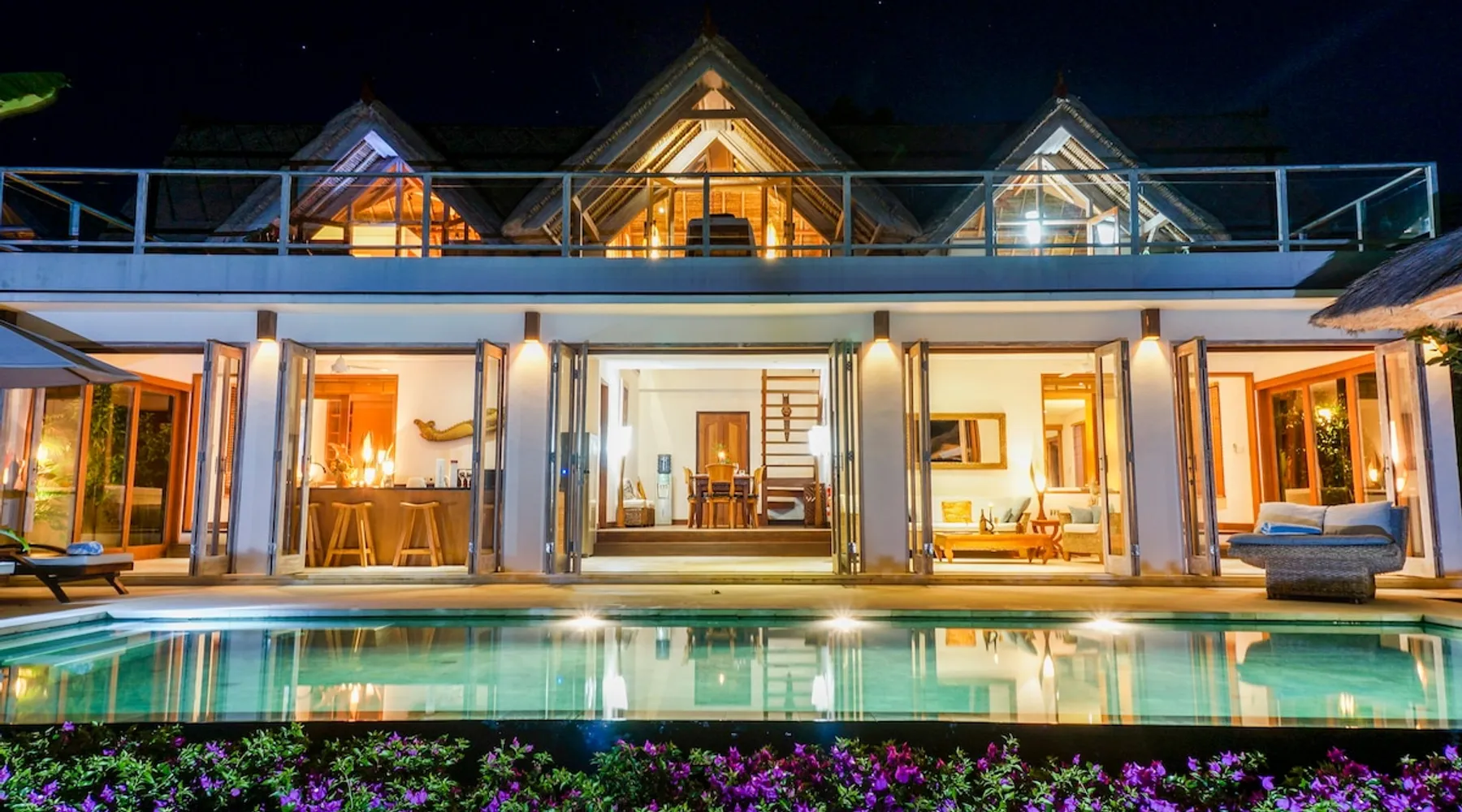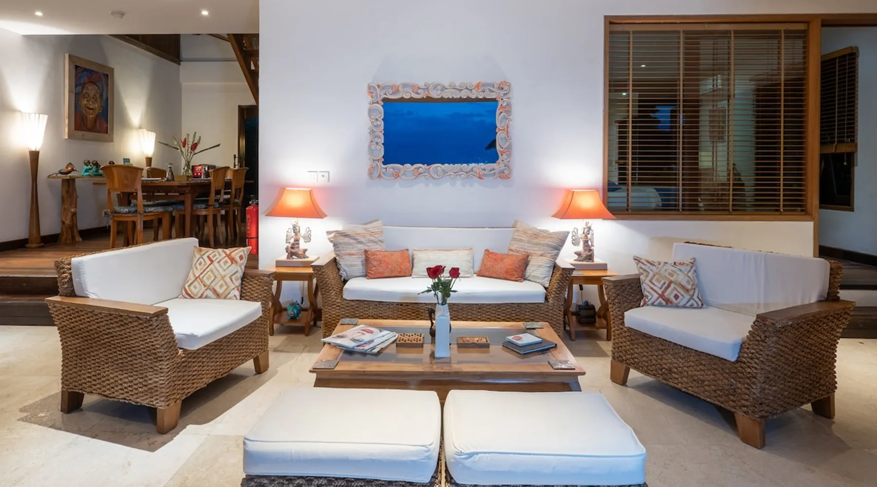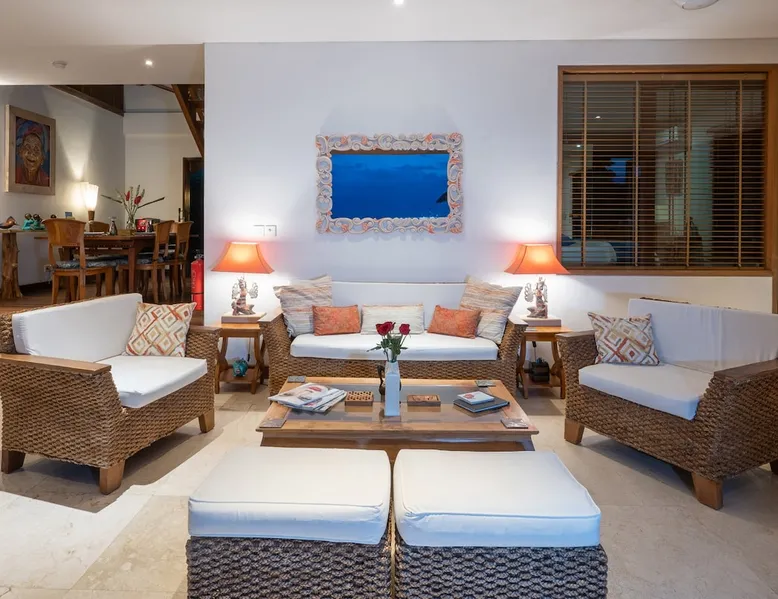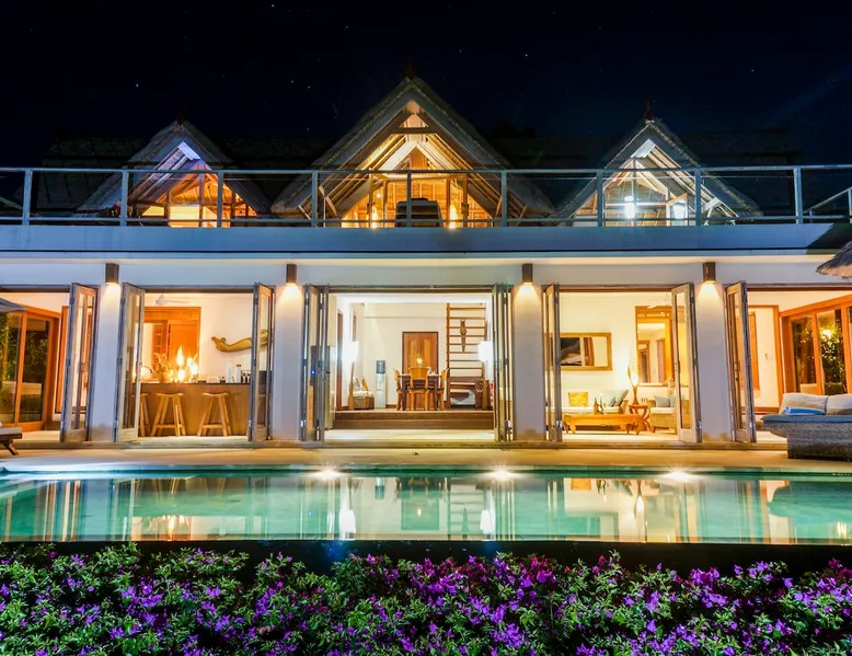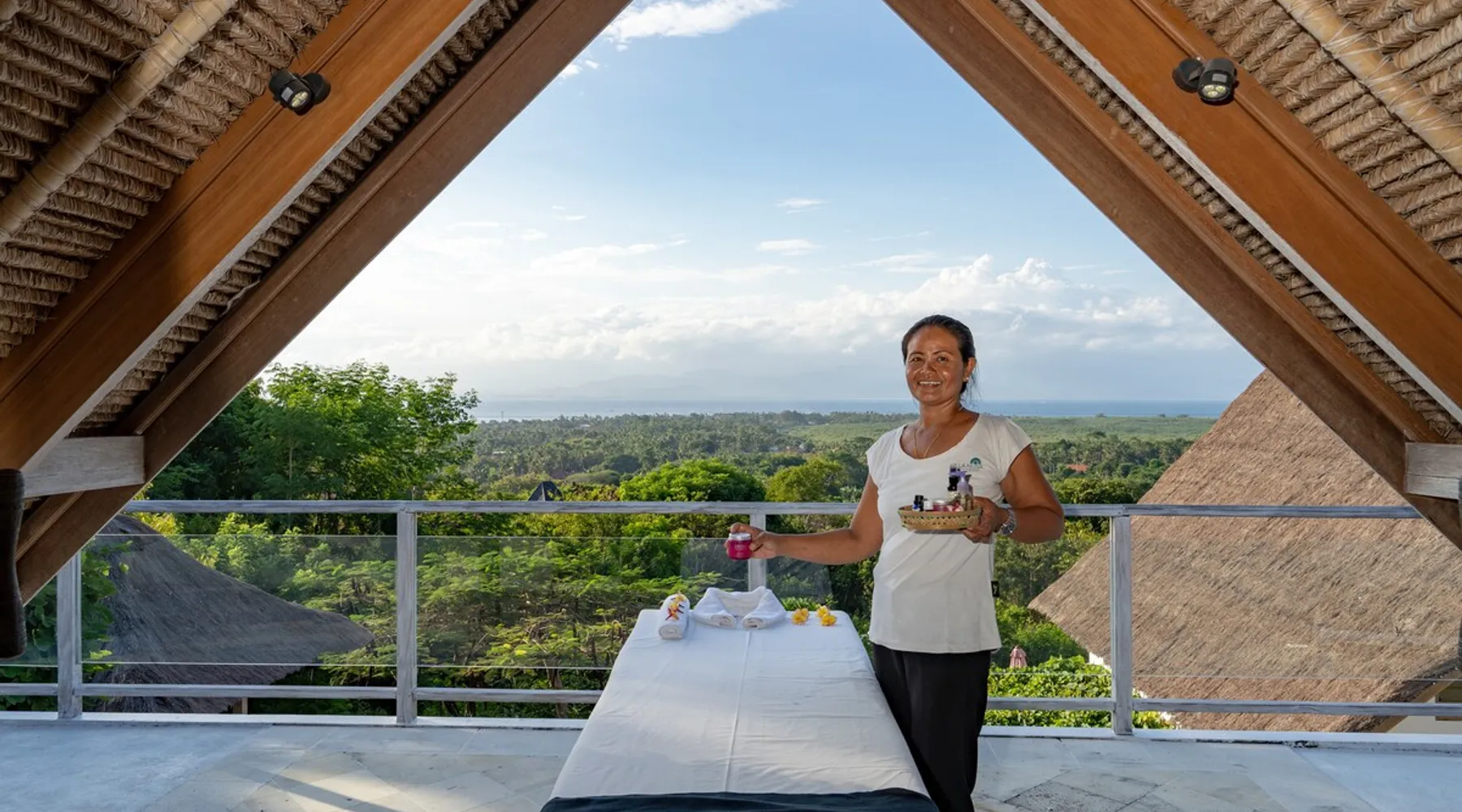 Villa Nusa is located on the most exclusive hillside on Nusa Lembongan and offers stylish, versatile, accommodation. This peaceful, paradise hideaway has a 10 meter infinity pool, tropical garden and amazing views of the island, ocean and east coast of Bali. Villa Nusa is perfect for families, groups of friends or couples who want privacy. The flexible space means the Villa can accommodate up to 8 guests. Experience Lembongan with exceptional service and a touch of luxury at Villa Nusa. The space Villa Nusa offers guests their own spacious, luxury, well designed, and equipped peaceful haven on the beautiful laid back island of Nusa Lembongan. The infinity pool, comfortable lazy gazebo, sunloungers and snuggle chairs invite guests to relax and enjoy the views in their own piece of private paradise. There are two ground floor master suites with indoor and outdoor bath and shower rooms plus a mezzanine level bedroom that has air conditioning, screened doors to ensure privacy and an ensuite shower room. Additionally on the mezzanine level is a large informal lounge area with bar, 43" flat SMART TV, fridge, and two large sofas that can be made into another two single beds or another kingsize double (fan cooled). The kitchen is fully equipped for guests to use. We can stock the fridge for you, restaurants on the island will deliver direct to the villa, we can arrange for pick ups and drop offs if you want to dine out anywhere on the island or we can have a personal chef cater for you in-house! You choose and we can make it happen. Guest access The Villa is rented as a single unit and guests have their own private access to all the facilities. Other things to note Our wonderful Housekeeper Komang gives incredible Balinese massages on the villa's 1st floor veranda with stunning island views. If you would like to book a massage during your stay, let us know!