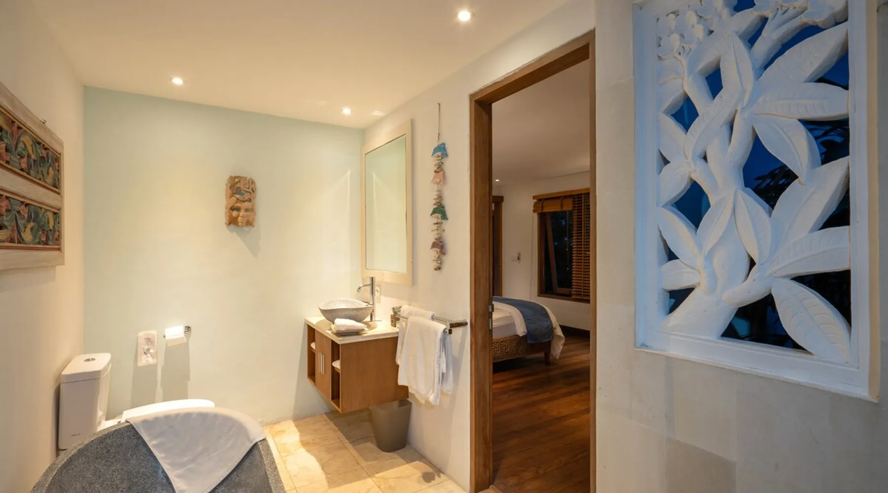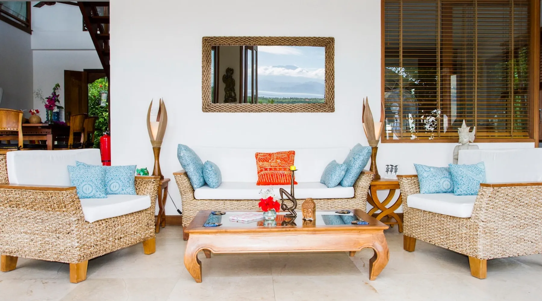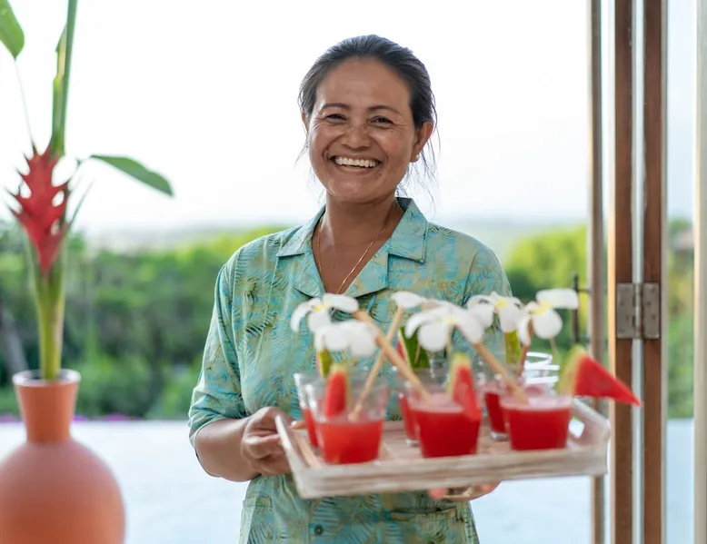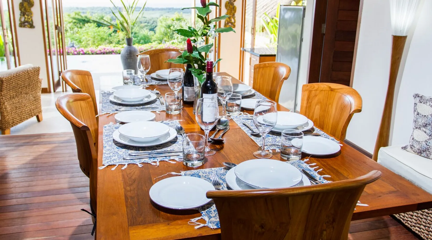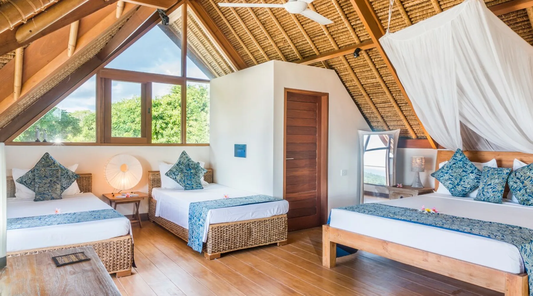 Villa Nusa is located on the most exclusive hillside on Nusa Lembongan and offers stylish, versatile, accommodation. This peaceful, paradise hideaway has a 10 meter infinity pool, tropical garden and amazing views of the island, ocean and east coast of Bali. Villa Nusa is perfect for families, groups of friends or couples who want privacy. The flexible space means the Villa can accommodate up to 8 guests. Experience Lembongan with exceptional service and a touch of luxury at Villa Nusa. The space Villa Nusa offers guests their own spacious, luxury, well designed, and equipped peaceful haven on the beautiful laid back island of Nusa Lembongan. The infinity pool, comfortable lazy gazebo, sunloungers and snuggle chairs invite guests to relax and enjoy the views in their own piece of private paradise. There are two ground floor master suites with indoor and outdoor bath and shower rooms plus a mezzanine level bedroom that has air conditioning, screened doors to ensure privacy and an ensuite shower room. Additionally on the mezzanine level is a large informal lounge area with bar, 43" flat SMART TV, fridge, and two large sofas that can be made into another two single beds or another kingsize double (fan cooled). The kitchen is fully equipped for guests to use. We can stock the fridge for you, restaurants on the island will deliver direct to the villa, we can arrange for pick ups and drop offs if you want to dine out anywhere on the island or we can have a personal chef cater for you in-house! You choose and we can make it happen. Guest access The Villa is rented as a single unit and guests have their own private access to all the facilities. Other things to note Our wonderful Housekeeper Komang gives incredible Balinese massages on the villa's 1st floor veranda with stunning island views. If you would like to book a massage during your stay, let us know!