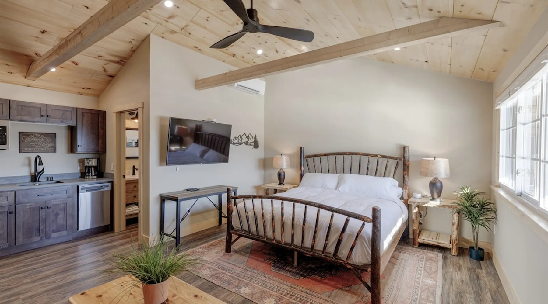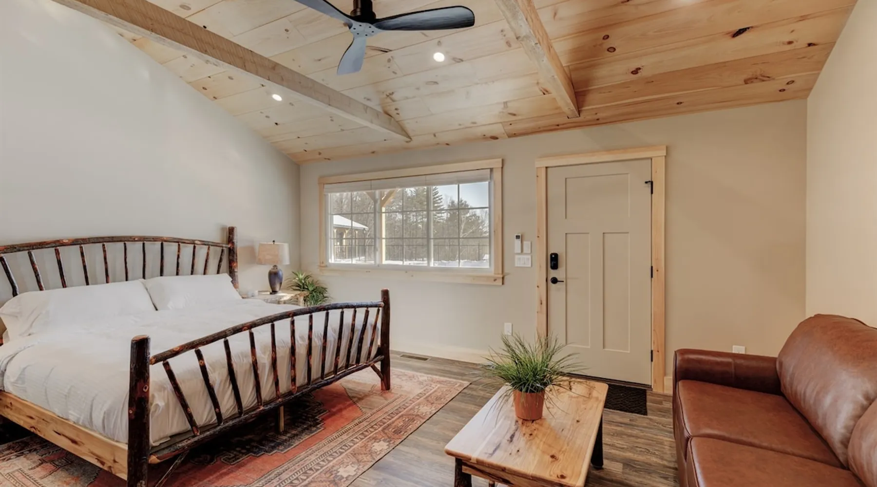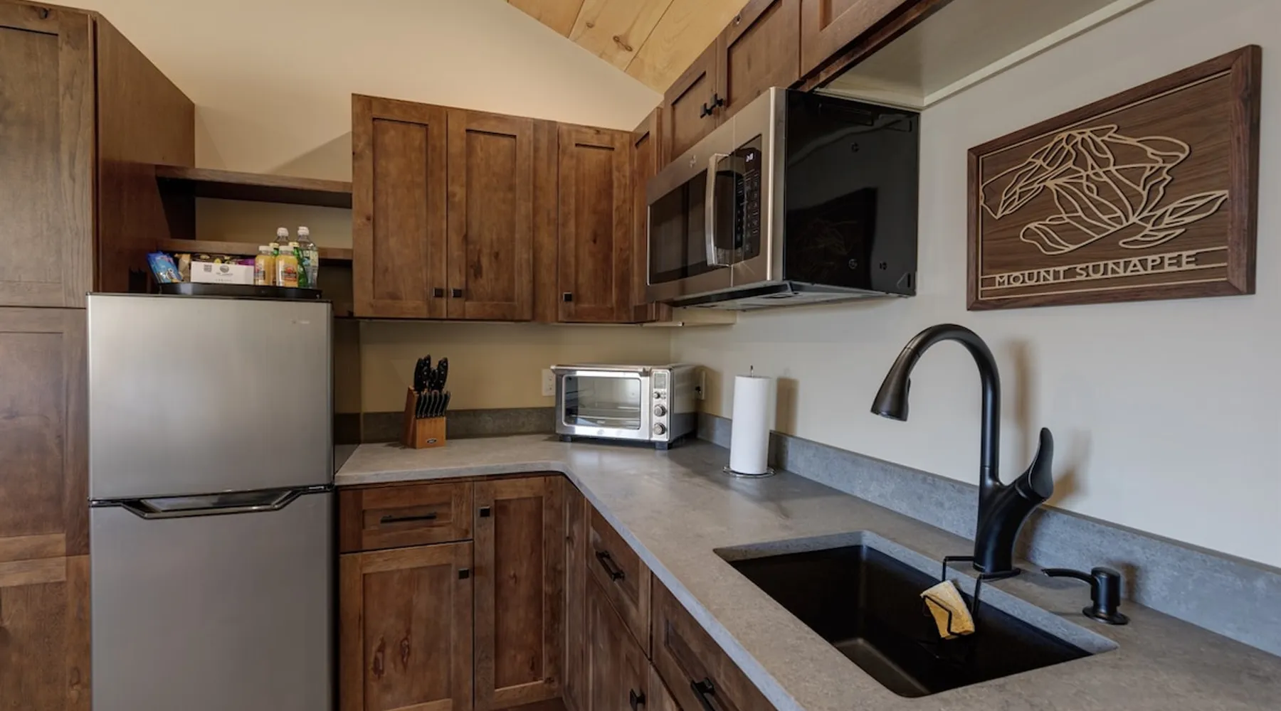 One of eleven luxury suites at The Lodge by Sunapee Stays, this modern retreat features a king bed and a sofa bed. Nestled in Sunapee with spectacular views of Mount Sunapee just outside your front door, it’s ideally located minutes from Sunapee Harbor and less than ten minutes from Mount Sunapee Resort. The space This modern rustic studio suite features hickory log furniture throughout, king bed and full size memory foam sofa bed. The kitchenette is fully stocked with all the amenities to eat in. The bathroom boasts a sanctuary of its own with pebble stone shower surrounded by subway tiles and your very own bidet toilet! The shiplap vaulted ceilings and plush Adirondack style furnishings evoke relaxation after your day of adventures. Common washer and dryer located on property. Later this winter, the Lodge will offer a common indoor lounge area featuring contemporary and classic family games along with a TV. Outside you'll find a semi-private patio complete with rocking chairs and a seasonal outdoor pool with views of Mount Sunapee! In Room Amenities: King Bed Full Size Sleeper Sofa Kitchenette Microwave Refrigerator Flat Screen Smart TV Complimentary High Speed Internet Cuisinart Double Induction Electric Cooktop Coffee Pot with Coffee Toaster Oven Plates, Glasses, Silverware, Cookware Hair Dryer Premium Bath amenities Private heating/air conditioning unit Access to common washer/dryer Access to common iron/iron board Guest access This is a studio suite and one of eleven suites at The Lodge by Sunapee Stays. Each suite has their own entrance. Later this winter, the Lodge will offer a common indoor lounge area featuring contemporary and classic family games along with a TV. This summer our seasonal outdoor pool will be open.