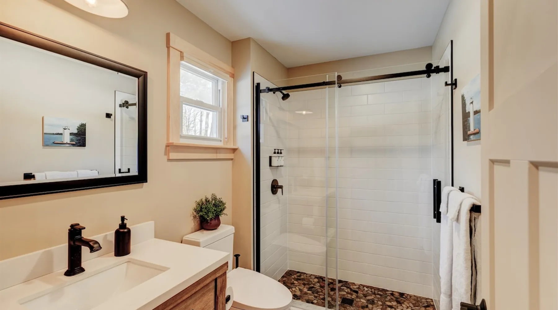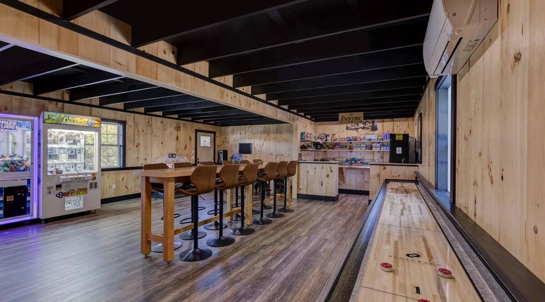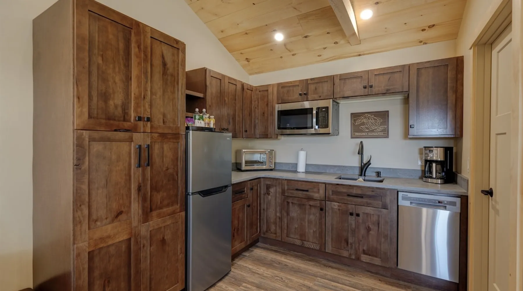 One of eleven luxury suites at The Lodge by Sunapee Stays, this modern retreat features a king bed and a sofa bed. Nestled in Sunapee with spectacular views of Mount Sunapee just outside your front door, it’s ideally located minutes from Sunapee Harbor and less than ten minutes from Mount Sunapee Resort. The space This modern rustic studio suite features hickory log furniture throughout, king bed and full size memory foam sofa bed. The kitchenette is fully stocked with all the amenities to eat in. The bathroom boasts a sanctuary of its own with pebble stone shower surrounded by subway tiles and your very own bidet toilet! The shiplap vaulted ceilings and plush Adirondack style furnishings evoke relaxation after your day of adventures. Common washer and dryer located on property. Later this winter, the Lodge will offer a common indoor lounge area featuring contemporary and classic family games along with a TV. Outside you'll find a semi-private patio complete with rocking chairs and a seasonal outdoor pool with views of Mount Sunapee! In Room Amenities: King Bed Full Size Sleeper Sofa Kitchenette Microwave Refrigerator Flat Screen Smart TV Complimentary High Speed Internet Cuisinart Double Induction Electric Cooktop Coffee Pot with Coffee Toaster Oven Plates, Glasses, Silverware, Cookware Hair Dryer Premium Bath amenities Private heating/air conditioning unit Access to common washer/dryer Access to common iron/iron board Guest access This is a studio suite and one of eleven suites at The Lodge by Sunapee Stays. Each suite has their own entrance. Later this winter, the Lodge will offer a common indoor lounge area featuring contemporary and classic family games along with a TV. This summer our seasonal outdoor pool will be open.