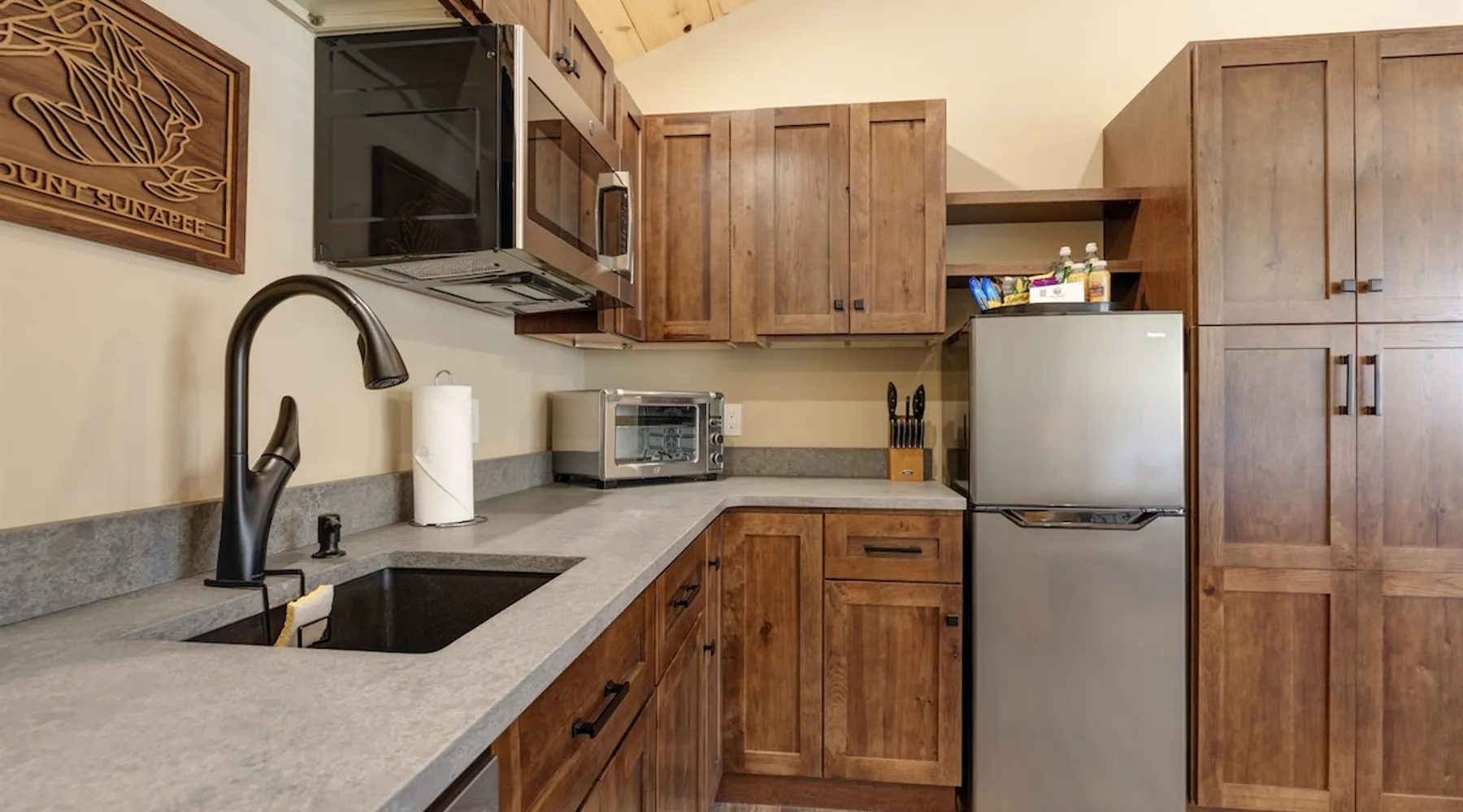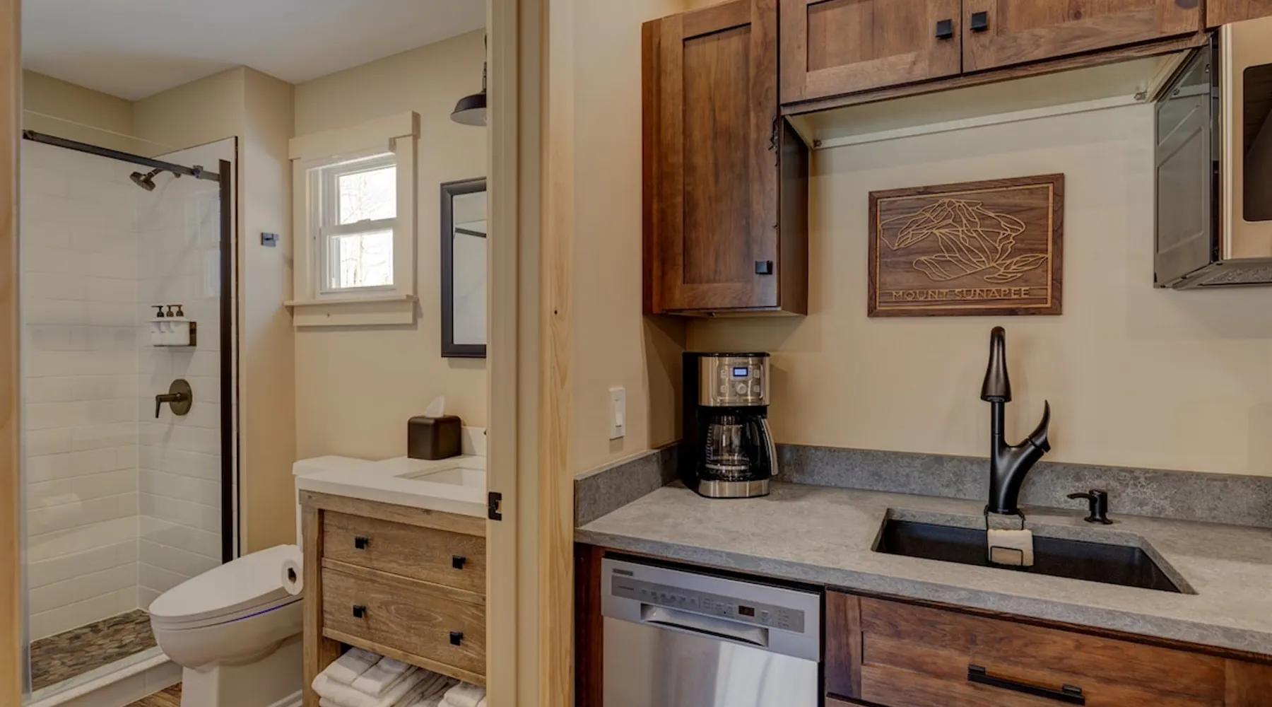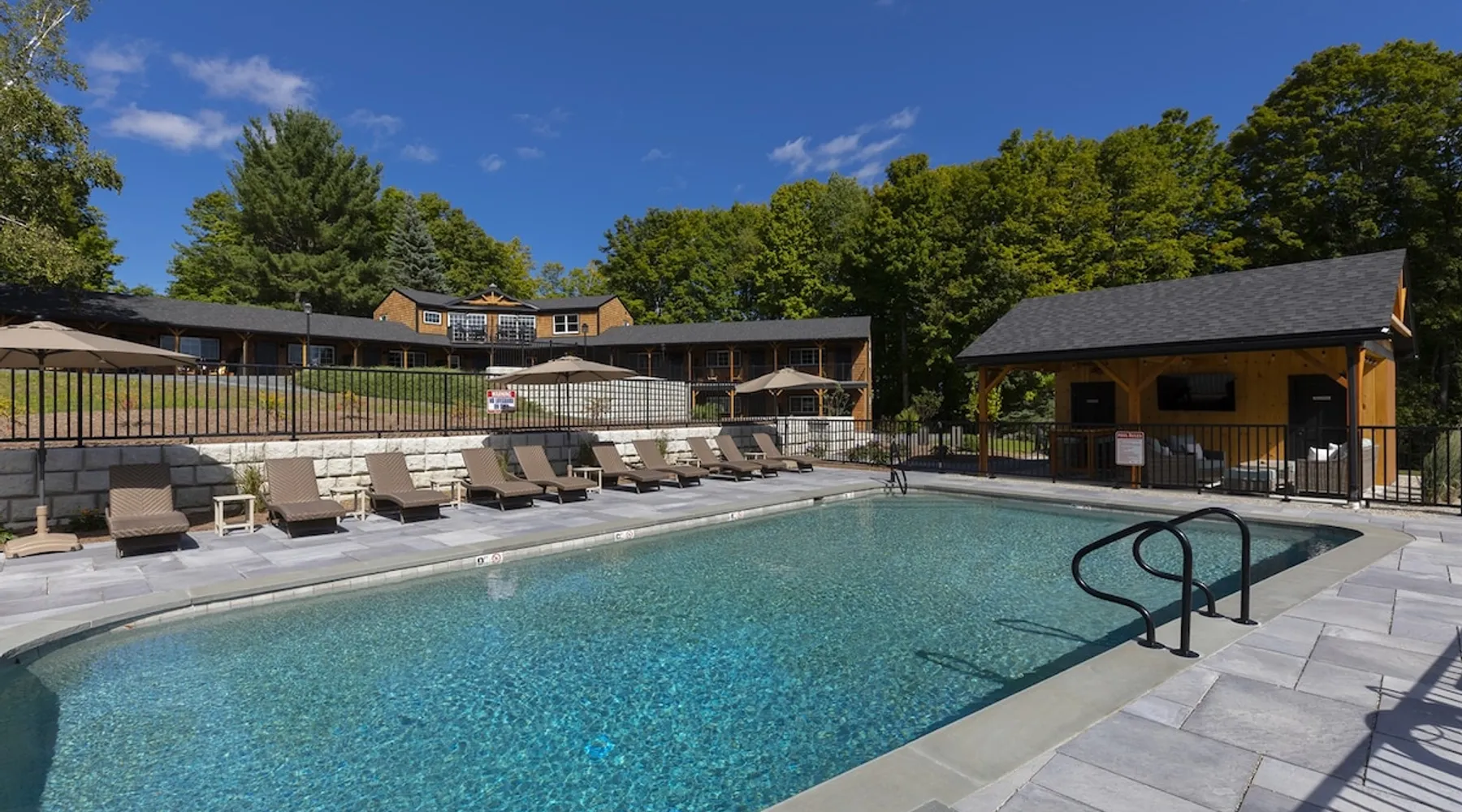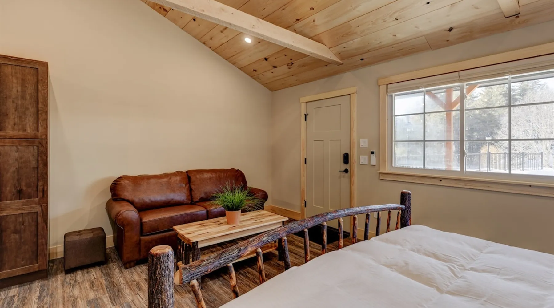 One of eleven luxury rooms at the Lodge by Sunapee Stays, nestled in Sunapee with spectacular views of Mount Sunapee just out your front door. Minutes from Sunapee Harbor and less than 10 minutes to Mount Sunapee. The space This modern rustic studio suite features hickory log furniture throughout, king bed and full size memory foam sofa bed. The kitchenette is fully stocked with all the amenities to eat in. The bathroom boasts a sanctuary of its own with pebble stone shower surrounded by subway tiles and your very own bidet toilet! The shiplap vaulted ceilings and plush Adirondack style furnishings evoke relaxation after your day of adventures. Common washer and dryer located on property. Later this winter, the Lodge will offer a common indoor lounge area featuring contemporary and classic family games along with a TV. Outside you'll find a semi-private patio complete with rocking chairs and a seasonal outdoor pool with views of Mount Sunapee! In Room Amenities: King Bed Full Size Sleeper Sofa Kitchenette Microwave Refrigerator Flat Screen Smart TV Complimentary High Speed Internet Cuisinart Double Induction Electric Cooktop Coffee Pot with Coffee Toaster Oven Plates, Glasses, Silverware, Cookware Hair Dryer Premium Bath amenities Private heating/air conditioning unit Access to common washer/dryer Access to common iron/iron board Guest access This is a studio suite and one of eleven suites at The Lodge by Sunapee Stays. Each suite has their own entrance. Later this winter, the Lodge will offer a common indoor lounge area featuring contemporary and classic family games along with a TV. This summer our seasonal outdoor pool will be open.