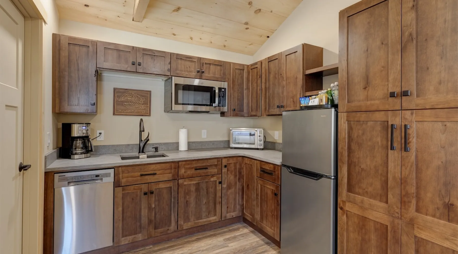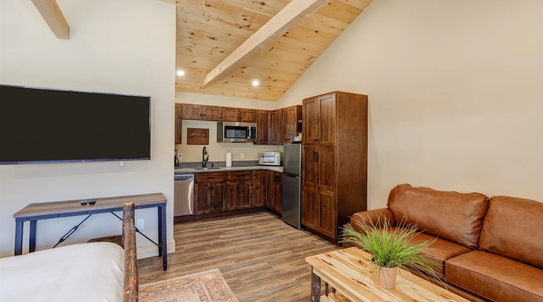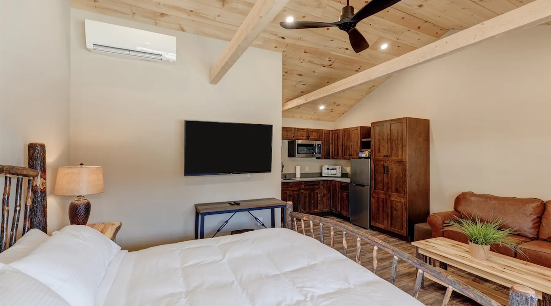 One of eleven luxury rooms at the Lodge by Sunapee Stays, nestled in Sunapee with spectacular views of Mount Sunapee just out your front door. Minutes from Sunapee Harbor and less than 10 minutes to Mount Sunapee. The space This modern rustic studio suite features hickory log furniture throughout, king bed and full size memory foam sofa bed. The kitchenette is fully stocked with all the amenities to eat in. The bathroom boasts a sanctuary of its own with pebble stone shower surrounded by subway tiles and your very own bidet toilet! The shiplap vaulted ceilings and plush Adirondack style furnishings evoke relaxation after your day of adventures. Common washer and dryer located on property. Later this winter, the Lodge will offer a common indoor lounge area featuring contemporary and classic family games along with a TV. Outside you'll find a semi-private patio complete with rocking chairs and a seasonal outdoor pool with views of Mount Sunapee! In Room Amenities: King Bed Full Size Sleeper Sofa Kitchenette Microwave Refrigerator Flat Screen Smart TV Complimentary High Speed Internet Cuisinart Double Induction Electric Cooktop Coffee Pot with Coffee Toaster Oven Plates, Glasses, Silverware, Cookware Hair Dryer Premium Bath amenities Private heating/air conditioning unit Access to common washer/dryer Access to common iron/iron board Guest access This is a studio suite and one of eleven suites at The Lodge by Sunapee Stays. Each suite has their own entrance. Later this winter, the Lodge will offer a common indoor lounge area featuring contemporary and classic family games along with a TV. This summer our seasonal outdoor pool will be open.