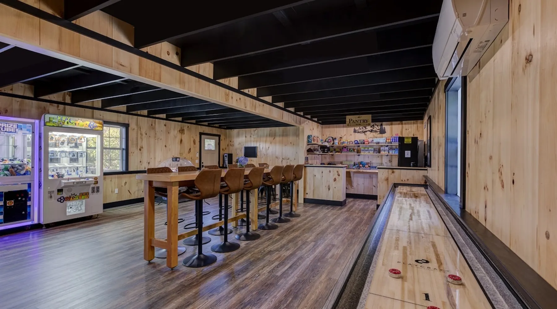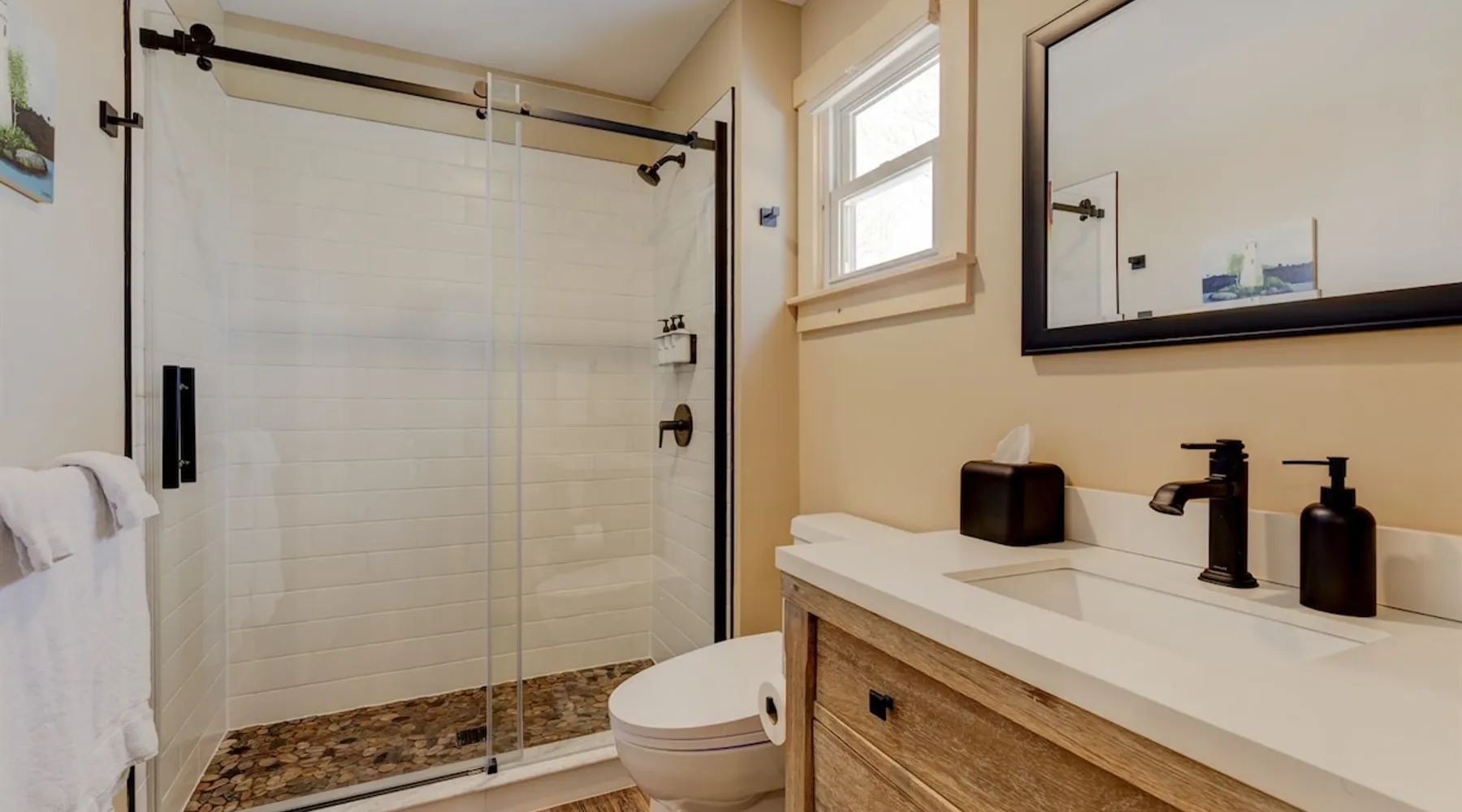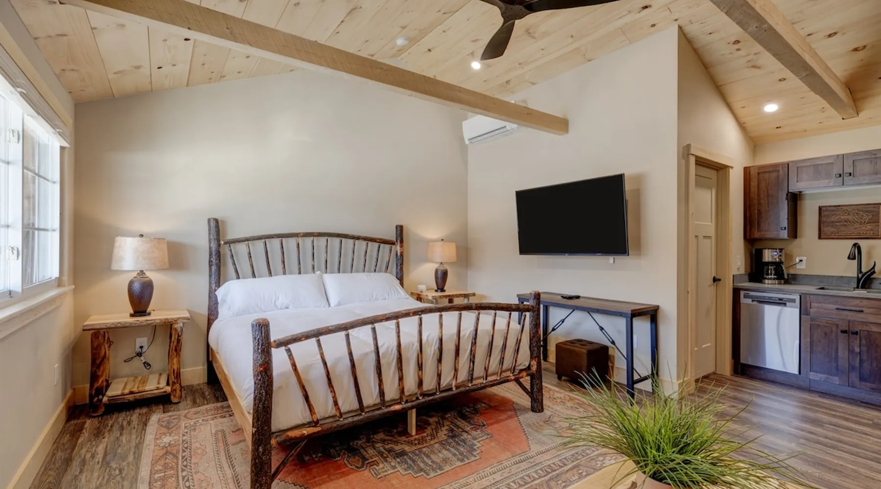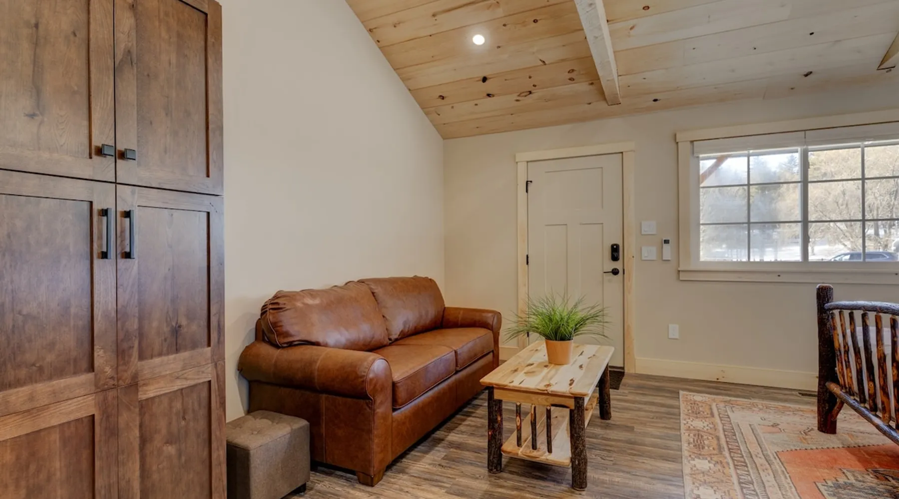 One of eleven luxury rooms at the Lodge by Sunapee Stays, nestled in Sunapee with spectacular views of Mount Sunapee just out your front door. Minutes from Sunapee Harbor and less than 10 minutes to Mount Sunapee. The space This modern rustic studio suite features hickory log furniture throughout, king bed and full size memory foam sofa bed. The kitchenette is fully stocked with all the amenities to eat in. The bathroom boasts a sanctuary of its own with pebble stone shower surrounded by subway tiles and your very own bidet toilet! The shiplap vaulted ceilings and plush Adirondack style furnishings evoke relaxation after your day of adventures. Common washer and dryer located on property. Later this winter, the Lodge will offer a common indoor lounge area featuring contemporary and classic family games along with a TV. Outside you'll find a semi-private patio complete with rocking chairs and a seasonal outdoor pool with views of Mount Sunapee! In Room Amenities: King Bed Full Size Sleeper Sofa Kitchenette Microwave Refrigerator Flat Screen Smart TV Complimentary High Speed Internet Cuisinart Double Induction Electric Cooktop Coffee Pot with Coffee Toaster Oven Plates, Glasses, Silverware, Cookware Hair Dryer Premium Bath amenities Private heating/air conditioning unit Access to common washer/dryer Access to common iron/iron board Guest access This is a studio suite and one of eleven suites at The Lodge by Sunapee Stays. Each suite has their own entrance. Later this winter, the Lodge will offer a common indoor lounge area featuring contemporary and classic family games along with a TV. This summer our seasonal outdoor pool will be open.