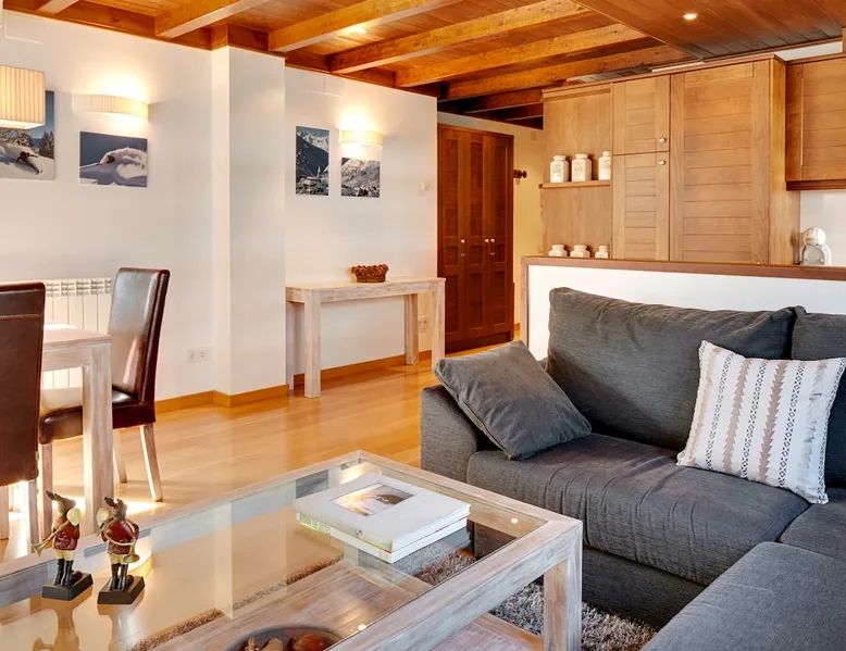 The vacation apartment Val de Ruda Luxe 21 in Baqueira is situated in the recently built exclusive residential complex called Ruda, at the foot of the slopes, at 1500 metres above sea level. The space Val de Ruda Luxe 21 is located in a building with traditional Aranese architecture, featuring local materials such as stone, wood, and slate. Inside, these elements blend with sober, high-quality furnishings. The apartment has wooden flooring throughout, except in the kitchen and bathrooms. Access to the Baqueira ski slopes is excellent. From the apartment, you can go down to the garage where the heated ski storage is located, and from there, a lift takes you directly to the cable car. Upon entering, you’ll find a spacious and cosy living-dining area. The lounge features a comfortable L-shaped sofa, a closed fireplace, and a flat-screen TV. Next to the French-style window is the dining table with leather chairs, ideal for enjoying pleasant meals during your stay. The open-plan kitchen is fully equipped with high-end appliances and complete kitchenware. With 90 m² and a capacity for up to 5 guests, the apartment offers two comfortable bedrooms and two full bathrooms. The main bedroom has a double bed and a flat-screen TV. The second bedroom includes a single bed and a pull-out bed. Both rooms are tastefully decorated. A parking space and heated ski storage are included and located within the same building. Rental Registration Number: ESFCTU0000250090003567340000000000000HUTVA-000236-726 Other things to note To access your apartment, it is mandatory to complete the online check-in with the details of all travelers over 14 years old and provide a credit card to the host. Registration Details HUTVA-000236